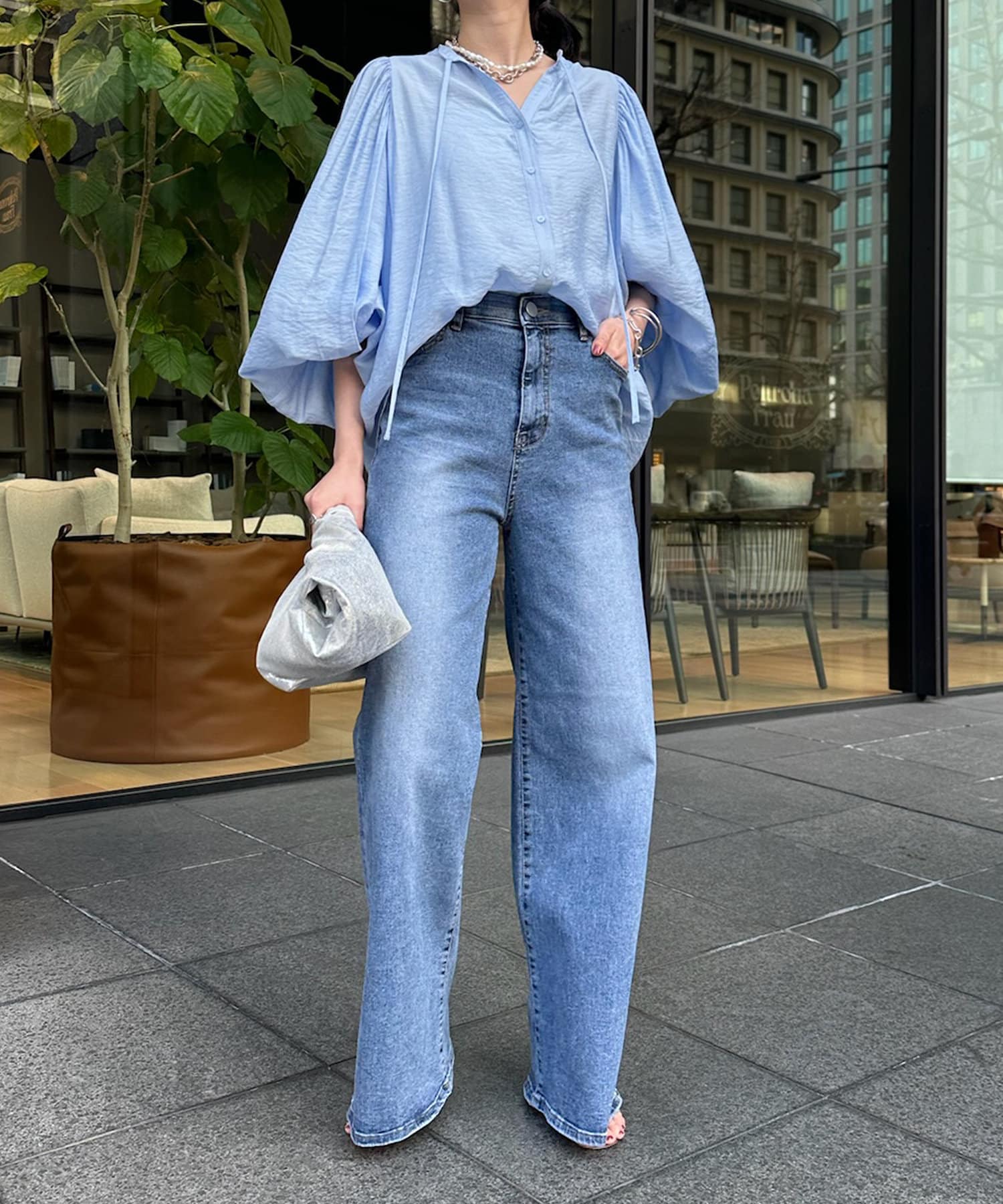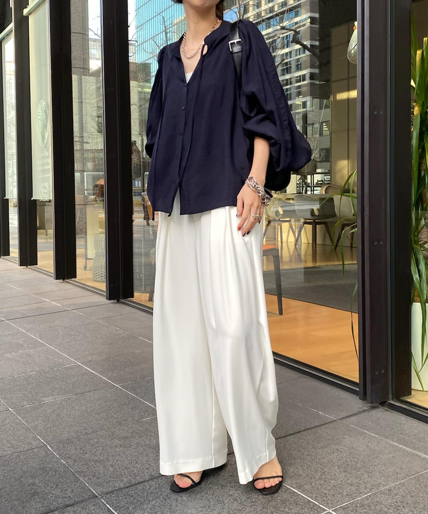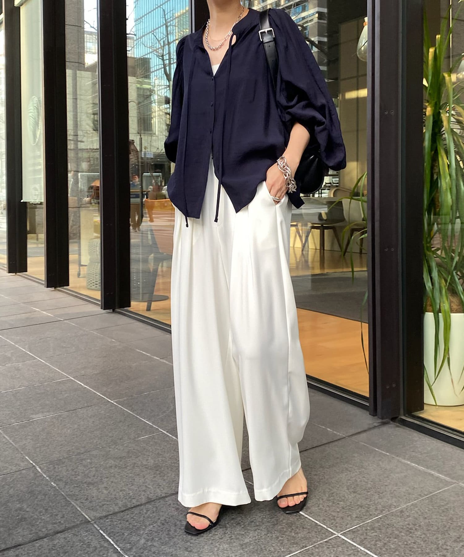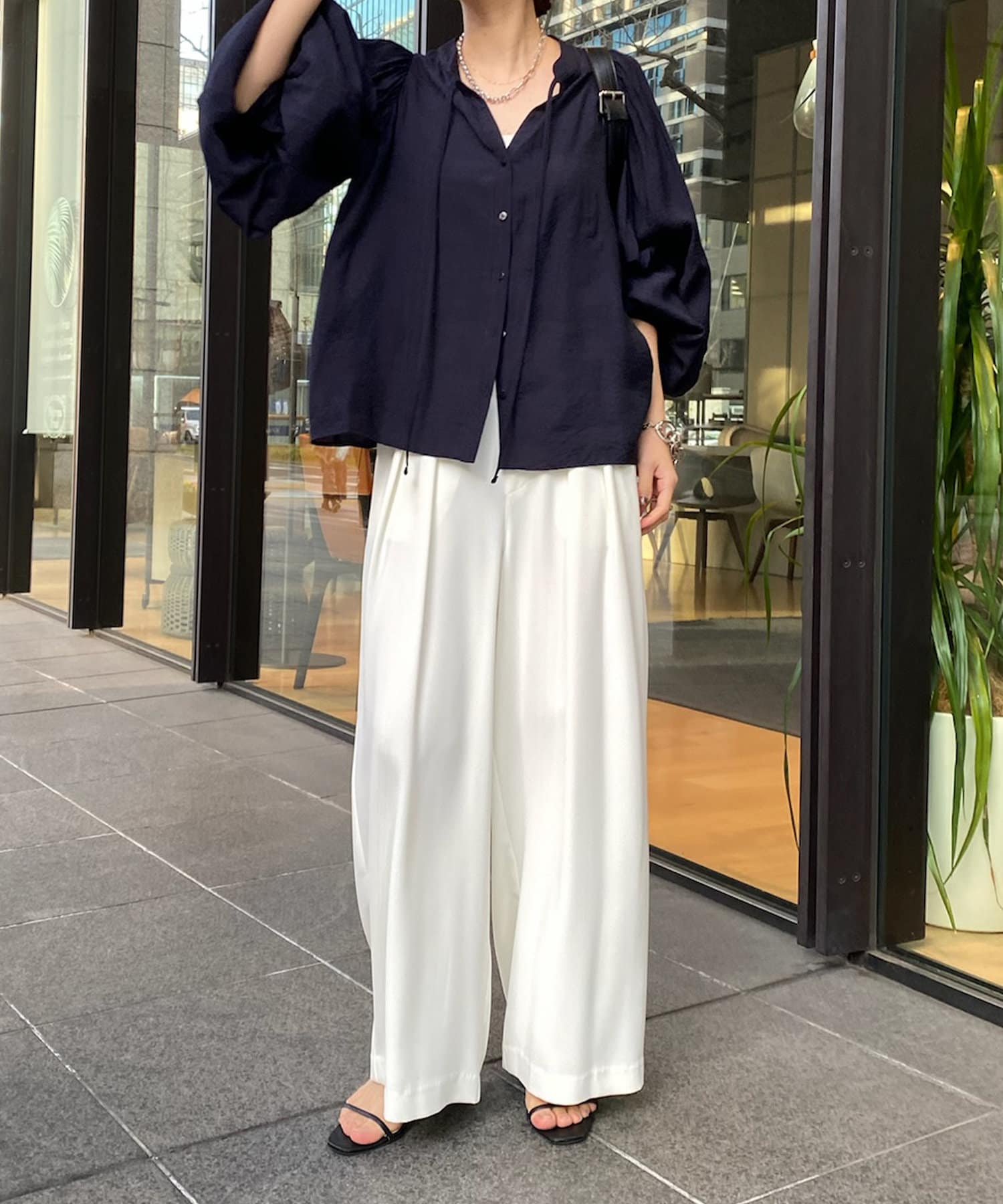 そして、お顔回りがすっきりと見えるスキッパーのデザインに、首元にはトレンド感のあるリボンをプラスしています。