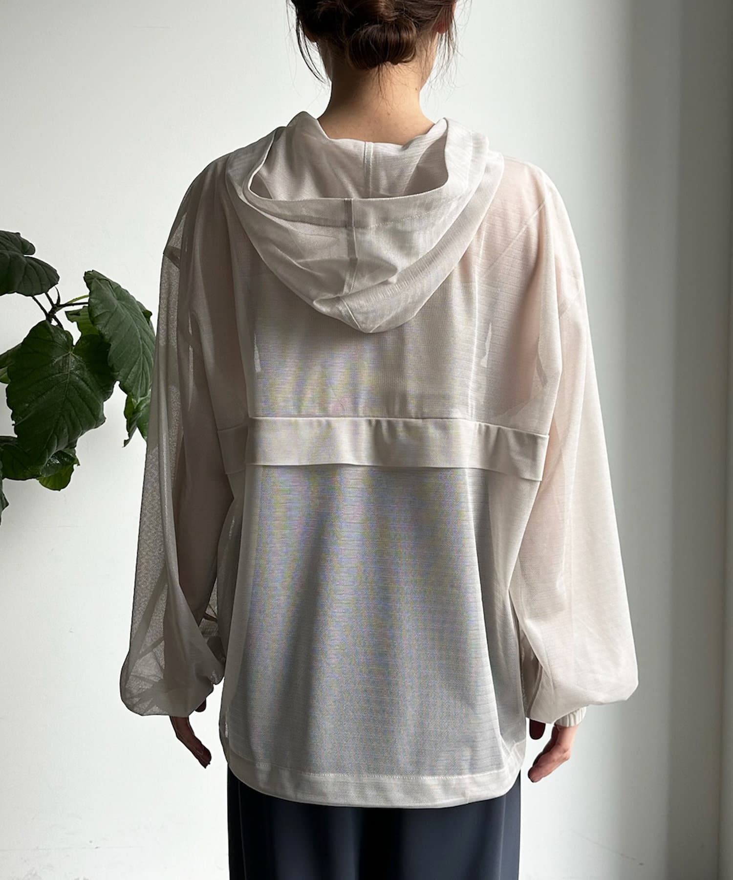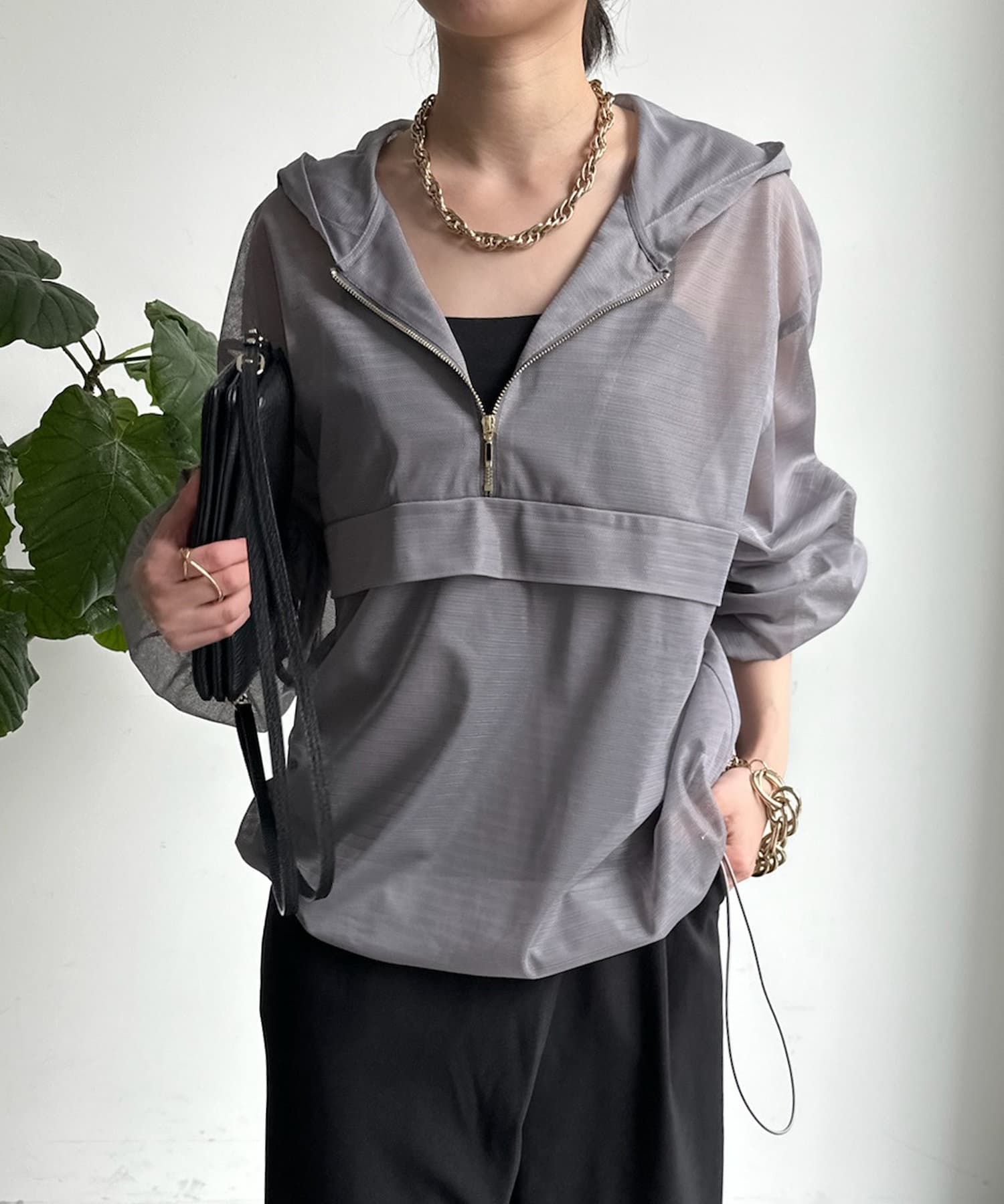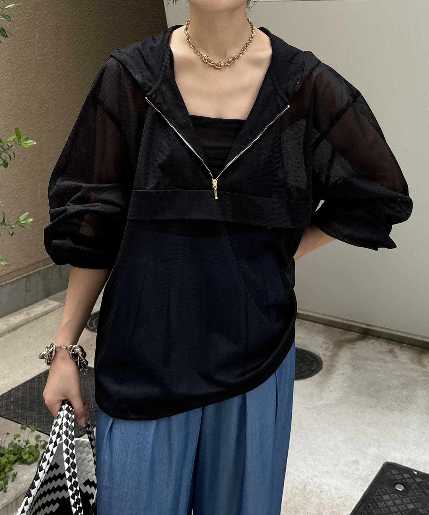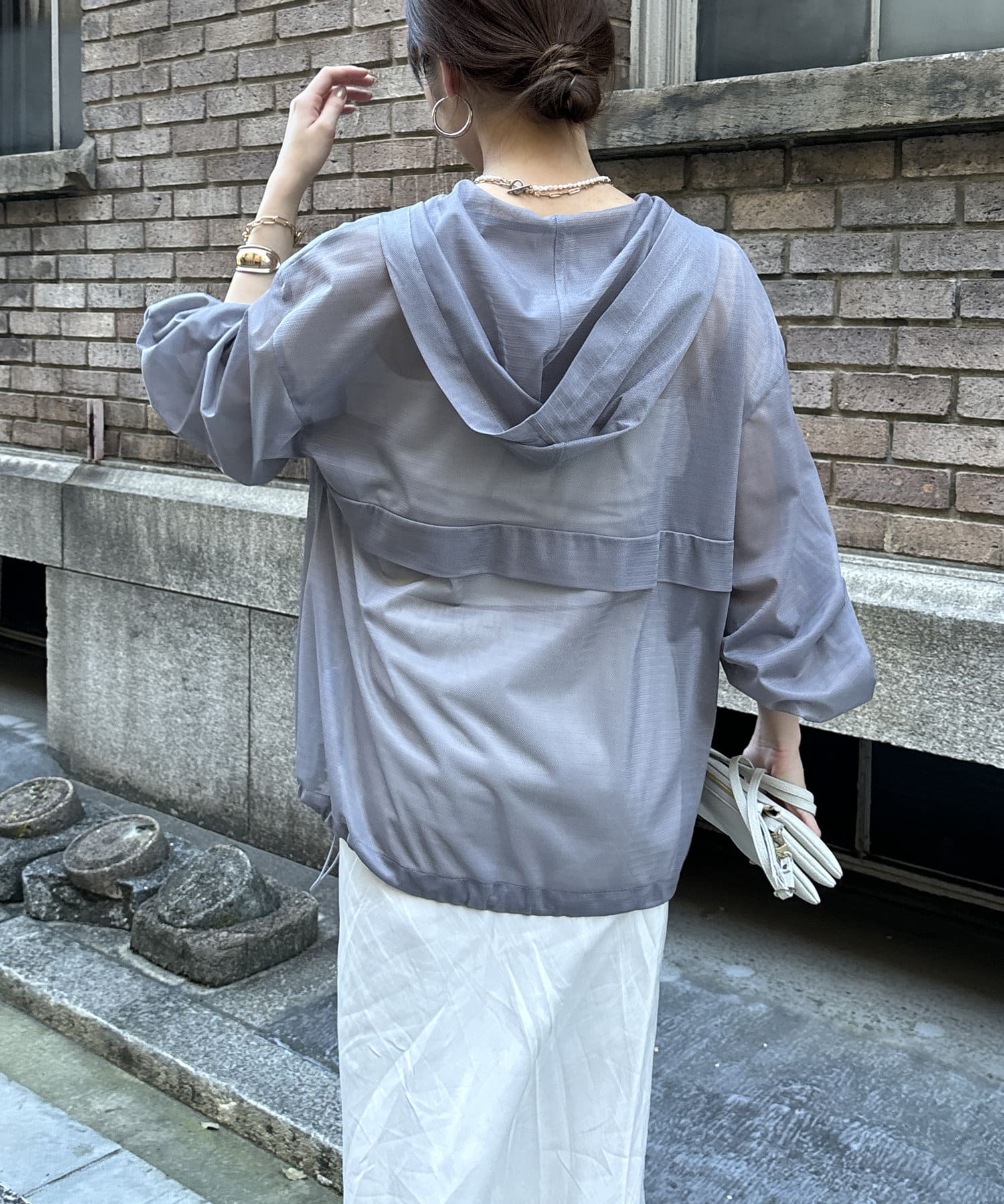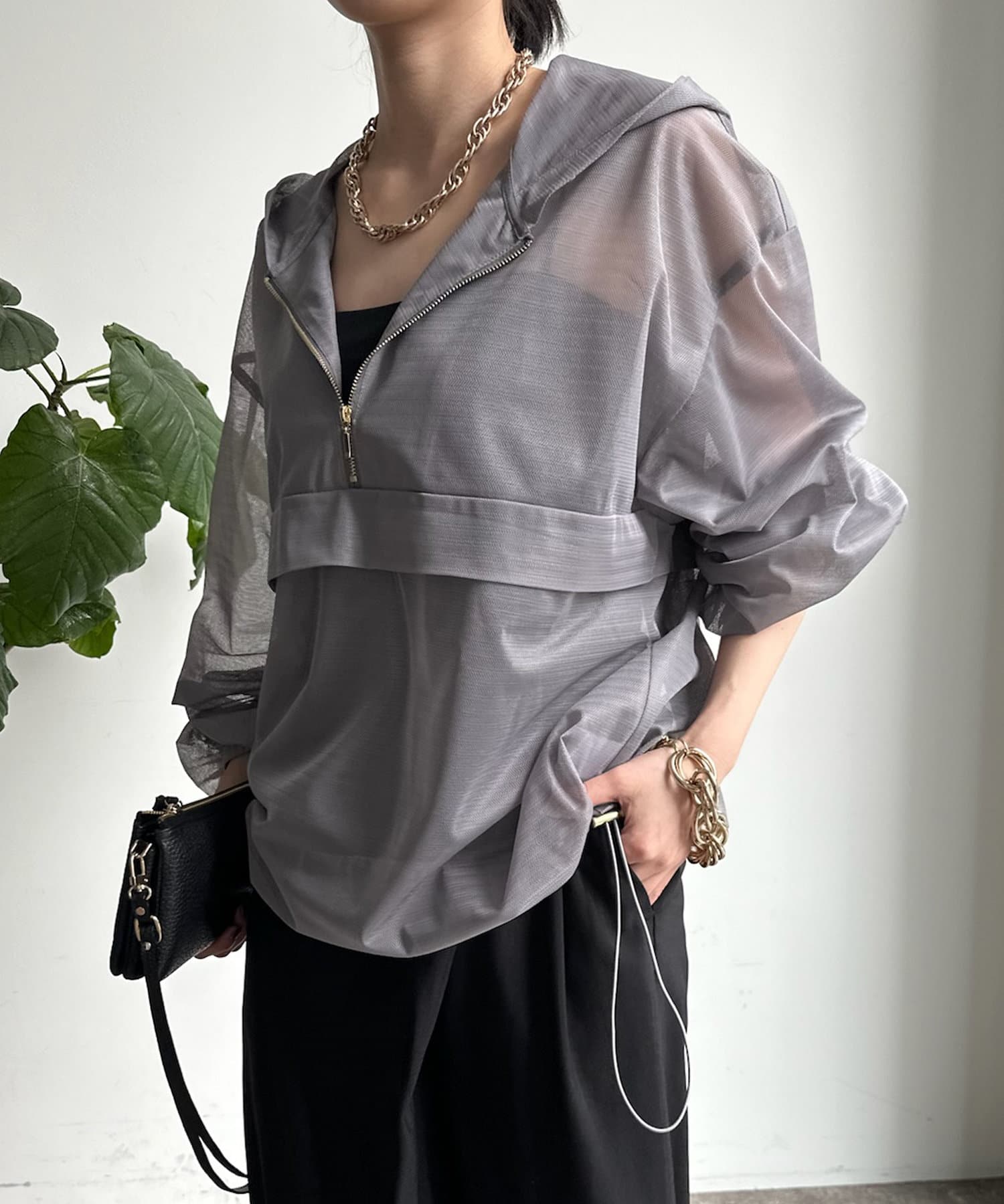 アノラックパーカーのアウトドアな要素を残しつつ、メッシュの透け感のある素材を使用することでトレンドライクな1着に。