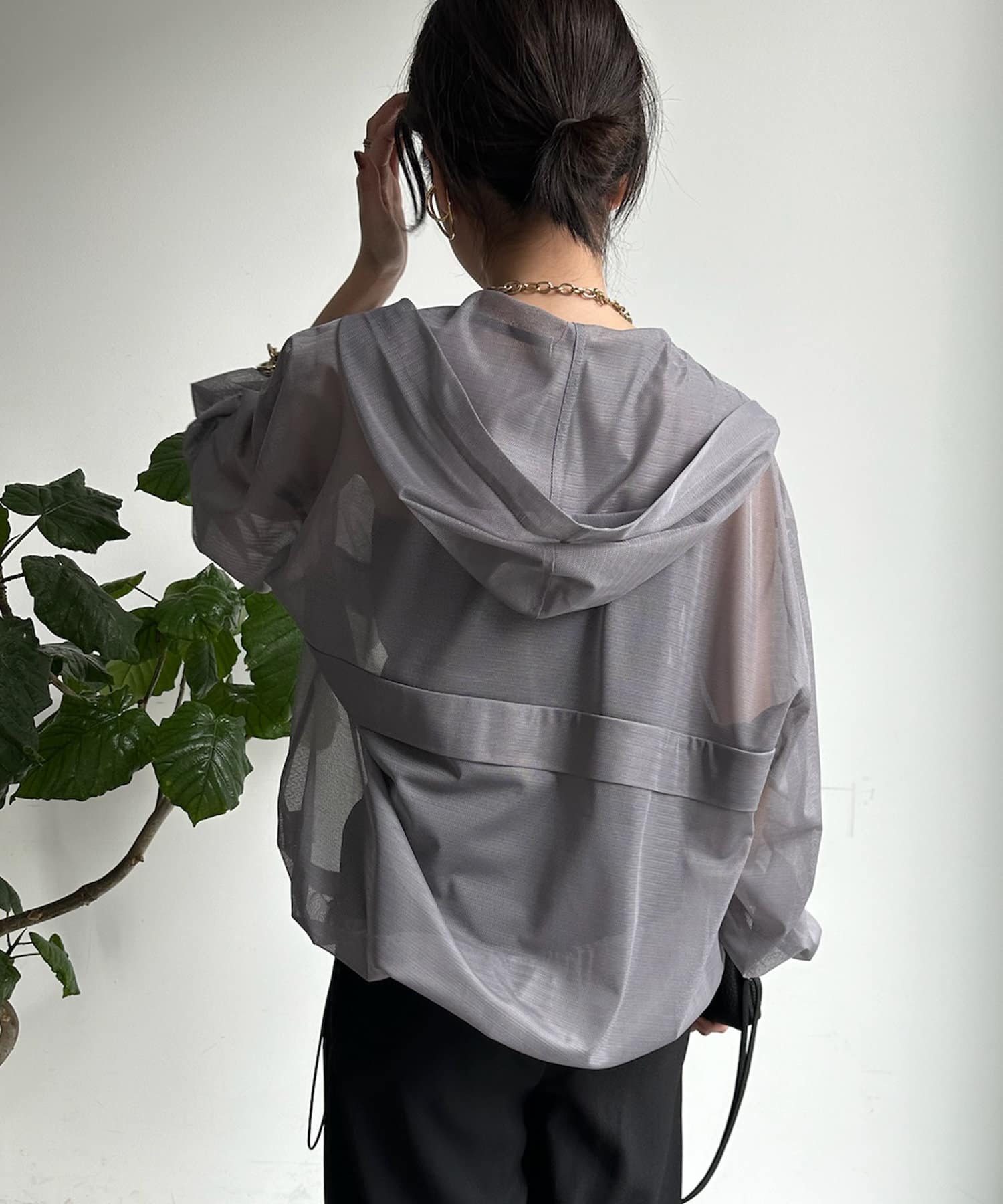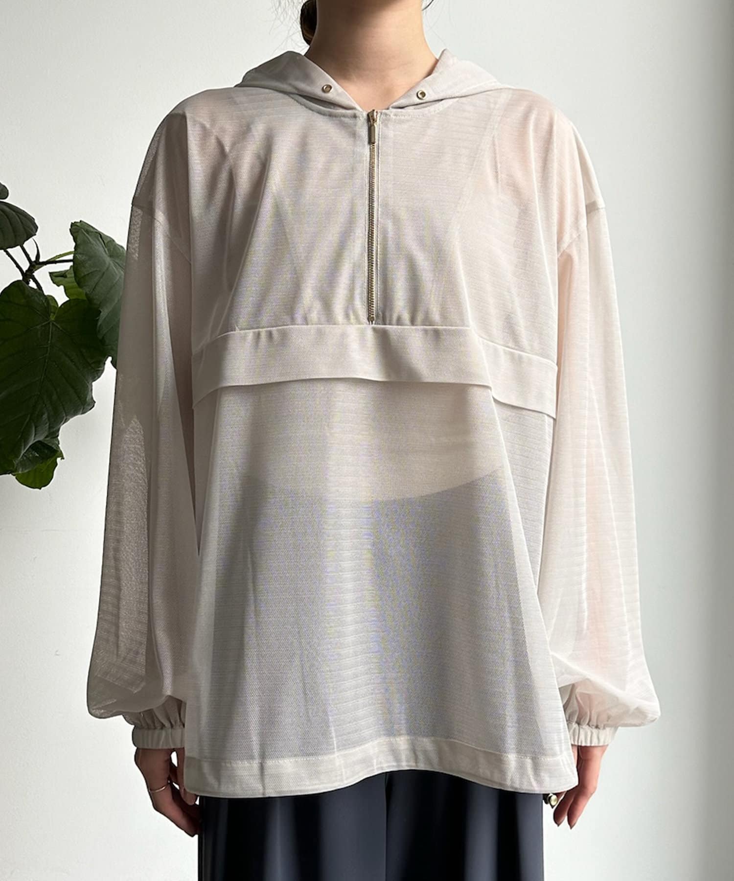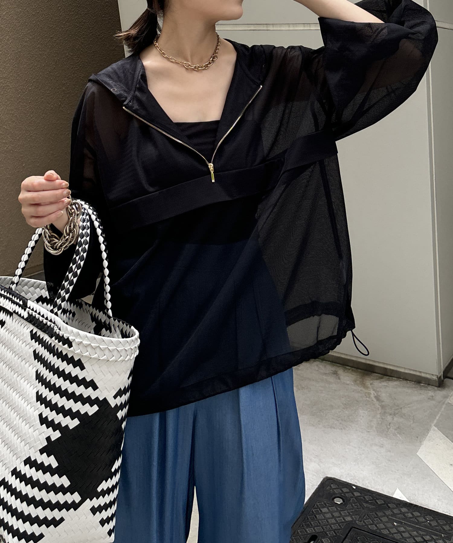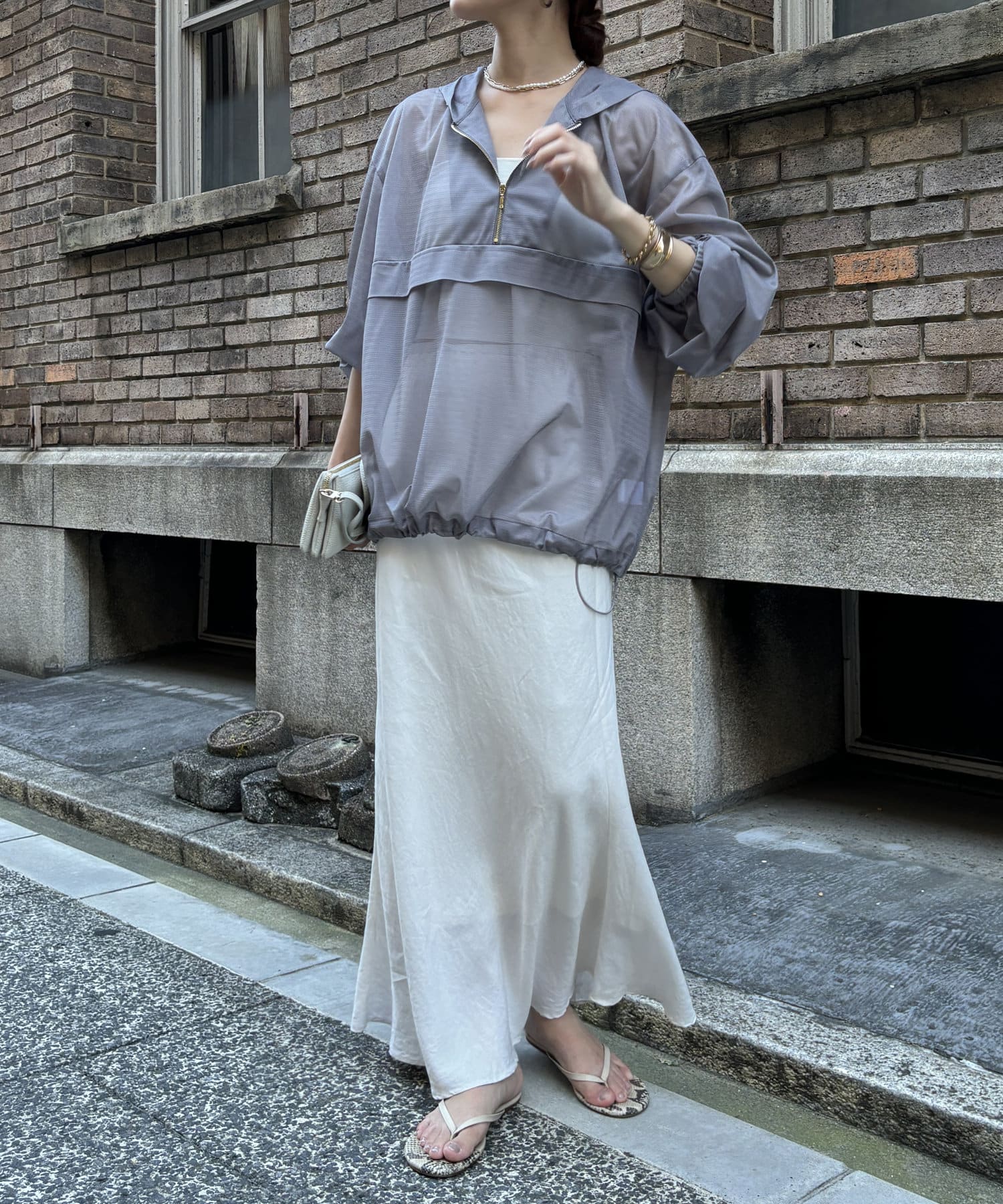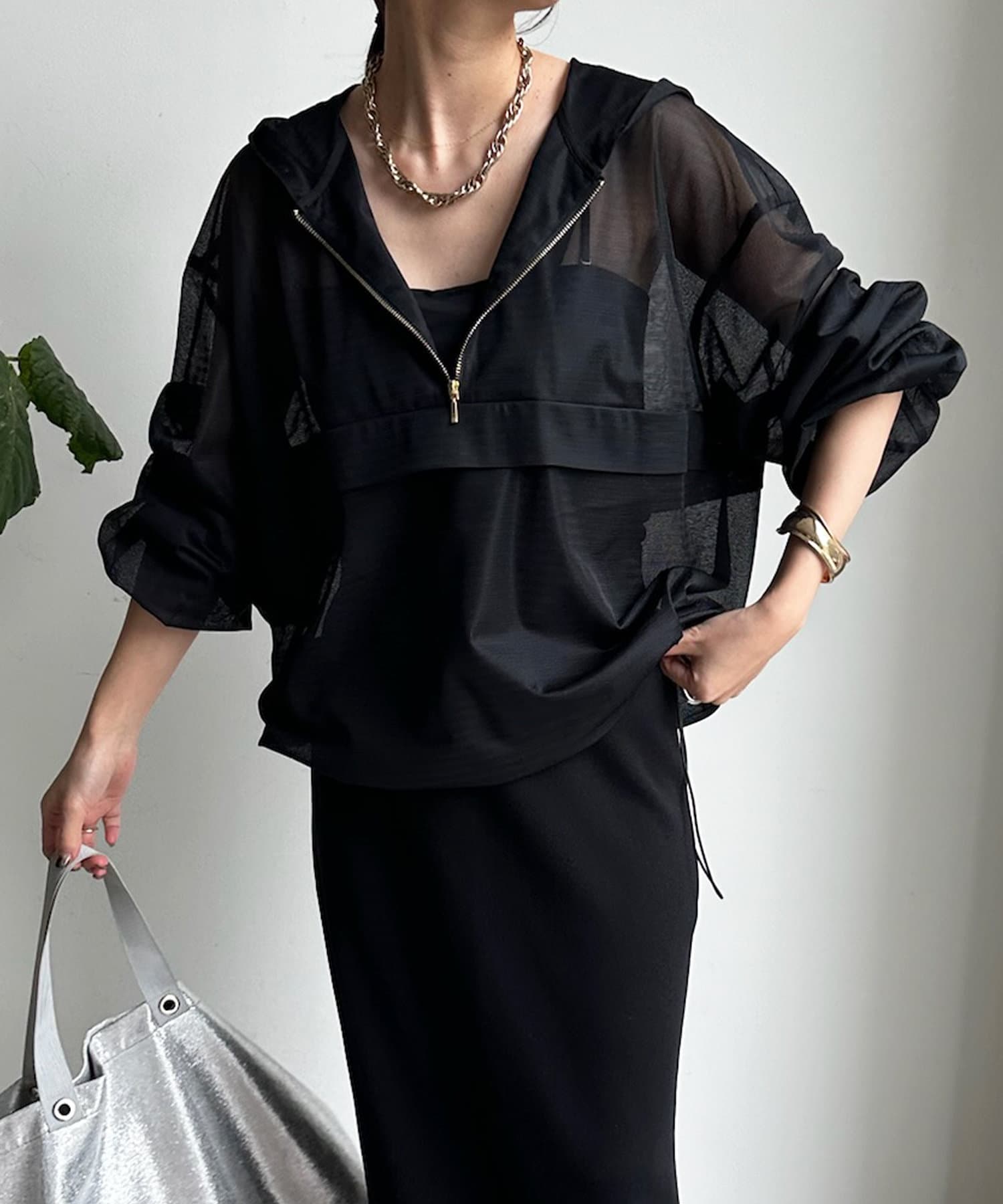 アノラックパーカーのアウトドアな要素を残しつつ、メッシュの透け感のある素材を使用することでトレンドライクな1着に。