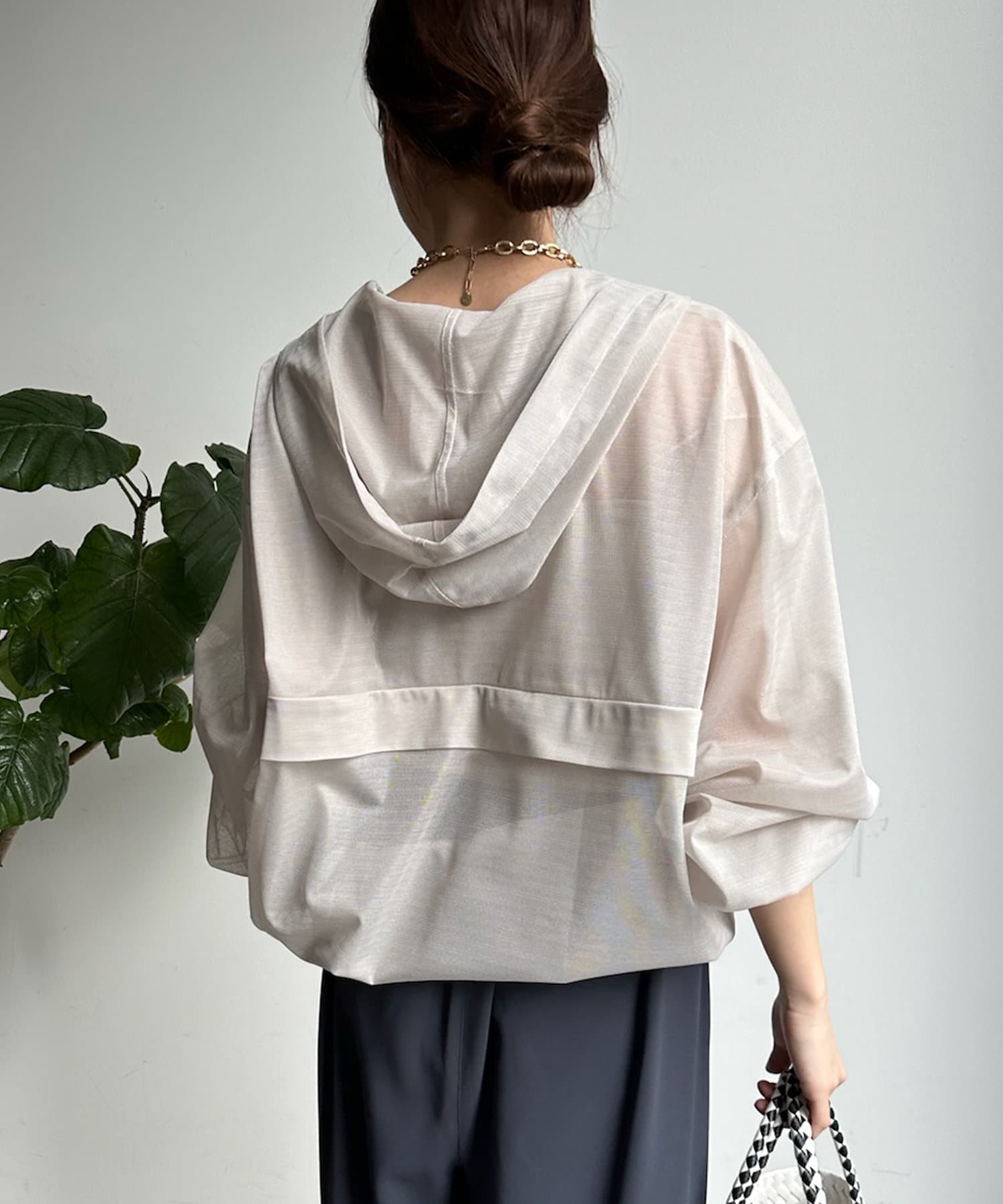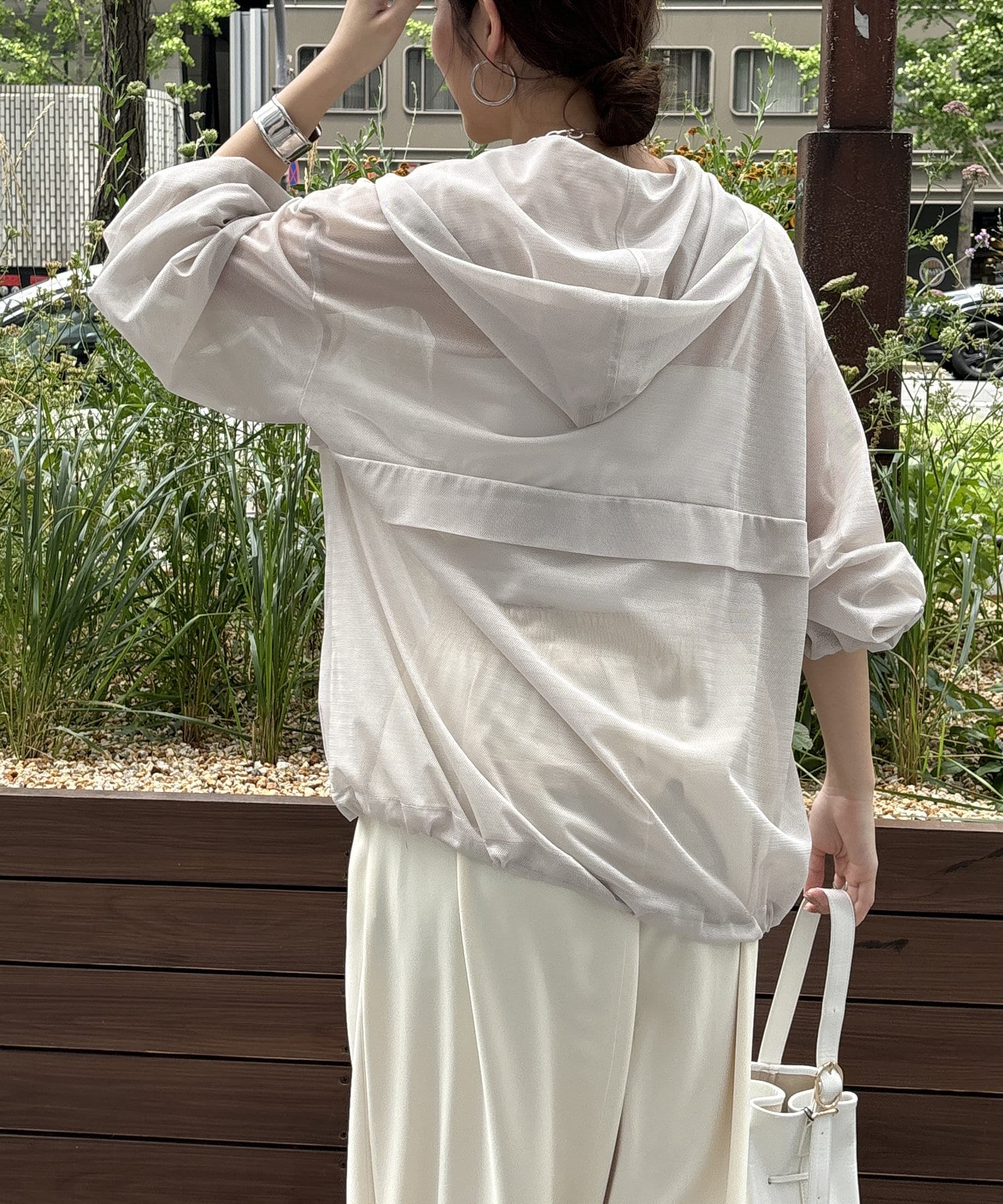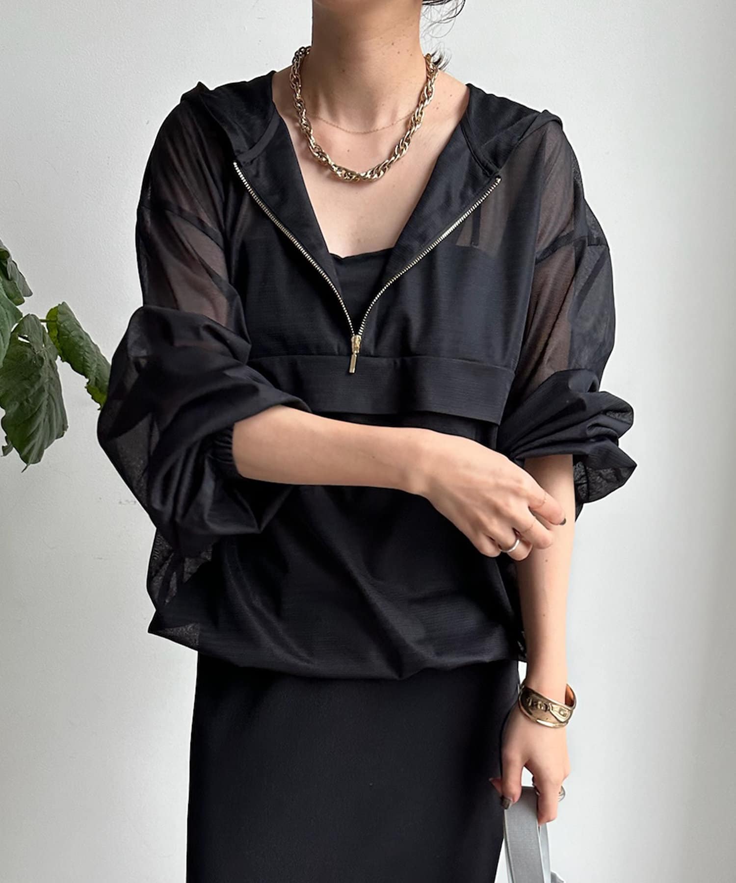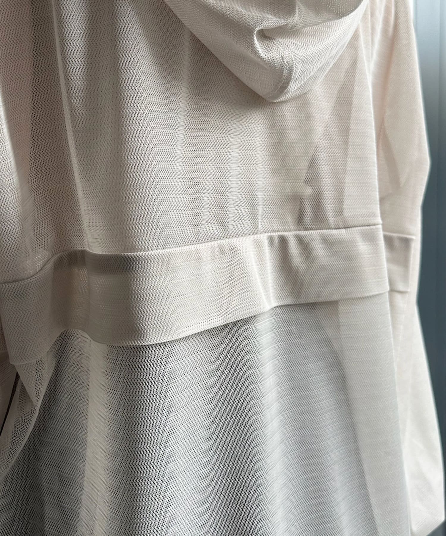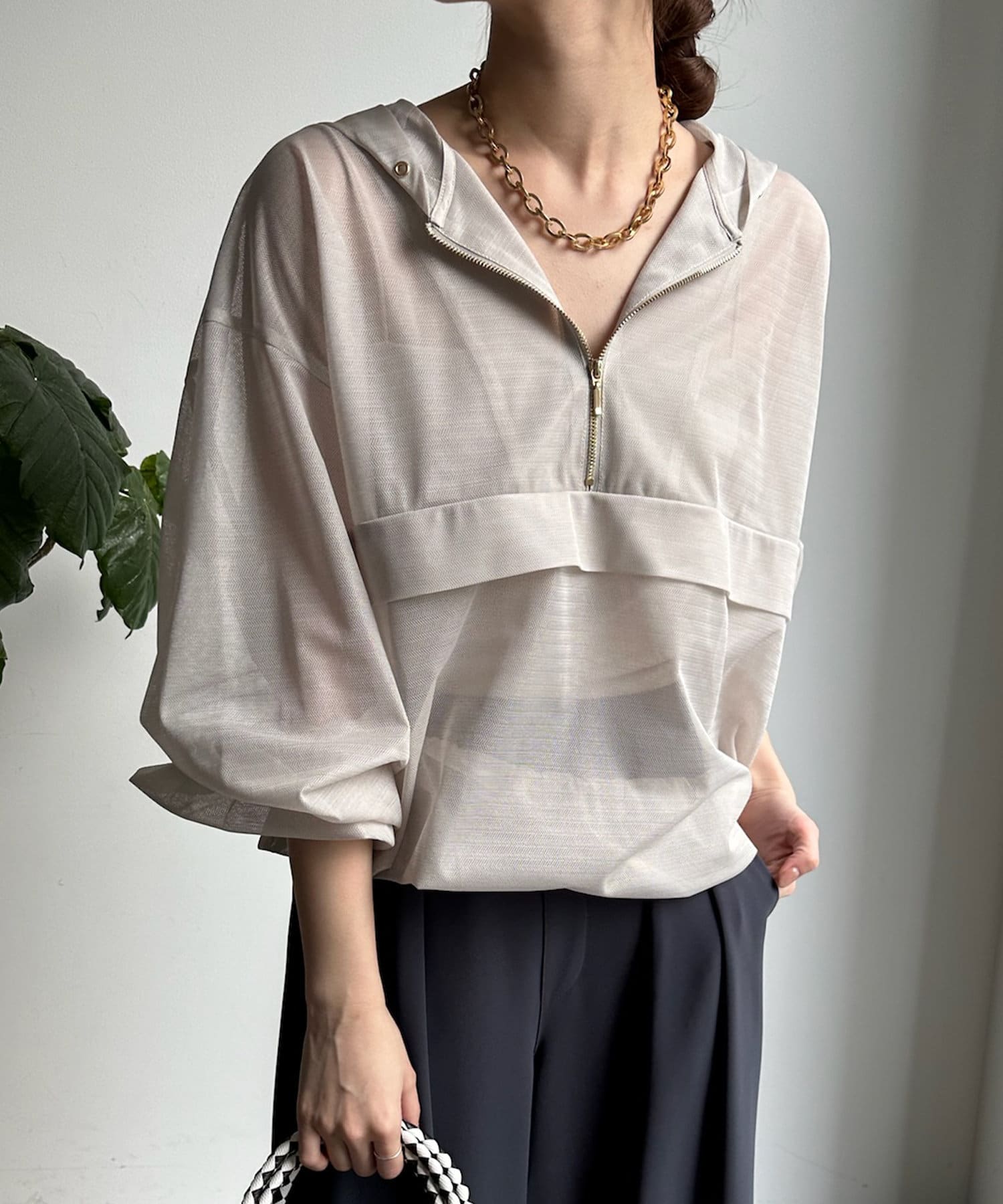 アノラックパーカーのアウトドアな要素を残しつつ、メッシュの透け感のある素材を使用することでトレンドライクな1着に。