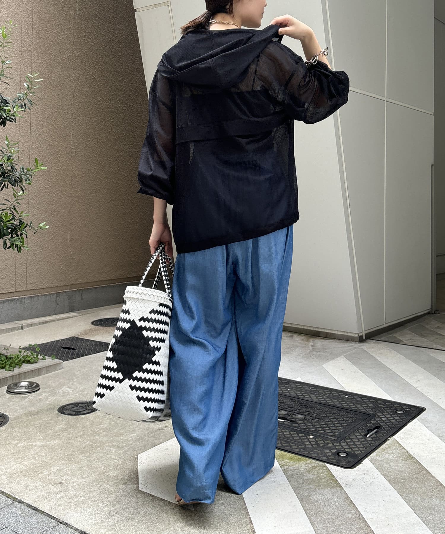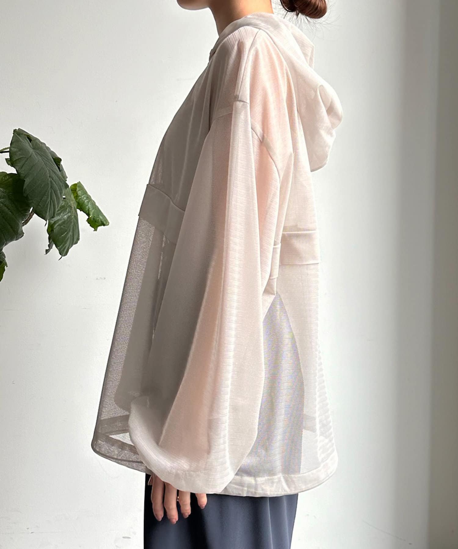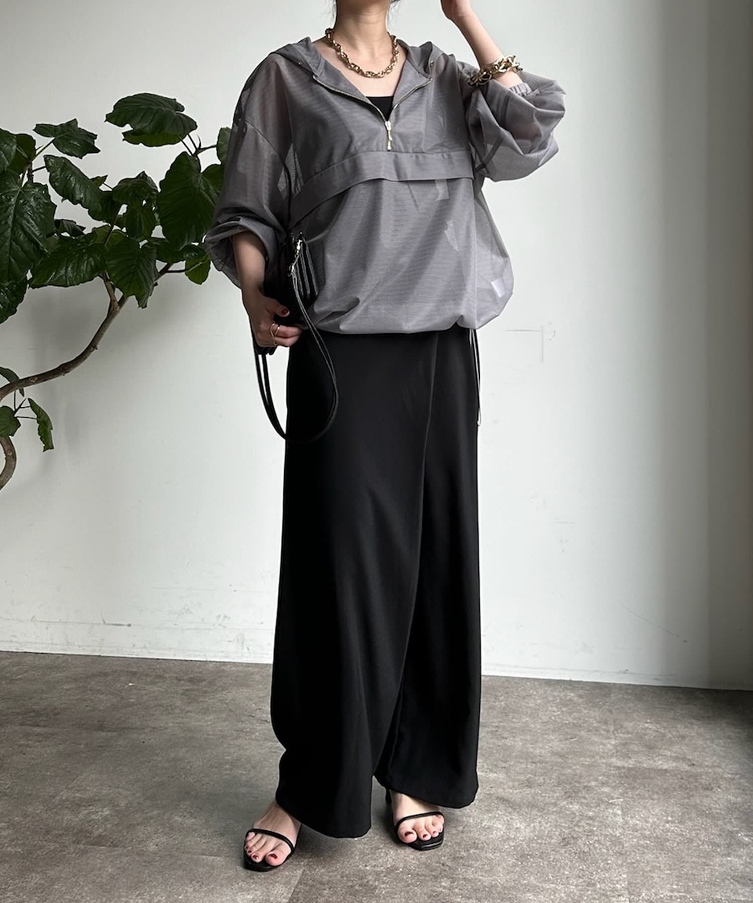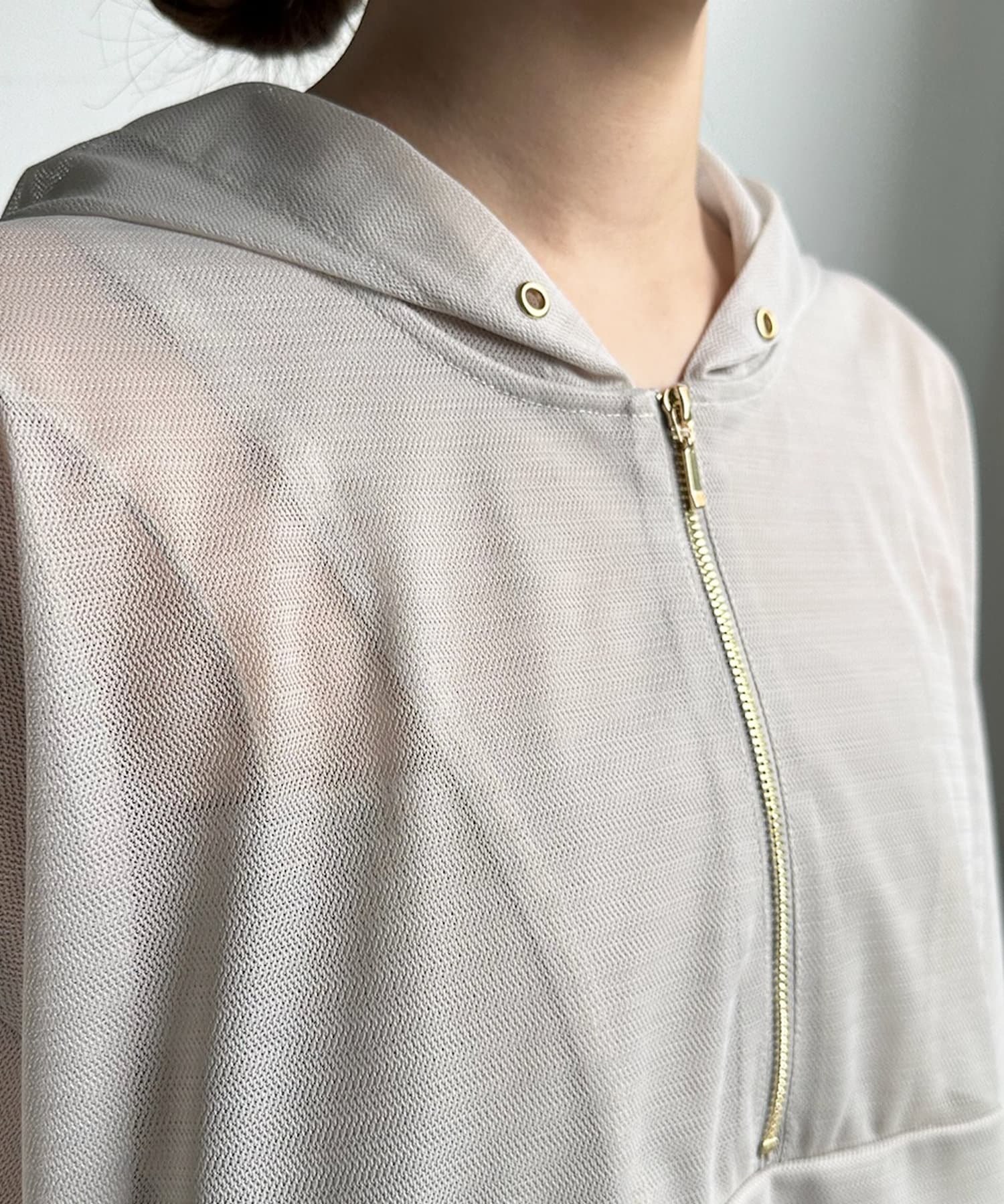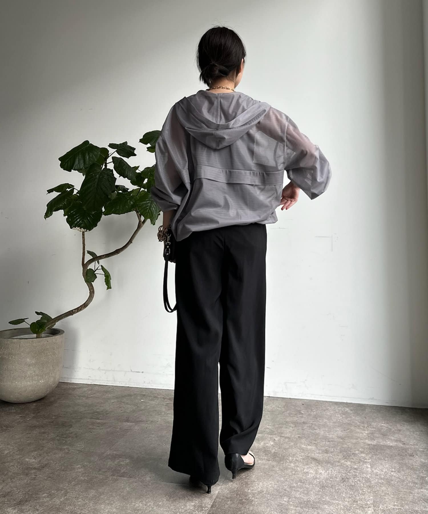 アノラックパーカーのアウトドアな要素を残しつつ、メッシュの透け感のある素材を使用することでトレンドライクな1着に。