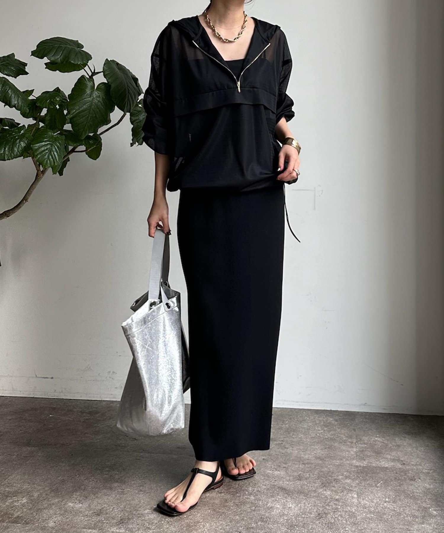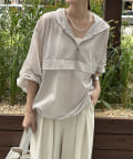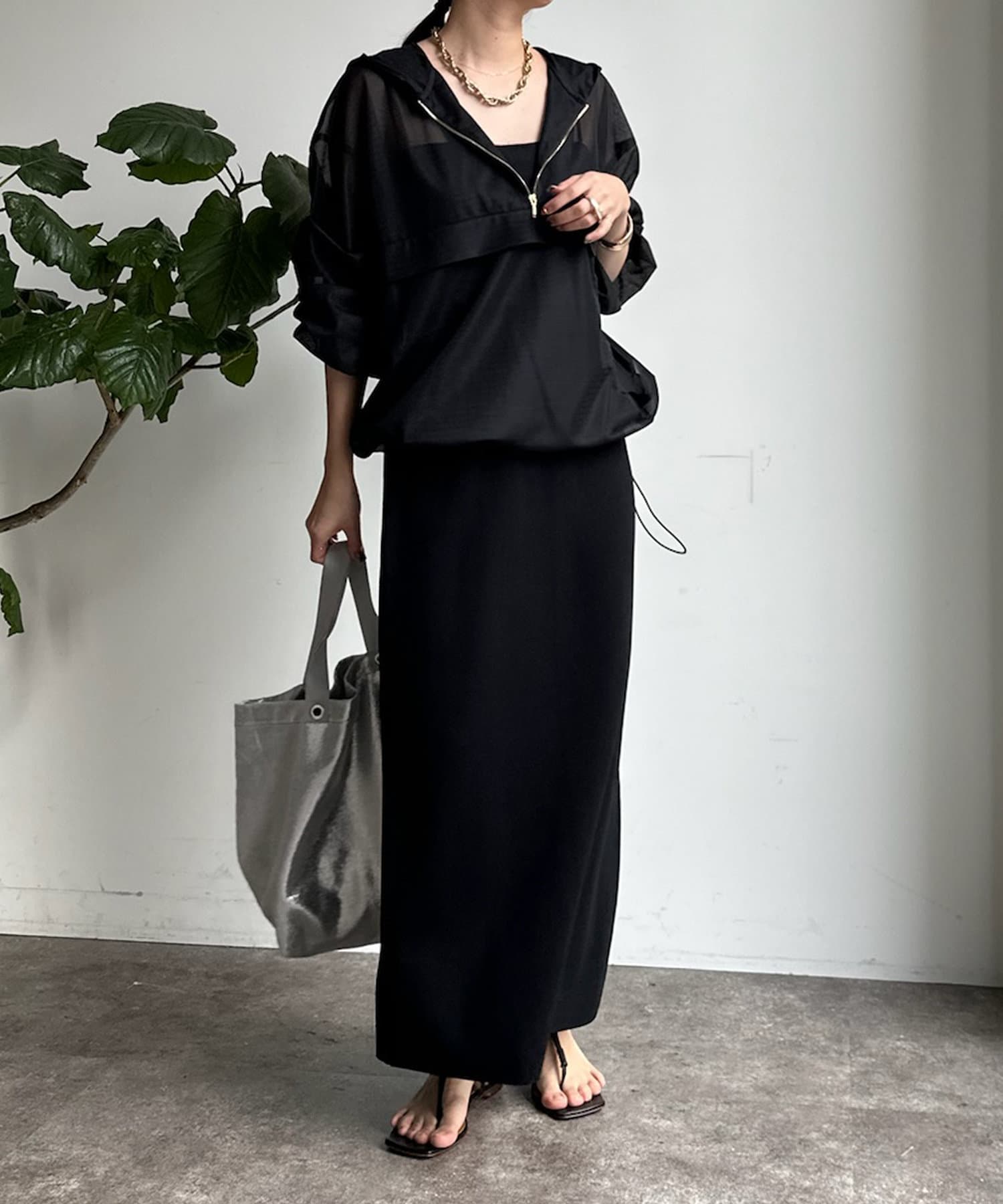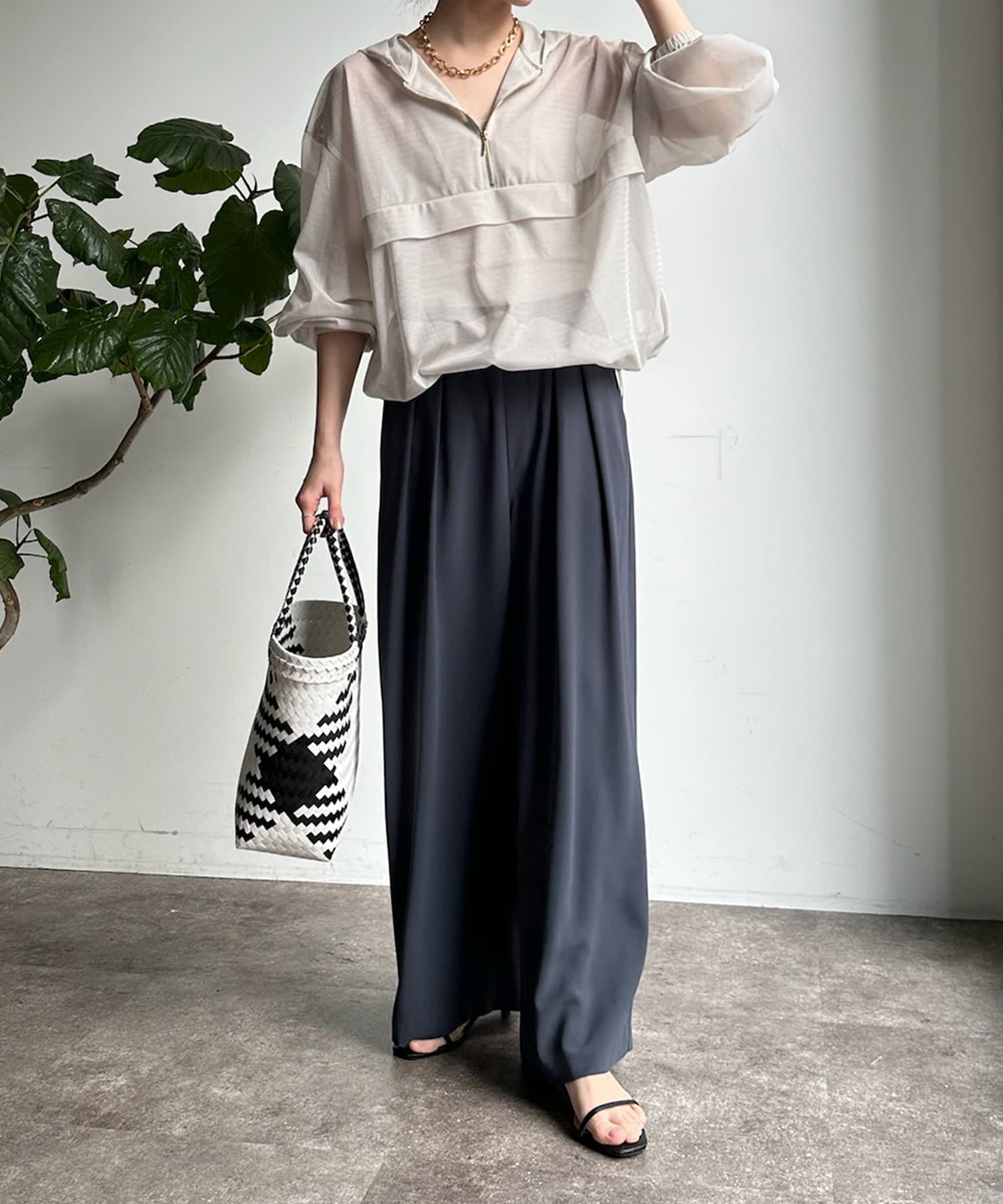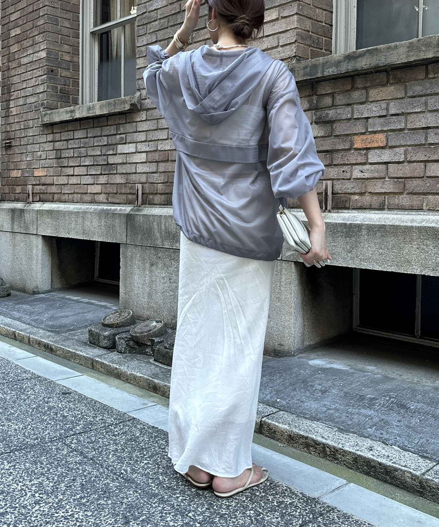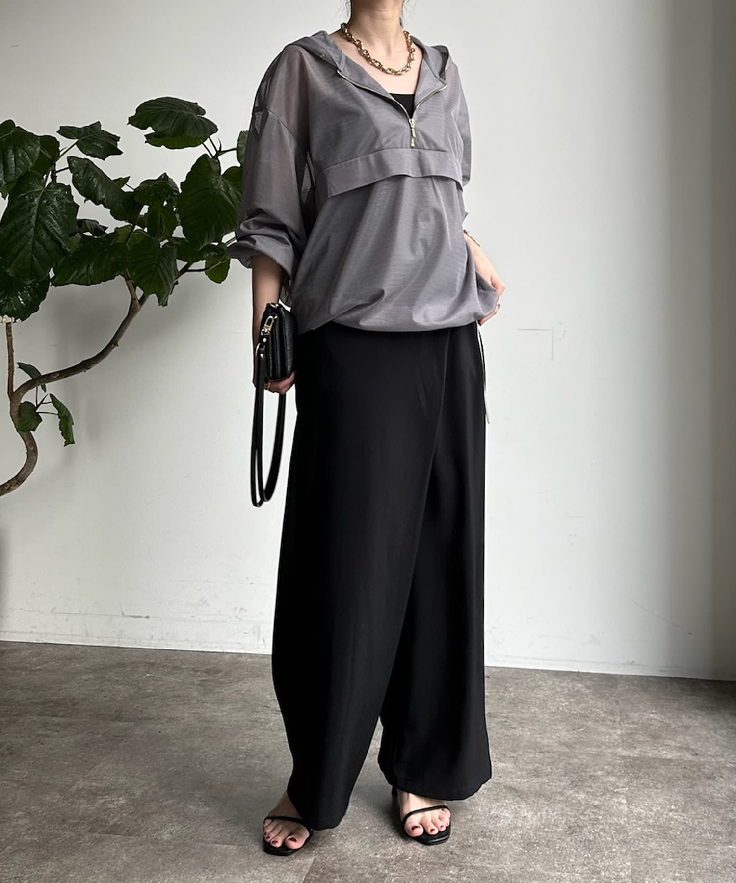 アノラックパーカーのアウトドアな要素を残しつつ、メッシュの透け感のある素材を使用することでトレンドライクな1着に。