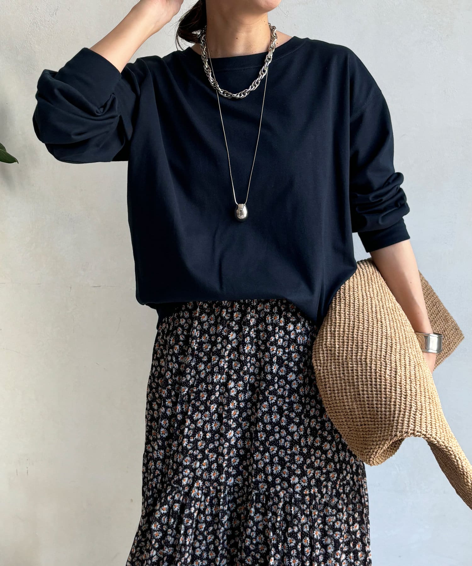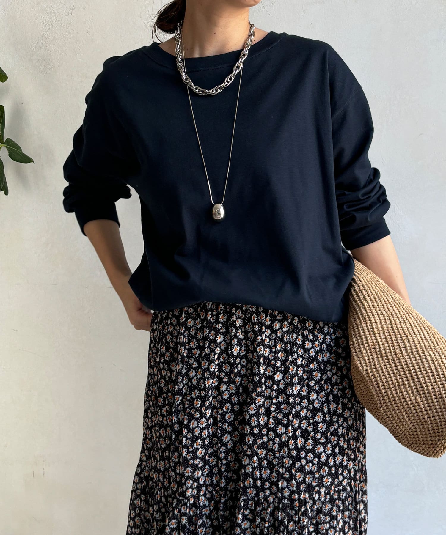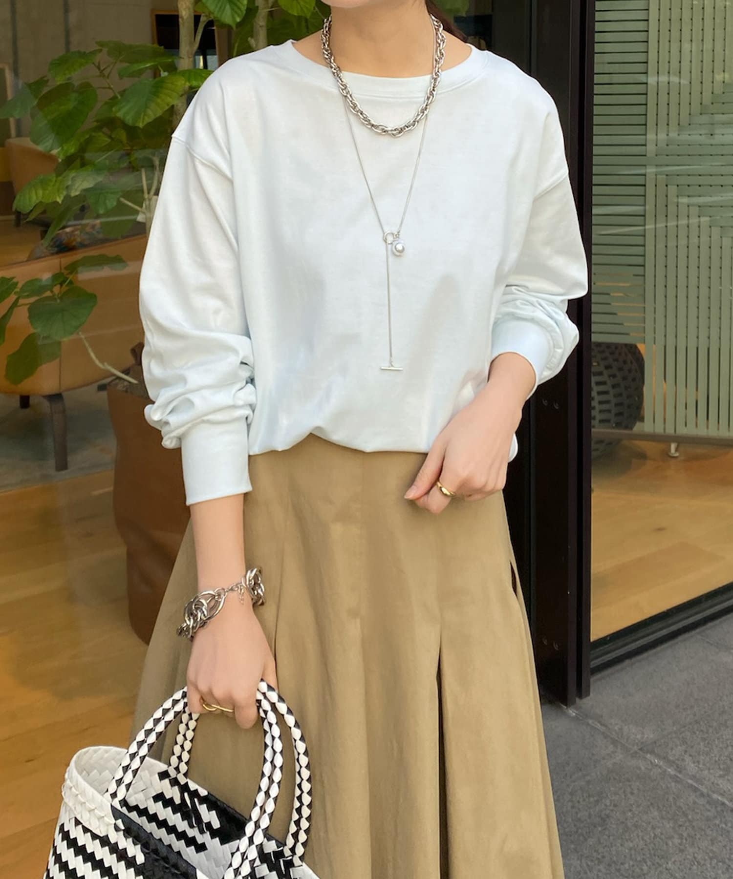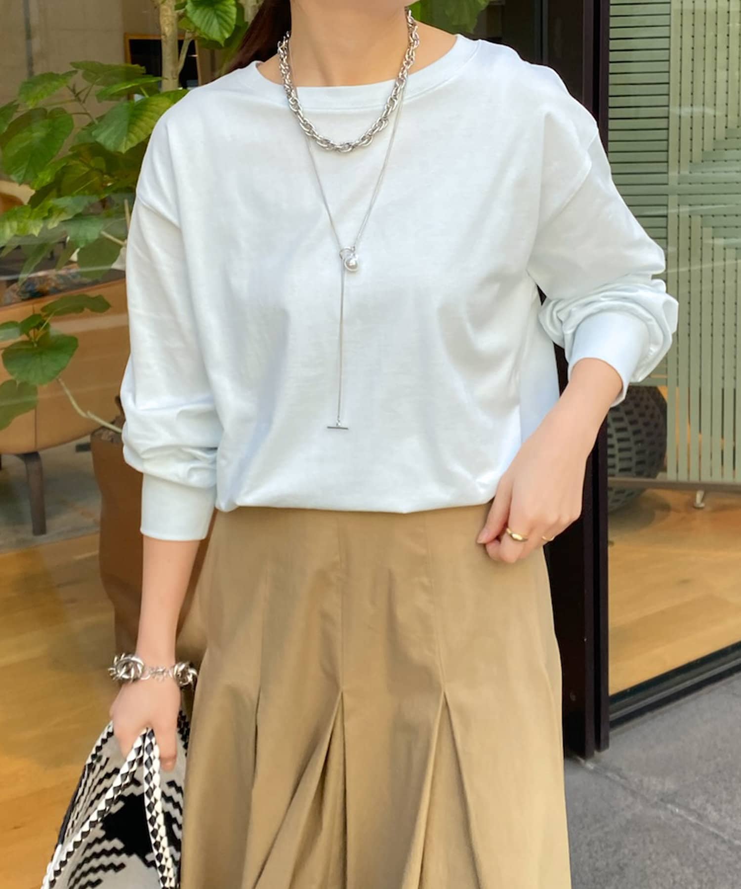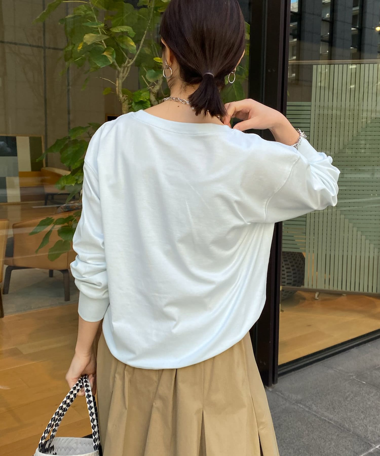 すっきりと綺麗見えする、ネックラインのデザインが大人らしいロンtee。
