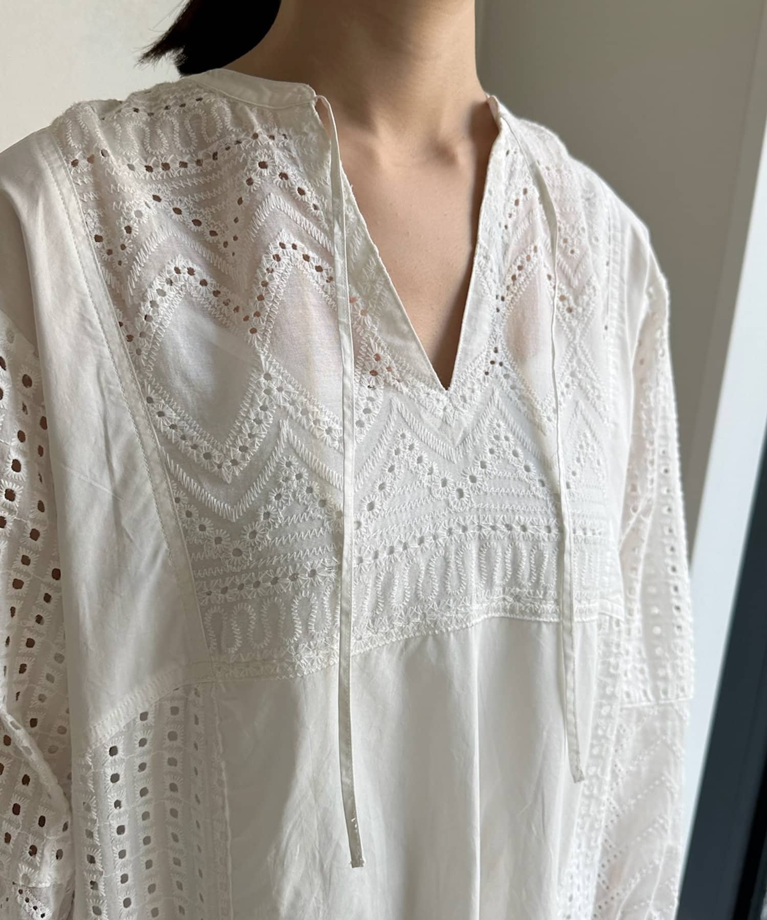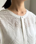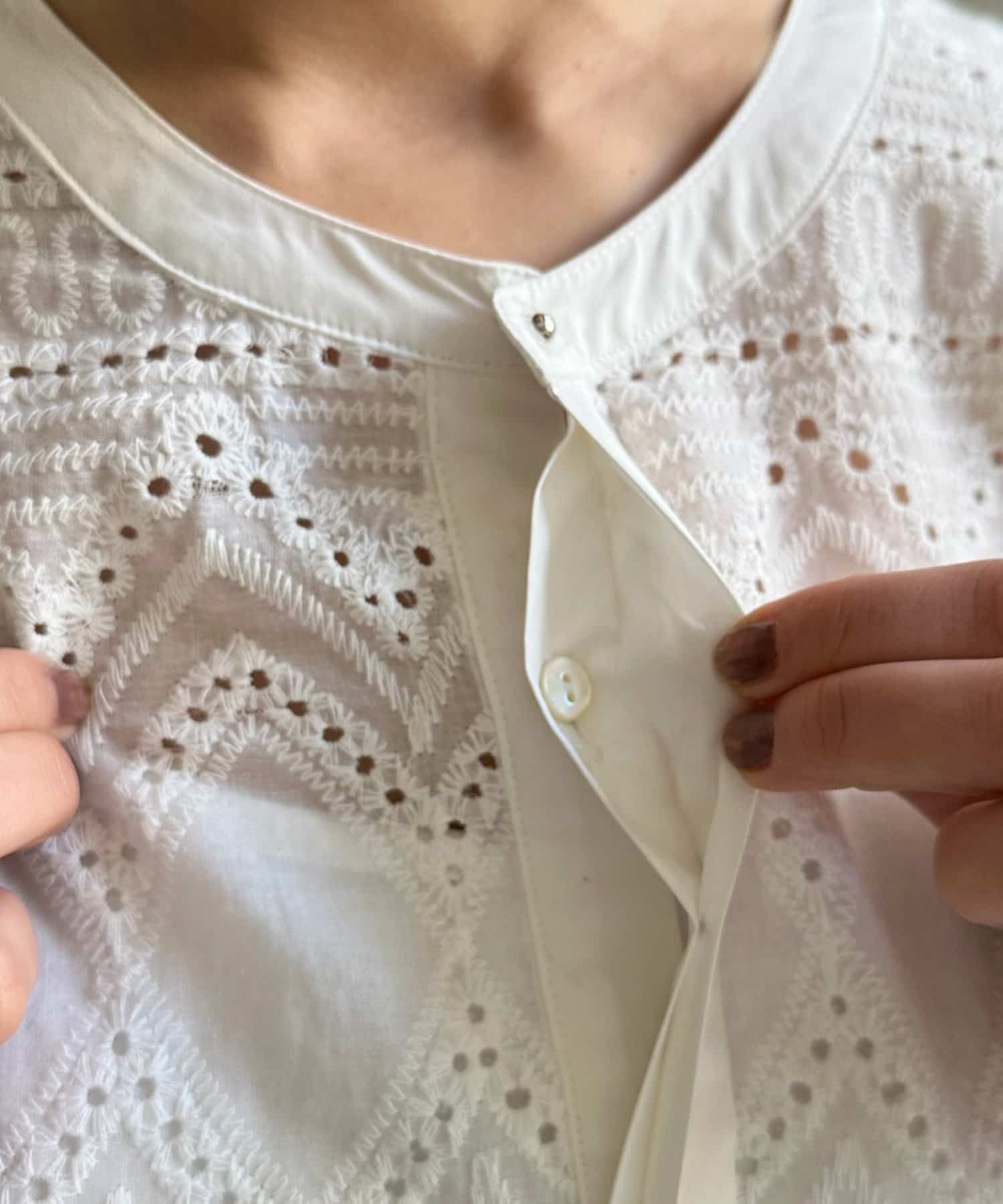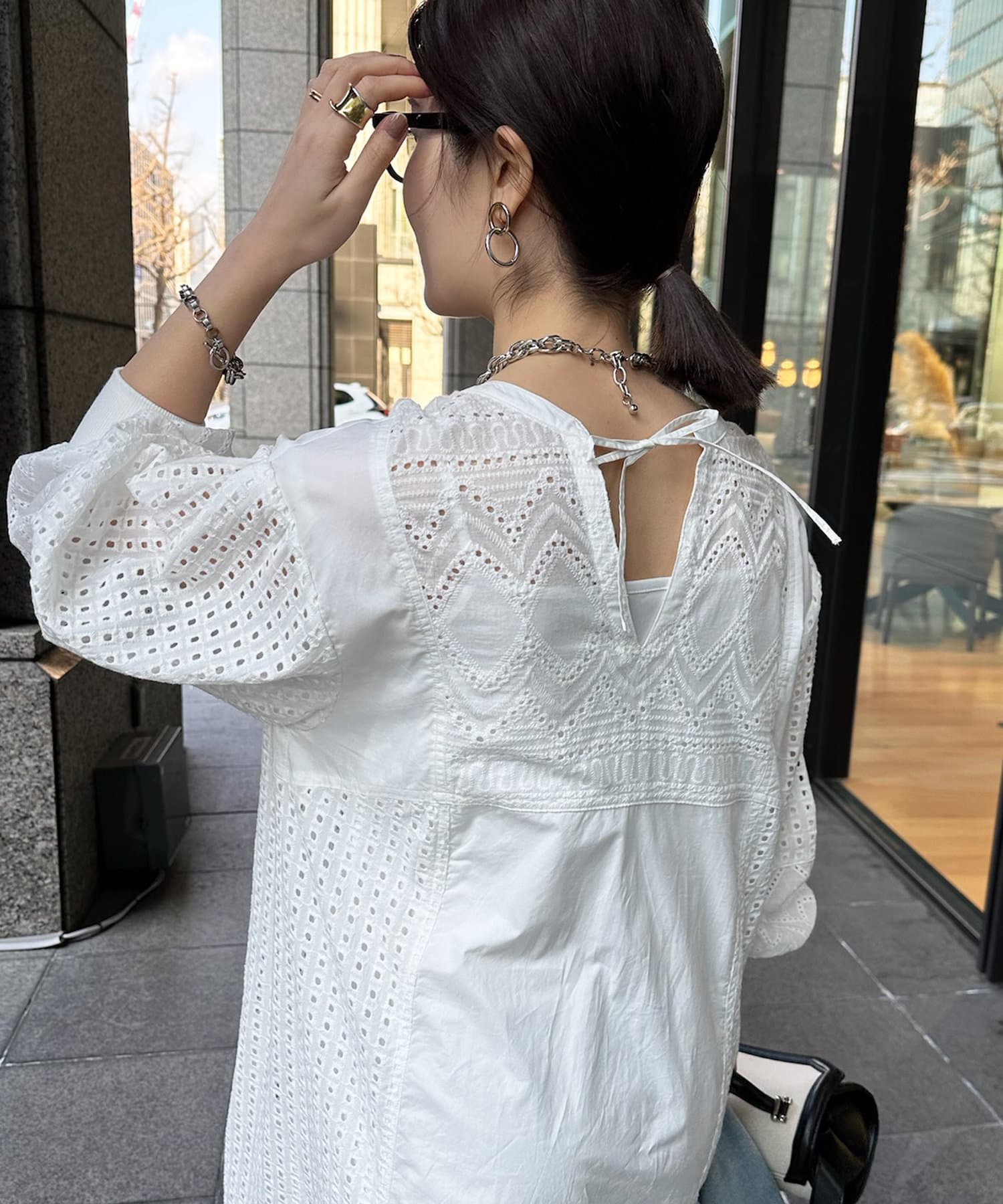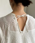 お顔周りがすっきりと見えるスキッパーデザインで、首元にはトレンド感のあるリボンをプラス。