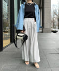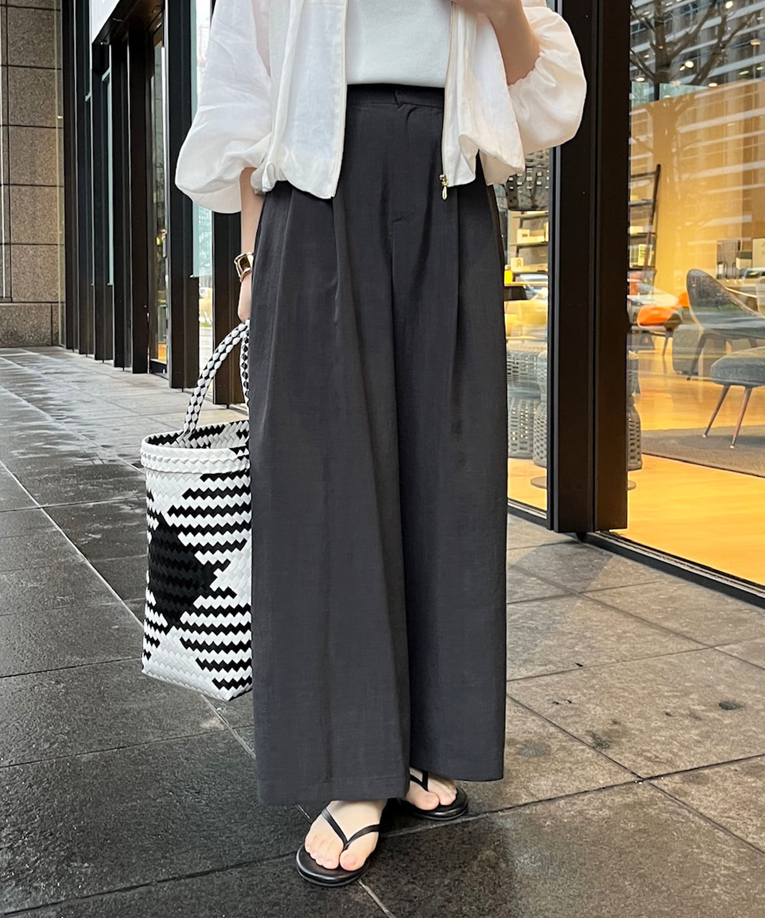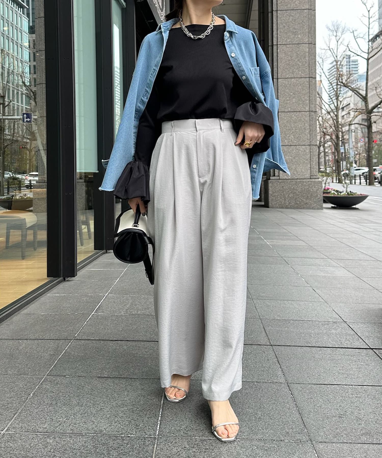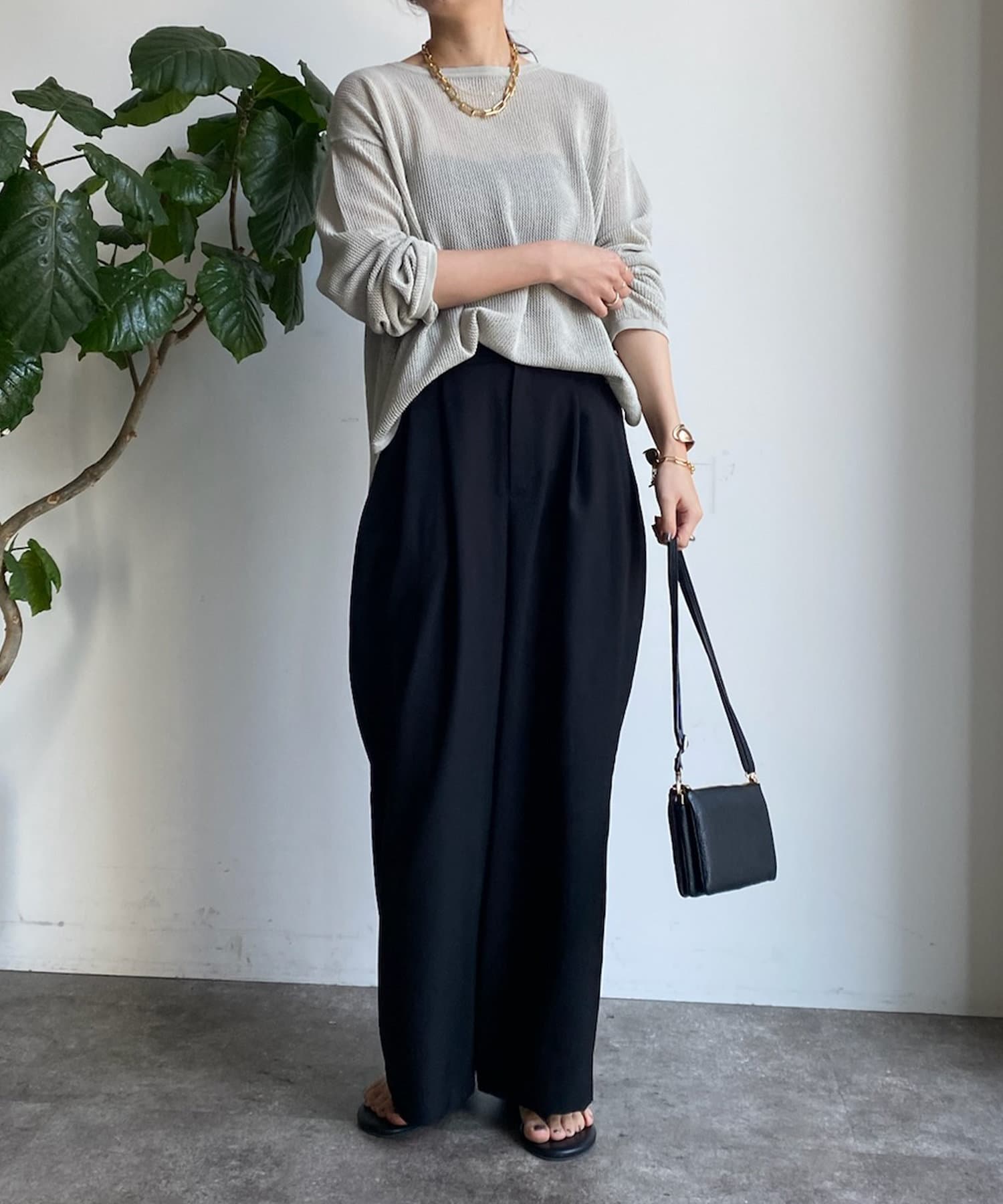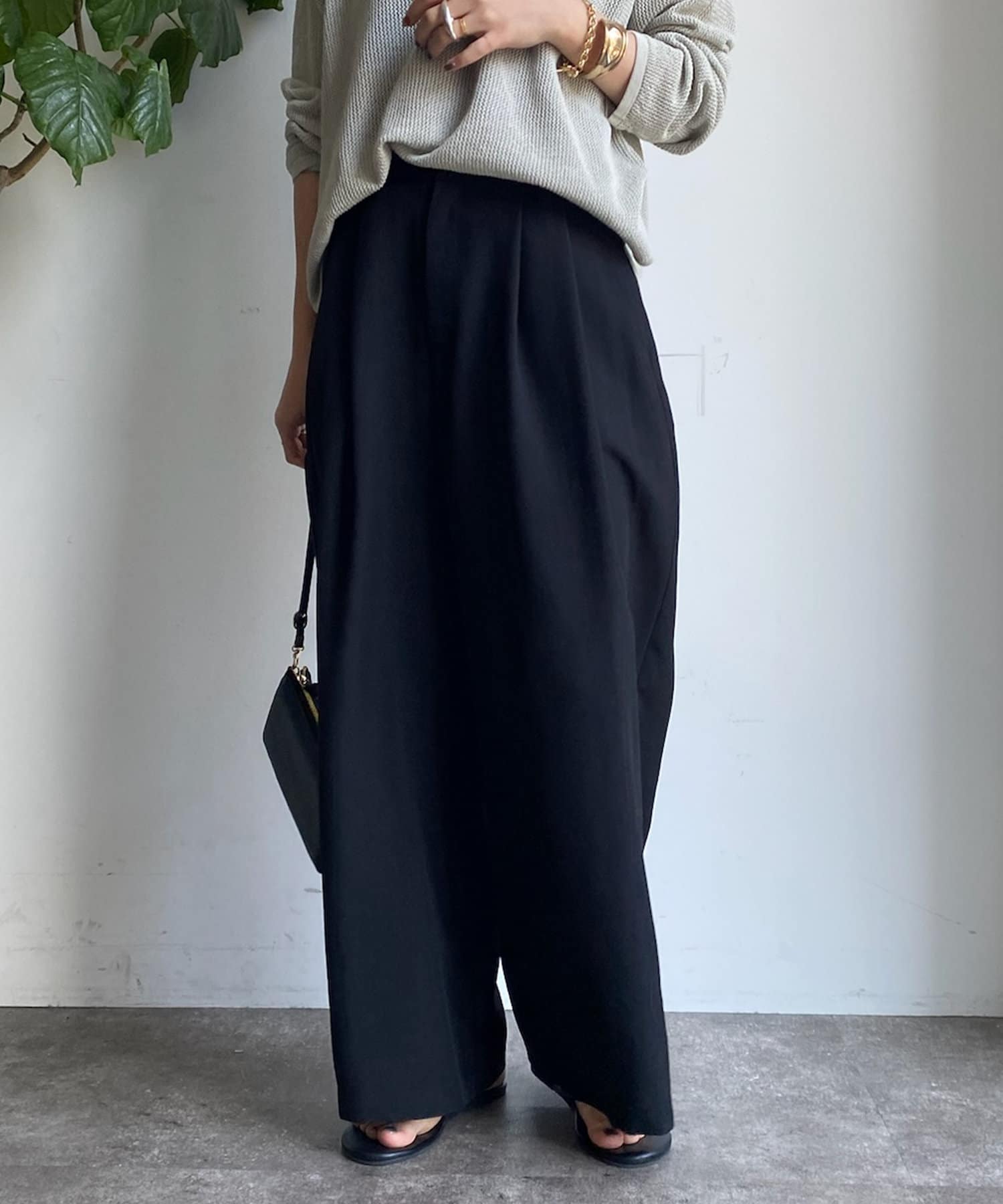 ワイドなシルエットは、脚のラインを拾わずイージー。