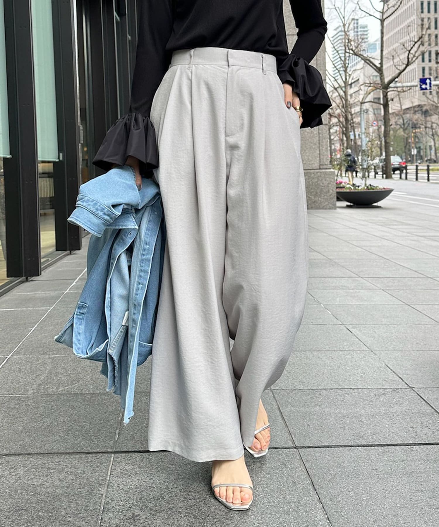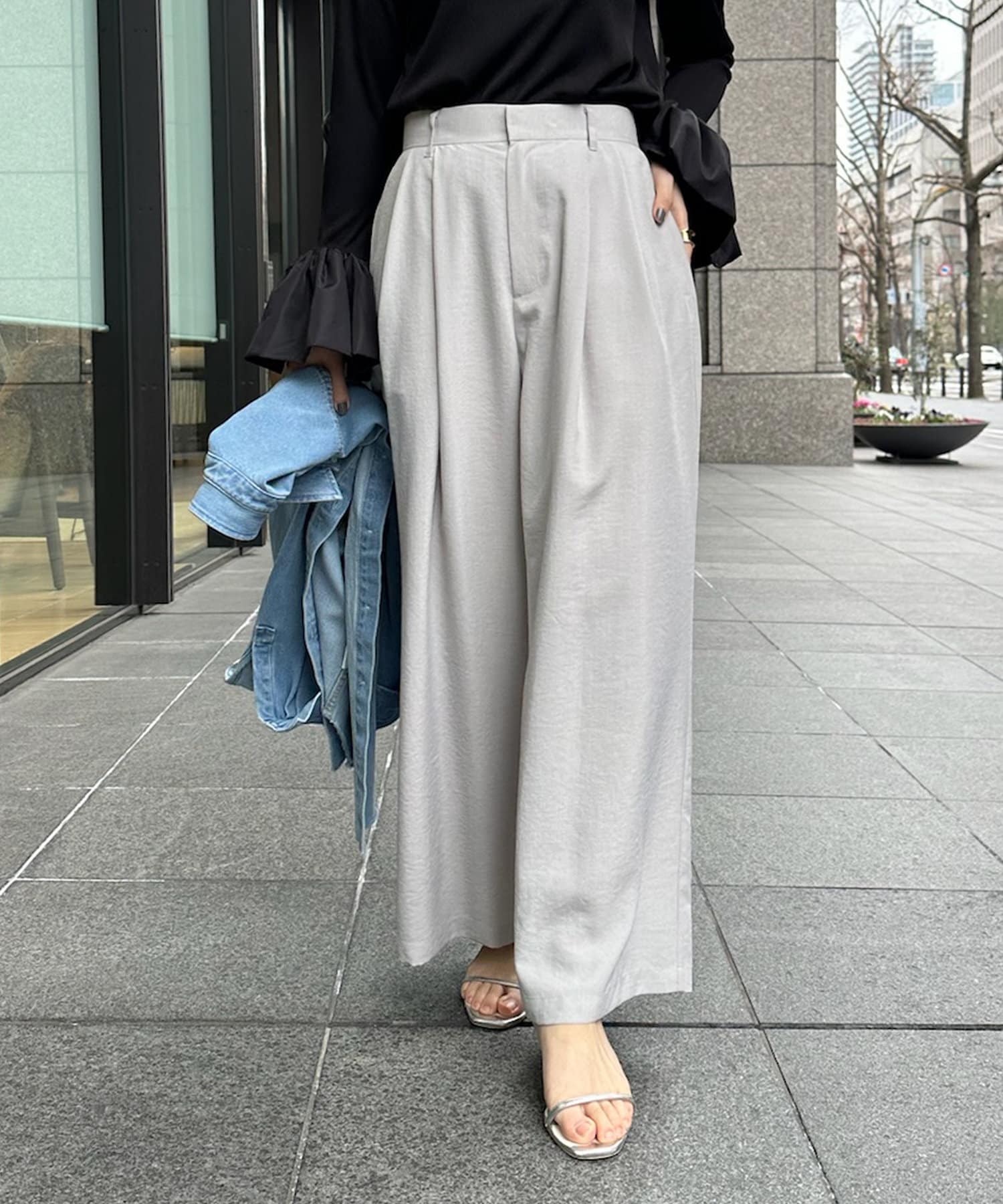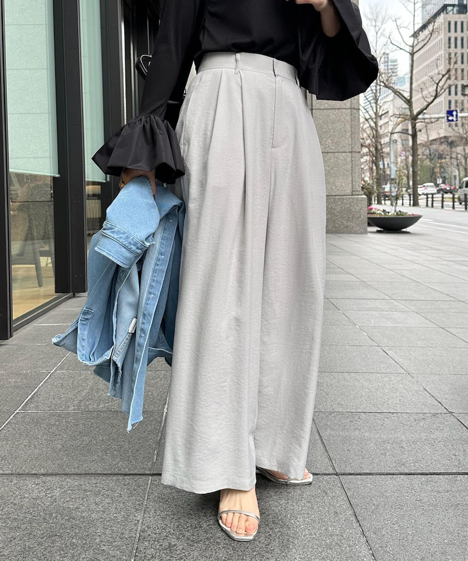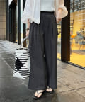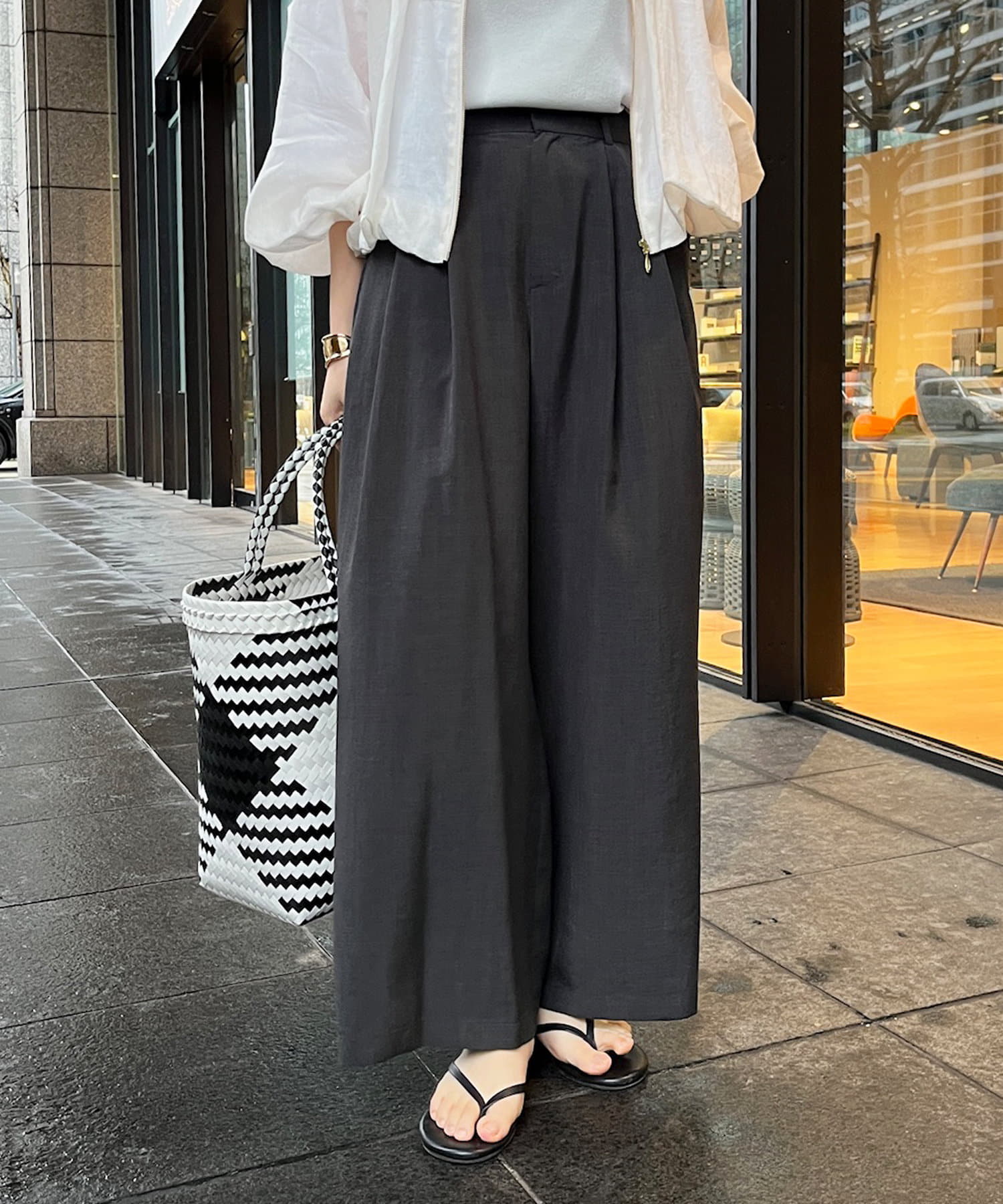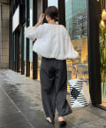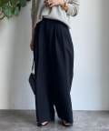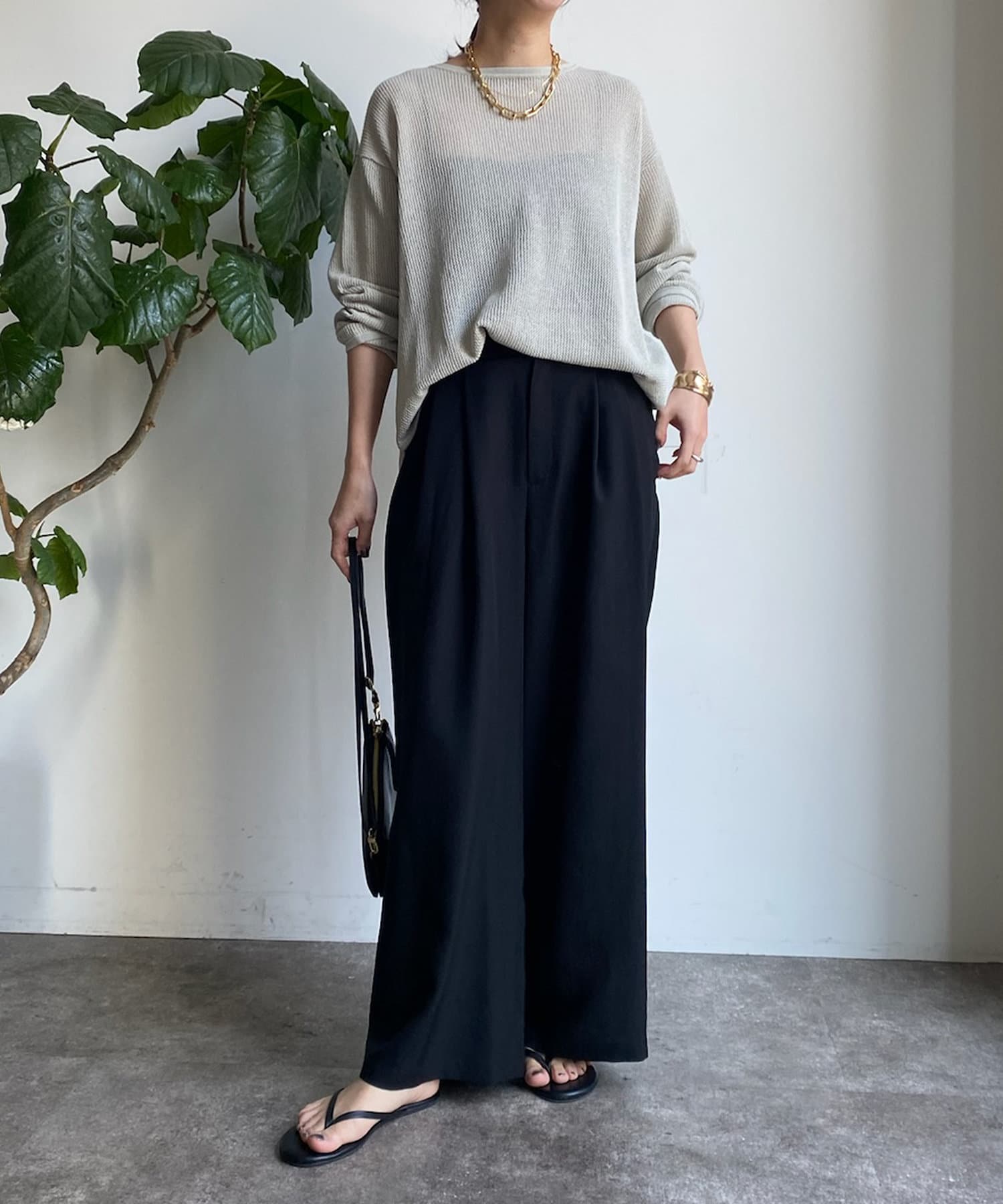 ワイドなシルエットは、脚のラインを拾わずイージー。