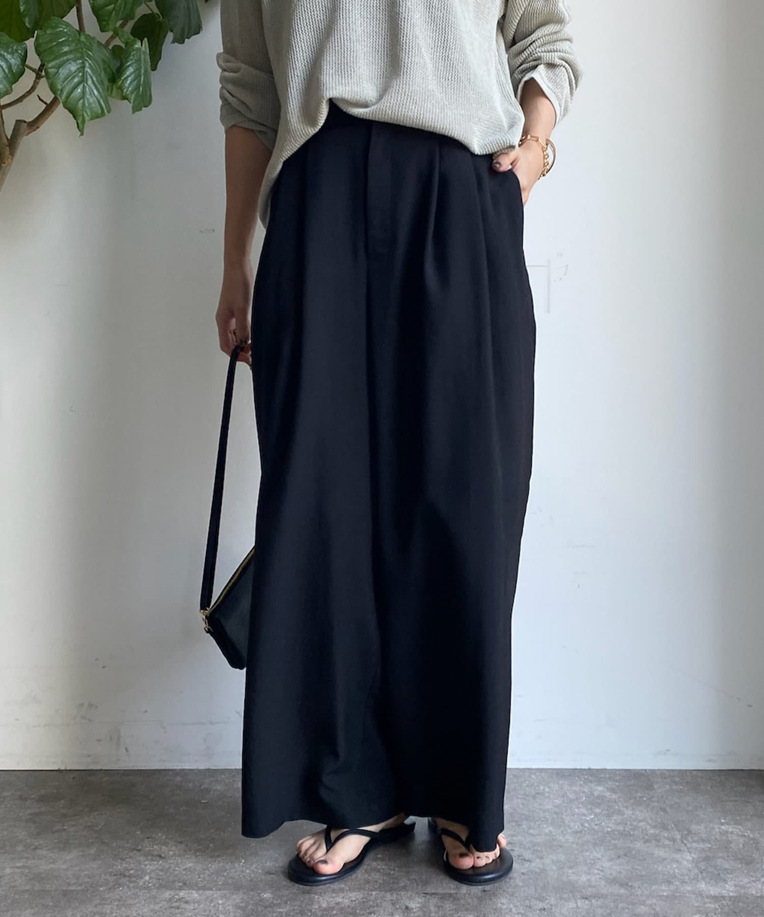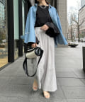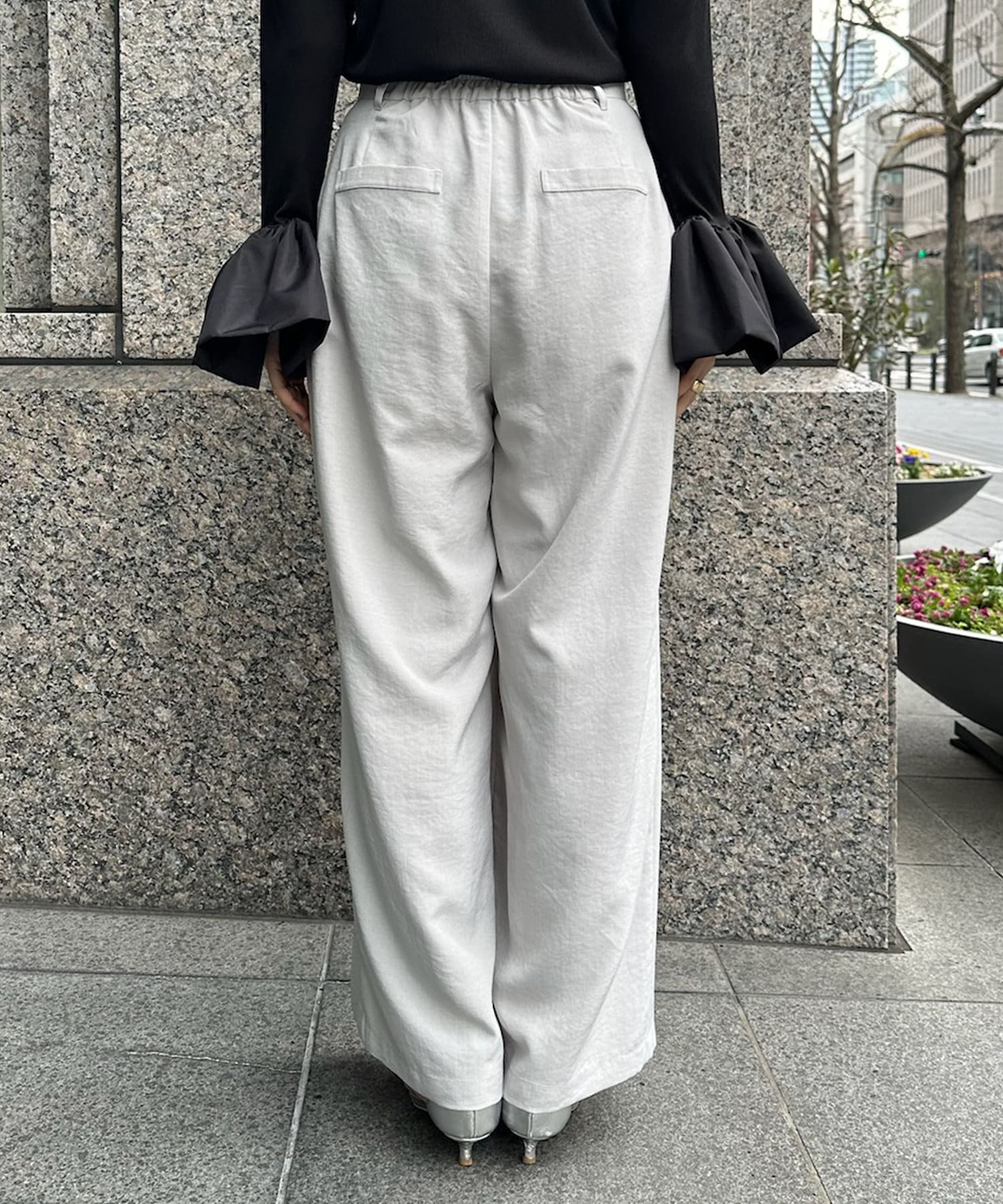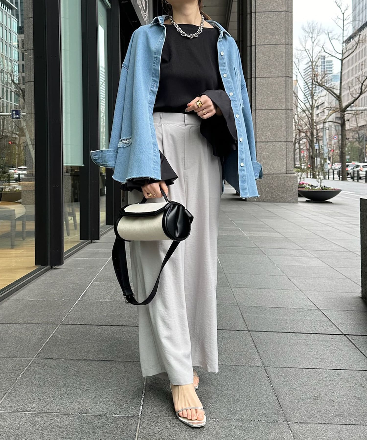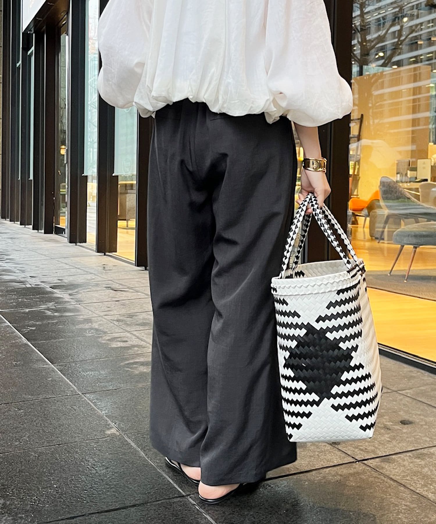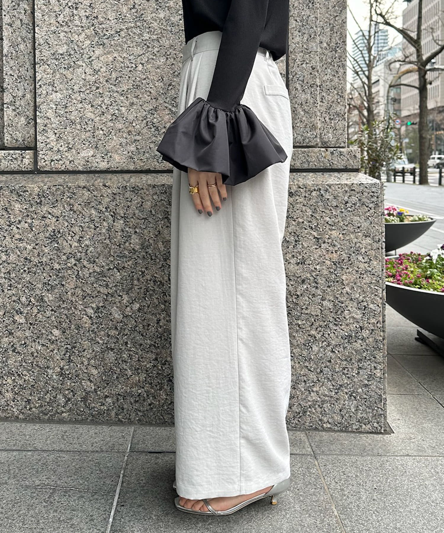 ワイドなシルエットは、脚のラインを拾わずイージー。