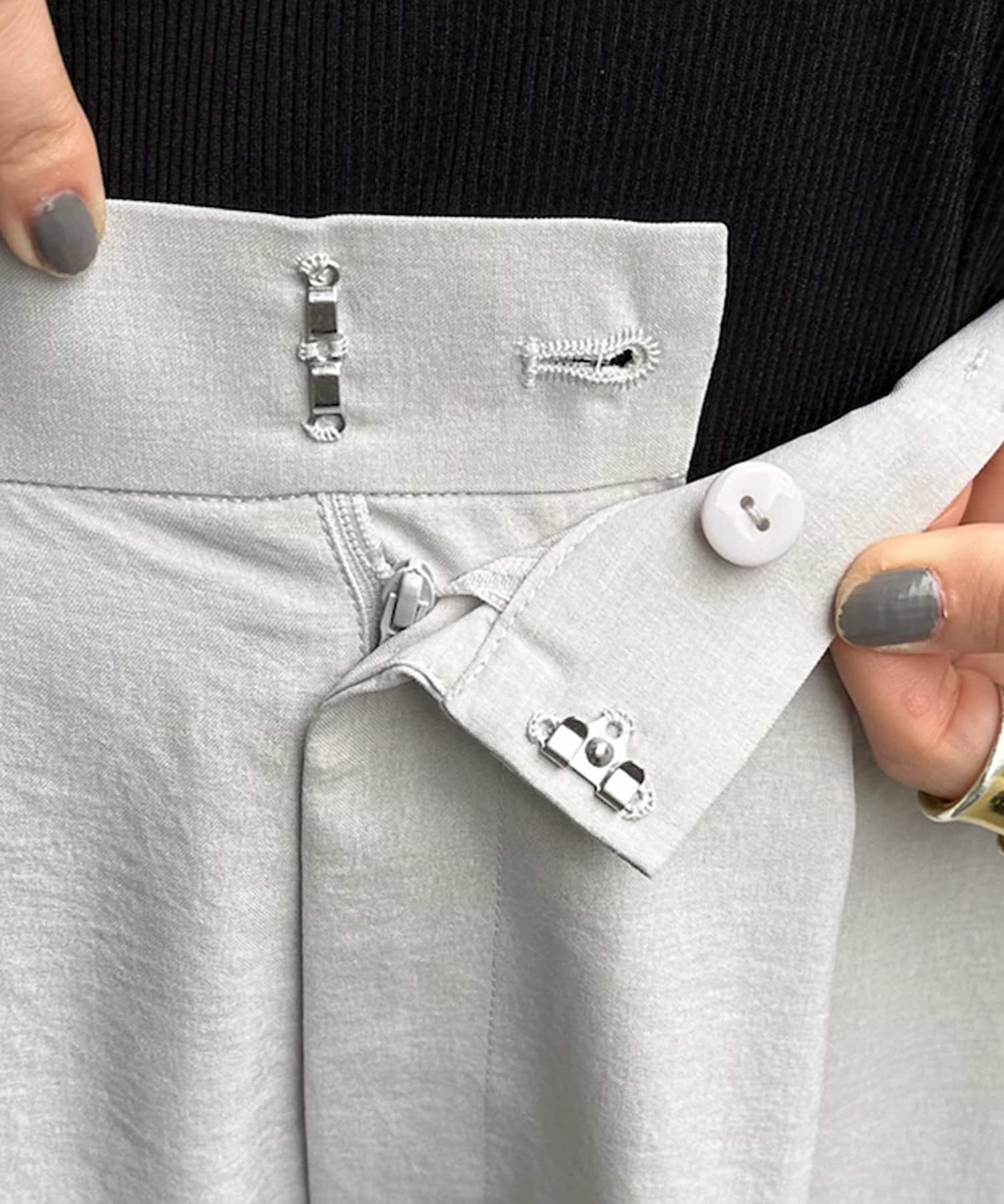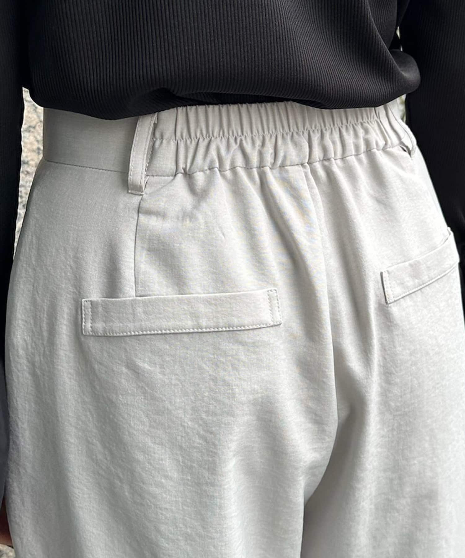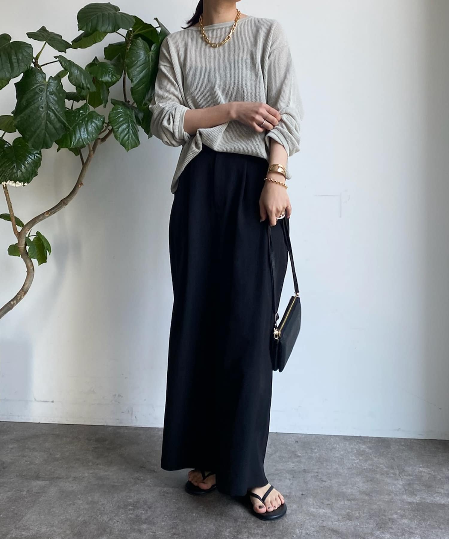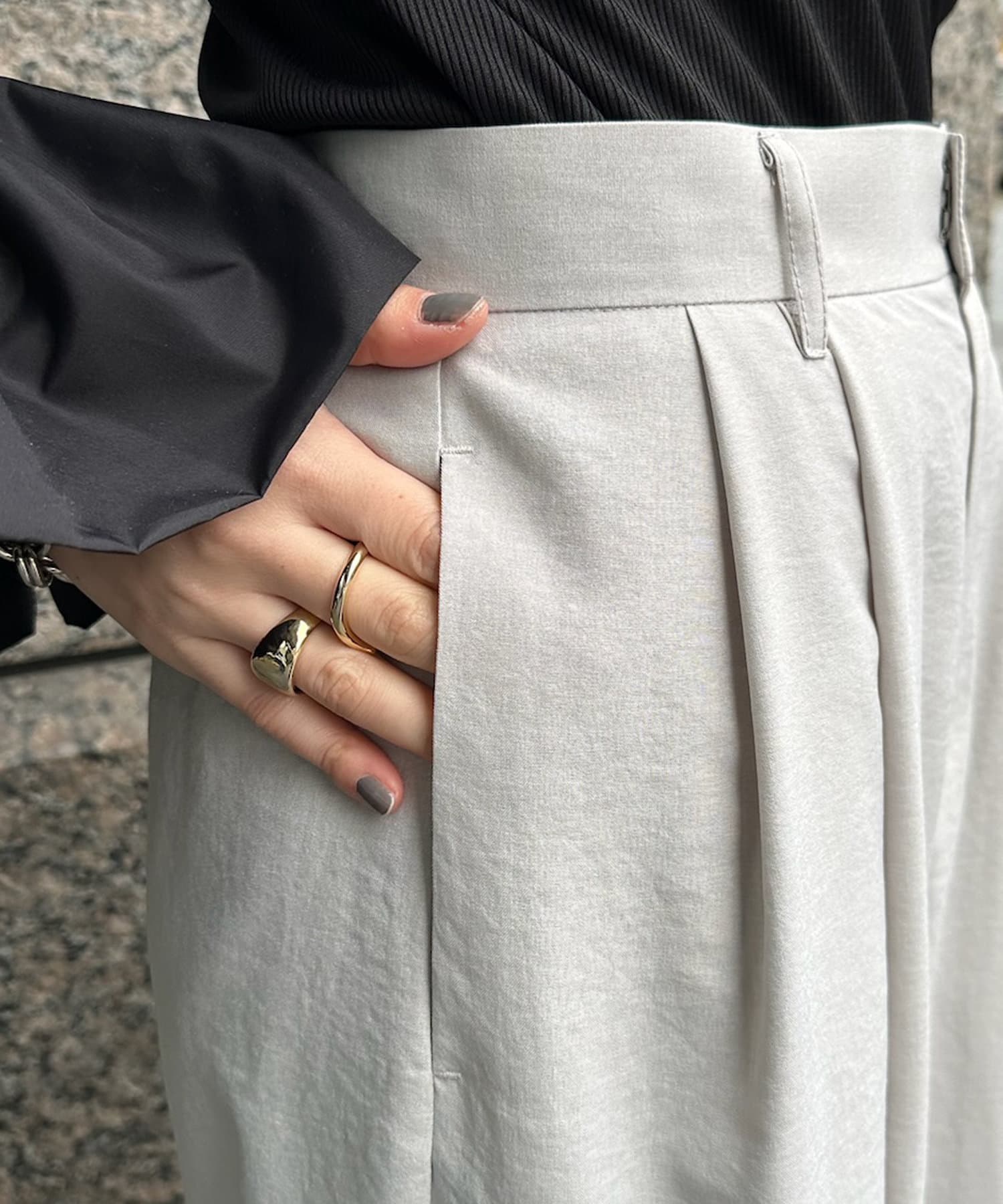 ワイドなシルエットは、脚のラインを拾わずイージー。