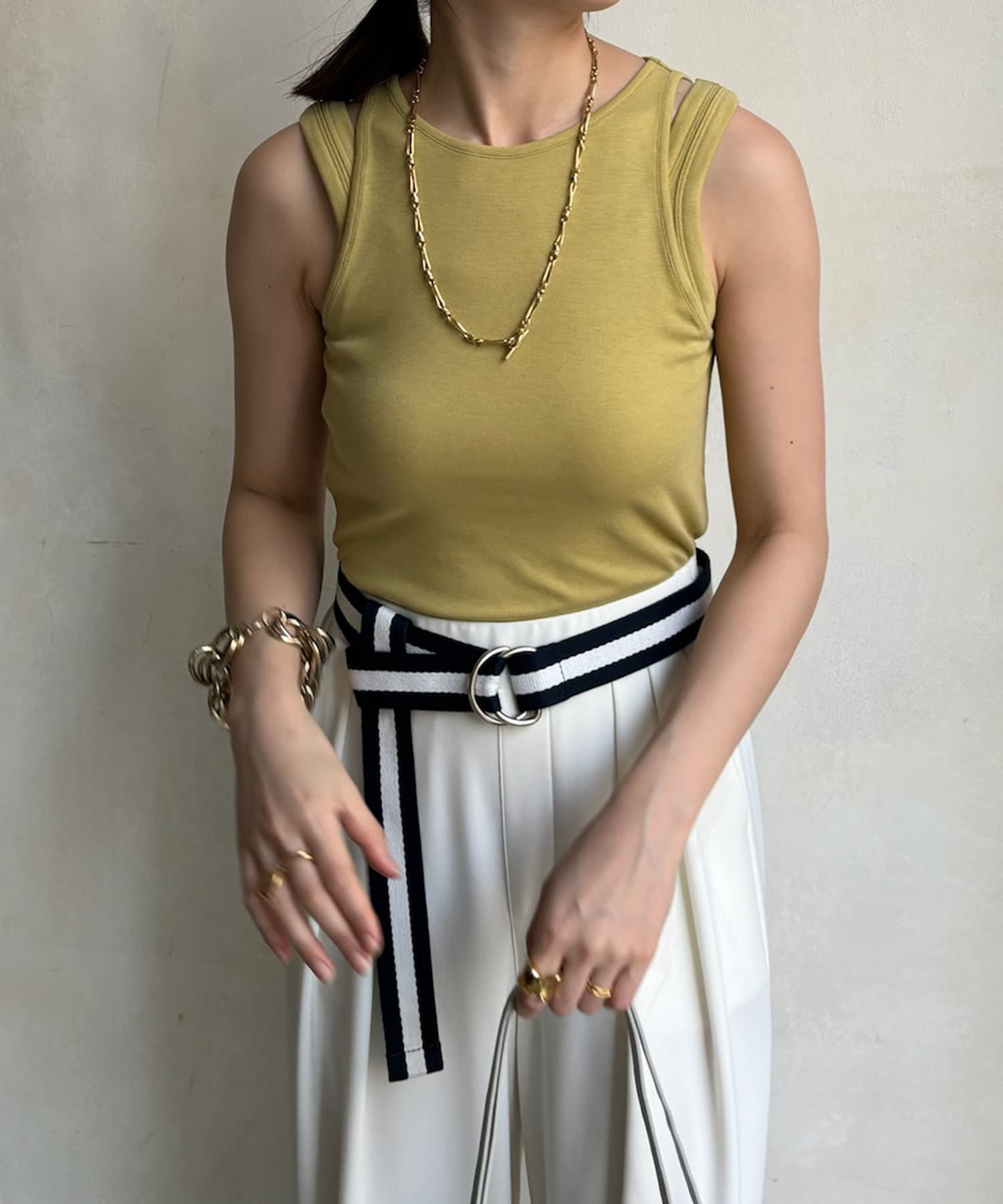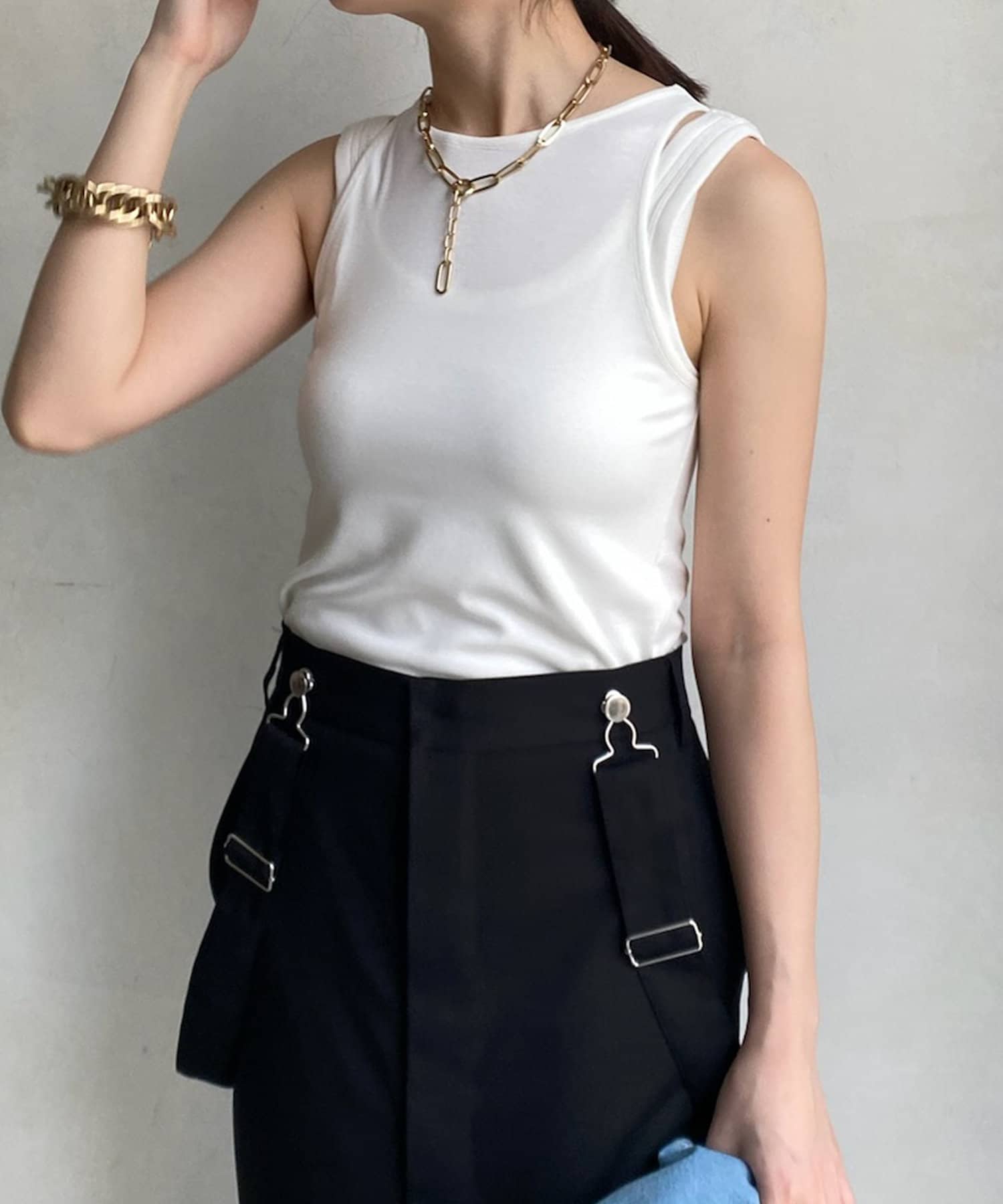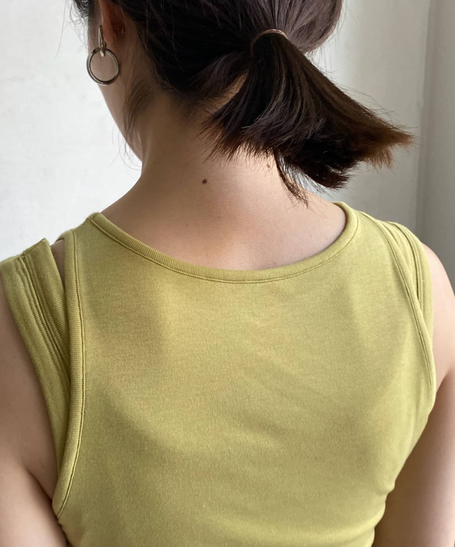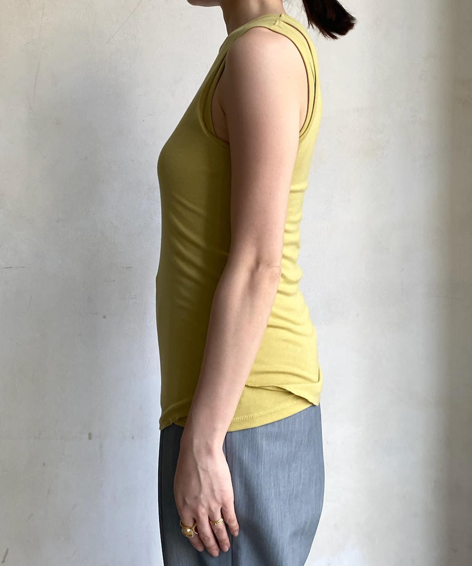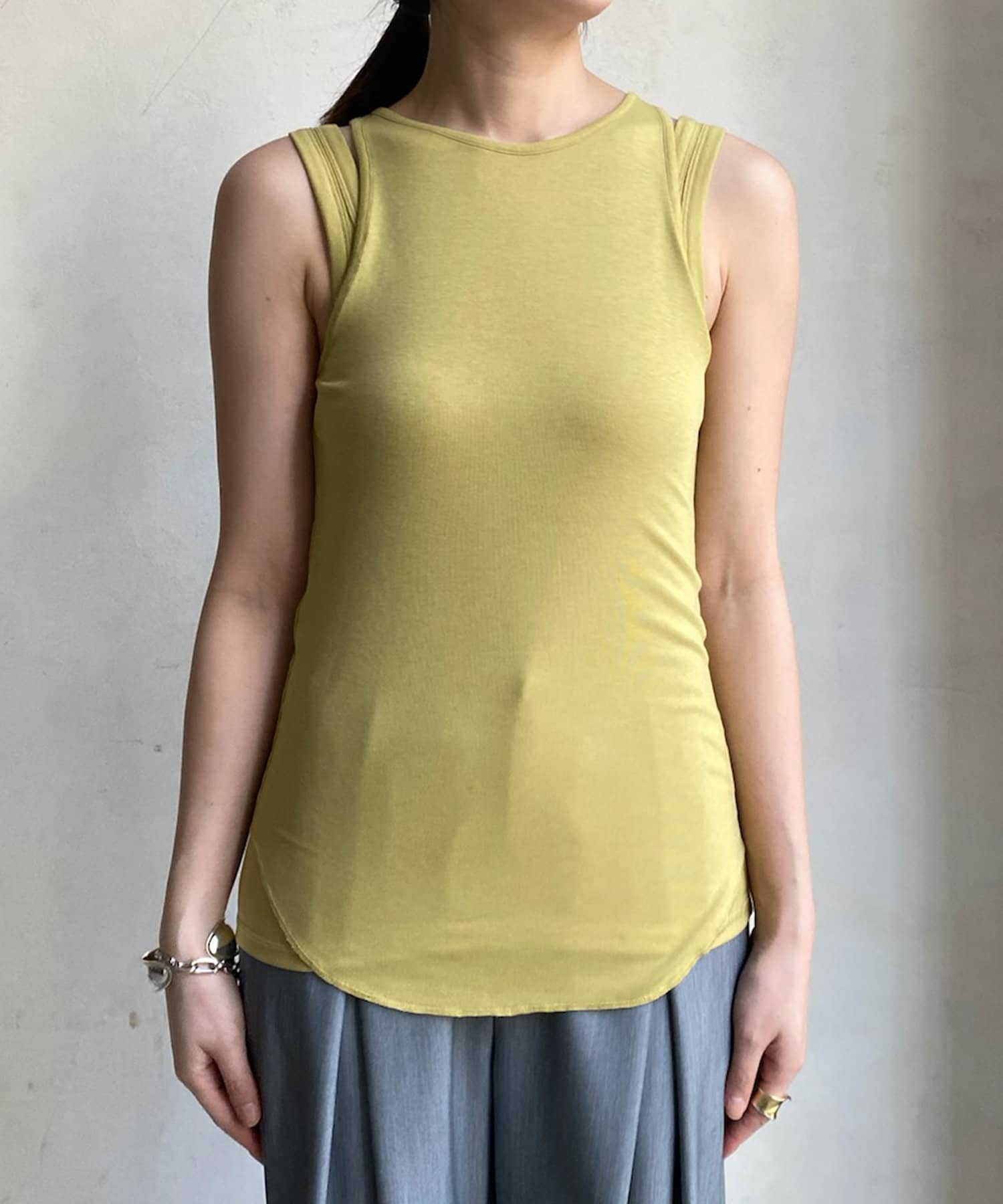 少しディティールの違うタンクトップを2枚重ねて着るアイテム。