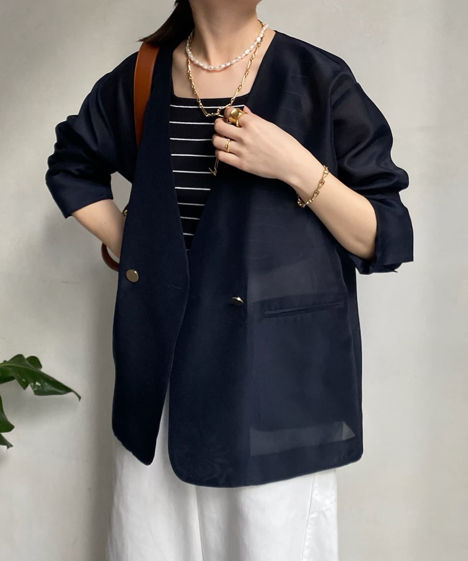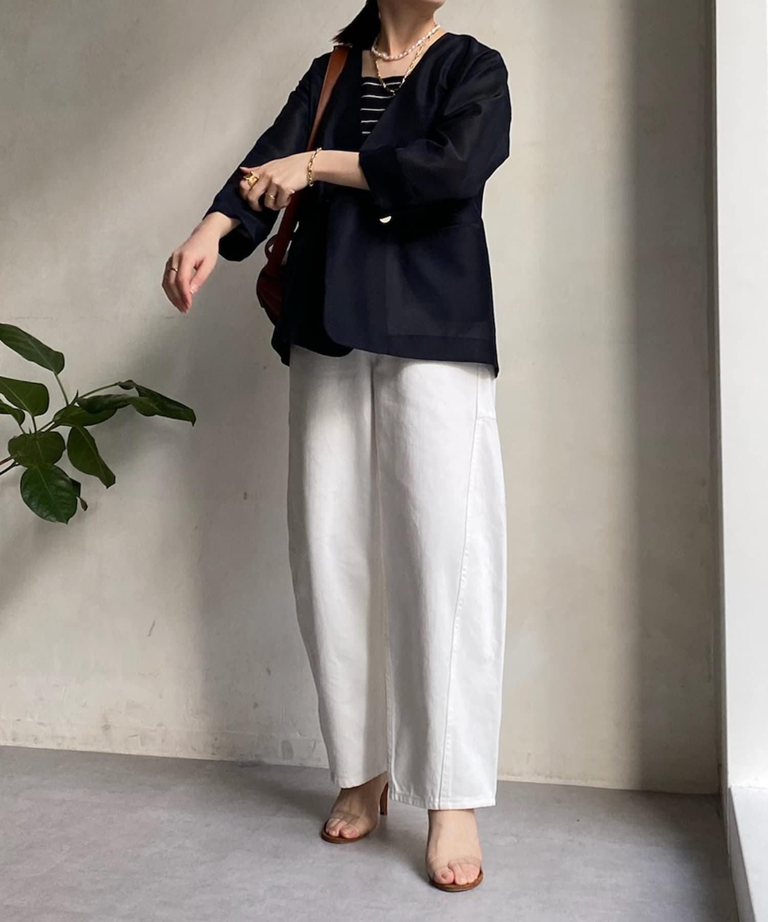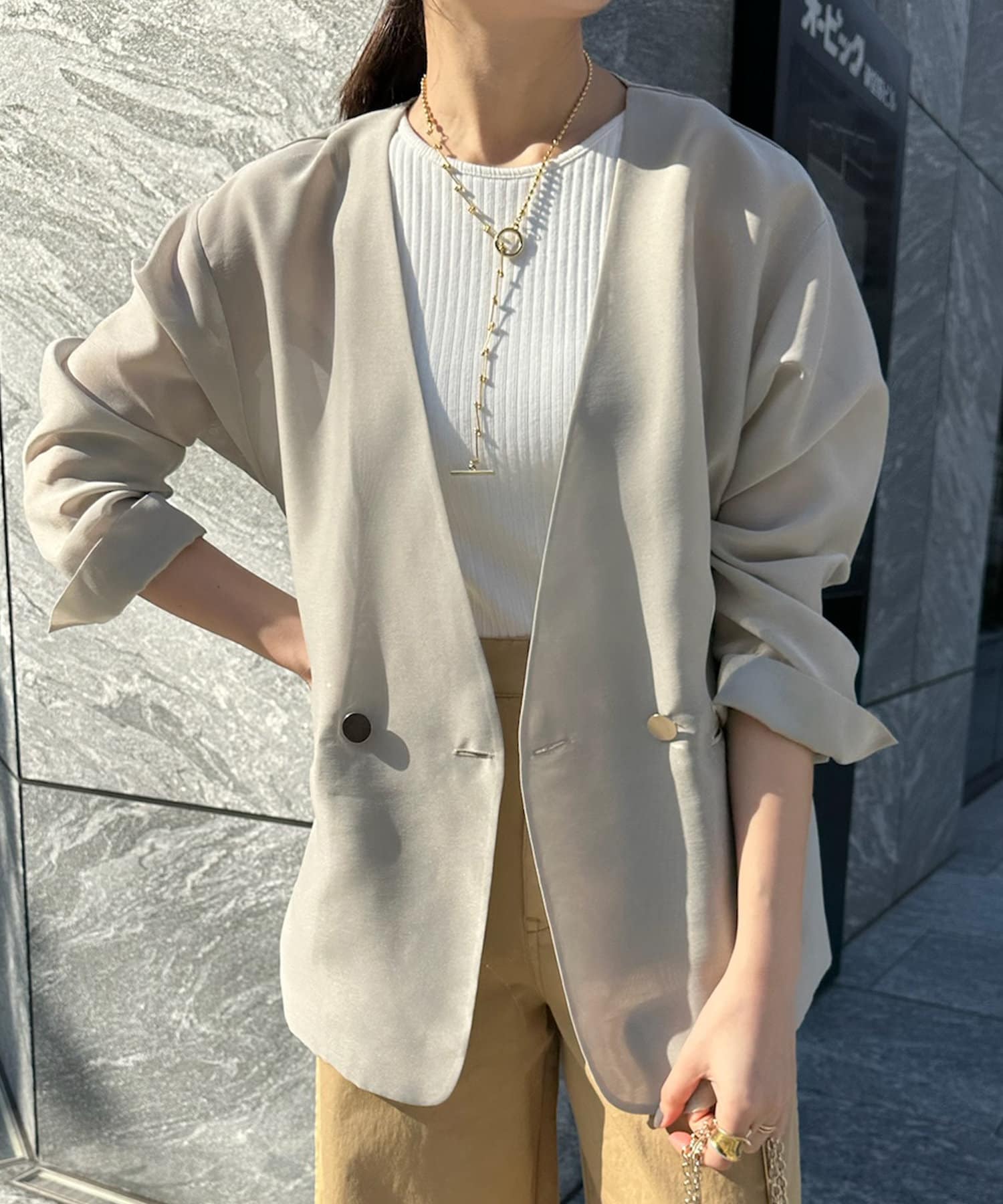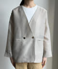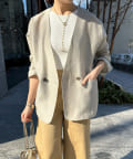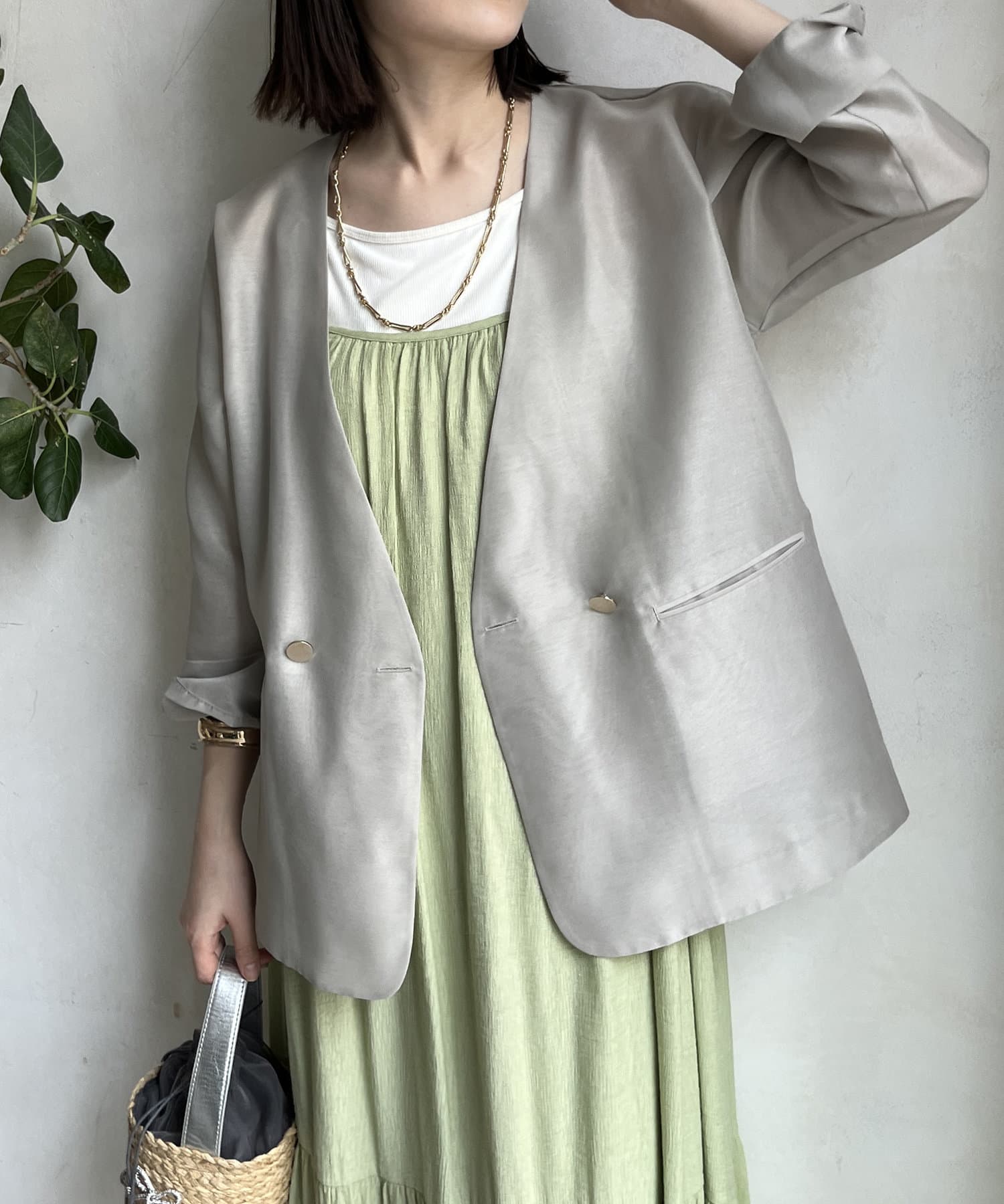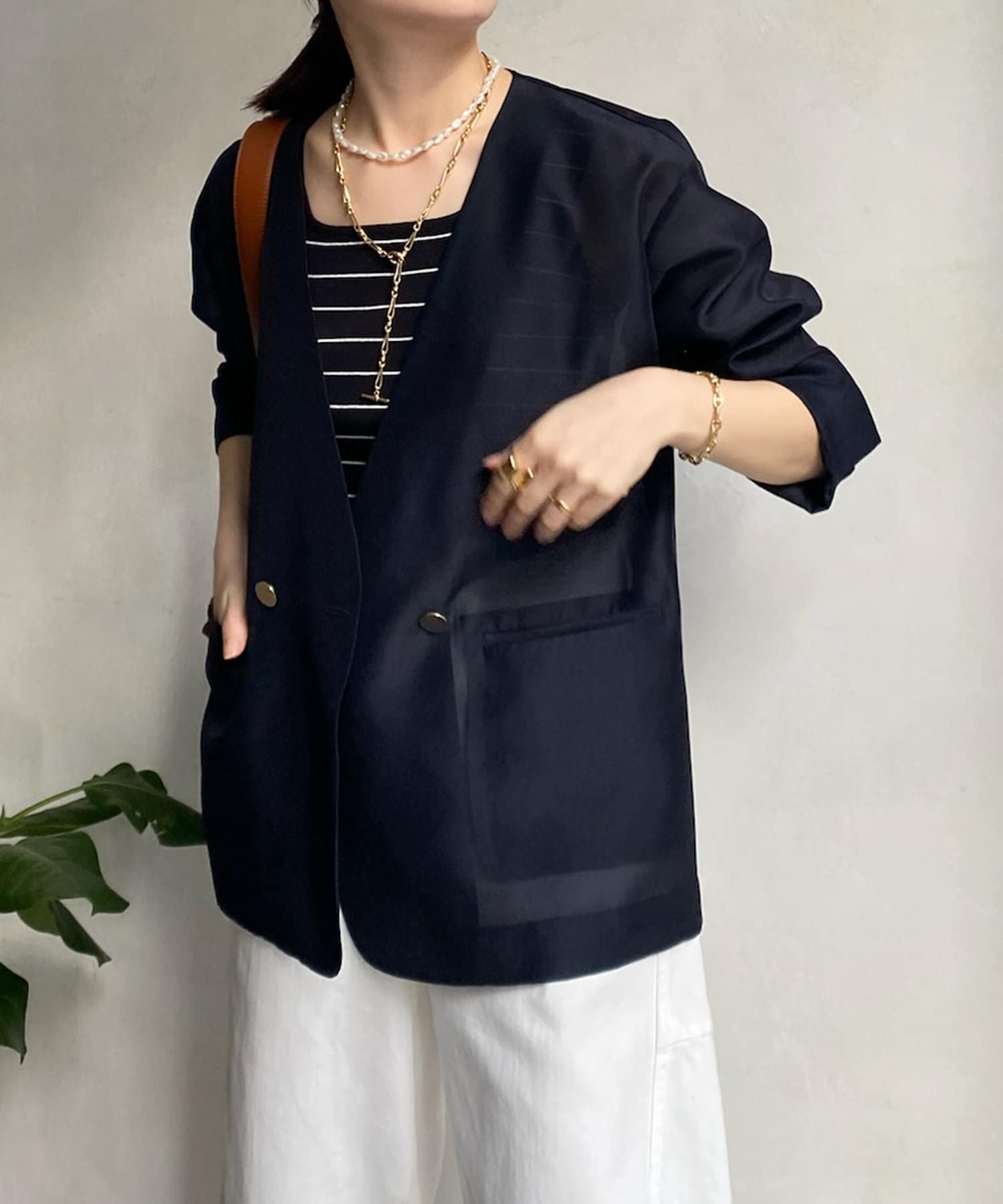 顔周りをすっきりと、季節感をぐっと上げてくれるノーカラージャケット。