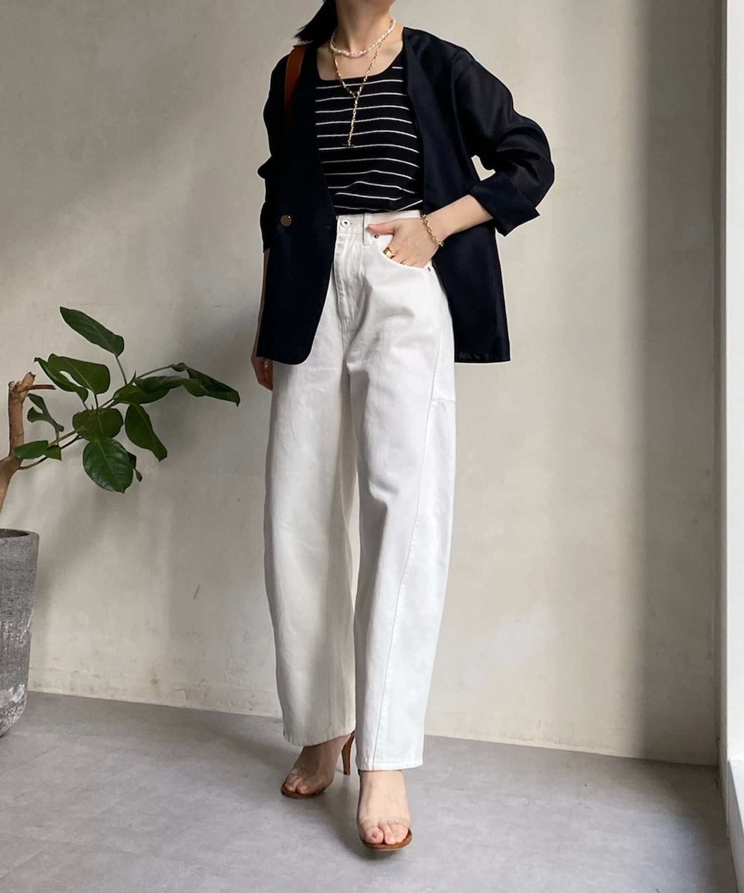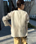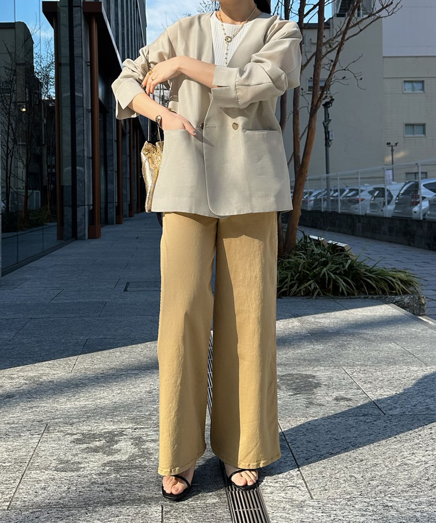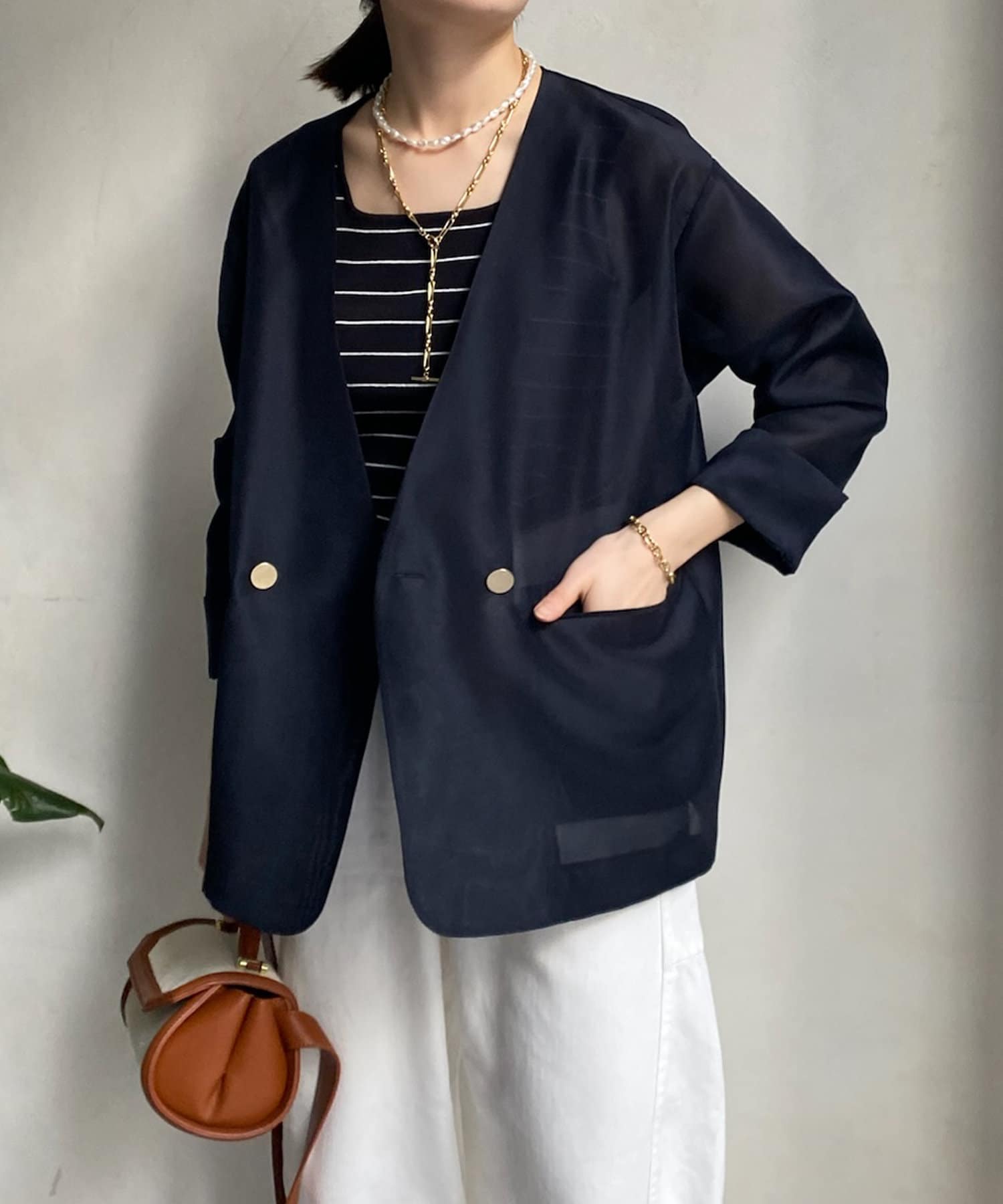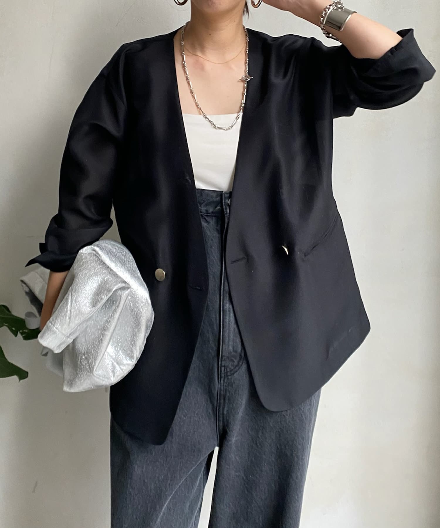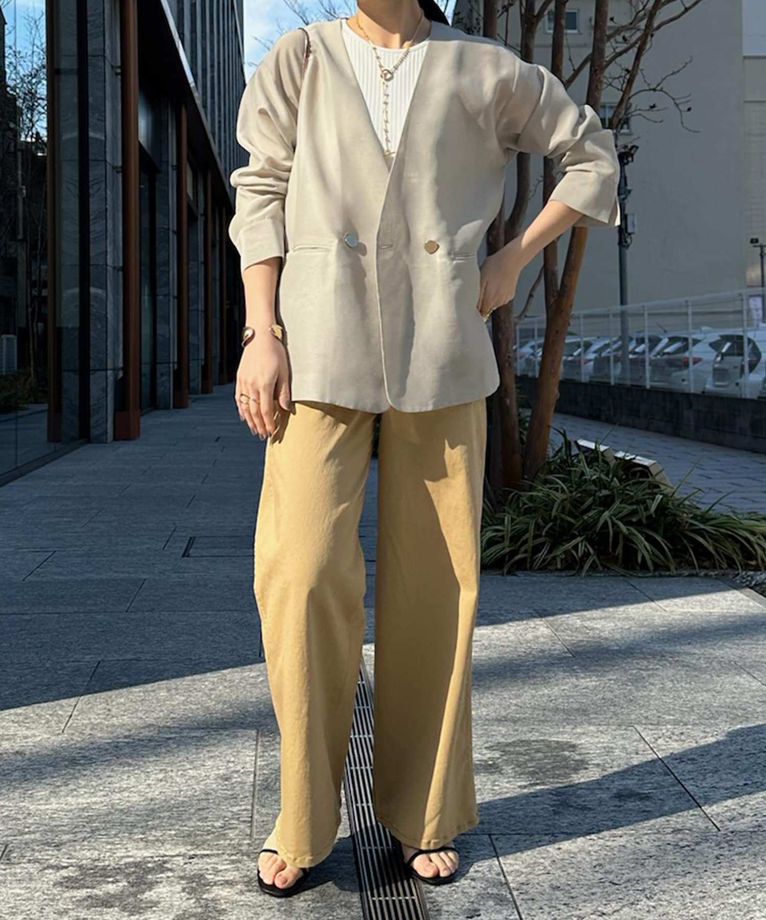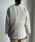 顔周りをすっきりと、季節感をぐっと上げてくれるノーカラージャケット。