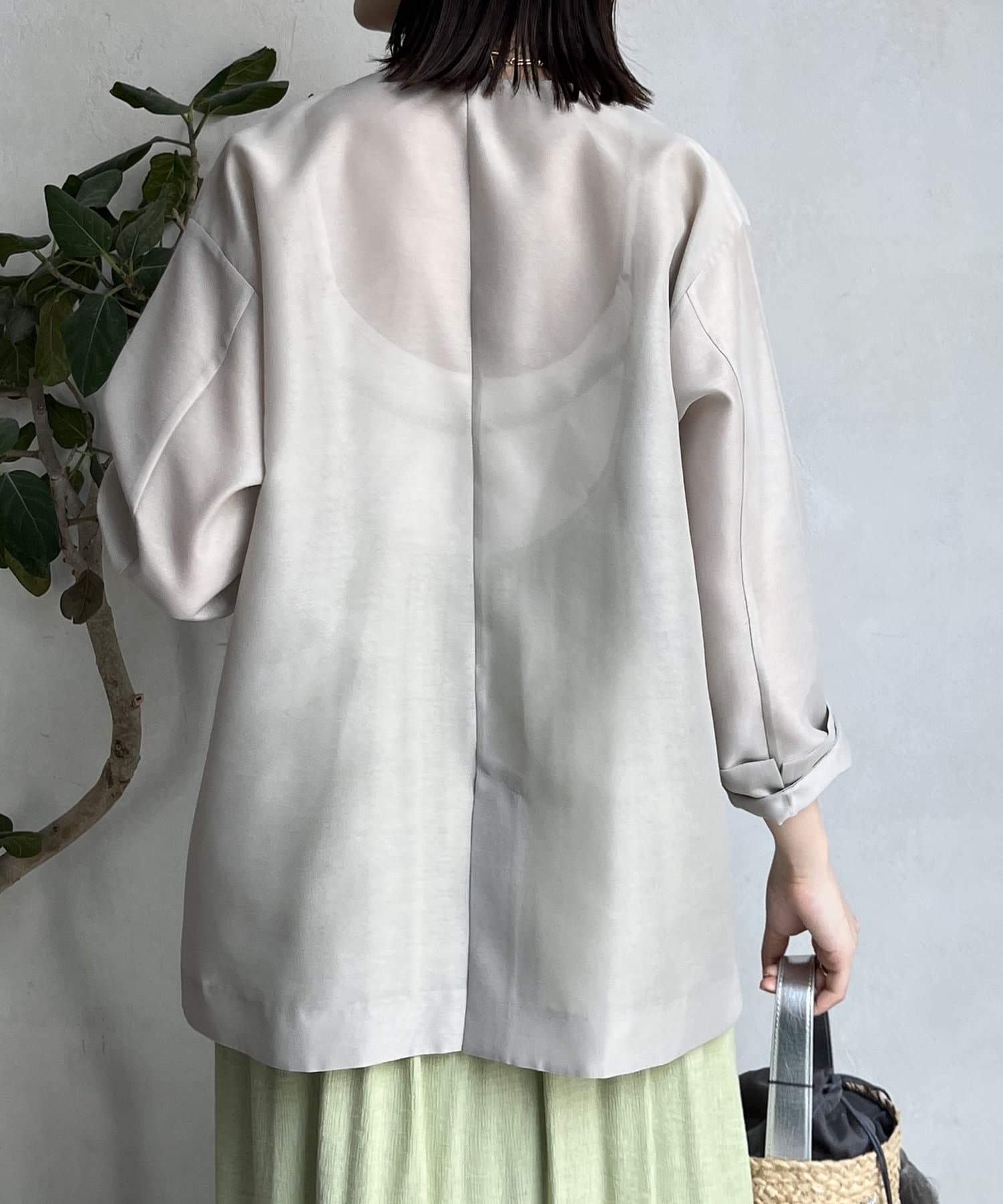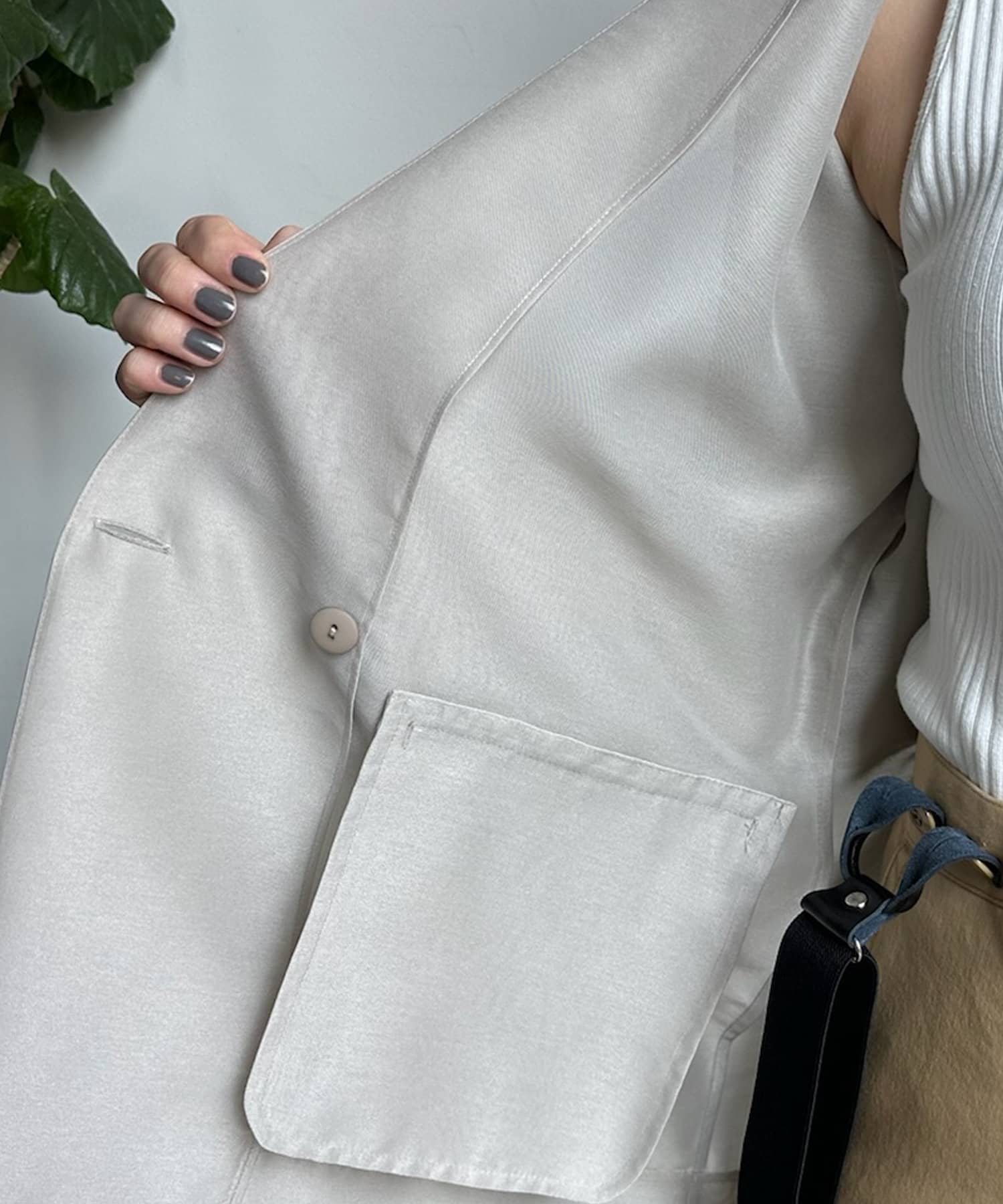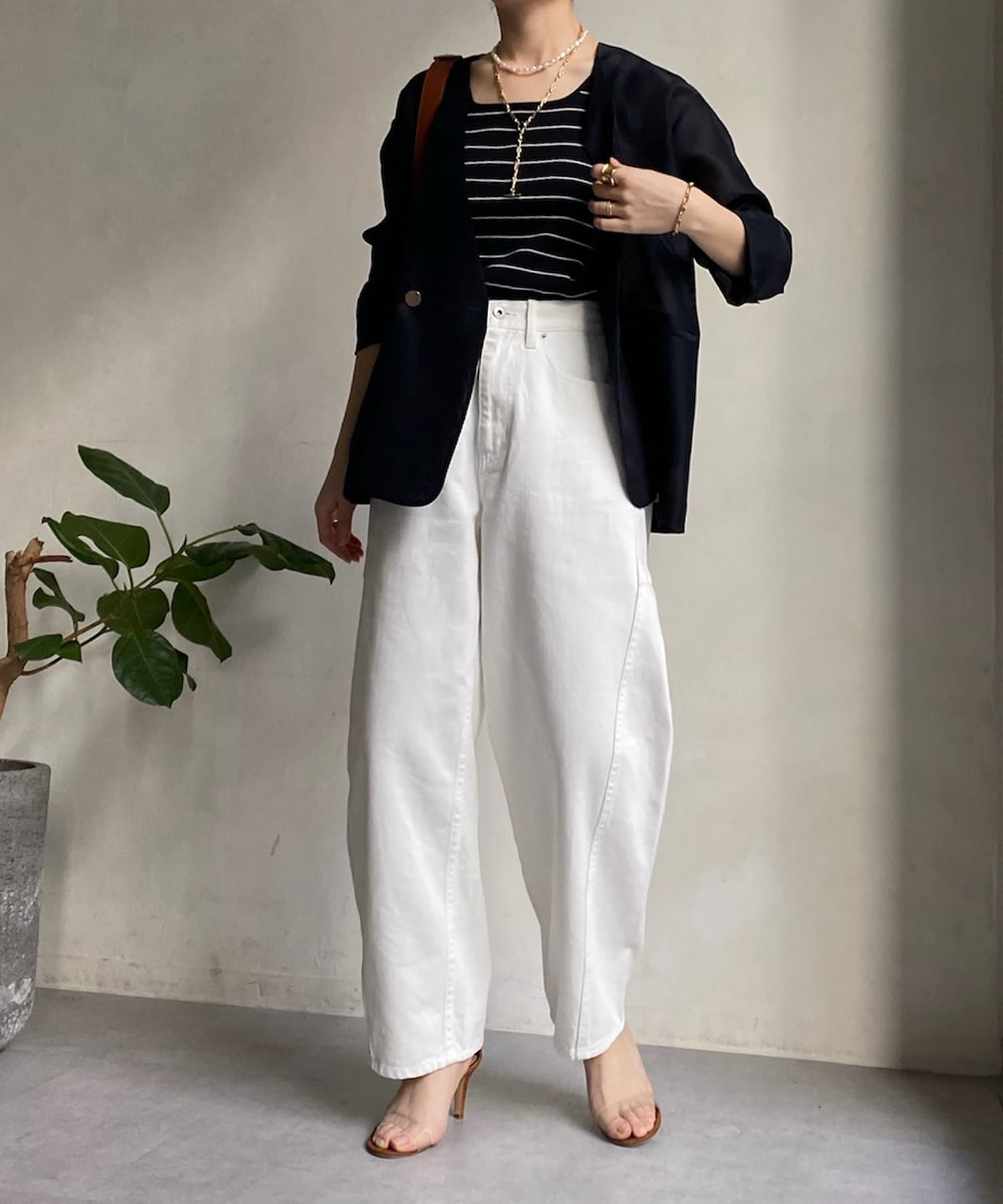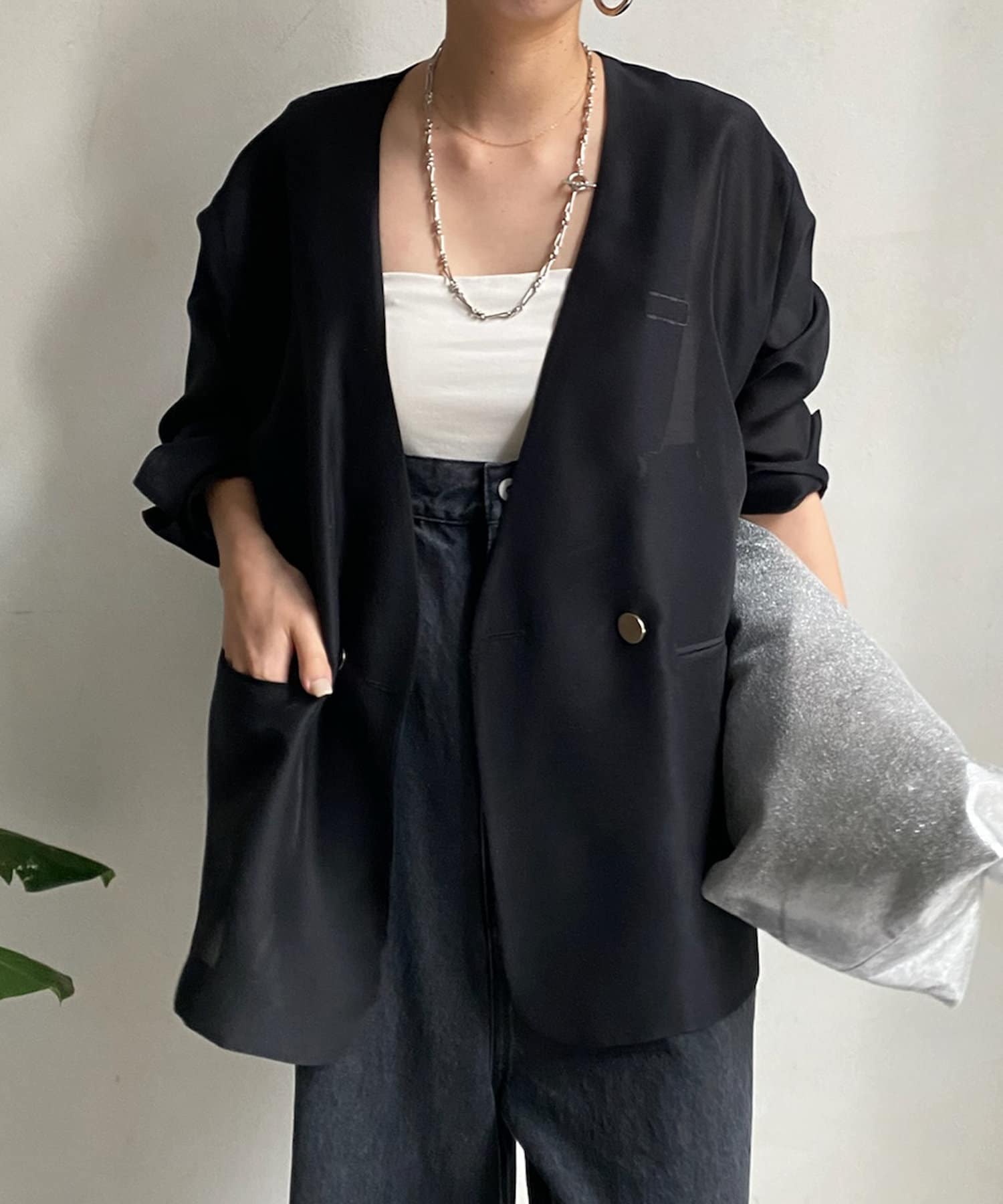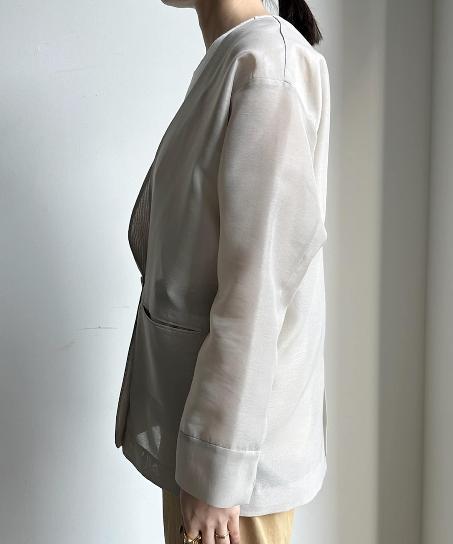顔周りをすっきりと、季節感をぐっと上げてくれるノーカラージャケット。