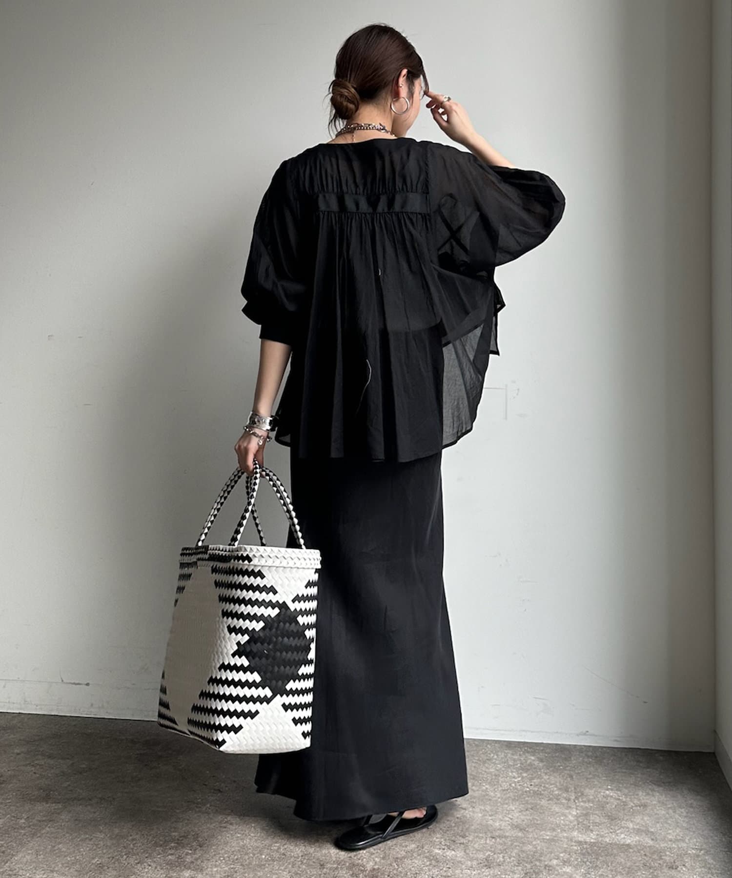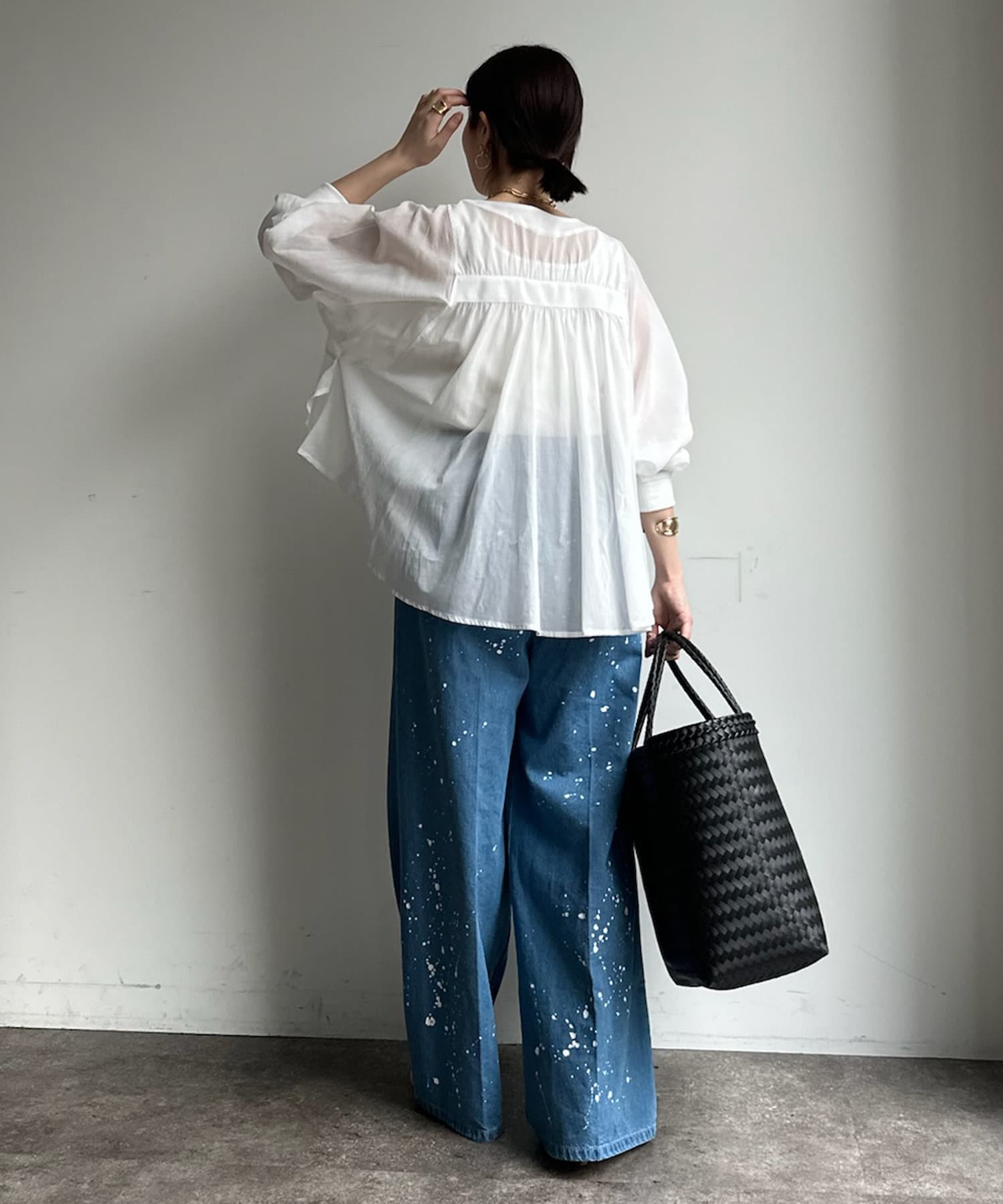 後ろ姿のデザインがコーディネイトに華やかさと抜け感でまとめてくれますよ◎