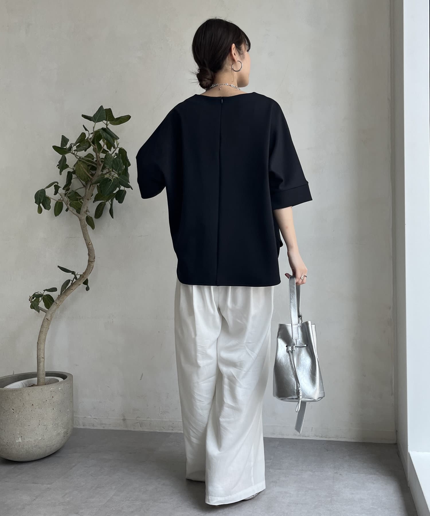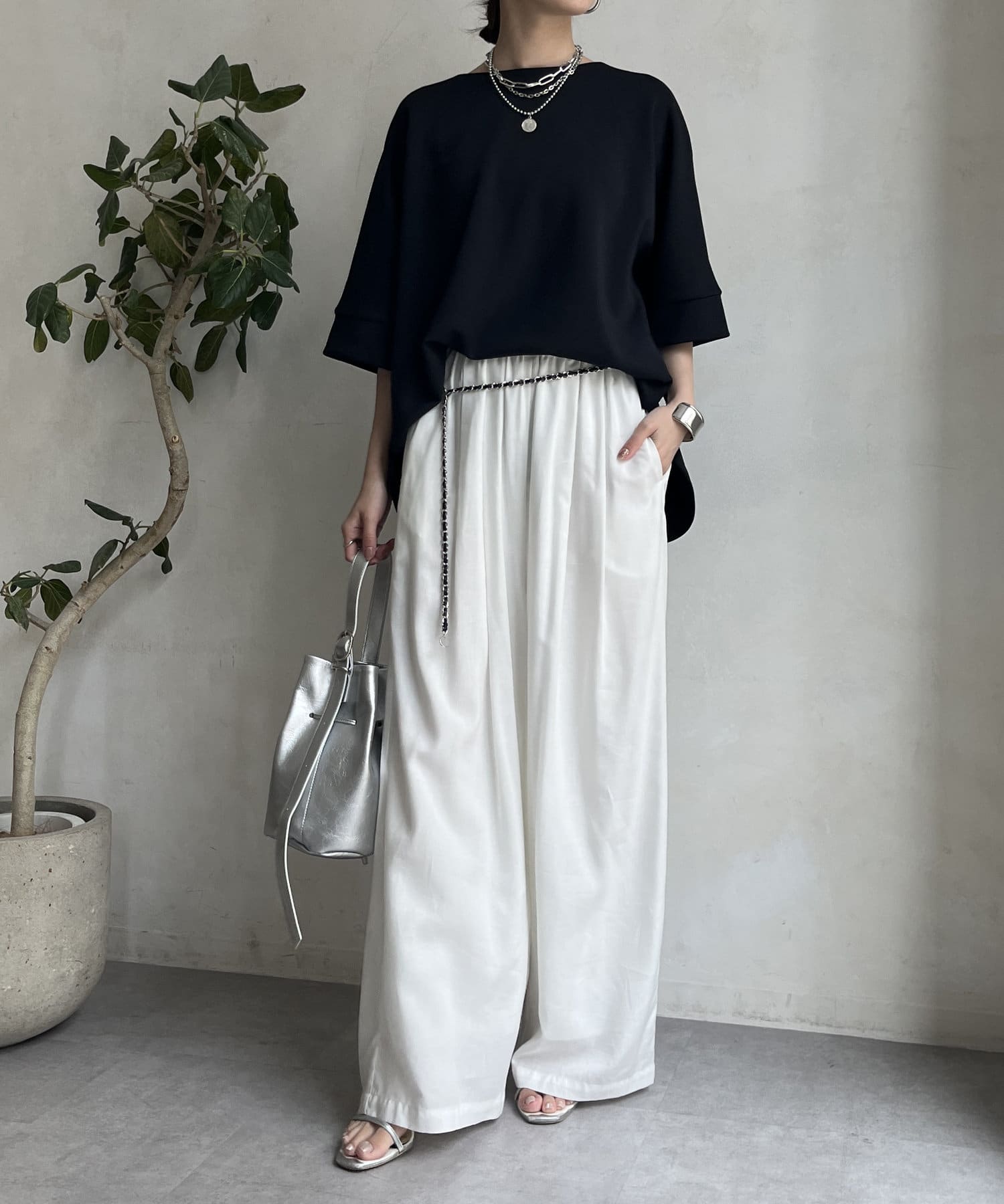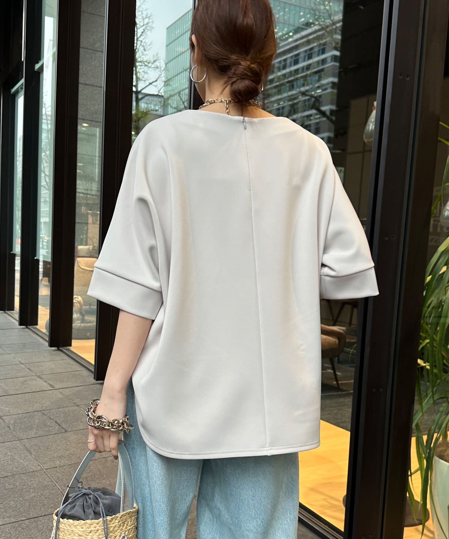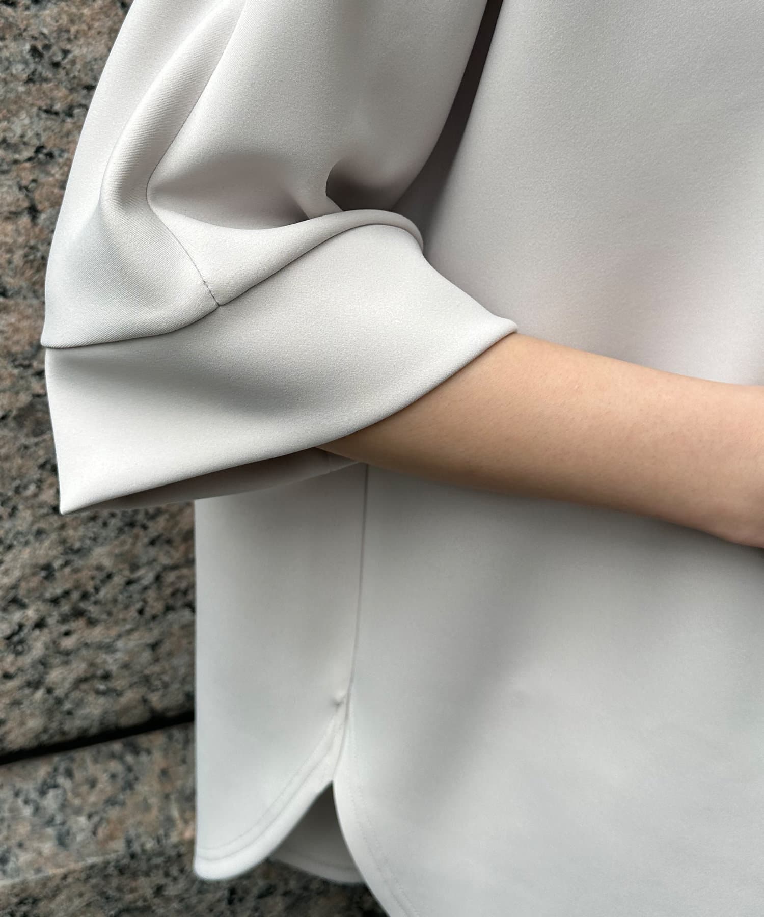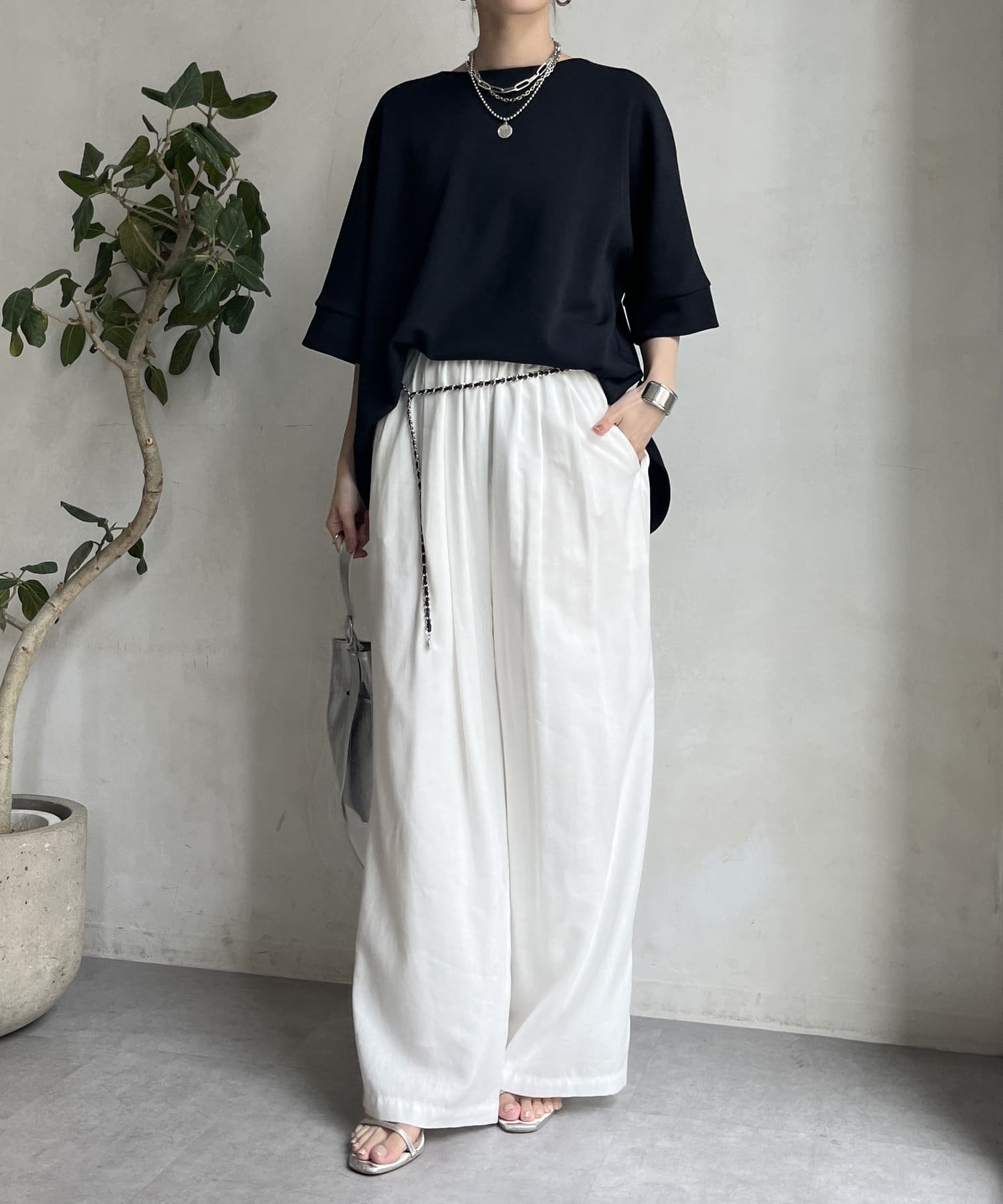 フラットな表面感で、通常のカットソーよりもきれいめな印象に決まるのがポイントです。