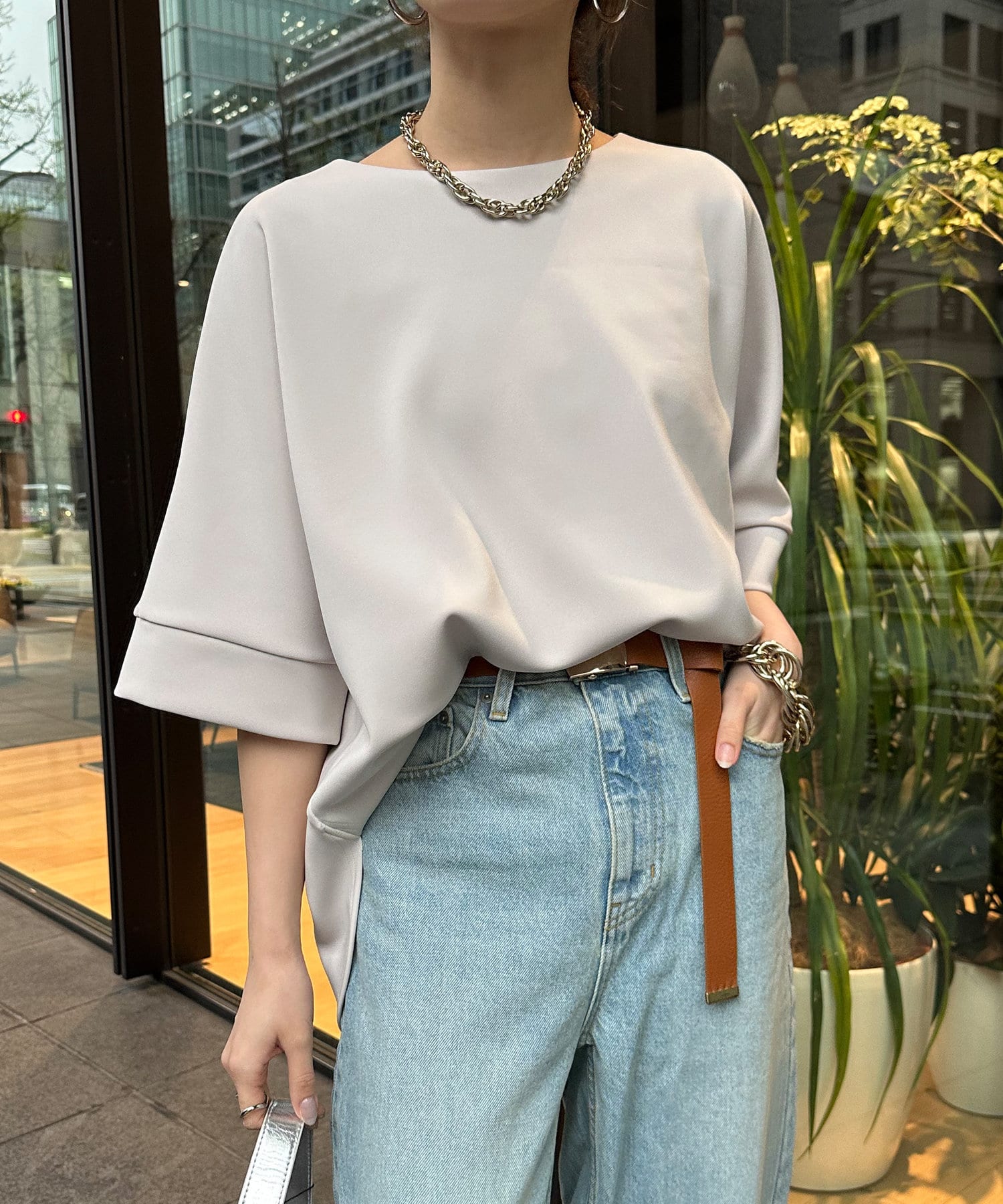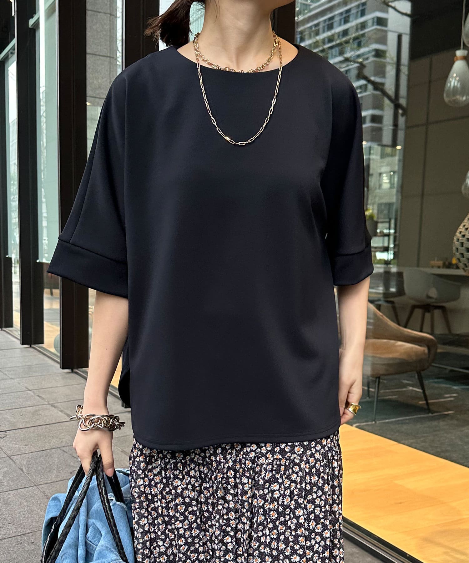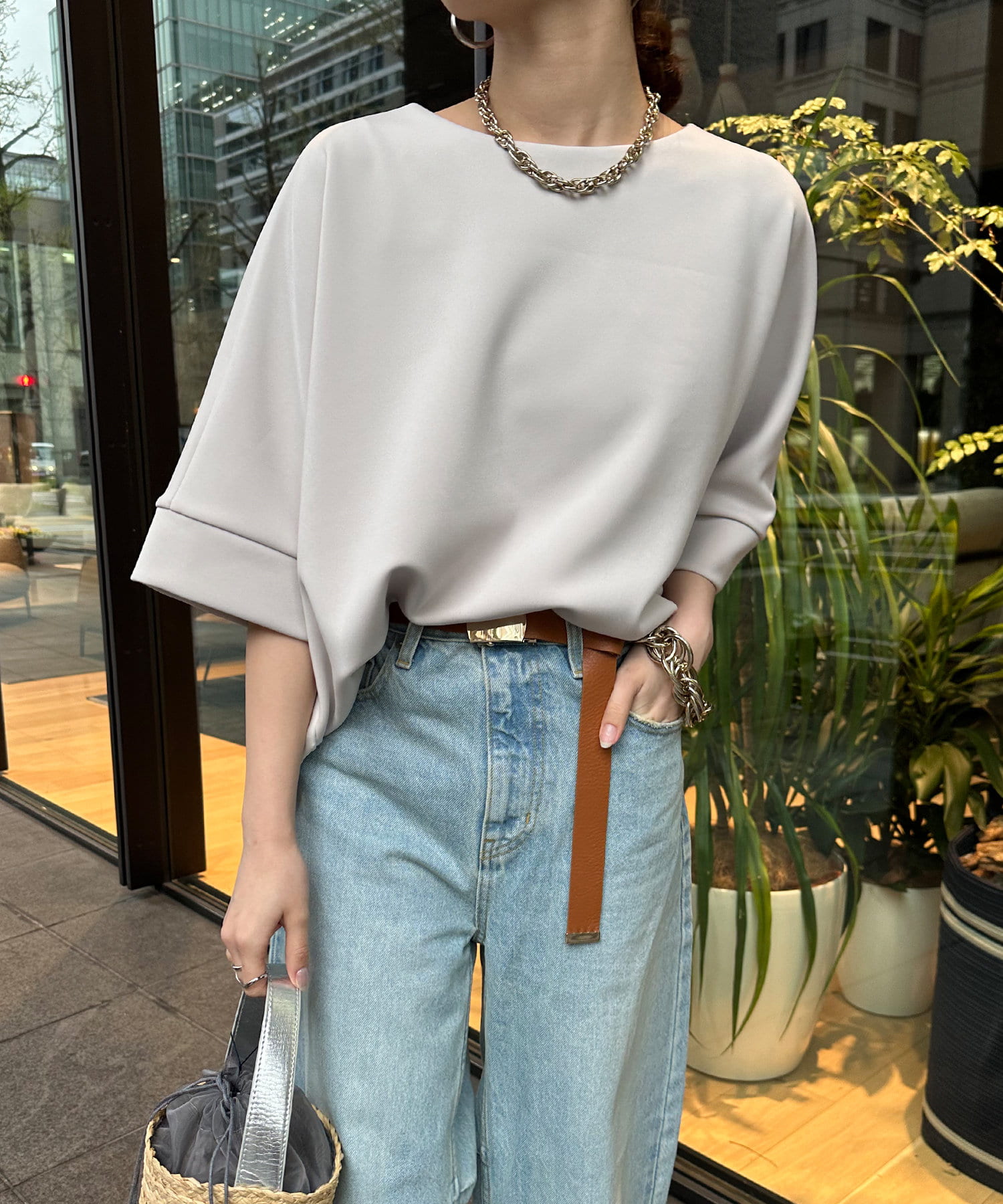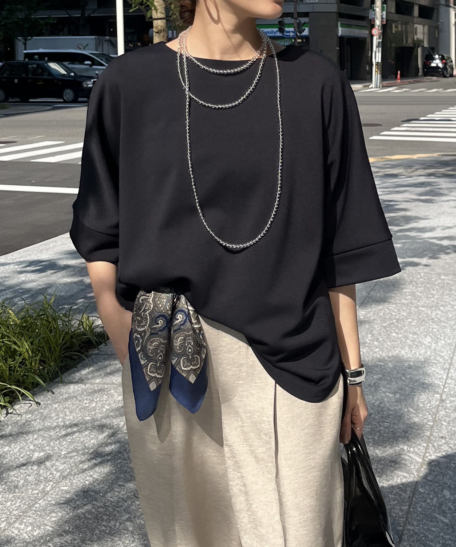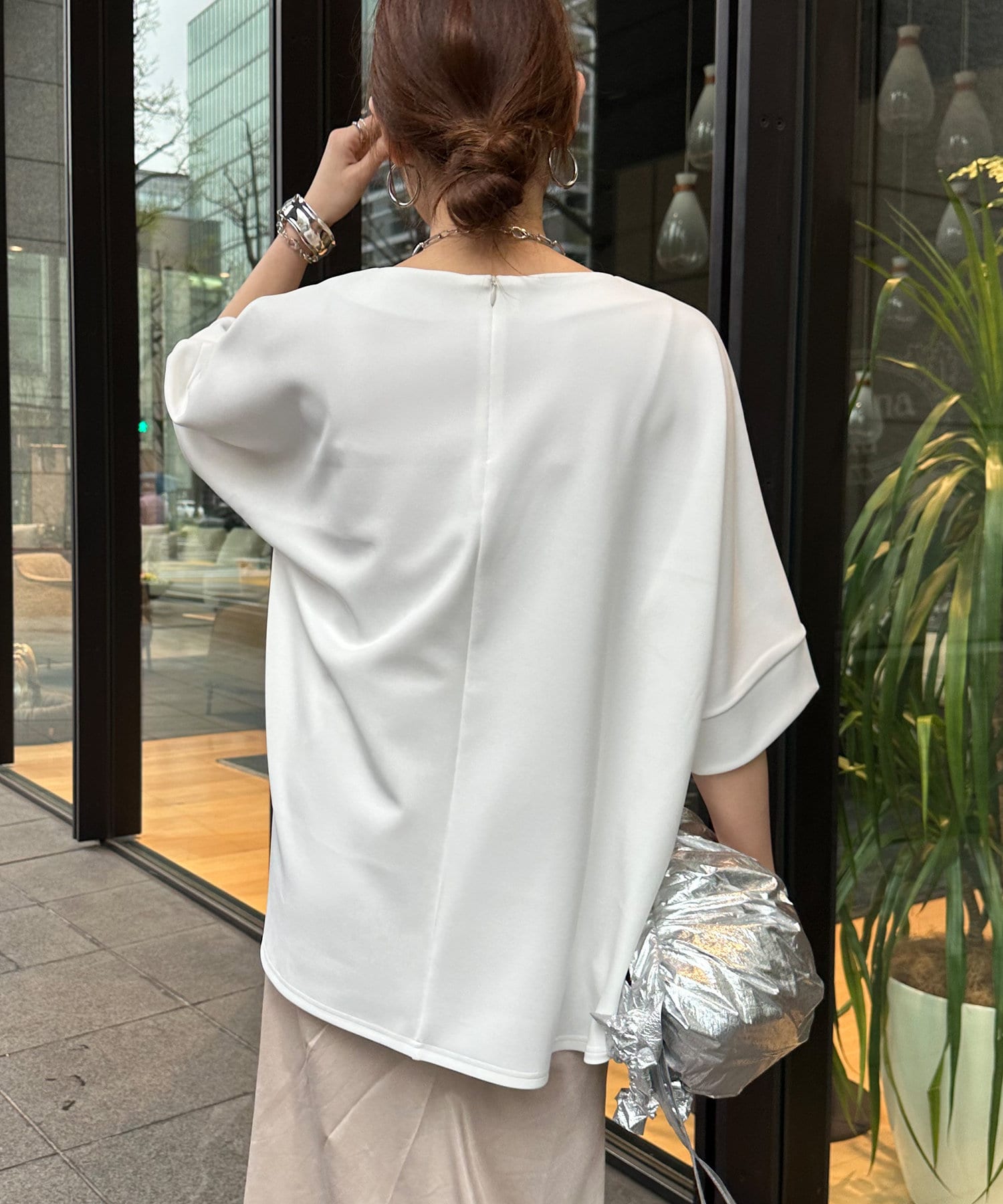 フラットな表面感で、通常のカットソーよりもきれいめな印象に決まるのがポイントです。