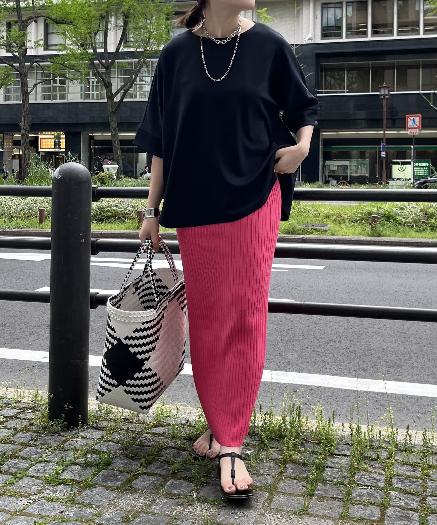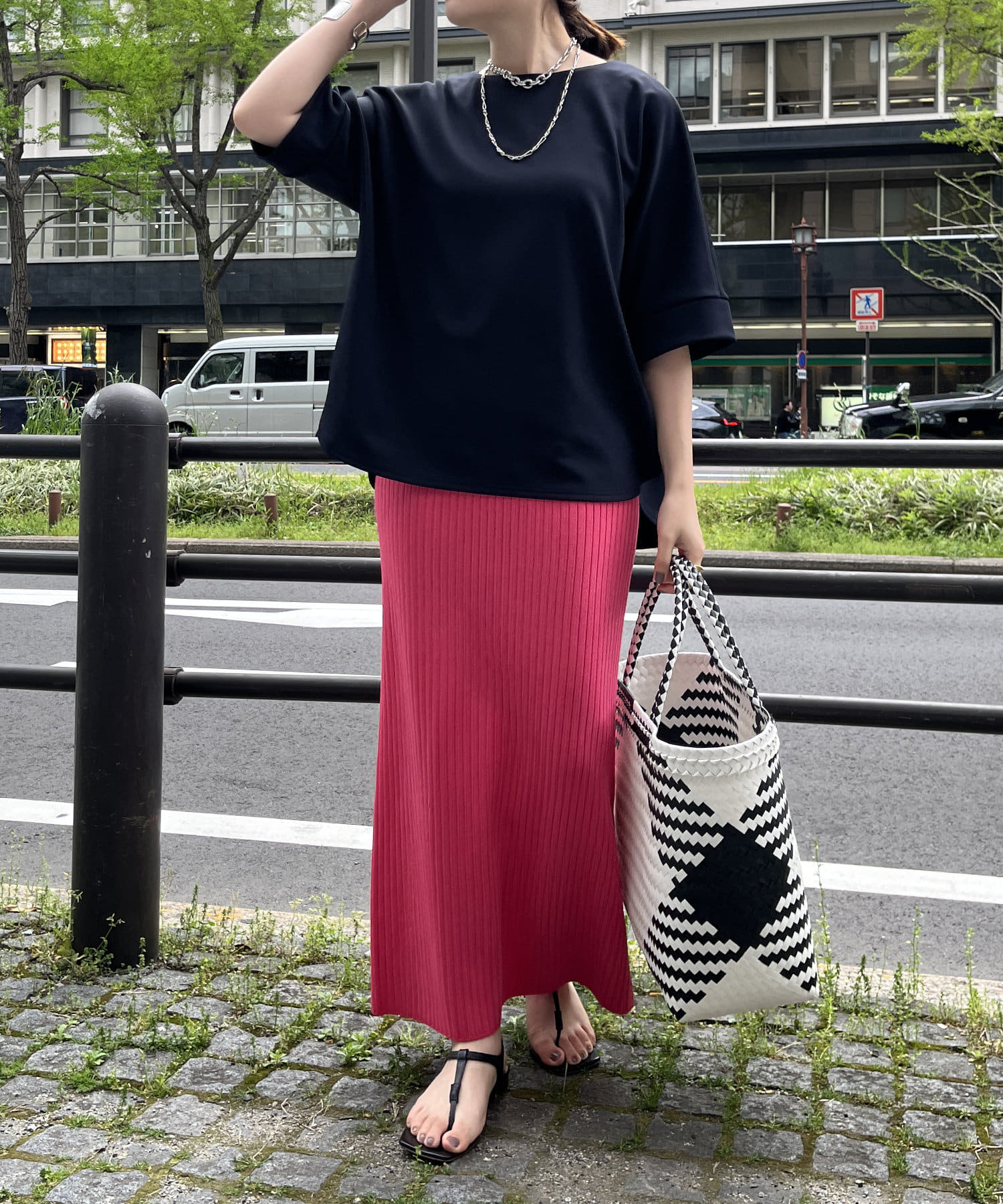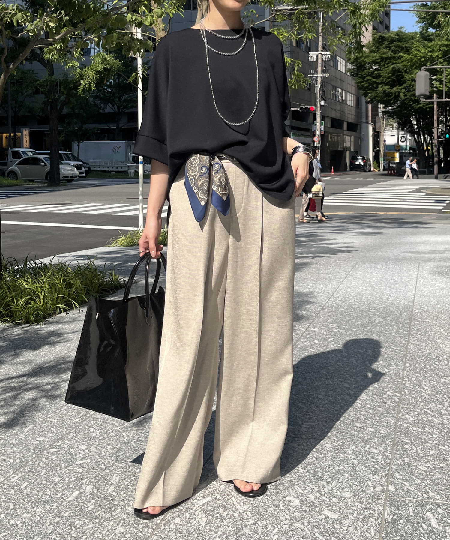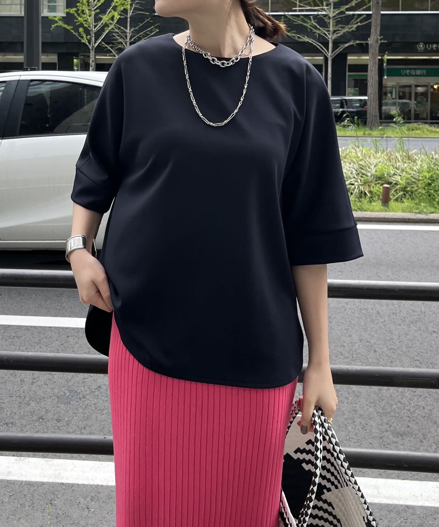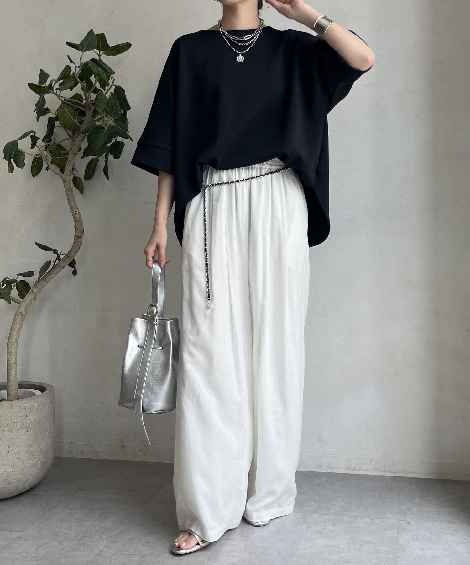 フラットな表面感で、通常のカットソーよりもきれいめな印象に決まるのがポイントです。
