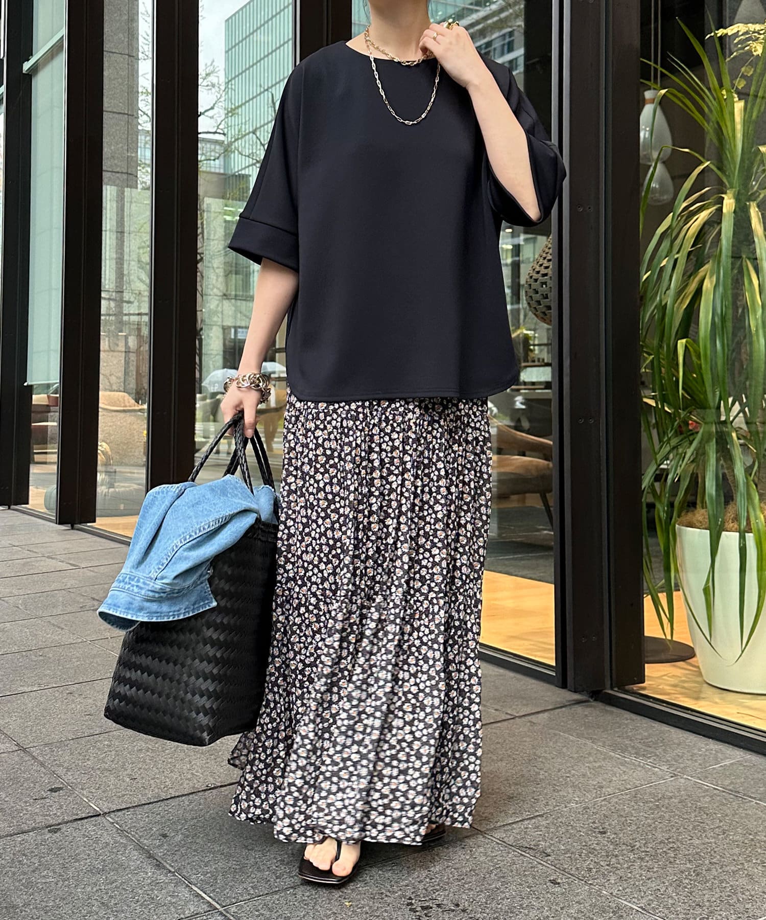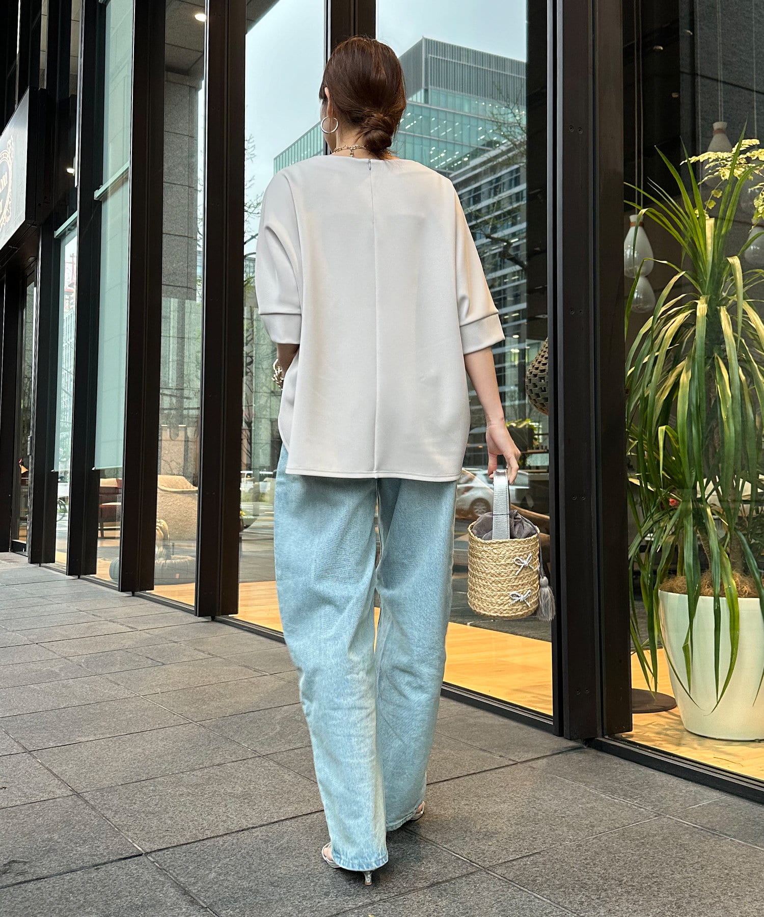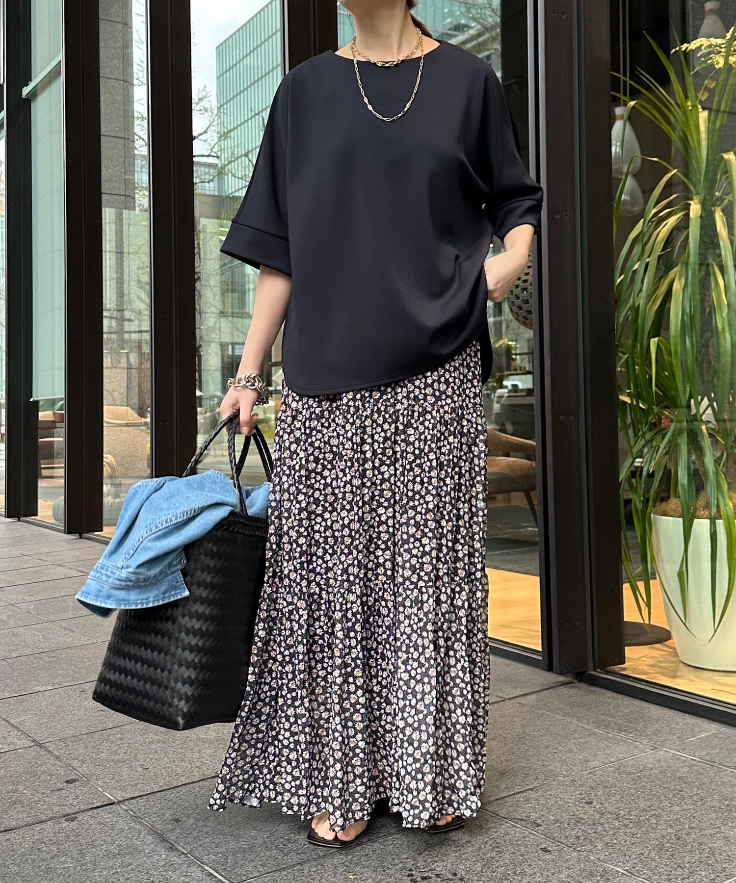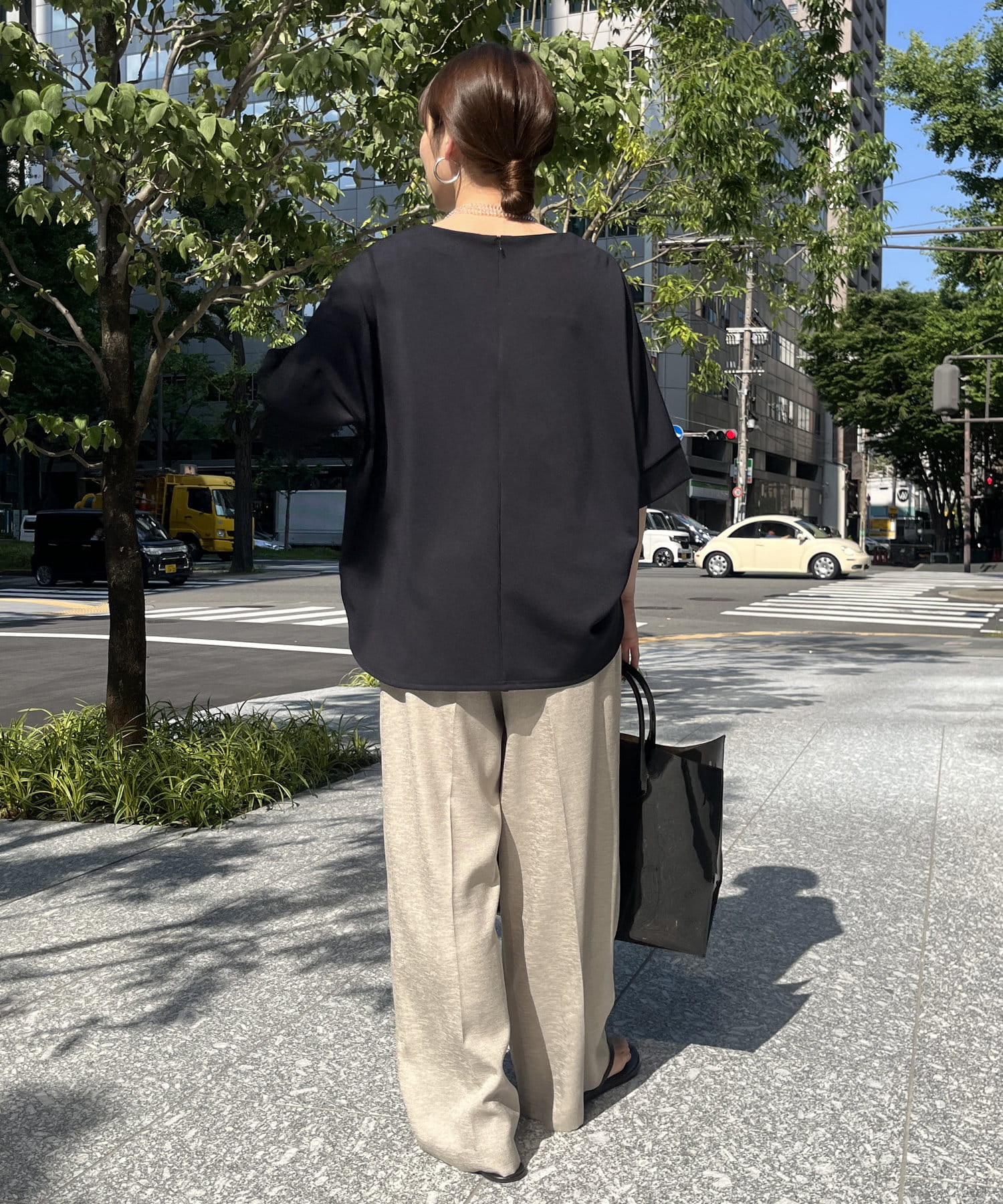 身幅はゆったりと余裕感のあるサイジングに、少し長めの丈感でヒップや腰回りをカバー。前後差のある丈感のため、おしゃれさもプラスしてくれます。