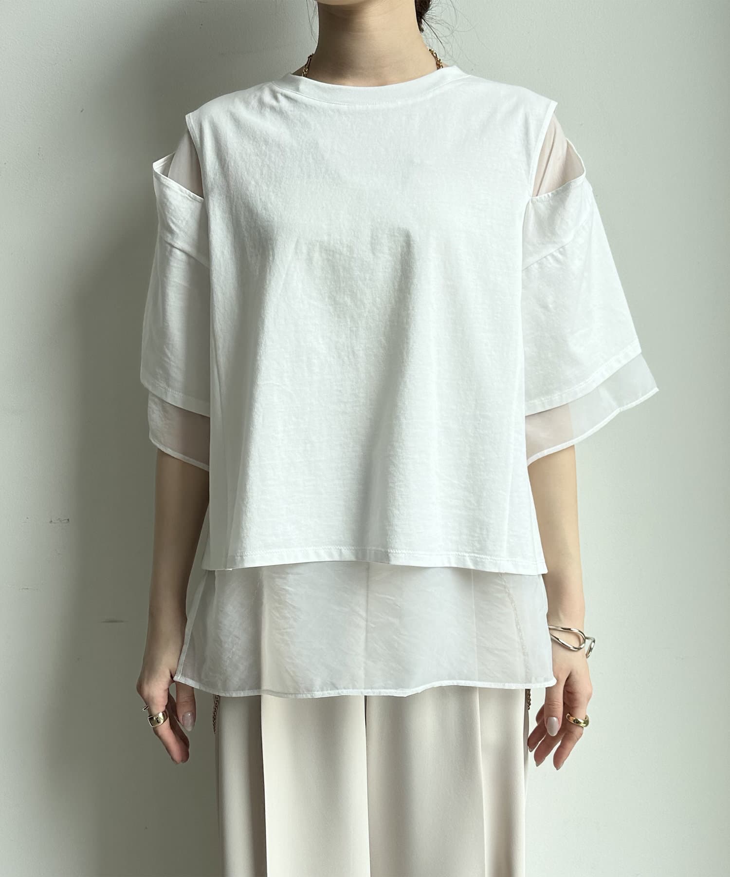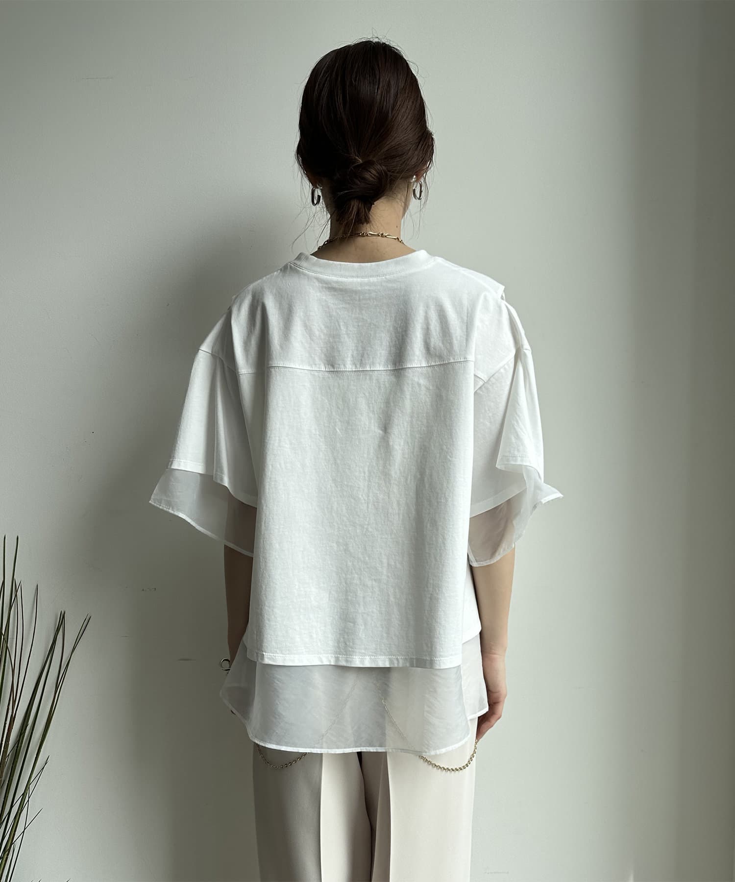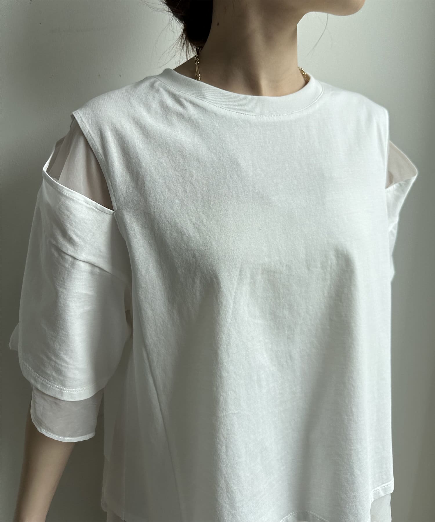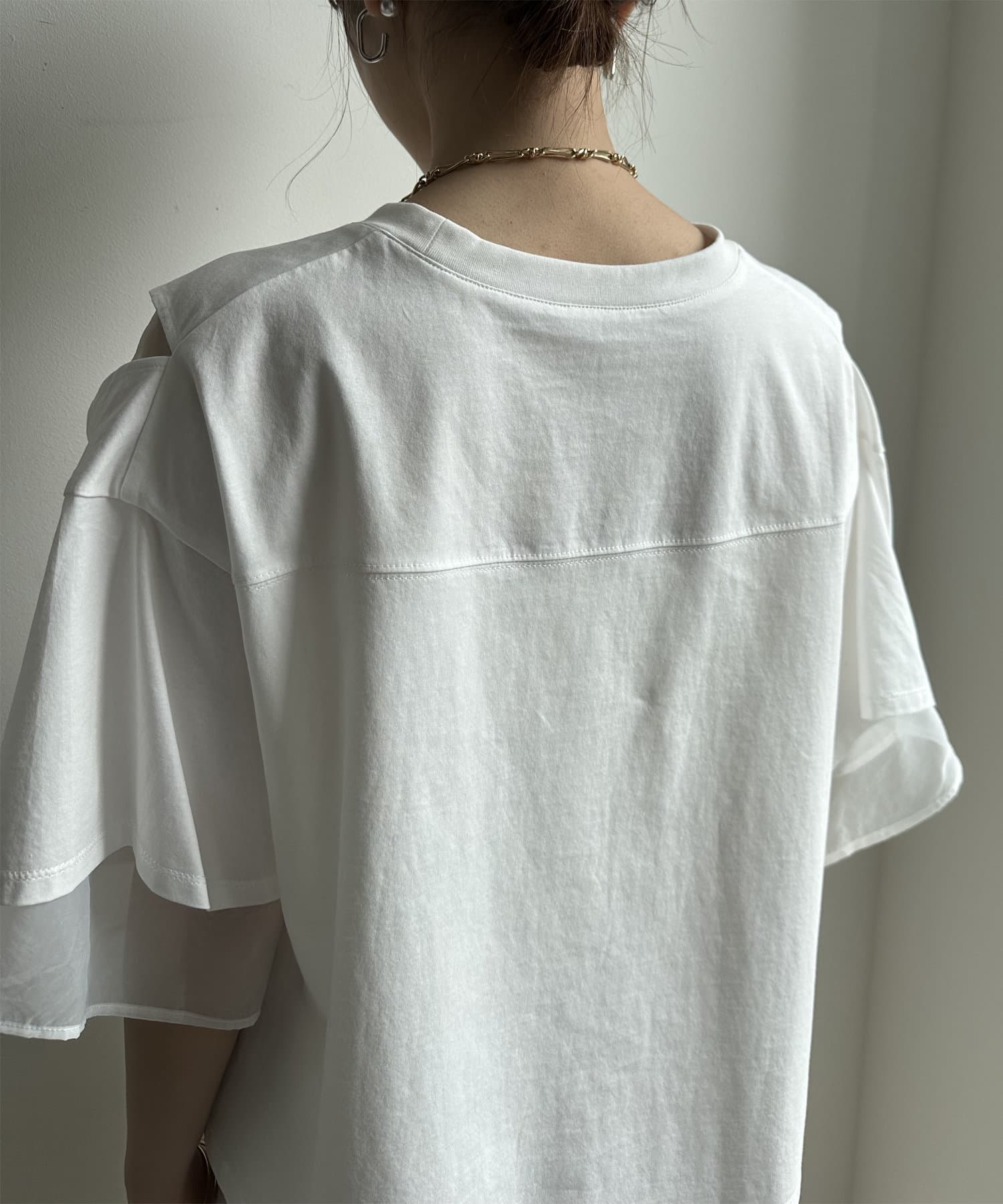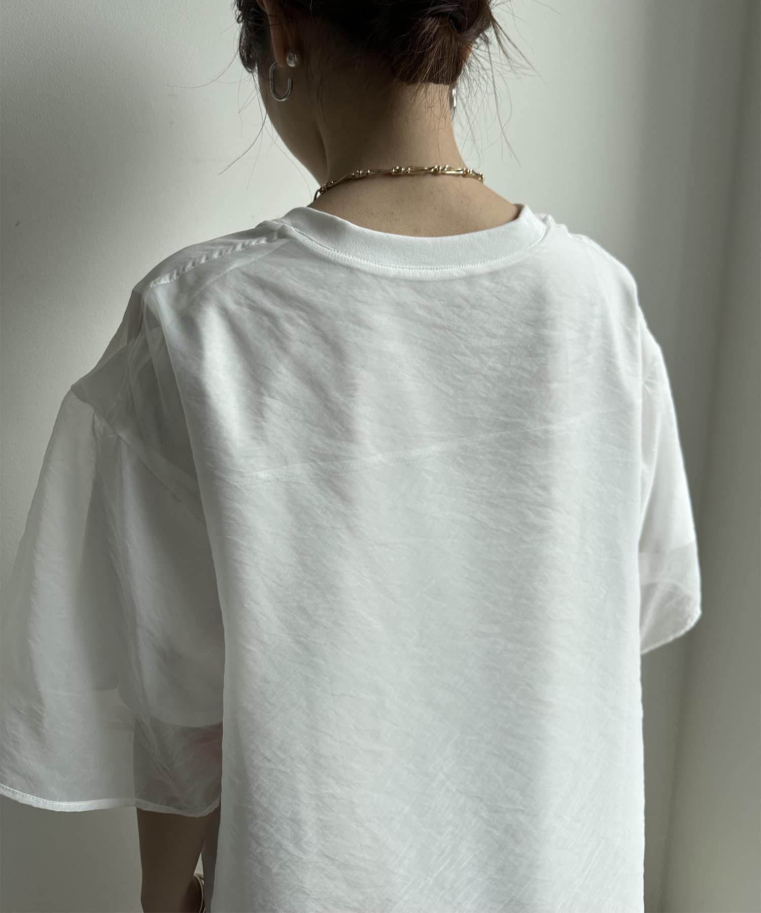 袖にスリットが入ったTEEと透け感があるシアー素材がドッキングされたカットソー!