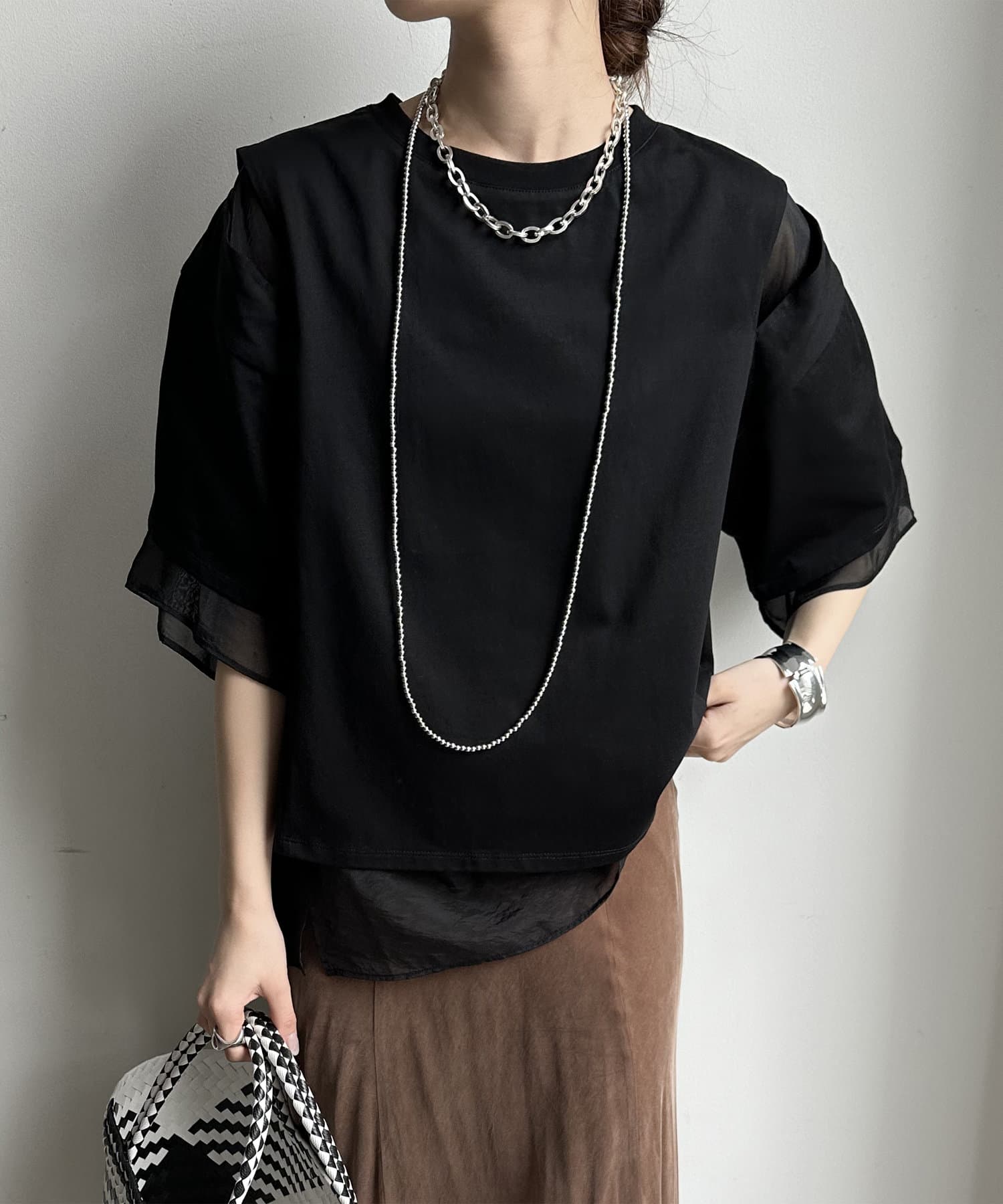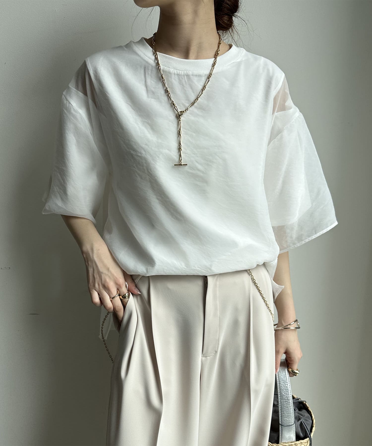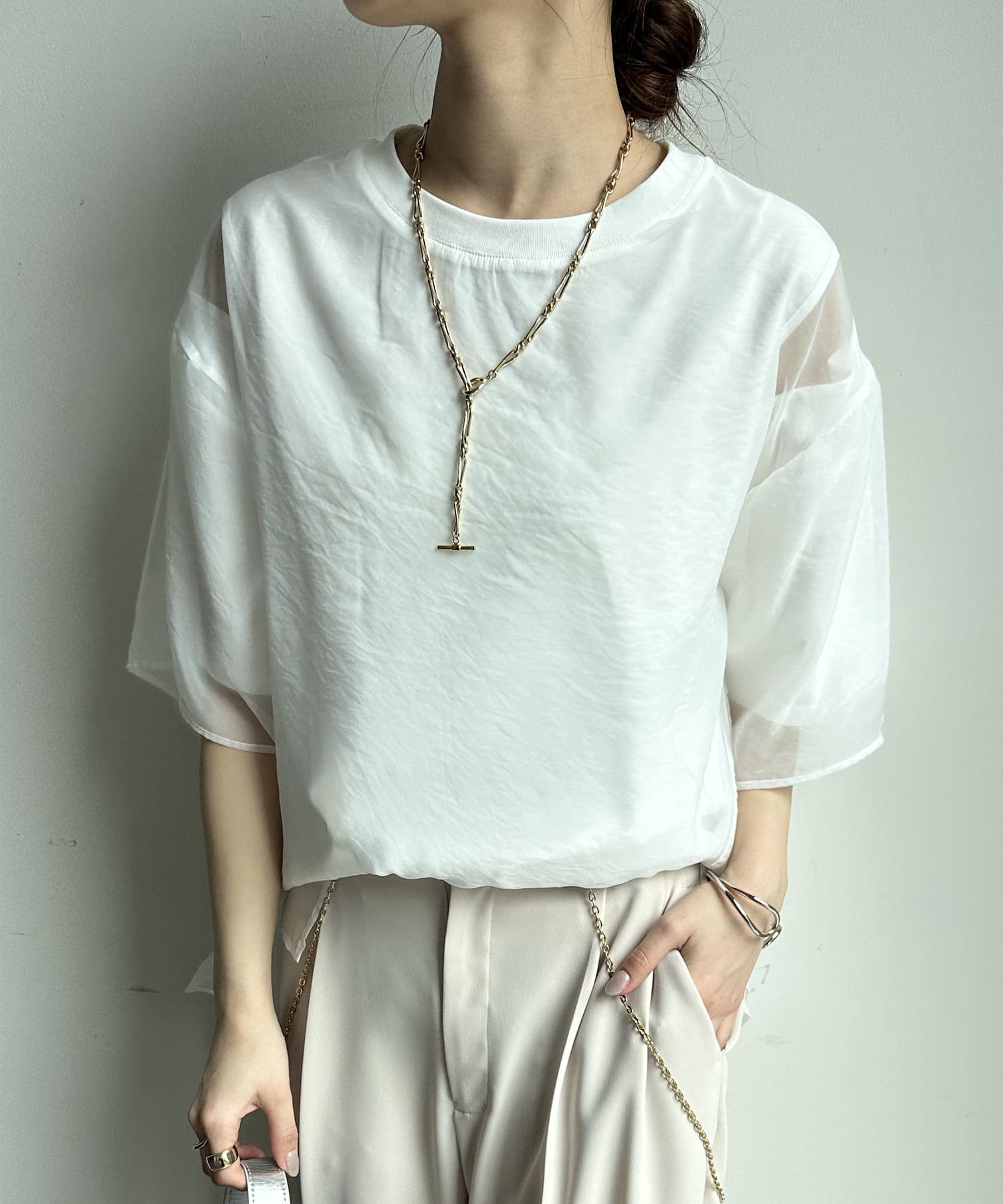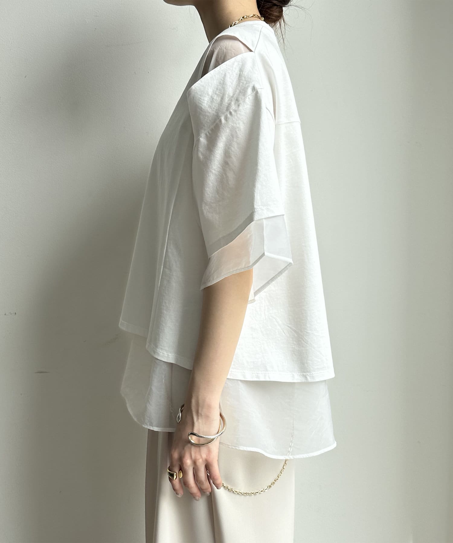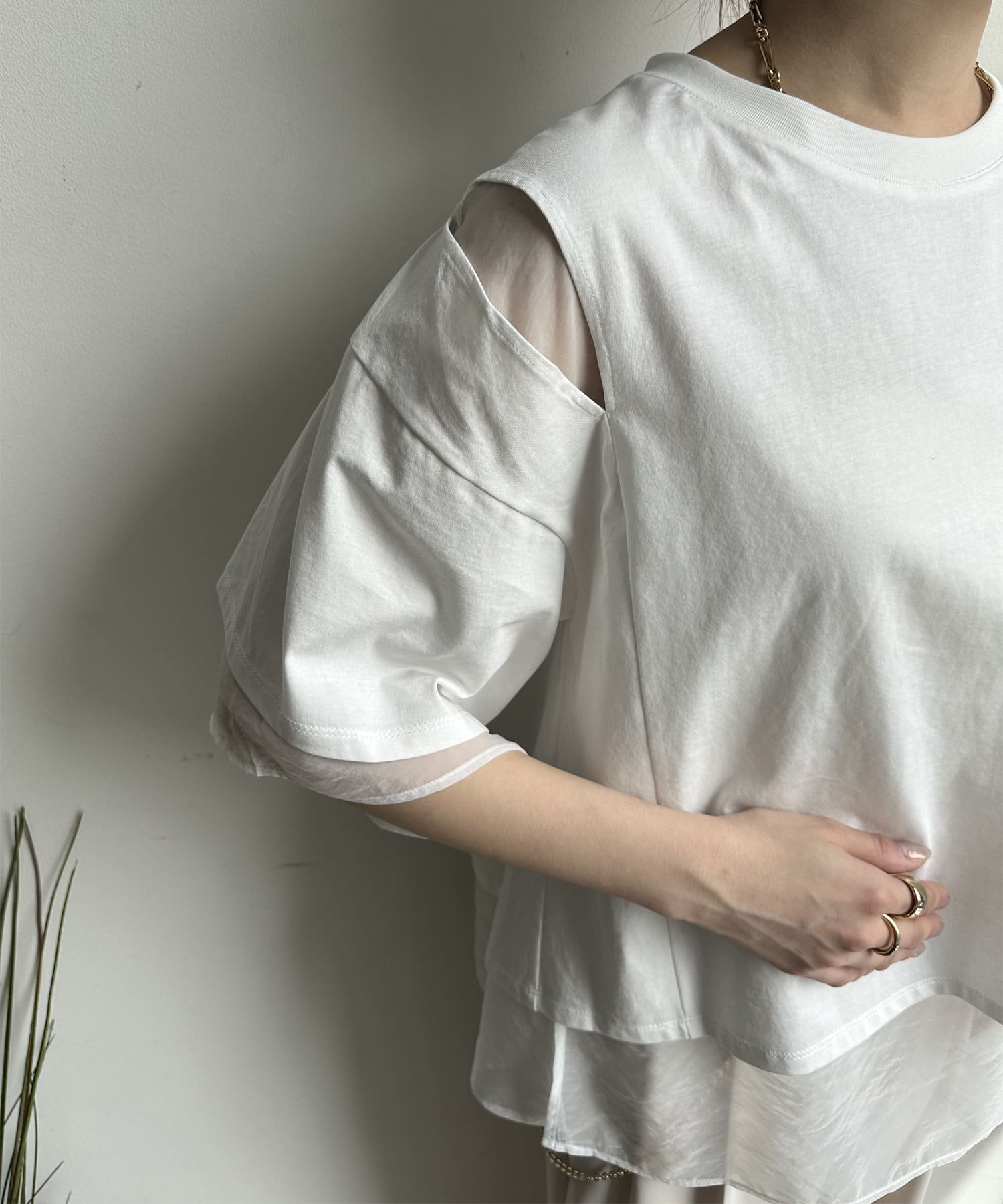 袖にスリットが入ったTEEと透け感があるシアー素材がドッキングされたカットソー!