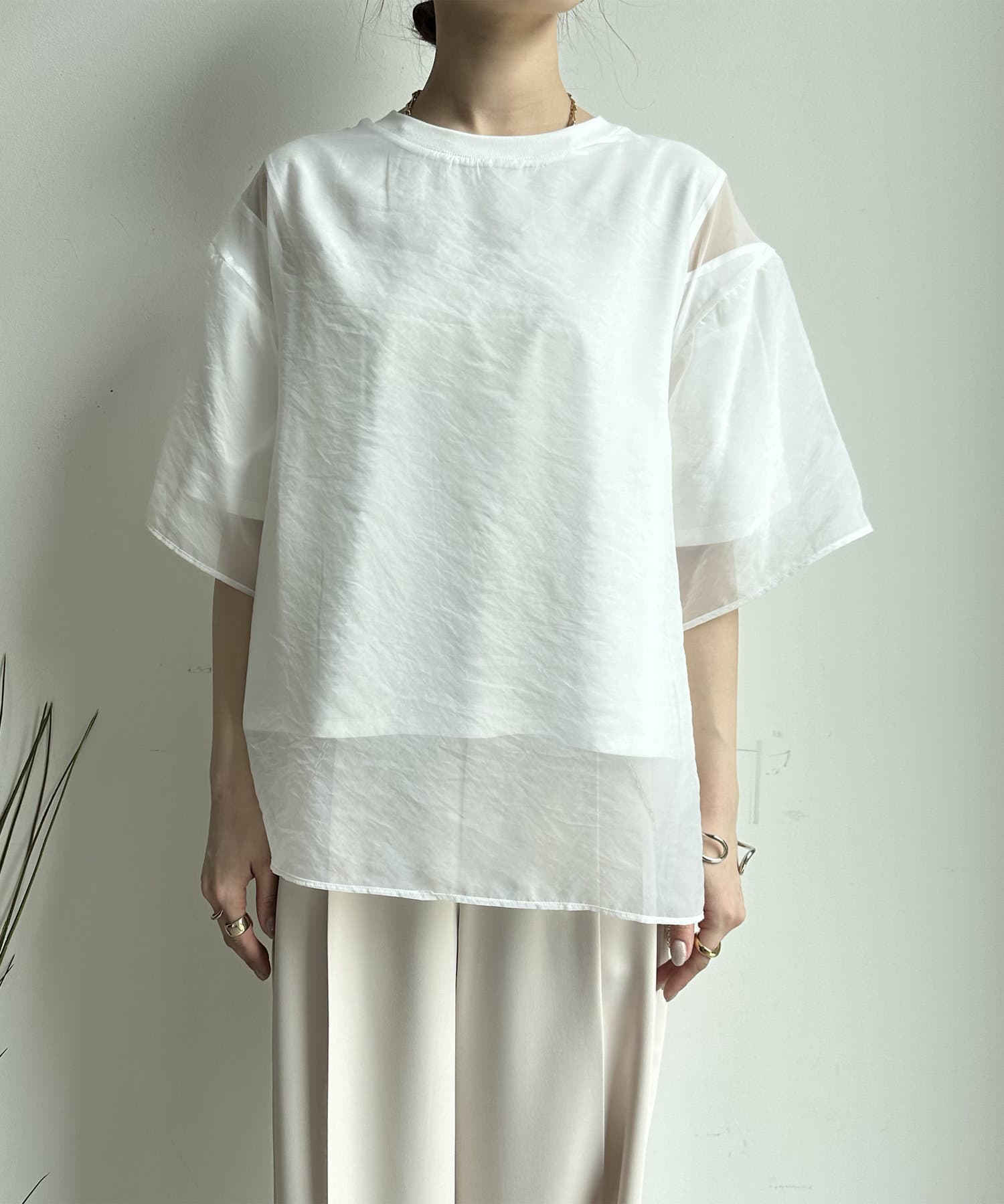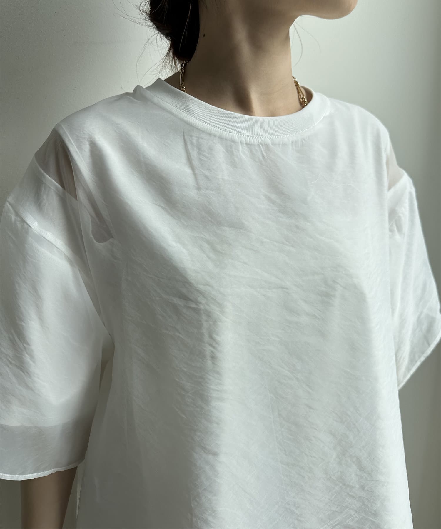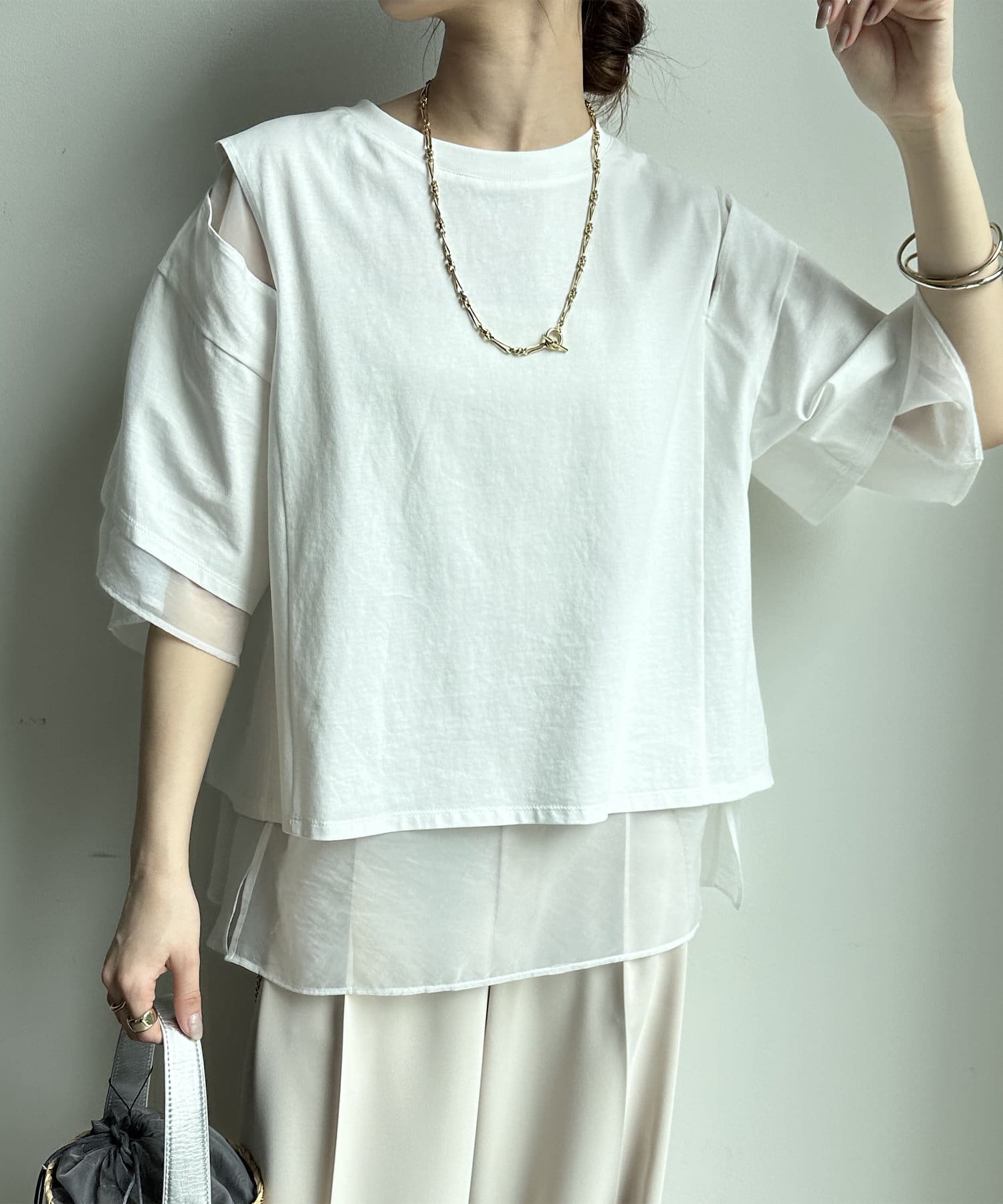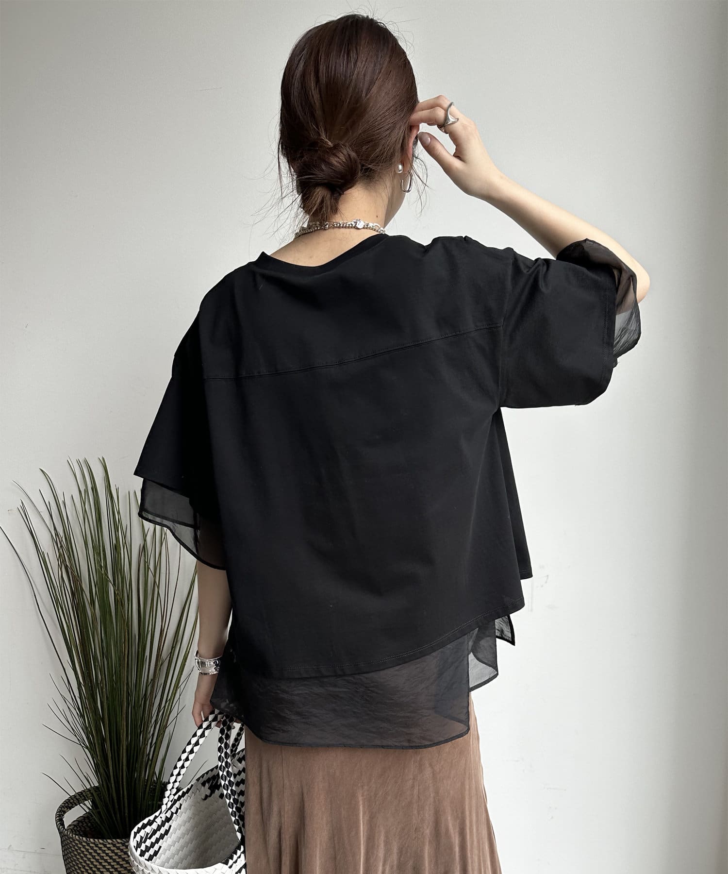 袖にスリットが入ったTEEと透け感があるシアー素材がドッキングされたカットソー!