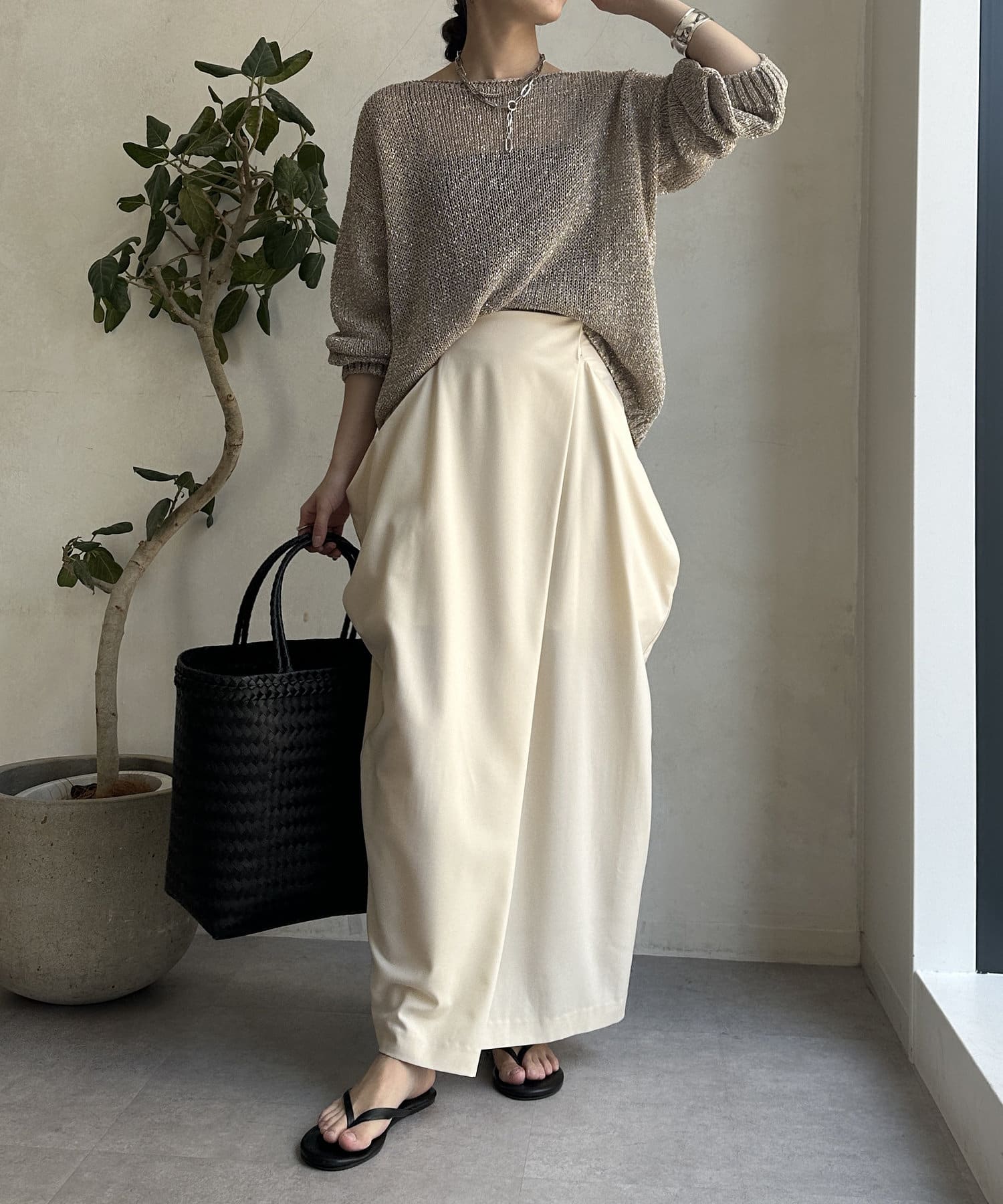 歩くたびに揺れる柔らかい生地感と上品なデザインが大人の女性にぴったりです。