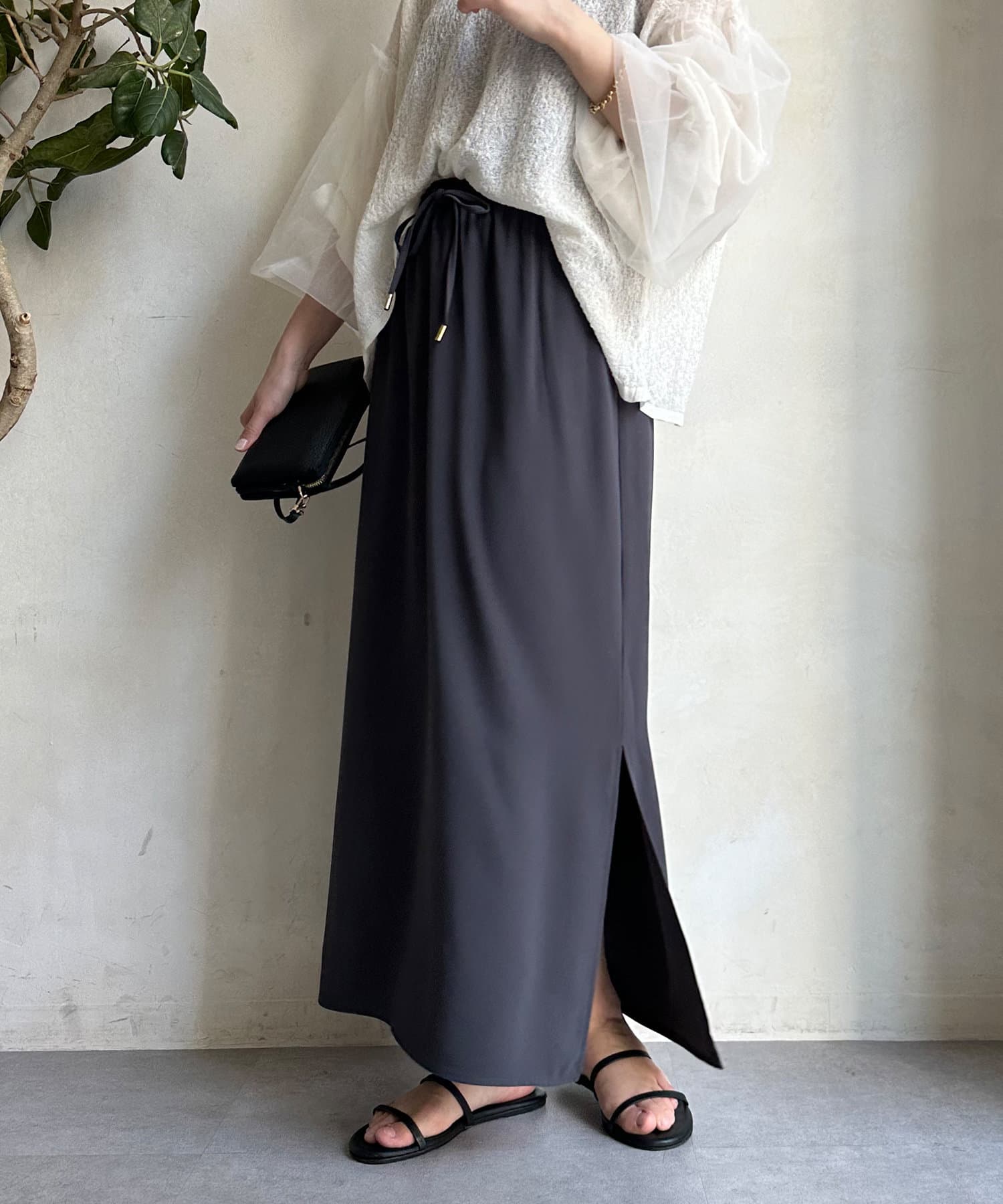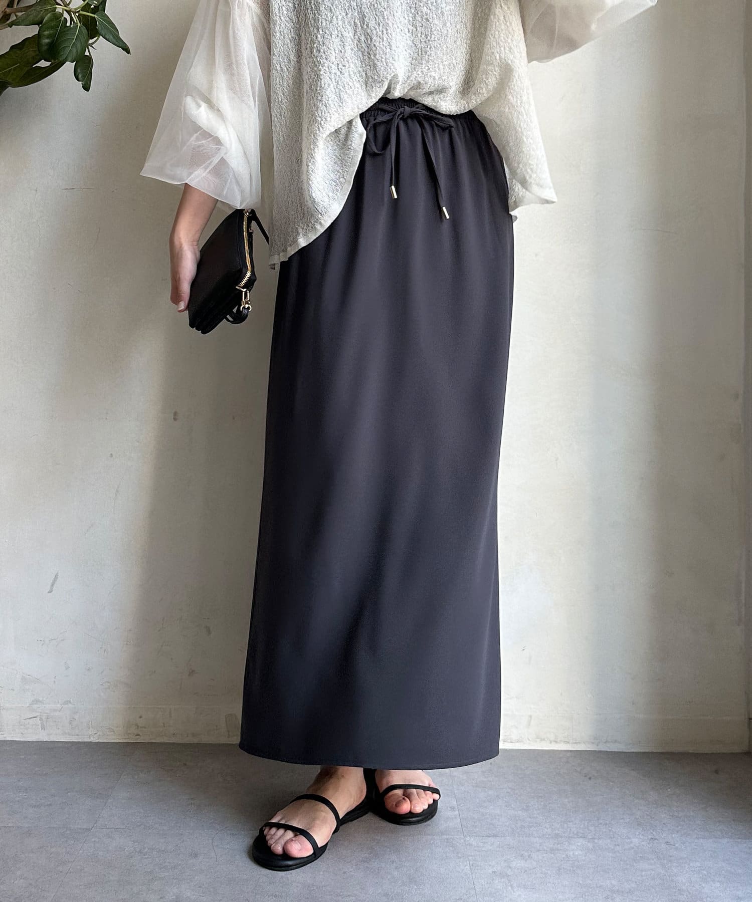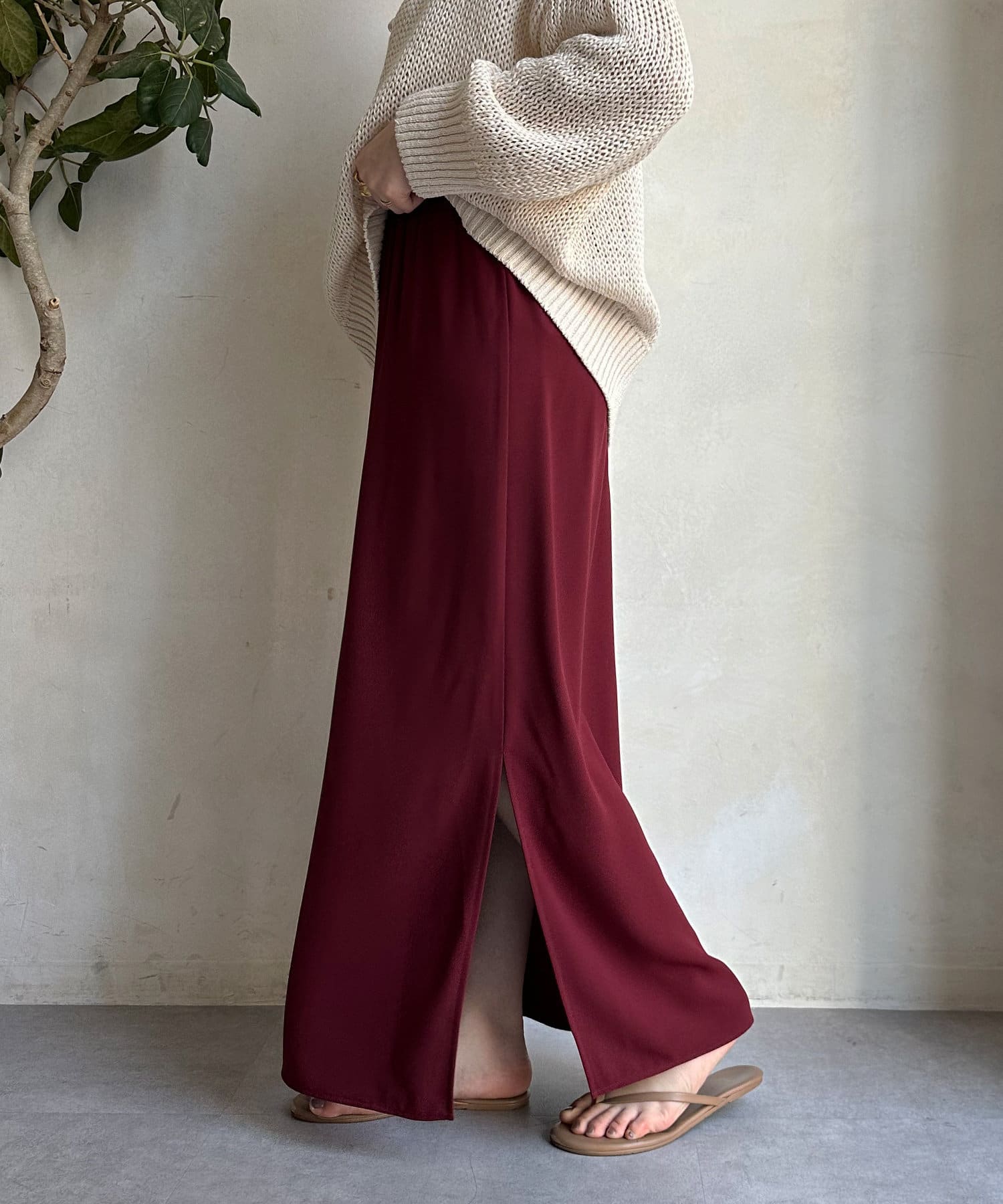 とってもイージーな履き心地ながらも上品見えするIラインシルエットに、サイドスリットをオンすることで抜け感と女性らしさをプラス。