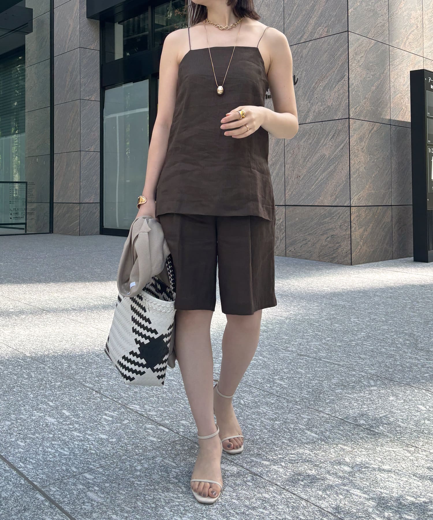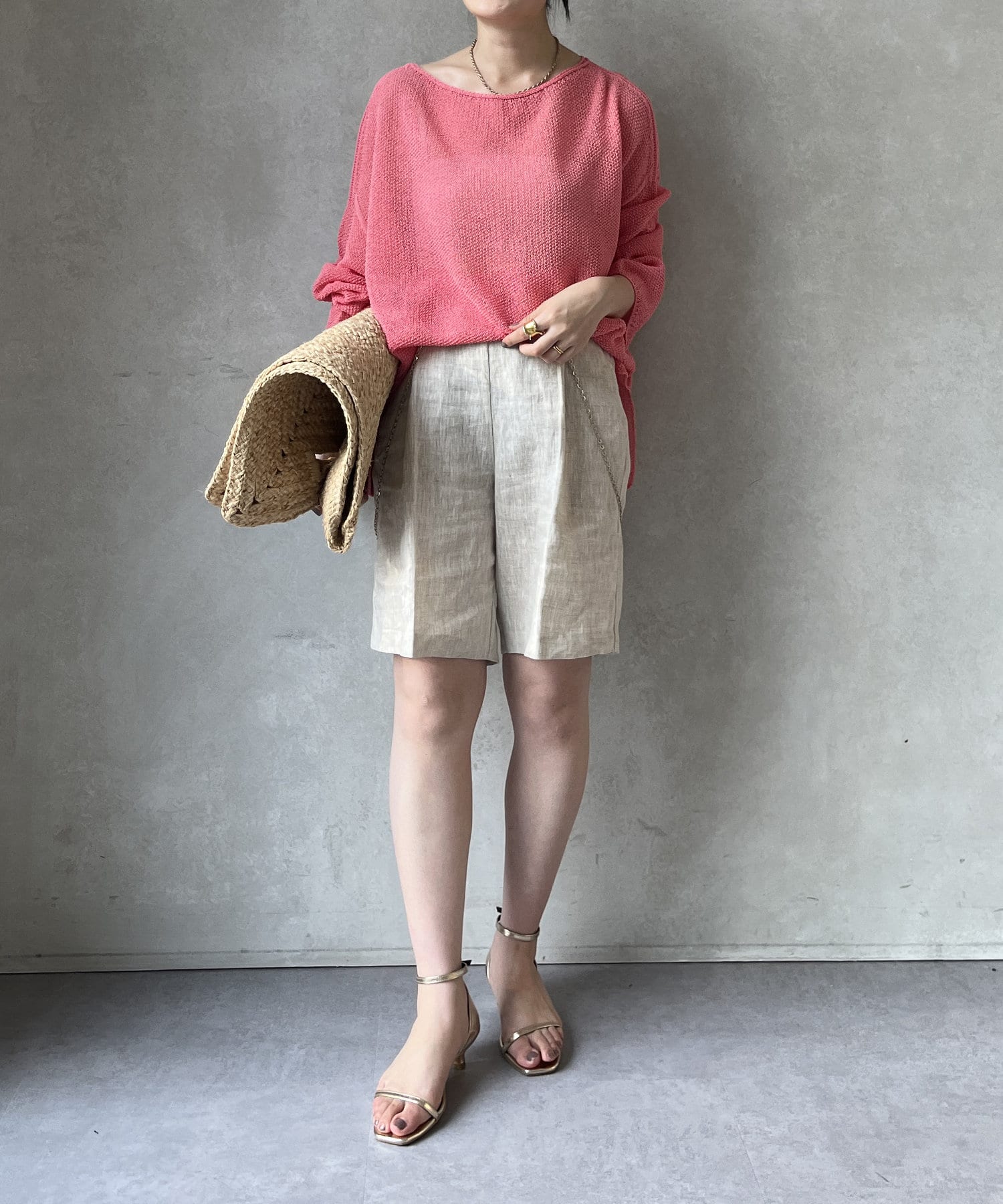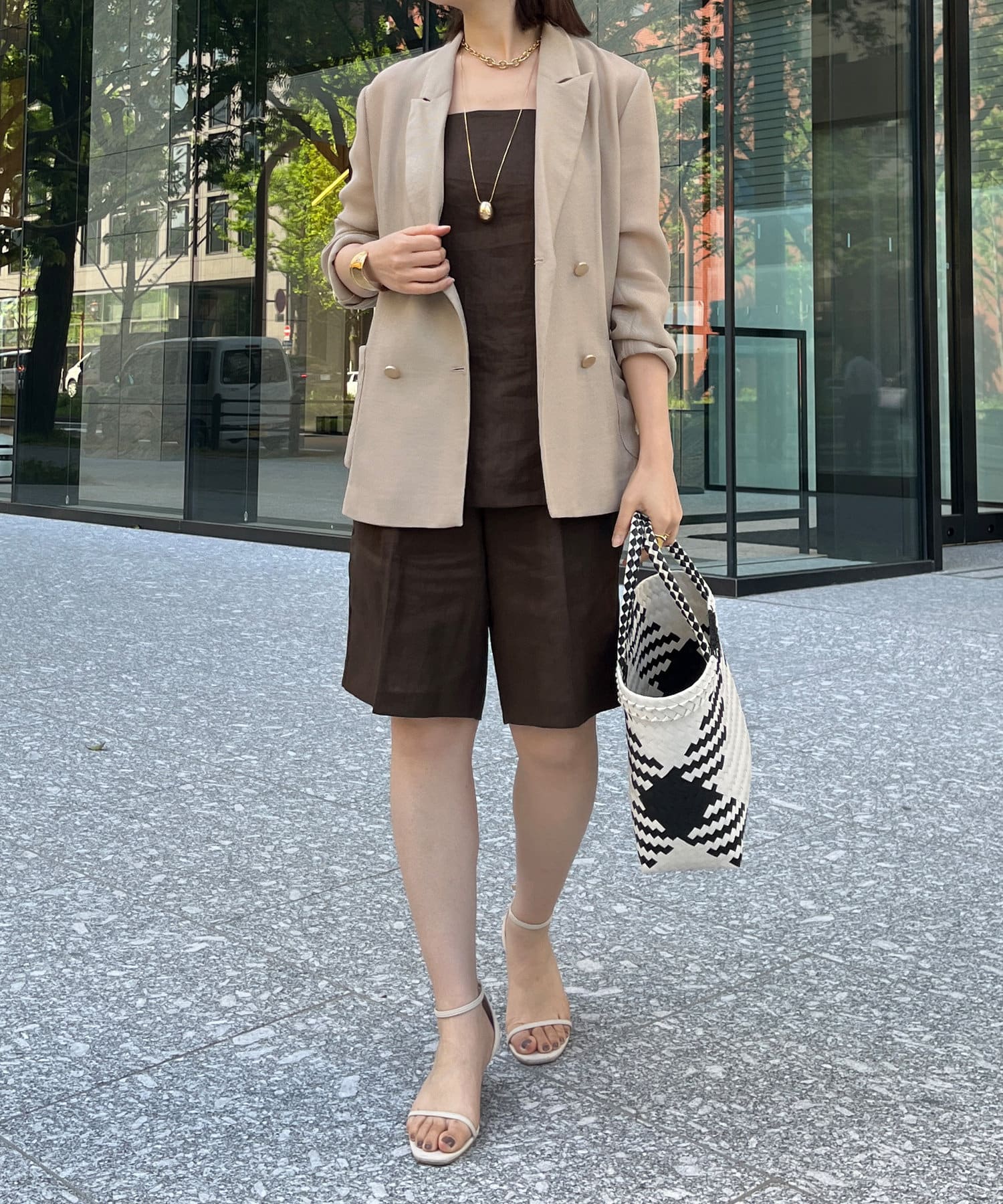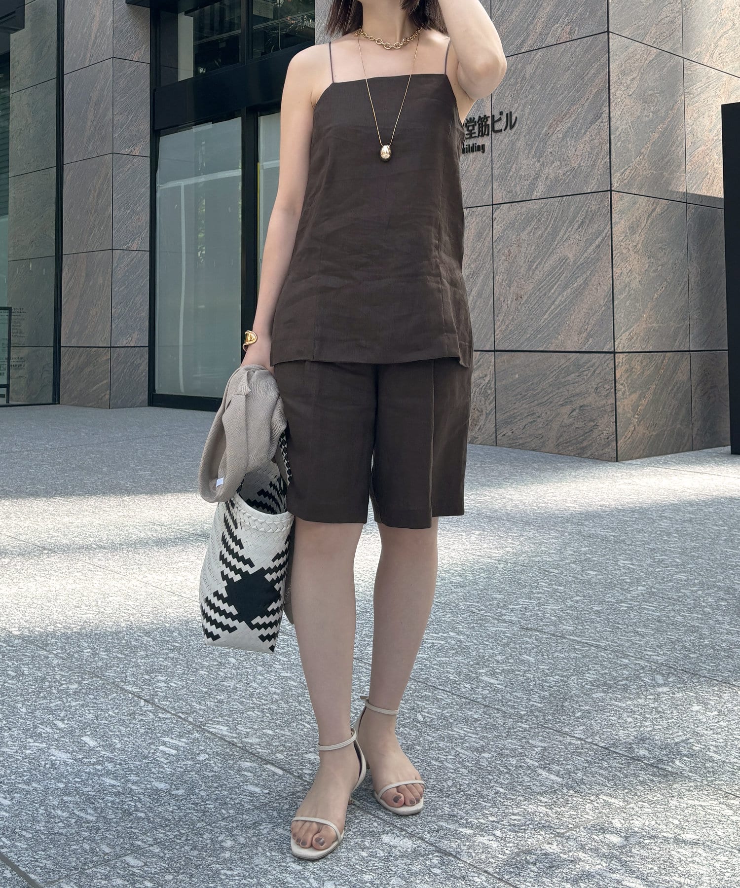 季節感漂う麻混素材のショートパンツは、センタープレスのきちんと感と、短すぎず・長すぎない絶妙なひざ上の丈感で、子供っぽくならないようセーブ。