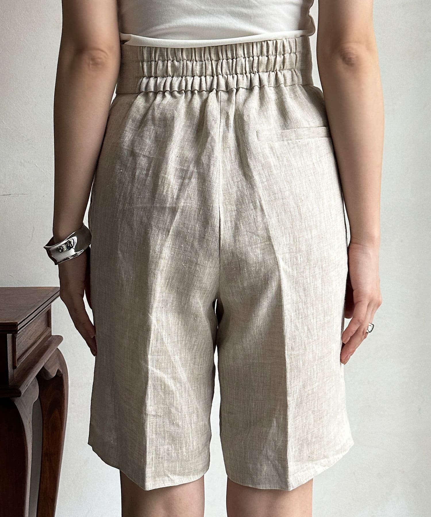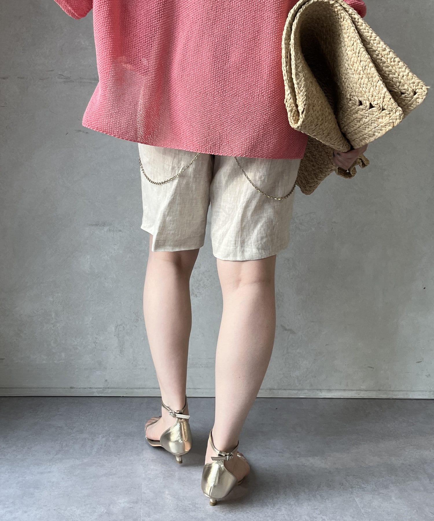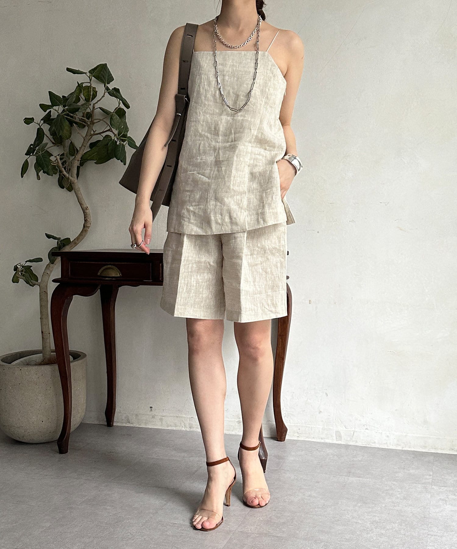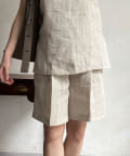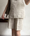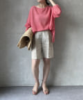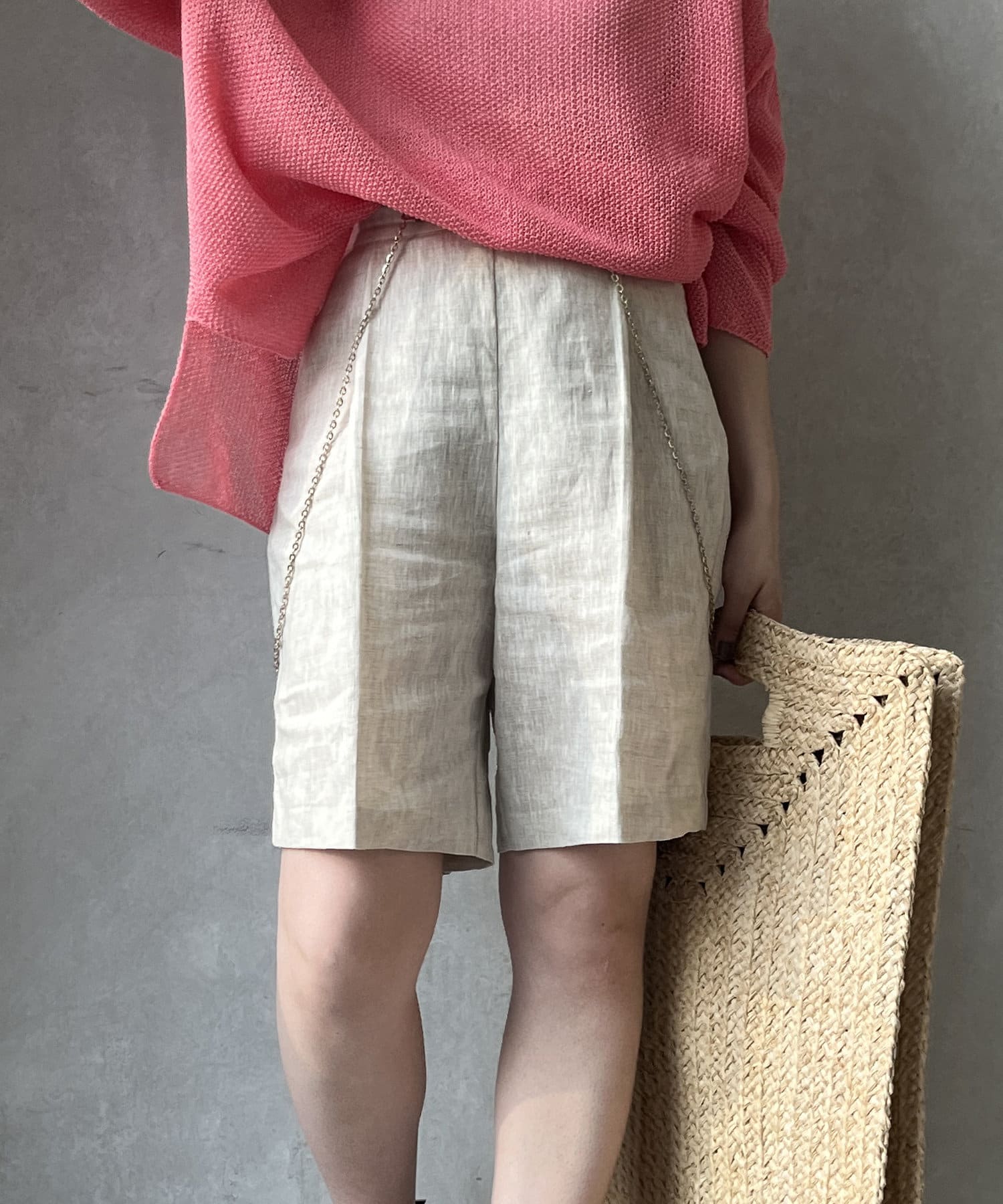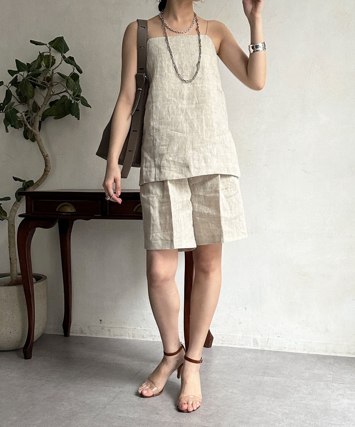 季節感漂う麻混素材のショートパンツは、センタープレスのきちんと感と、短すぎず・長すぎない絶妙なひざ上の丈感で、子供っぽくならないようセーブ。