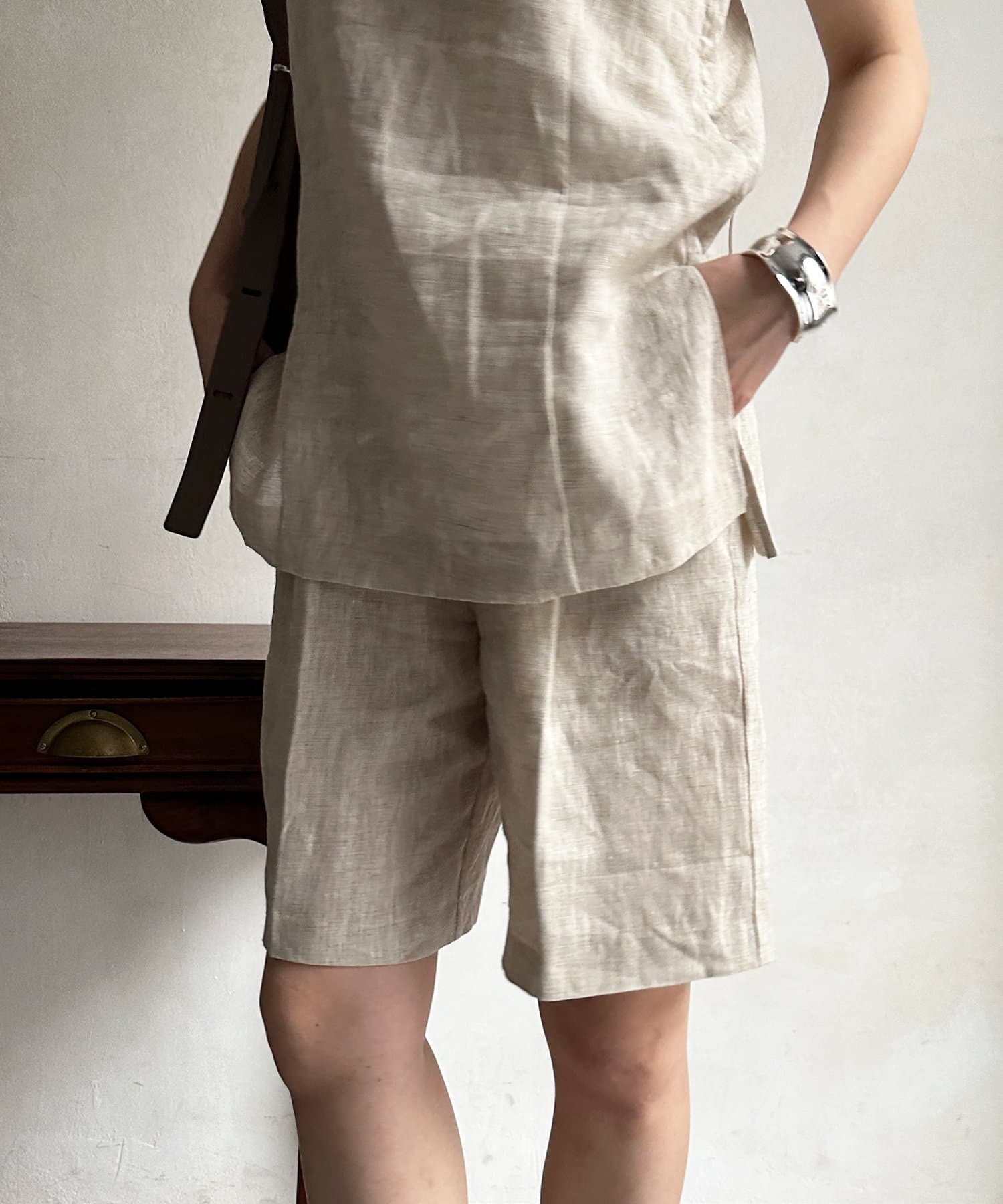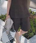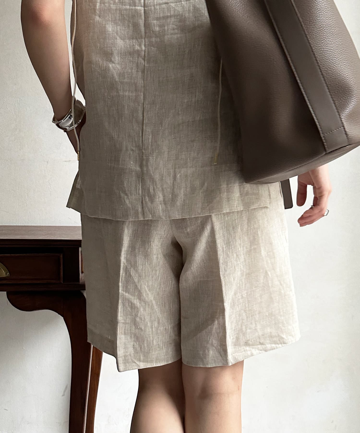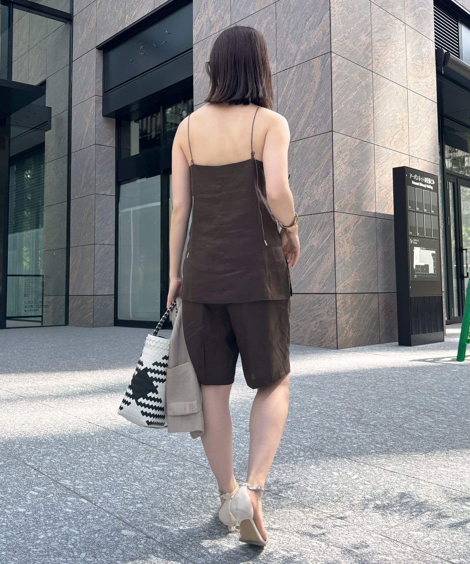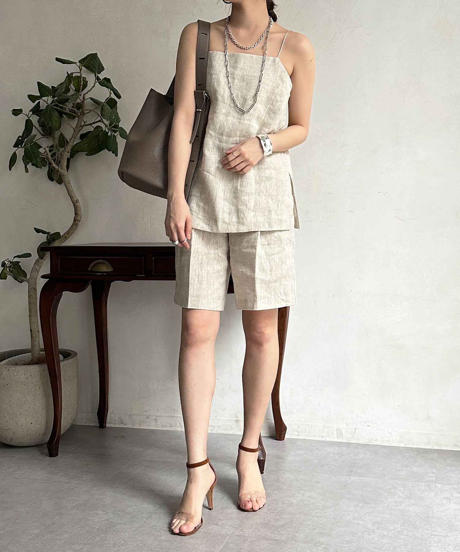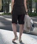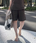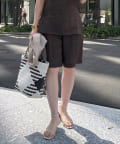 季節感漂う麻混素材のショートパンツは、センタープレスのきちんと感と、短すぎず・長すぎない絶妙なひざ上の丈感で、子供っぽくならないようセーブ。