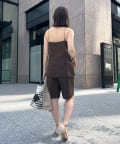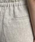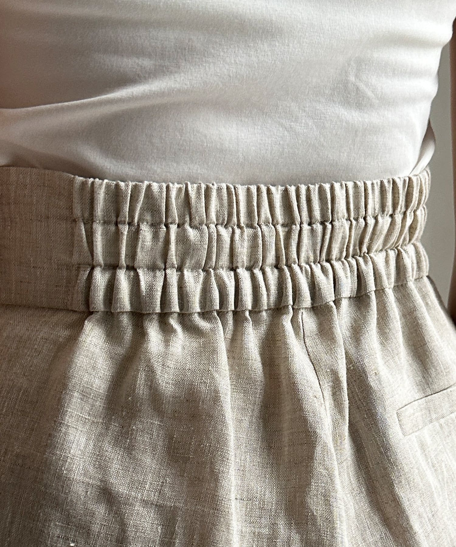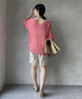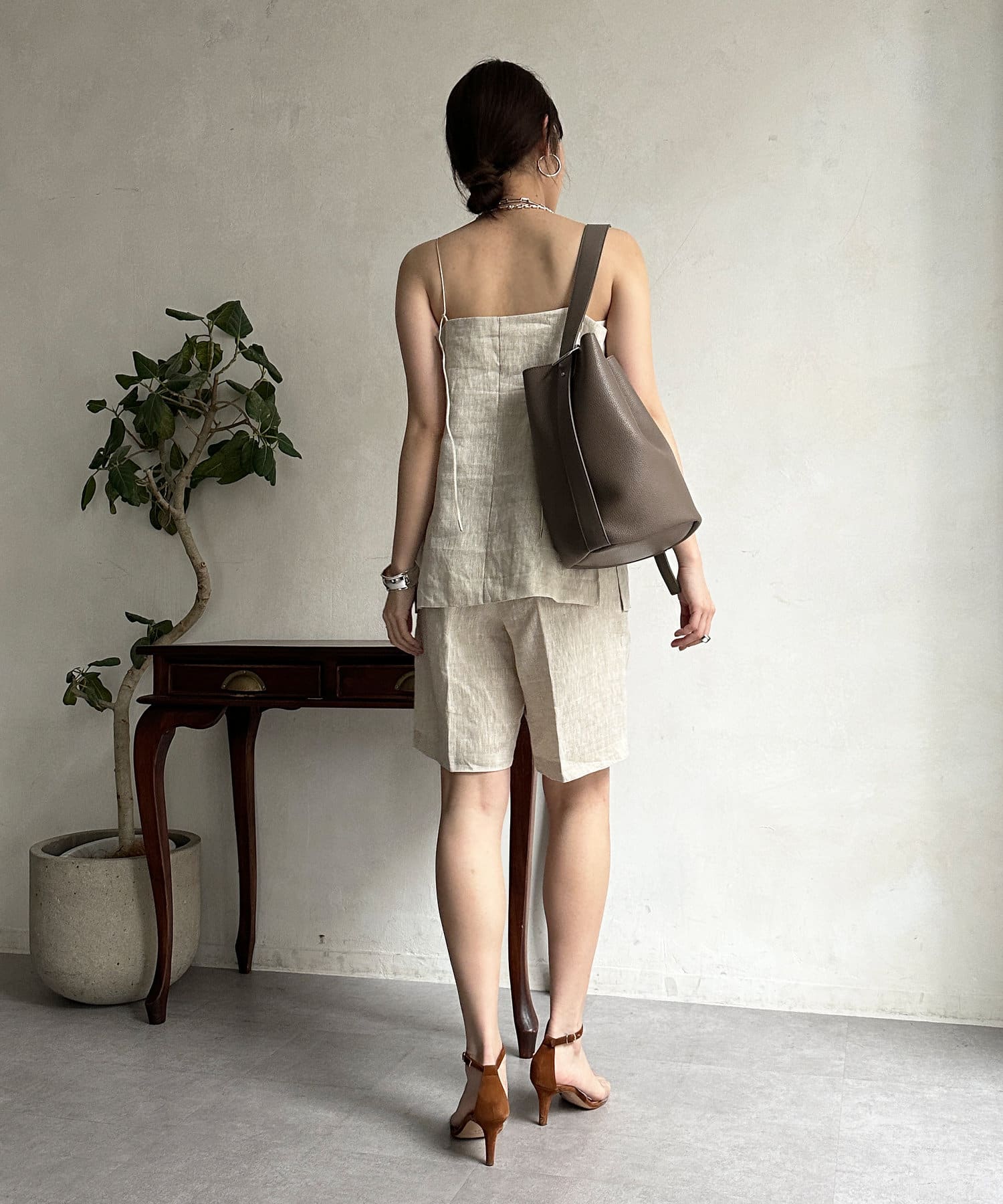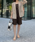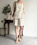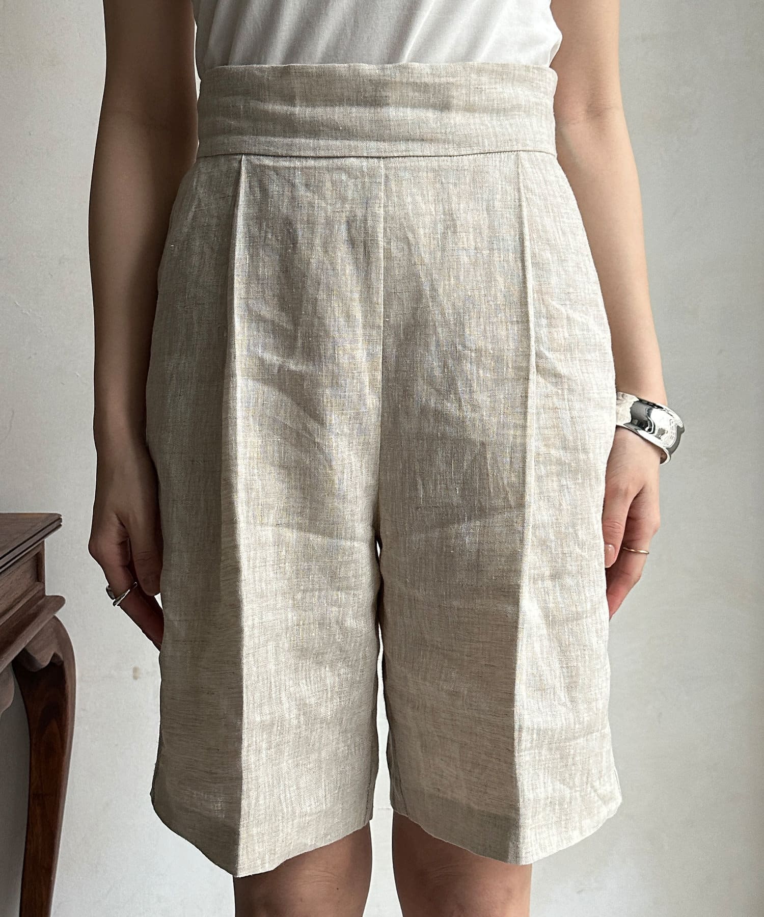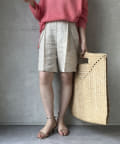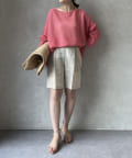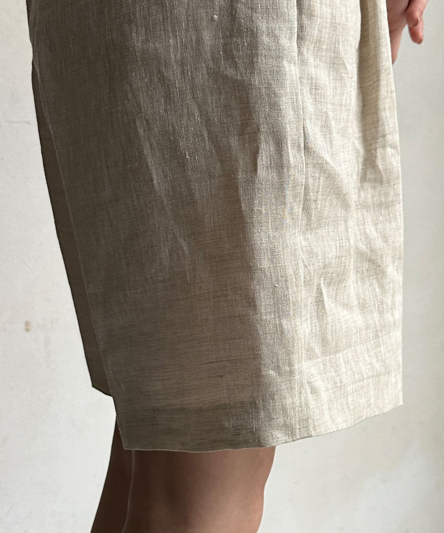 季節感漂う麻混素材のショートパンツは、センタープレスのきちんと感と、短すぎず・長すぎない絶妙なひざ上の丈感で、子供っぽくならないようセーブ。