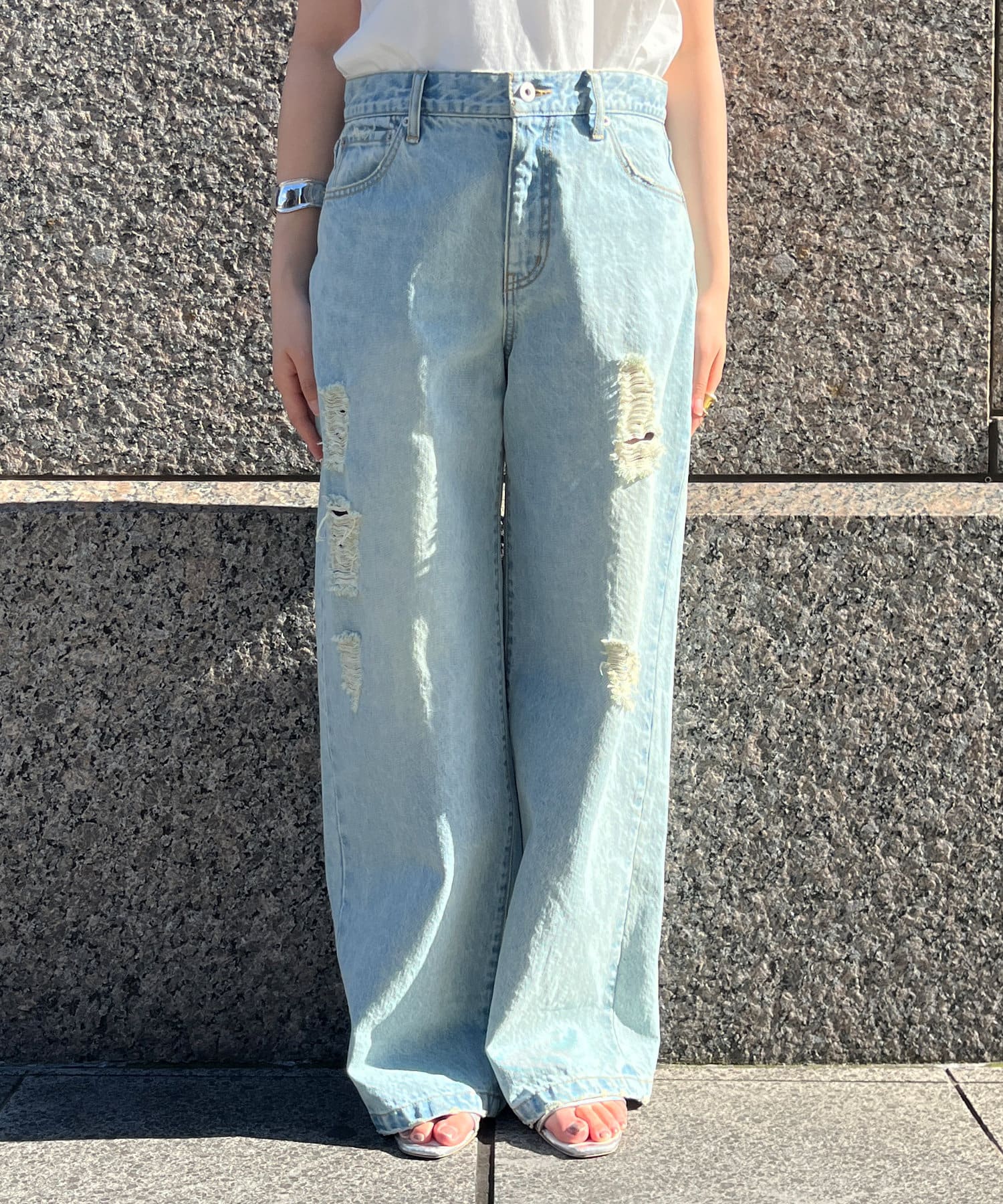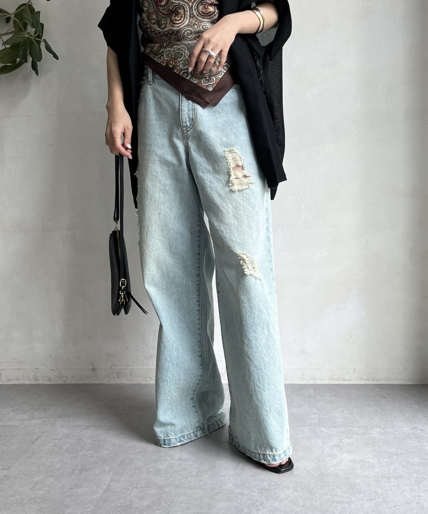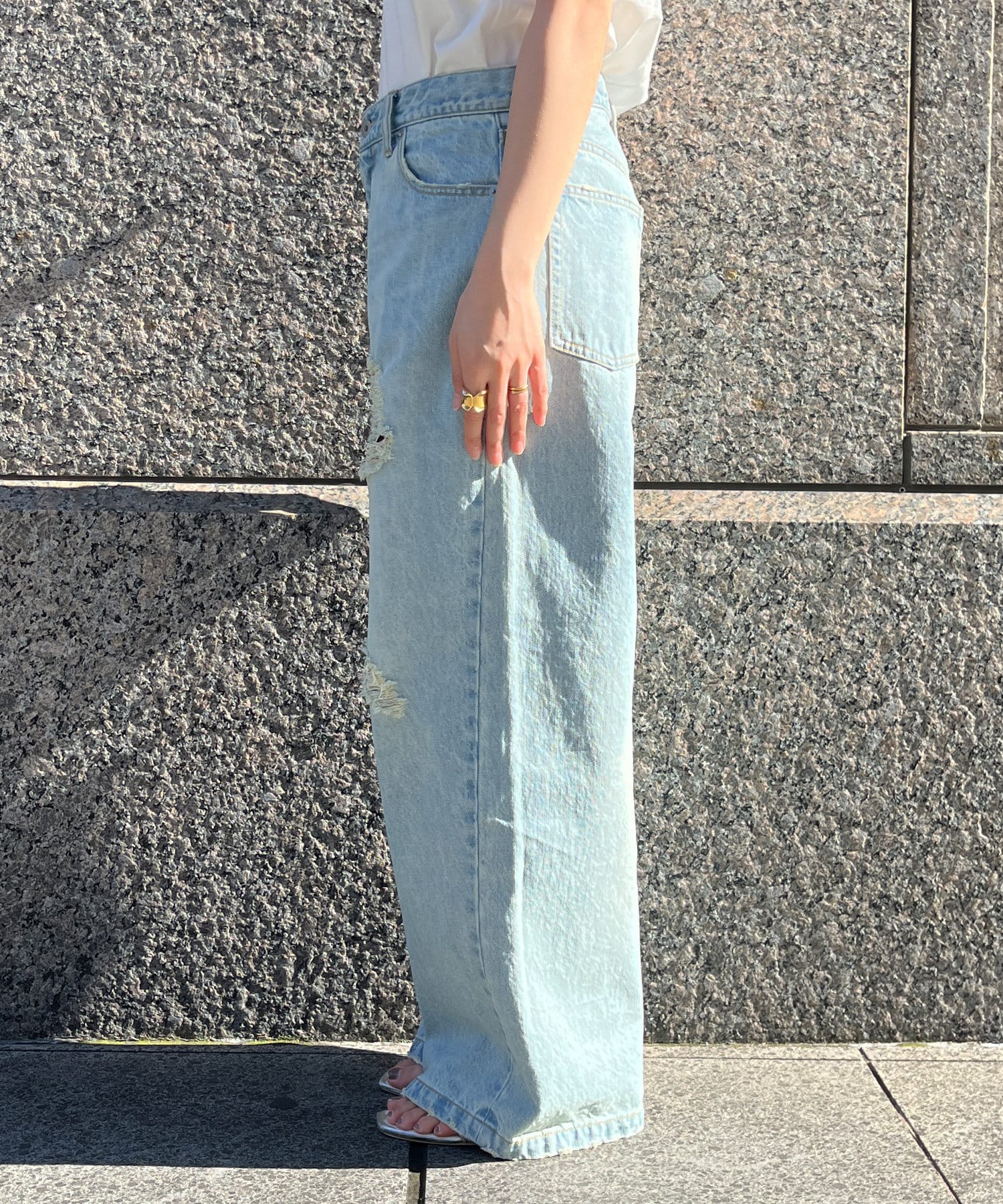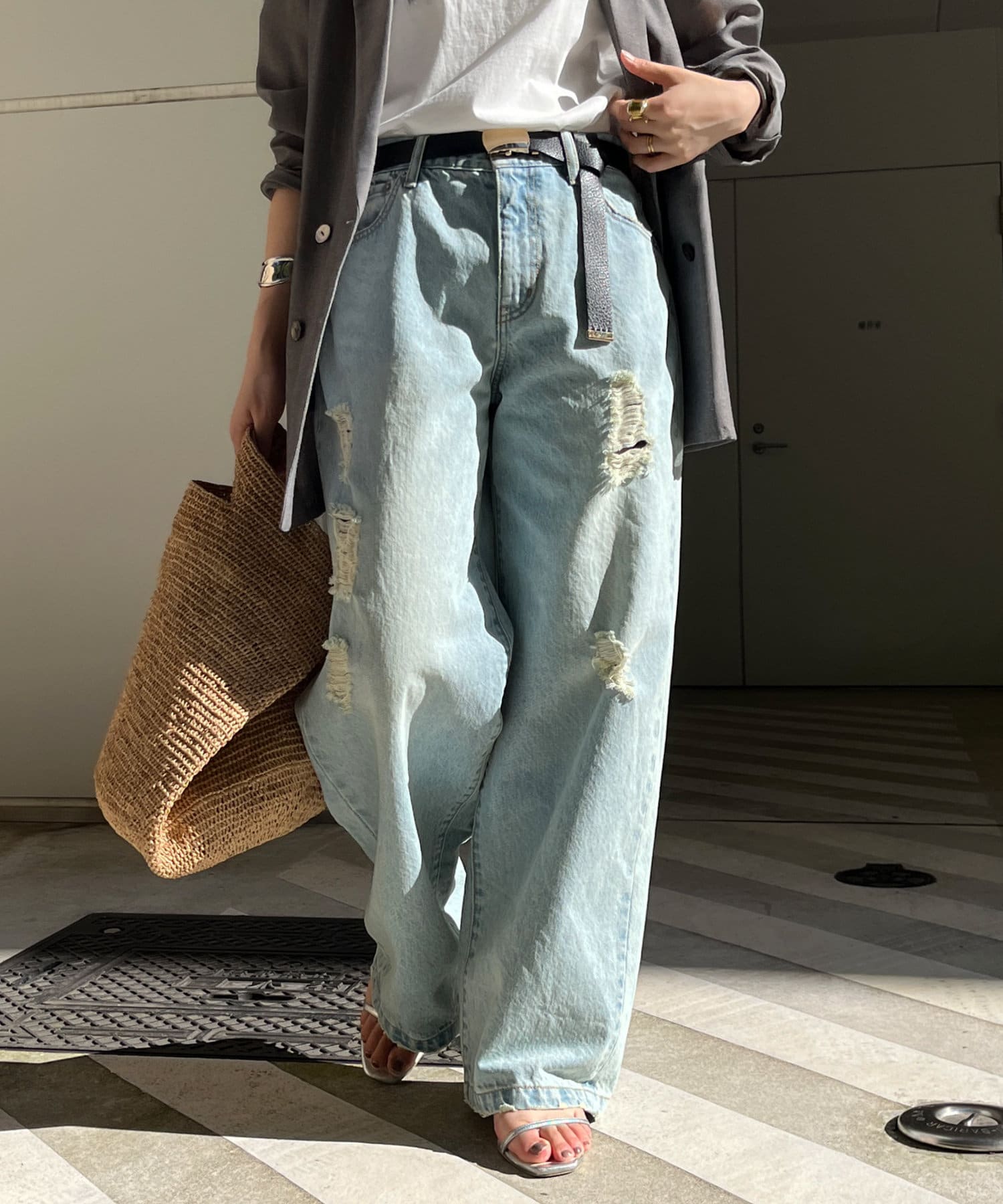 ローウエストで仕上げたDOUDOUでは少し新鮮なバランスのダメージデニム。