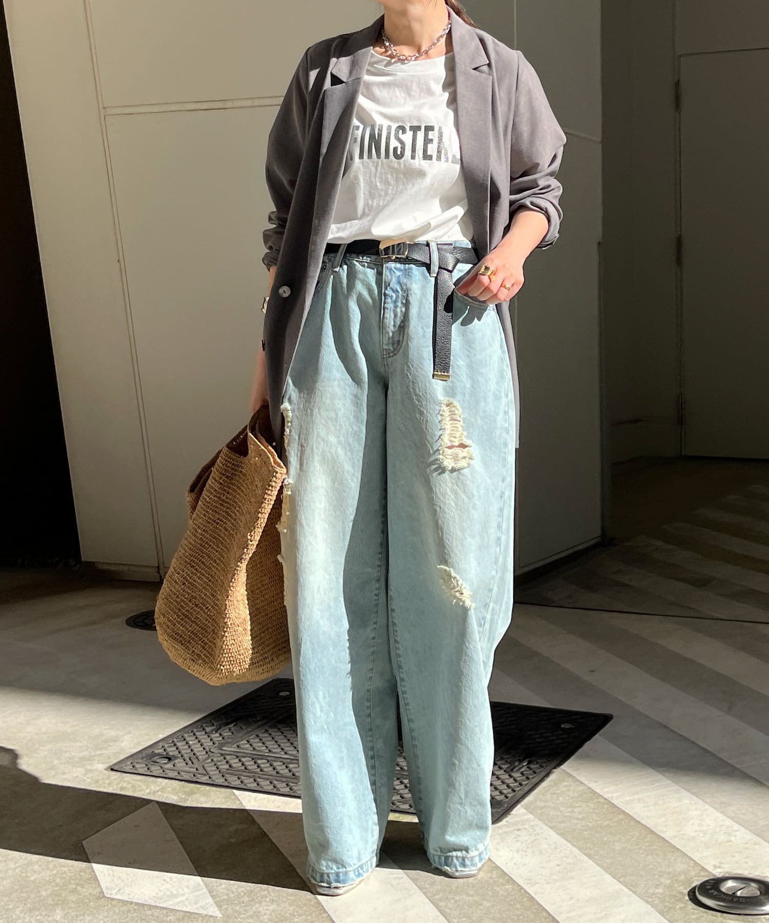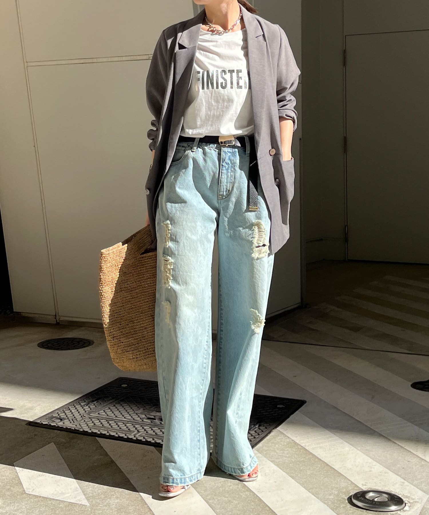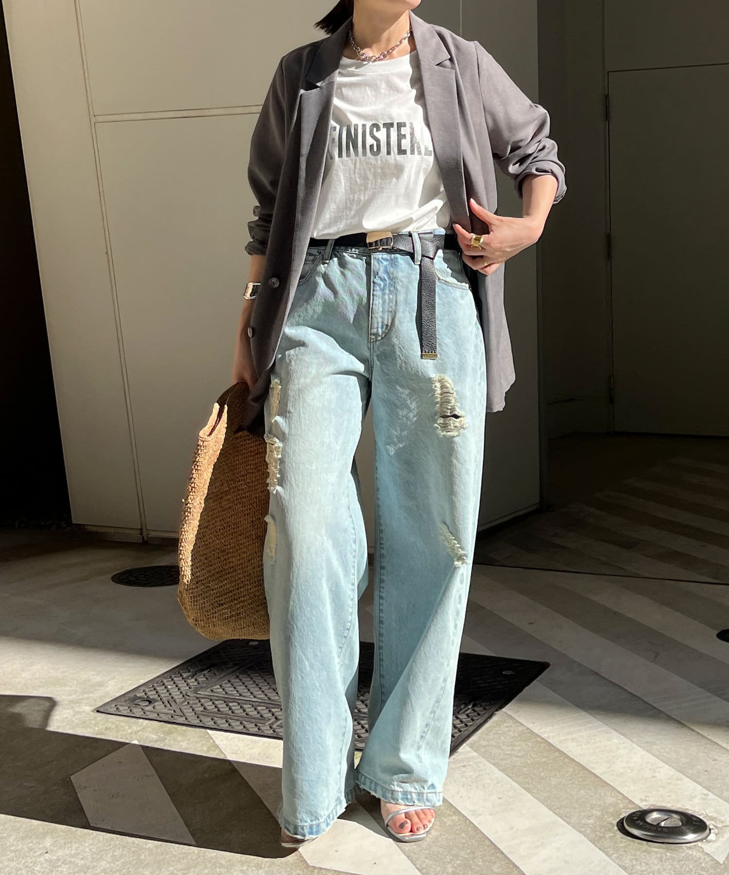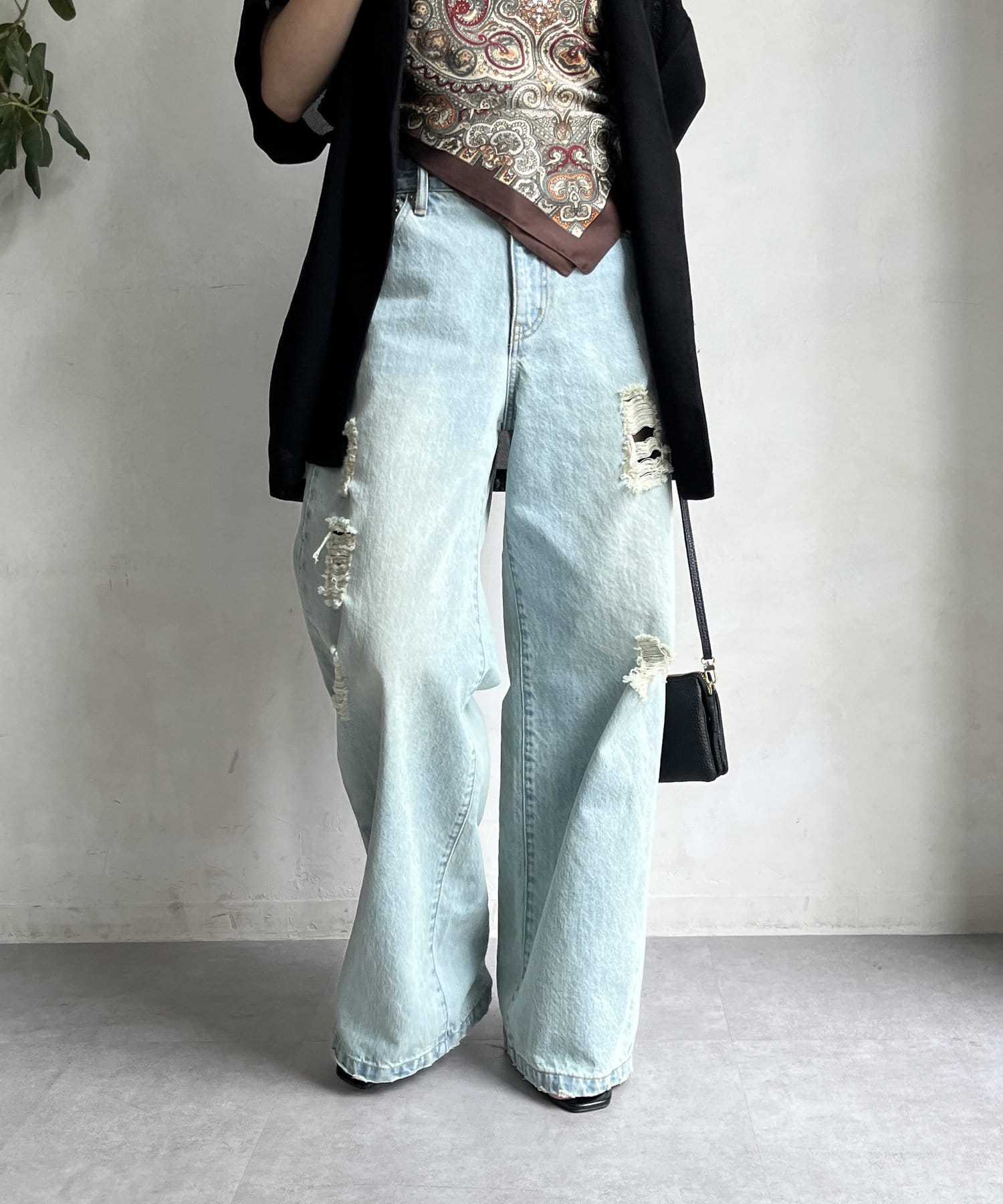 ローウエストで仕上げたDOUDOUでは少し新鮮なバランスのダメージデニム。