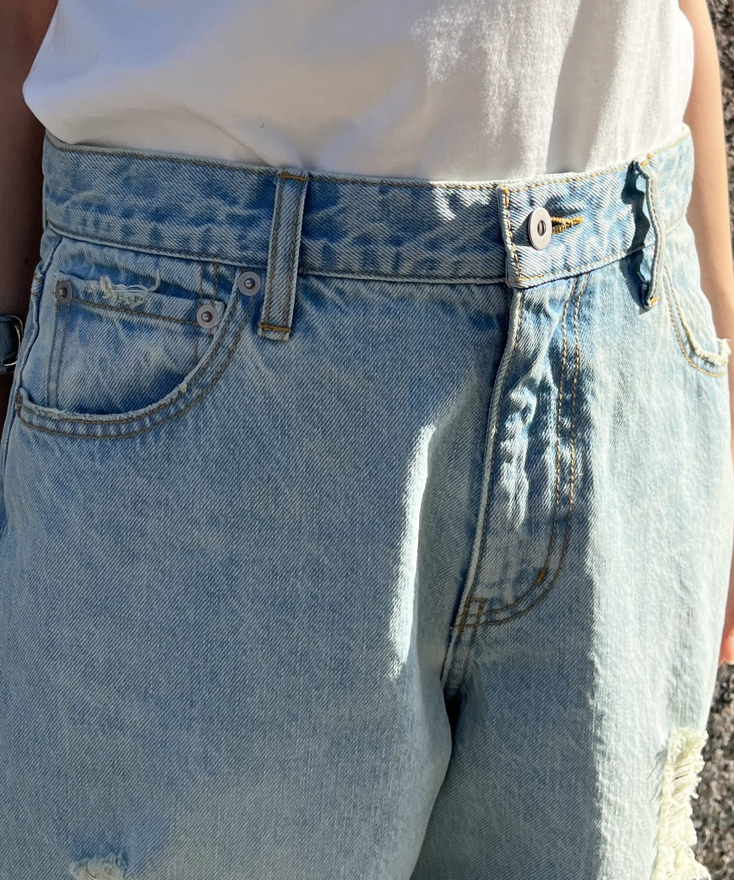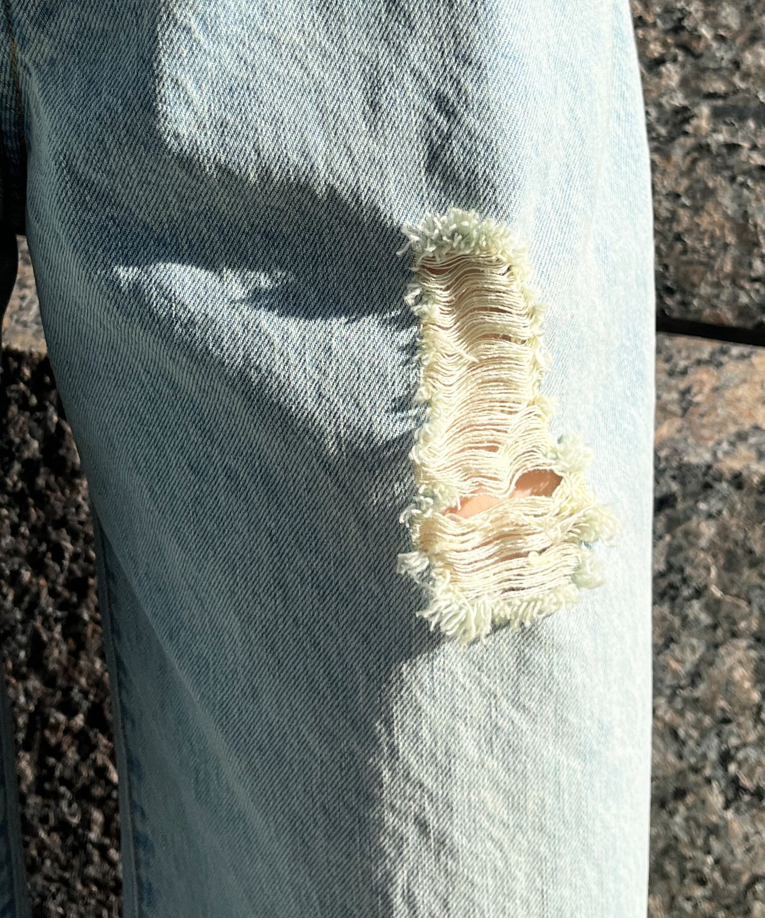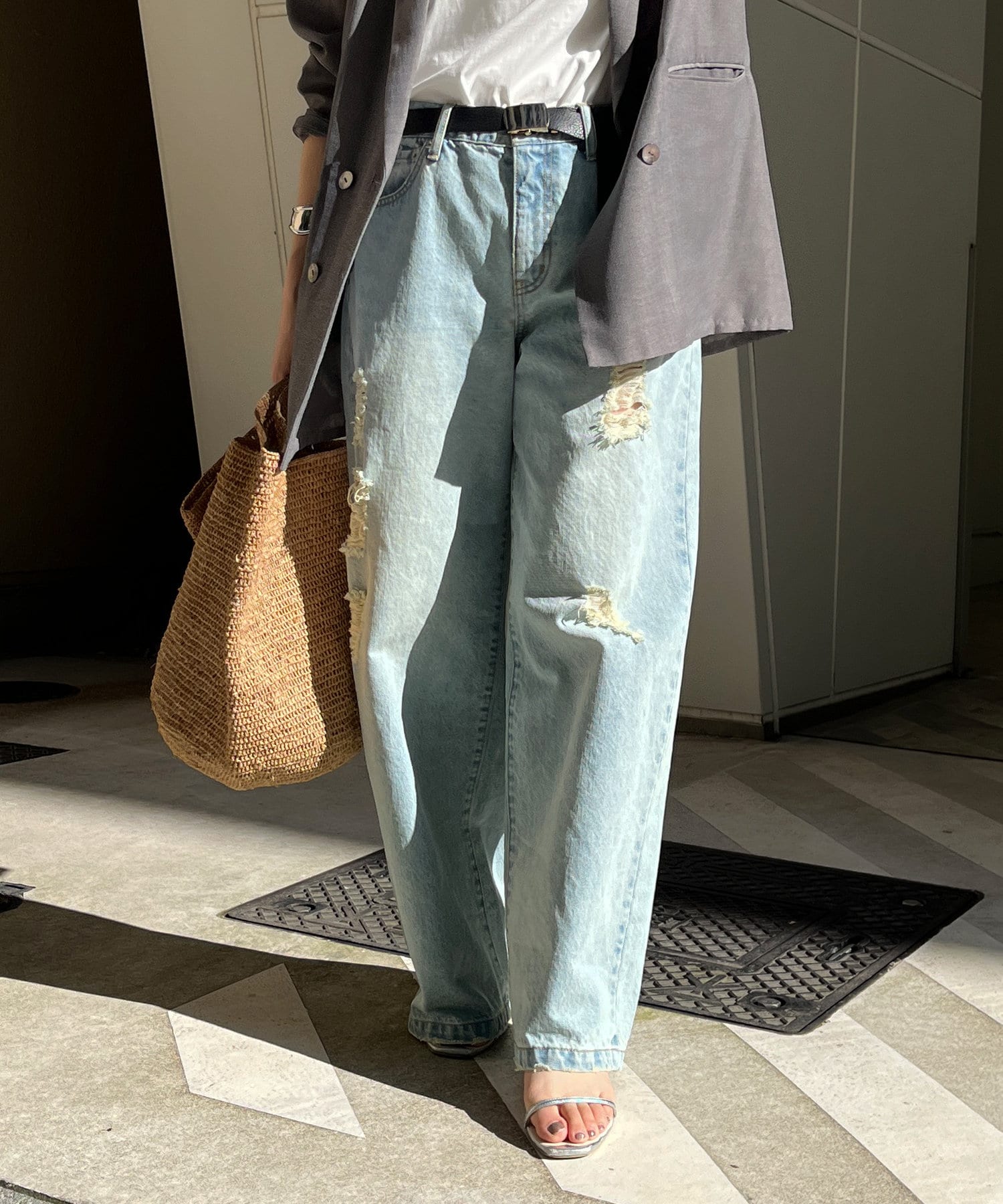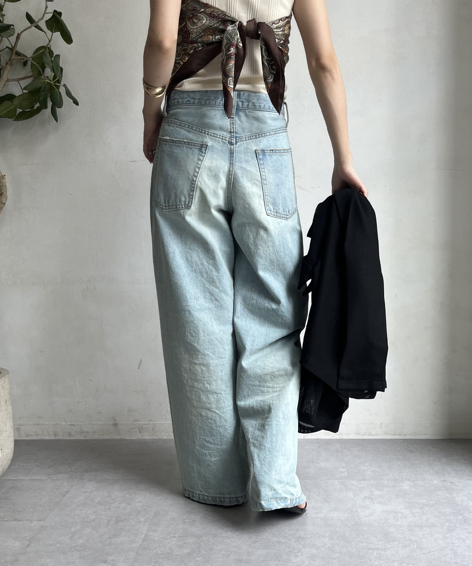 ローウエストで仕上げたDOUDOUでは少し新鮮なバランスのダメージデニム。