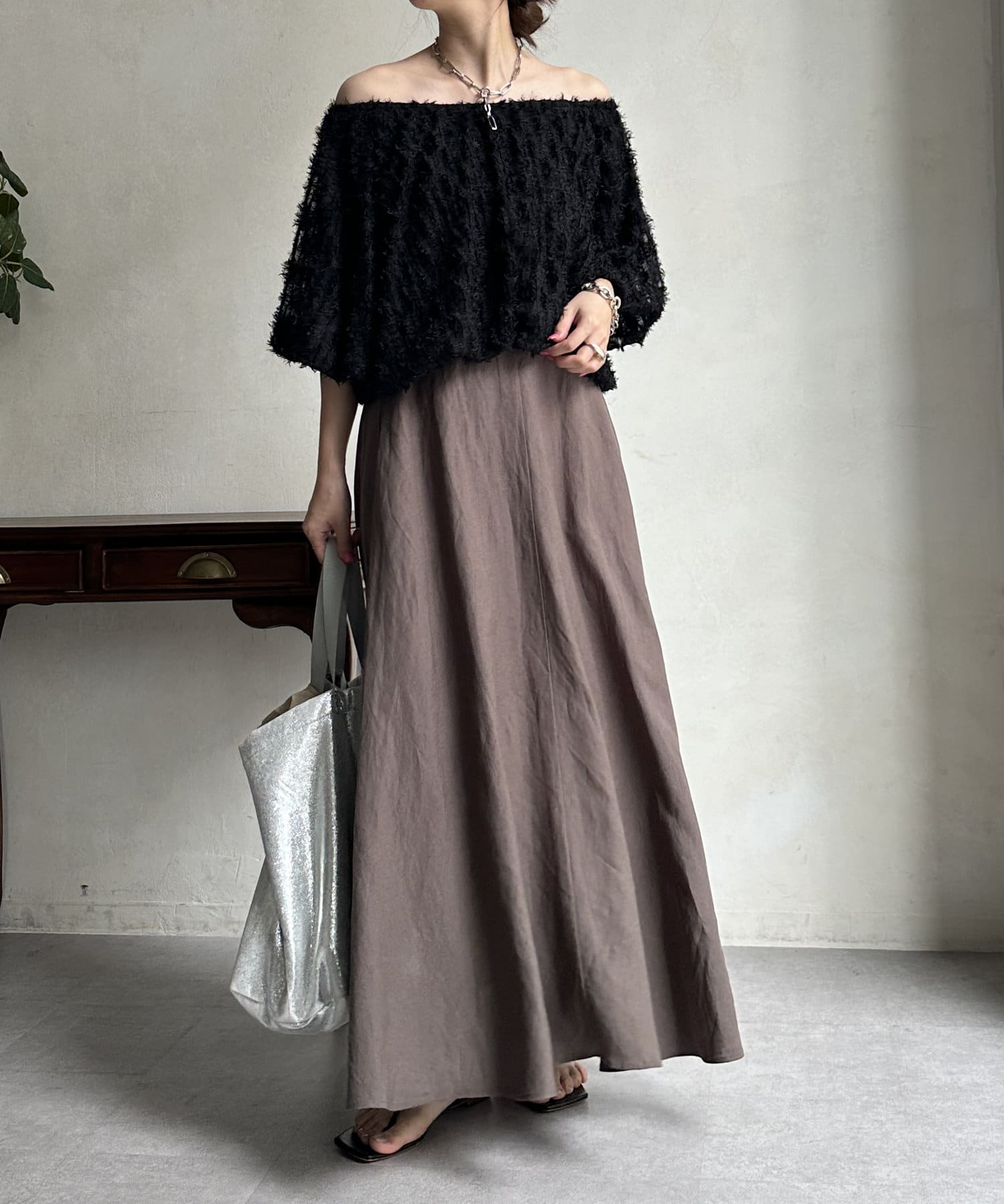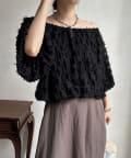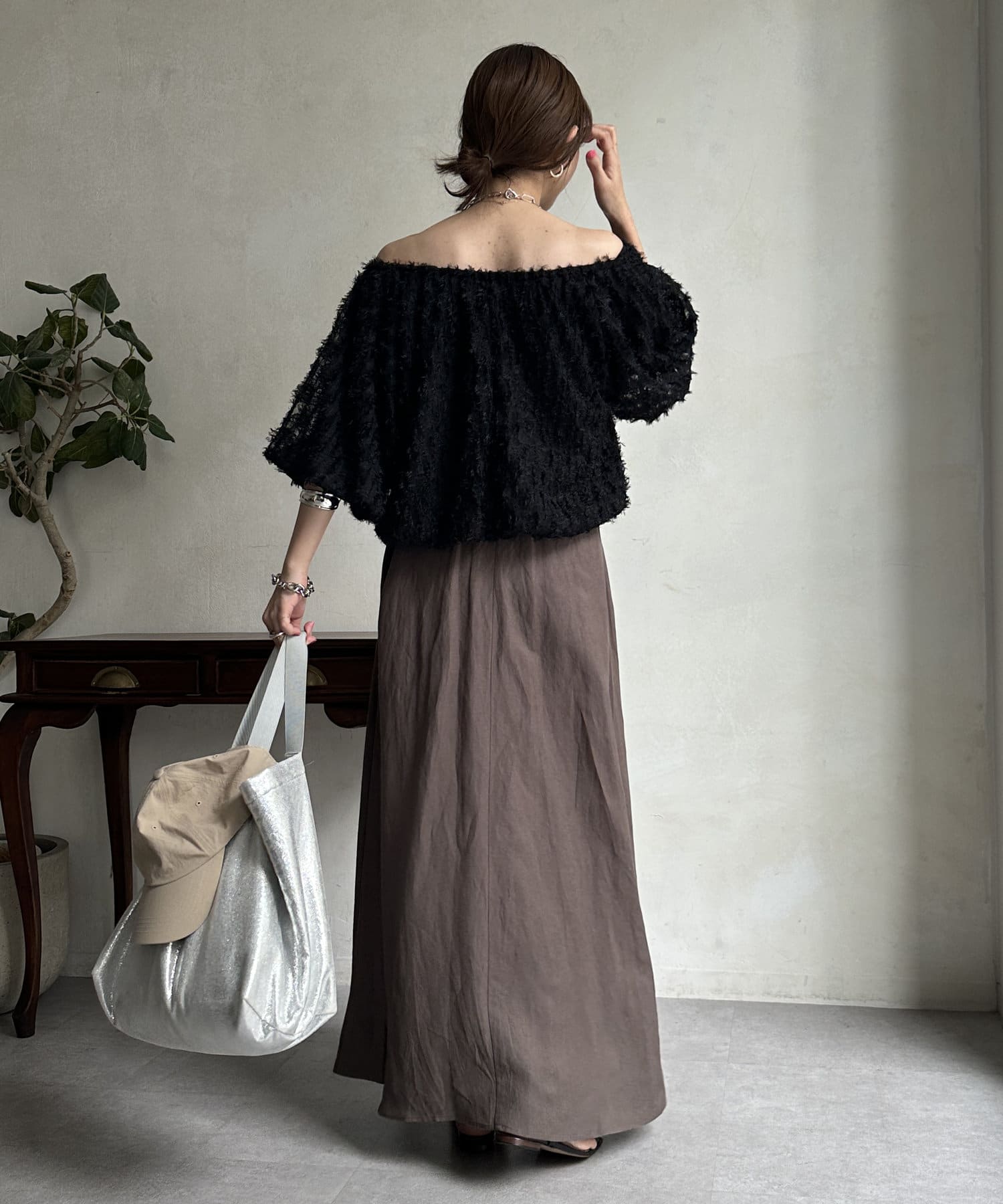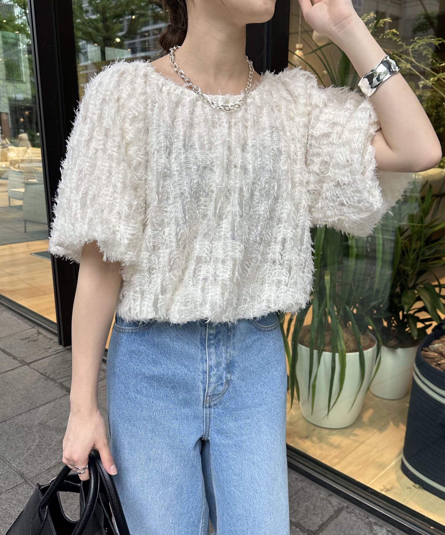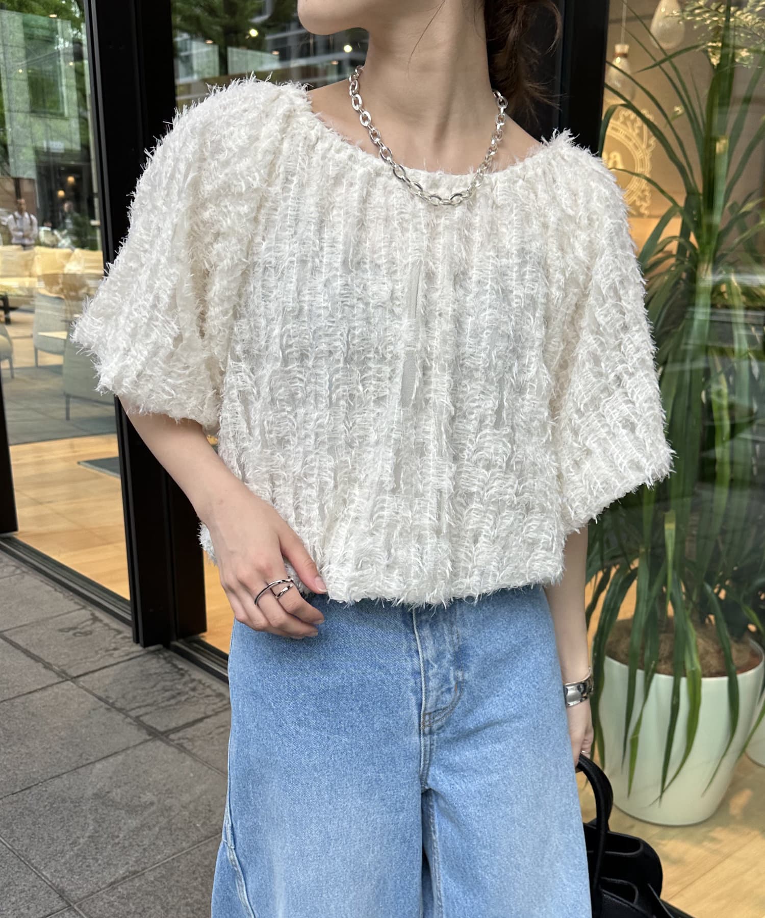 フリンジチュールの素材感と、ふんわりシルエットで女性らしく可愛い雰囲気に。
