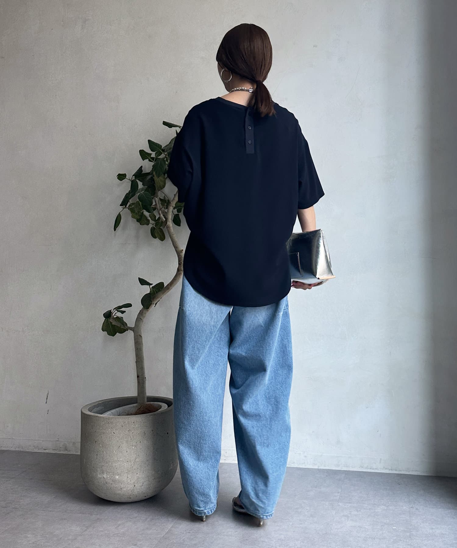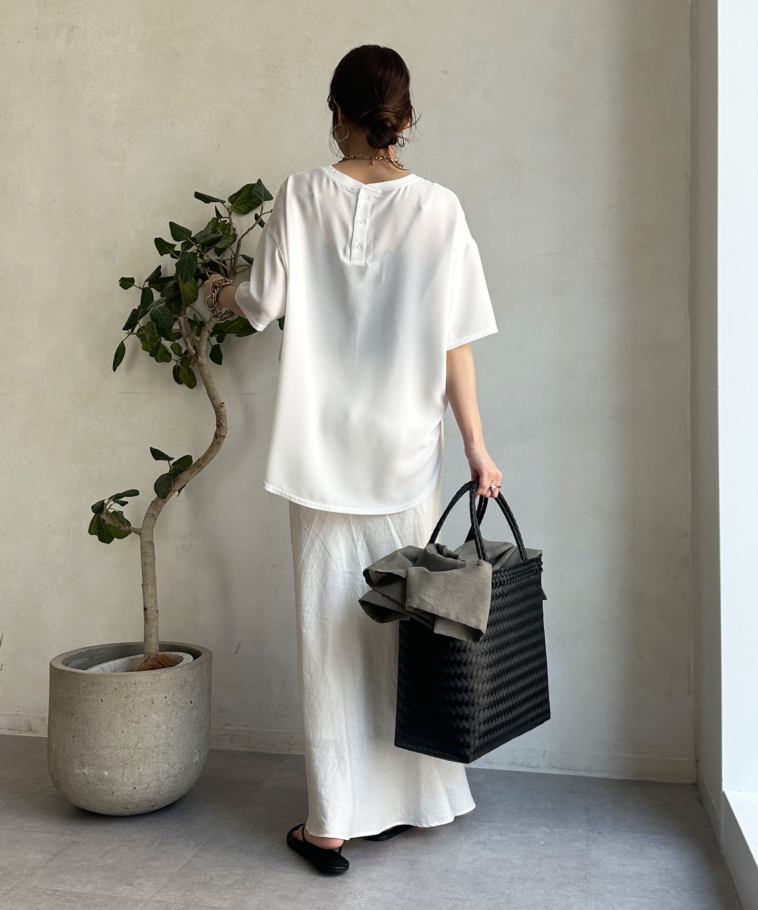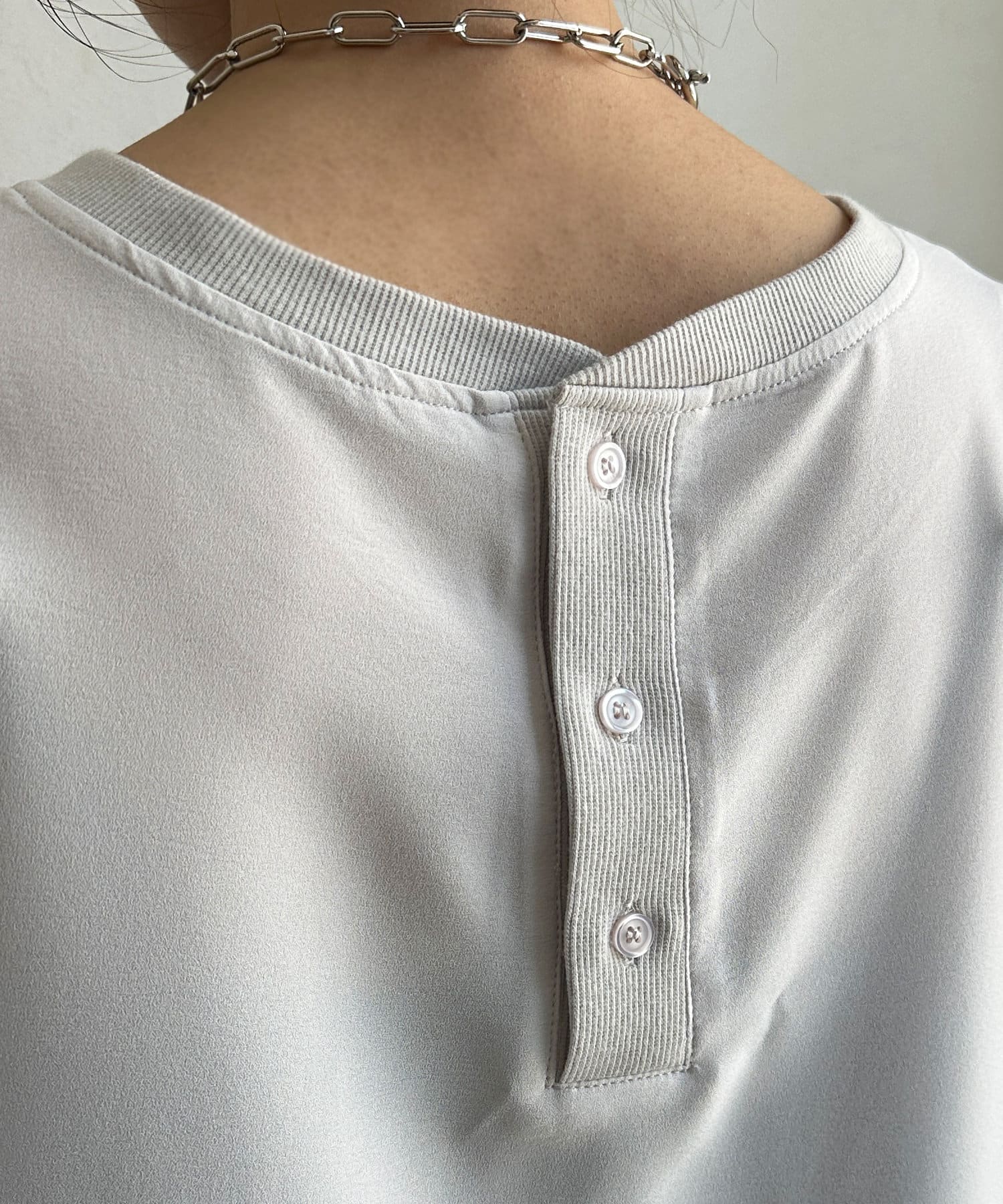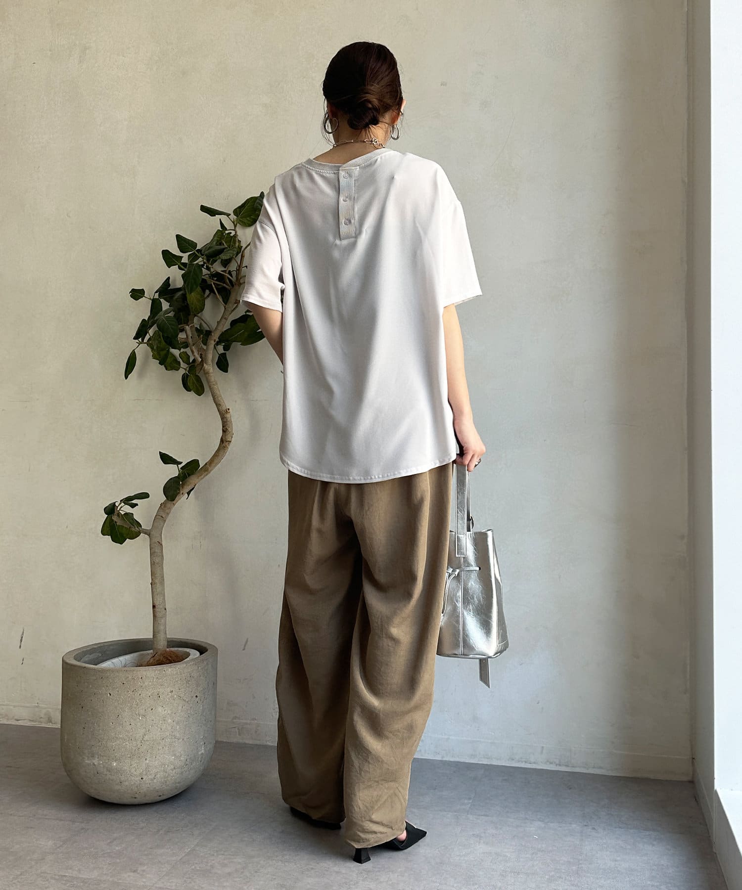 バックネック部分にはボタンのデザインをプラスし、さり気のないポイントになってくれますよ。