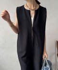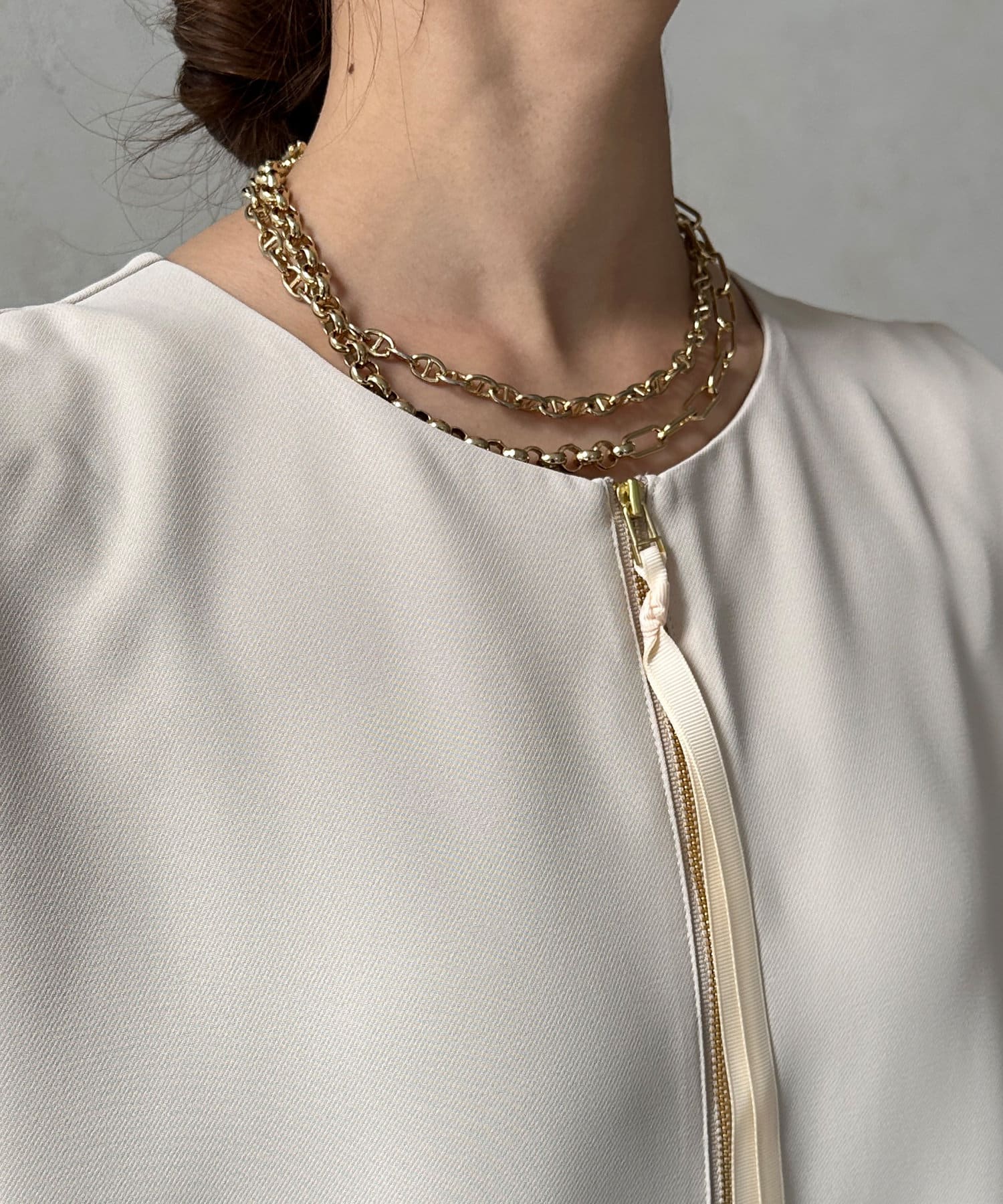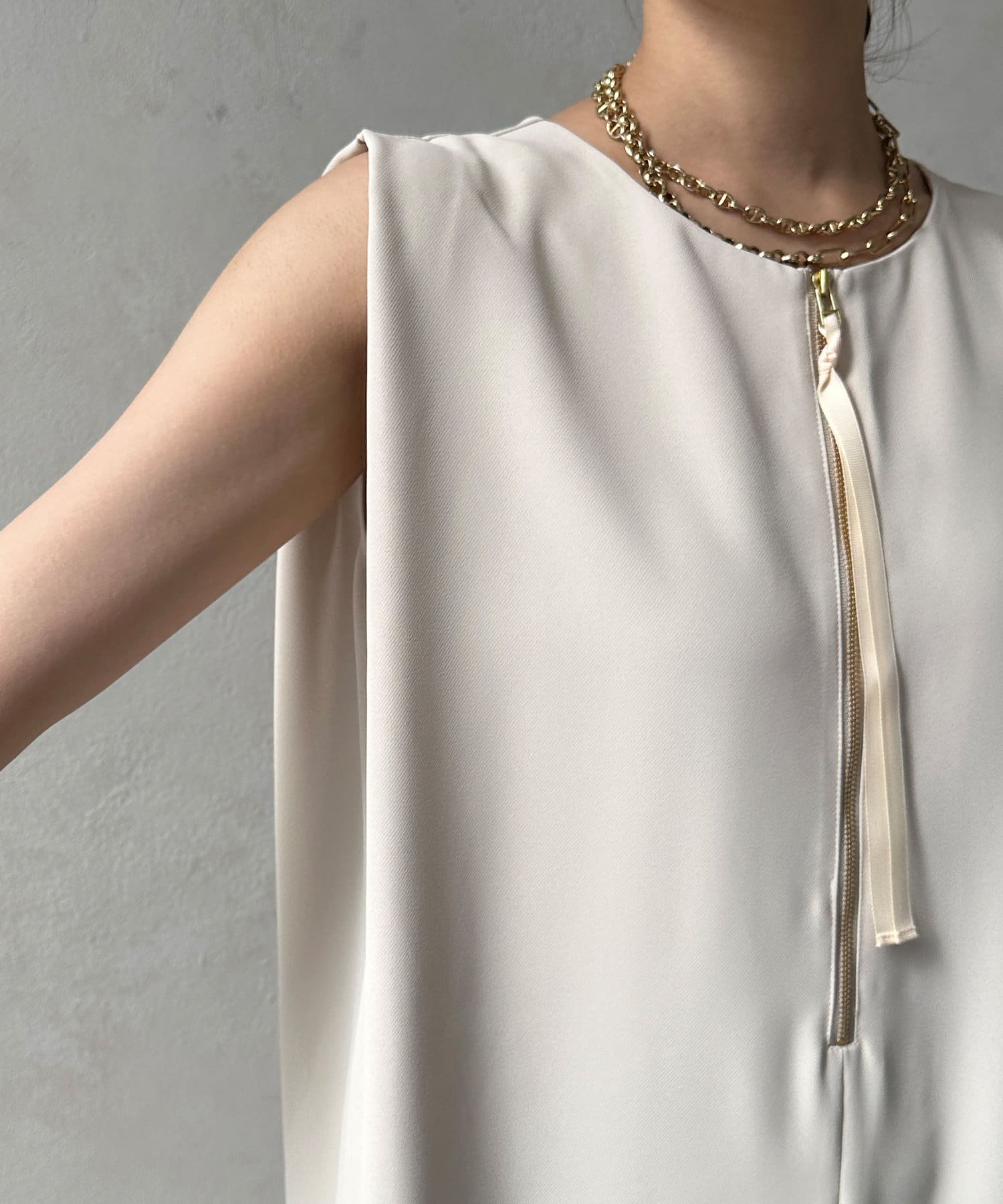 フロントにはジップデザインを施し、アクセントに。少し開けてインナーを見せるスタイルもおすすめです。