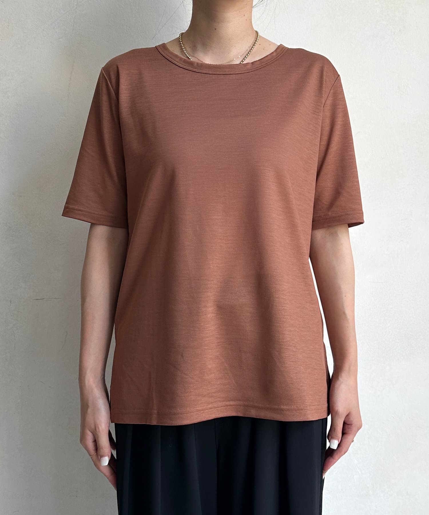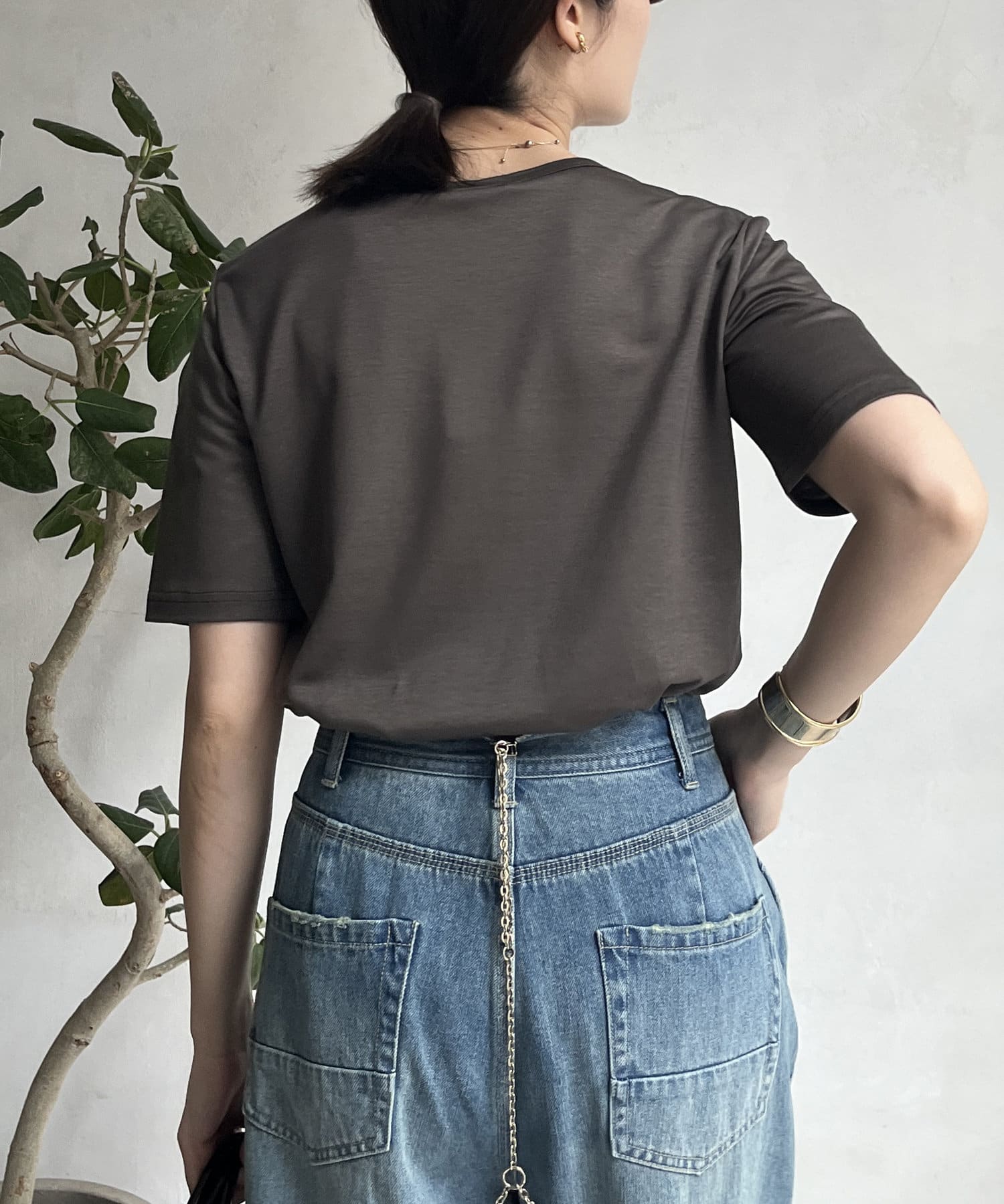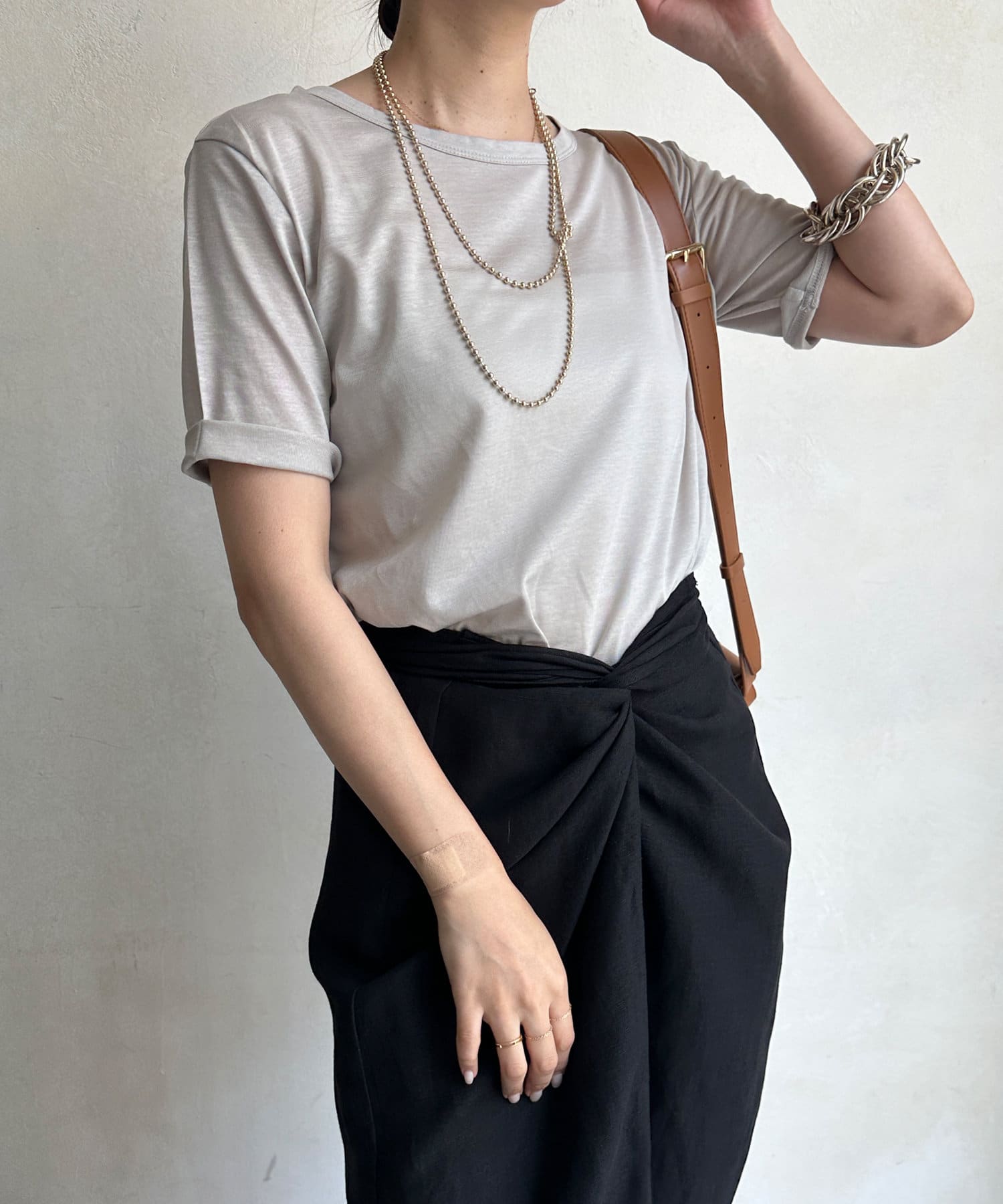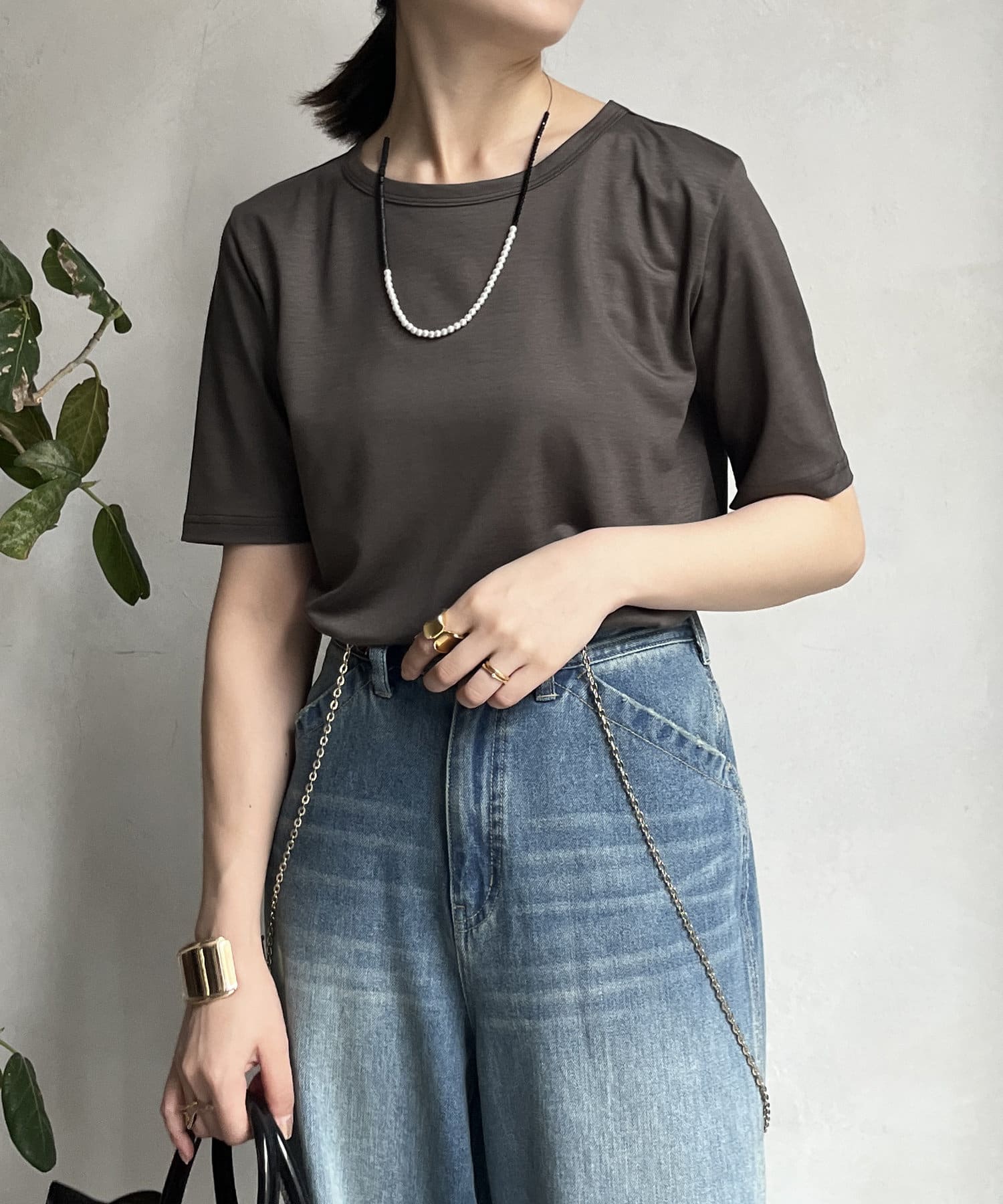 綿100%のTシャツとは違い、すこしつるっとした表面感でカジュアルになりすぎない新鮮な印象。