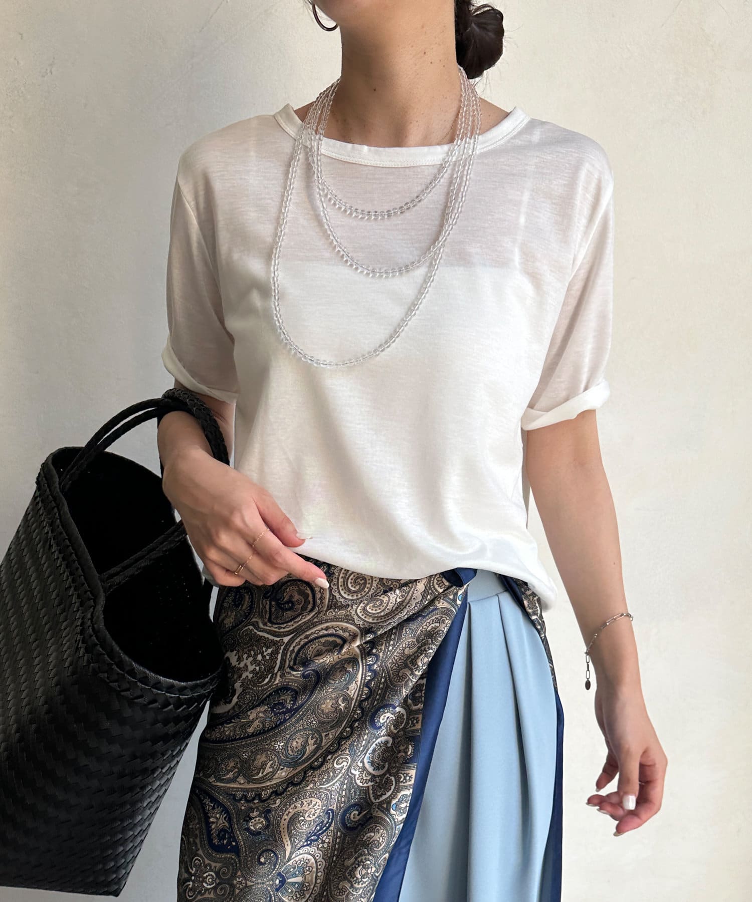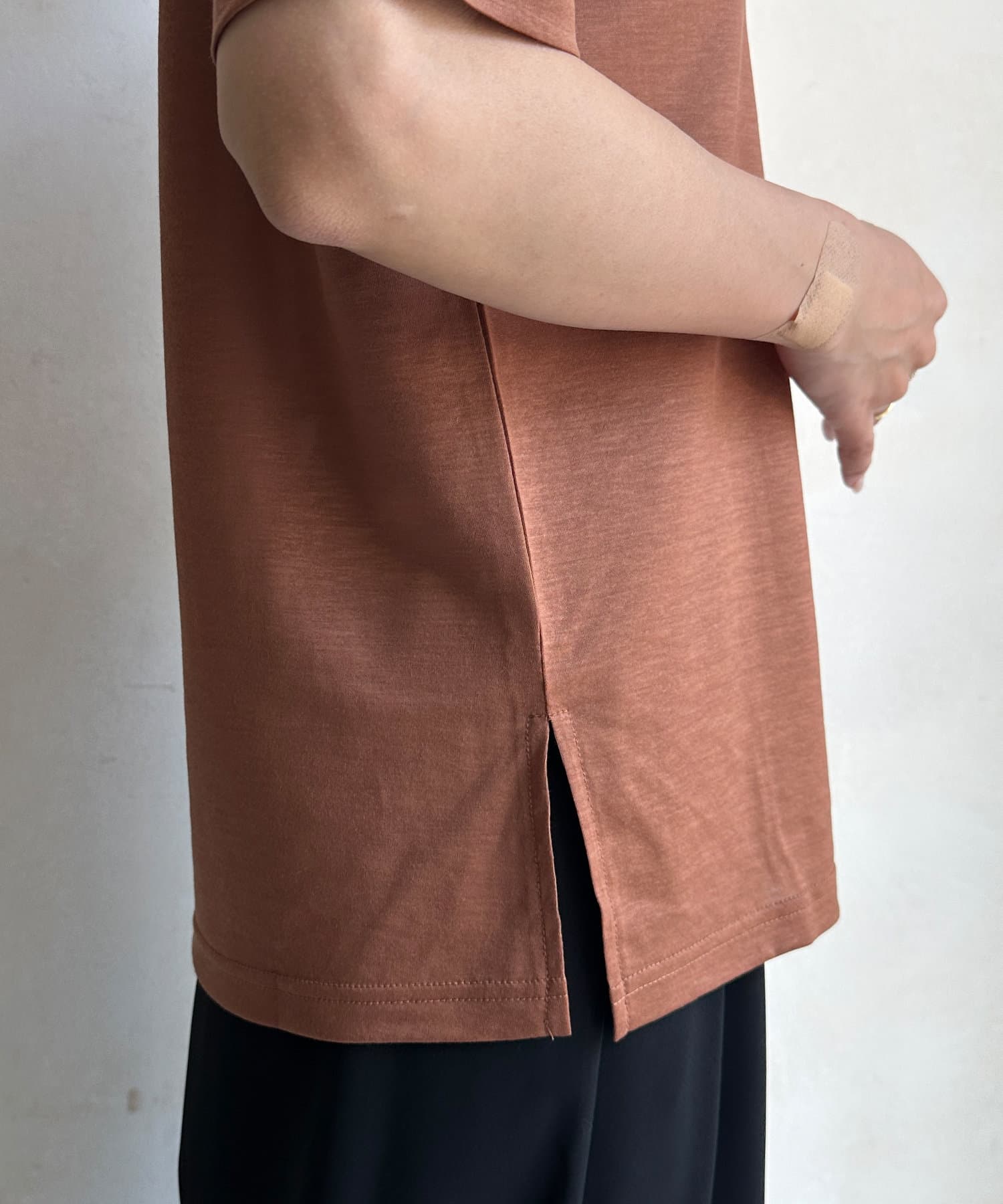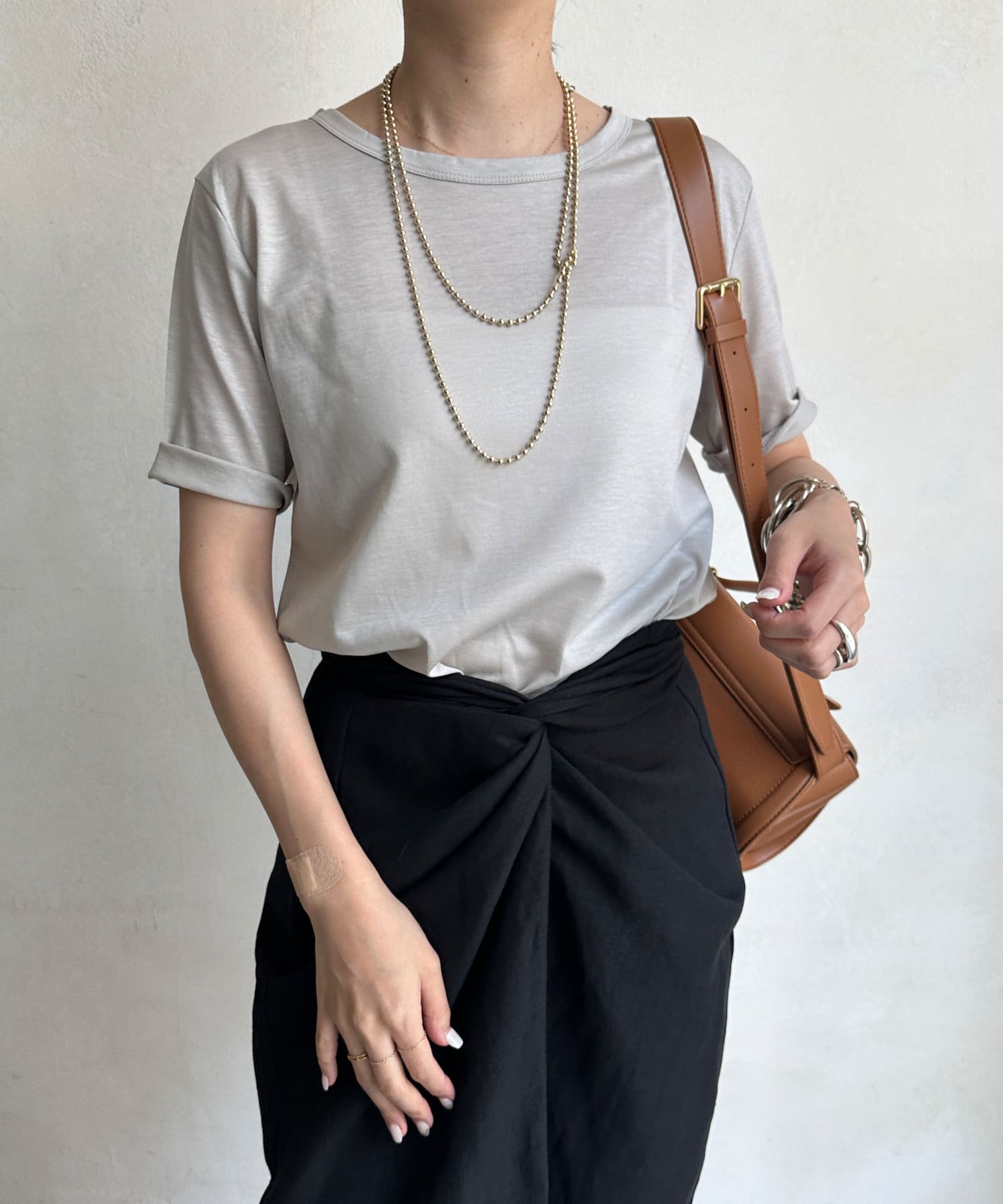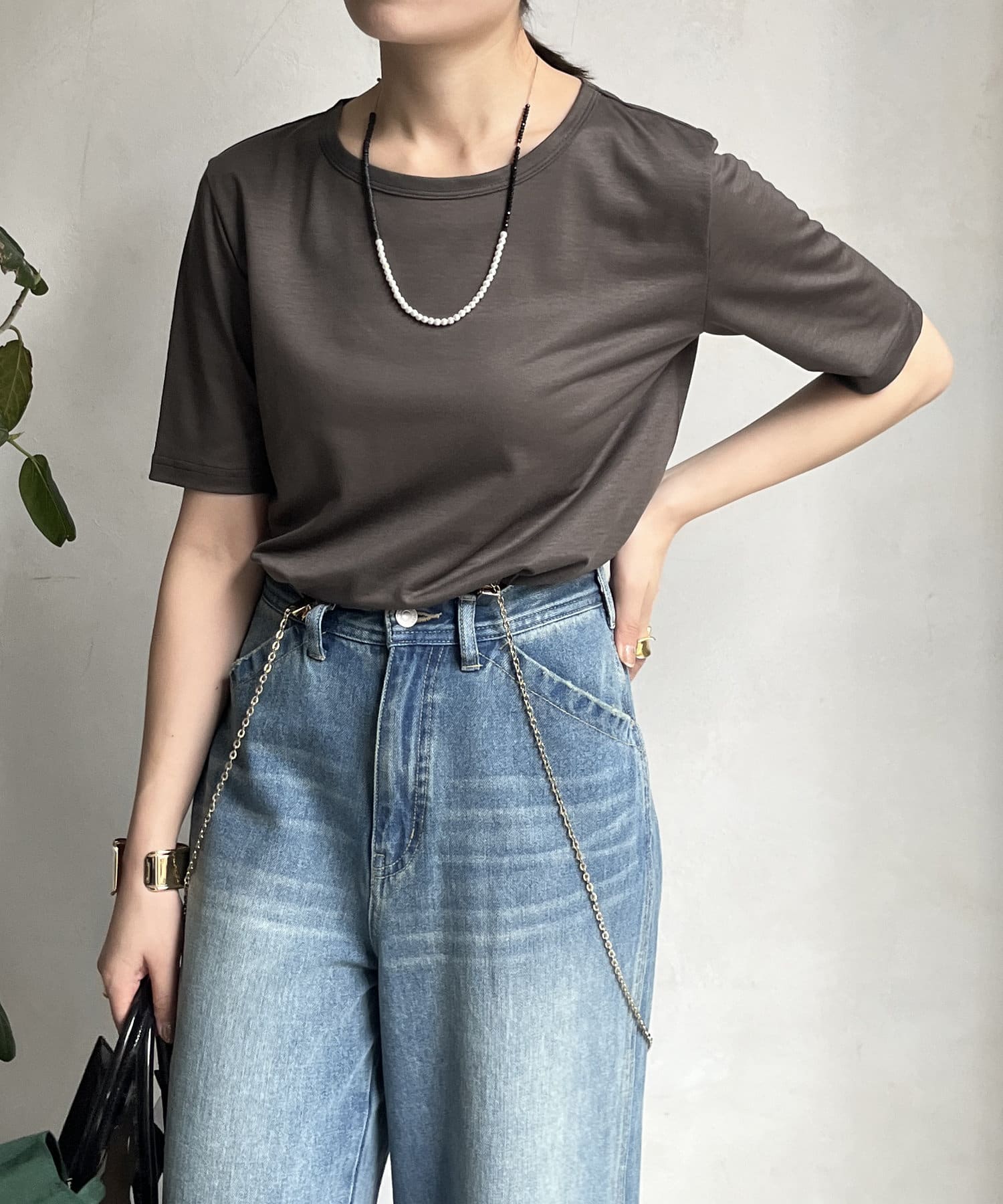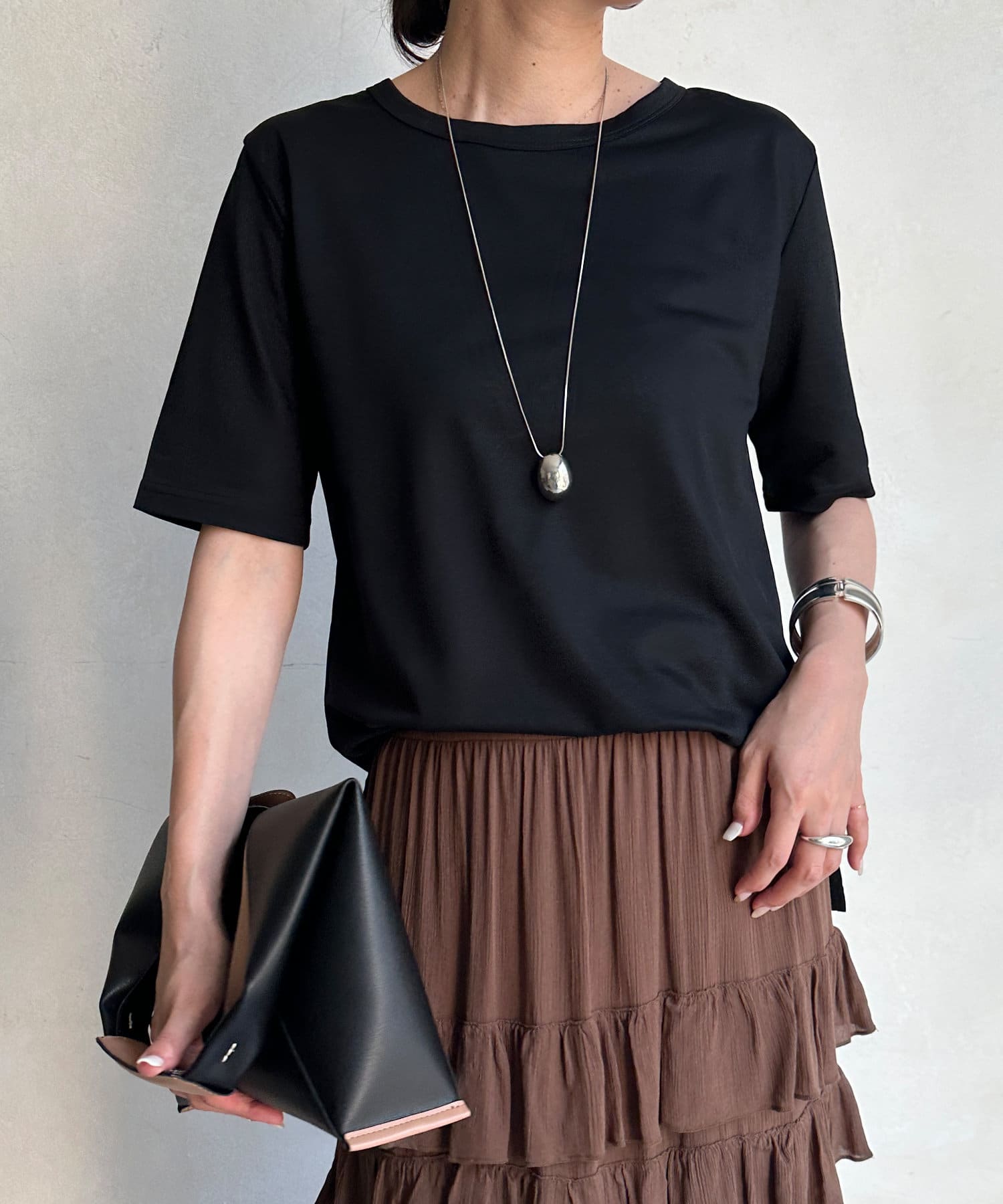 綿100%のTシャツとは違い、すこしつるっとした表面感でカジュアルになりすぎない新鮮な印象。