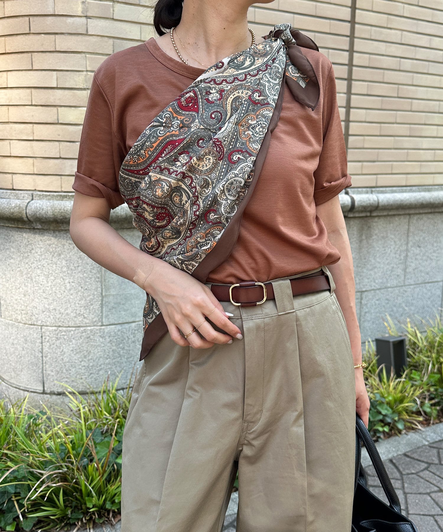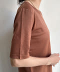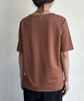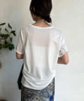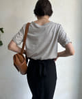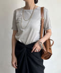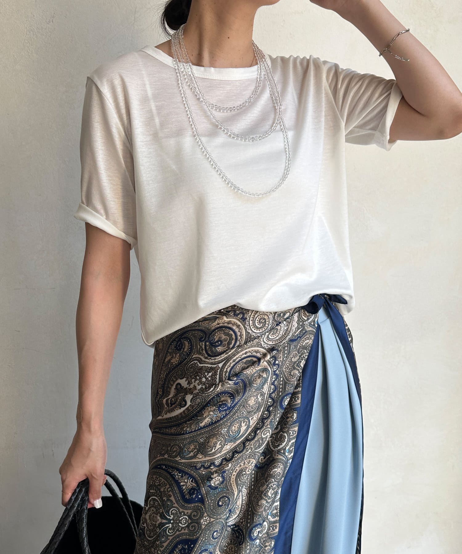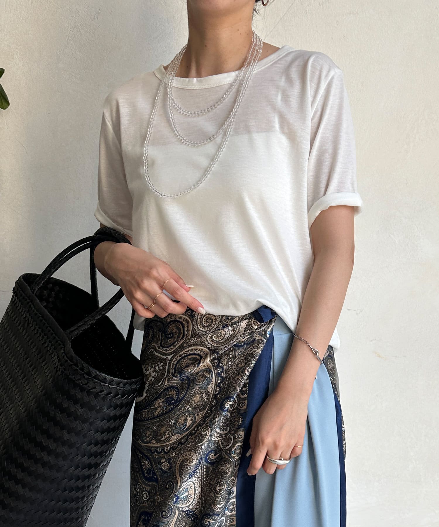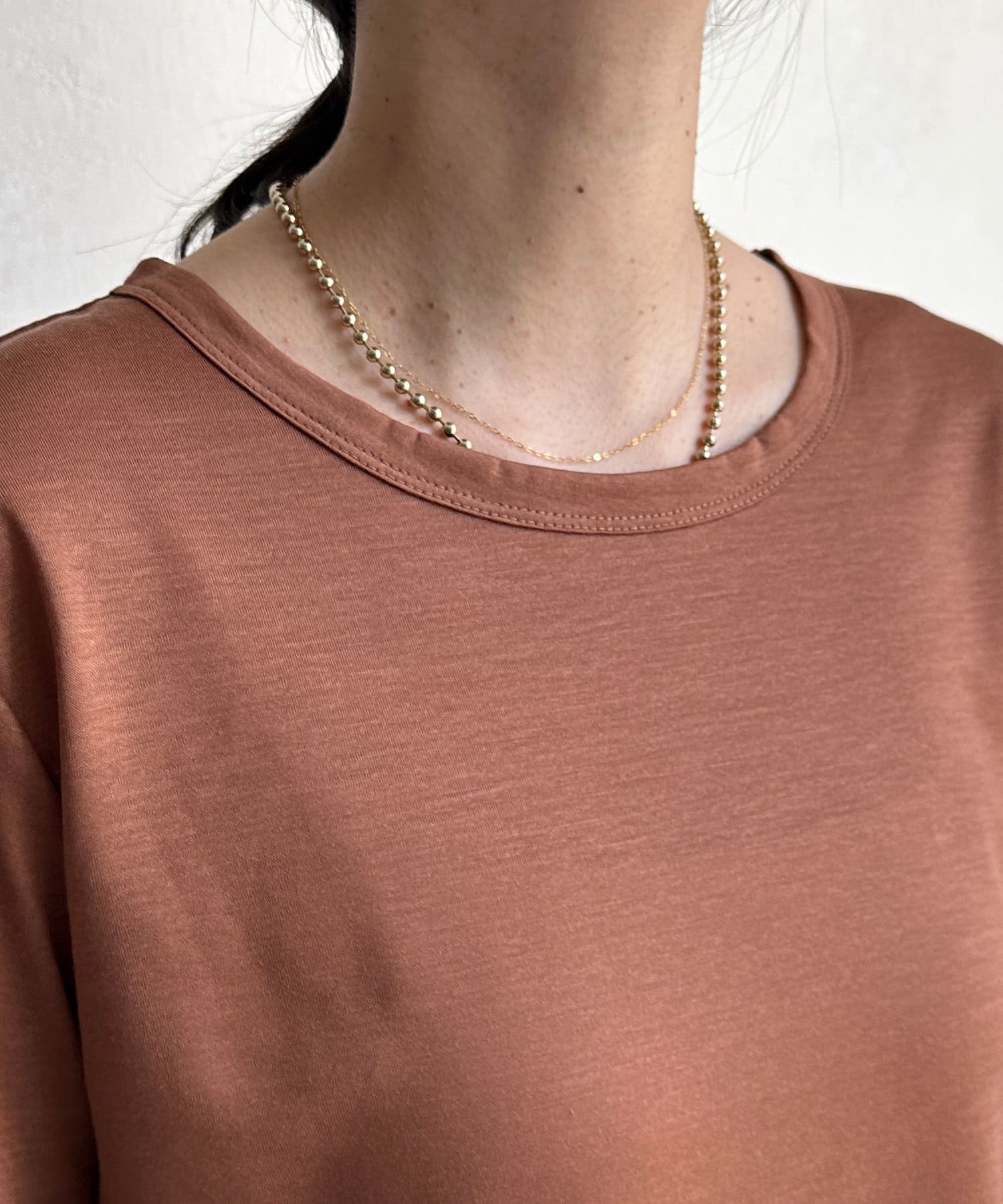 綿100%のTシャツとは違い、すこしつるっとした表面感でカジュアルになりすぎない新鮮な印象。
