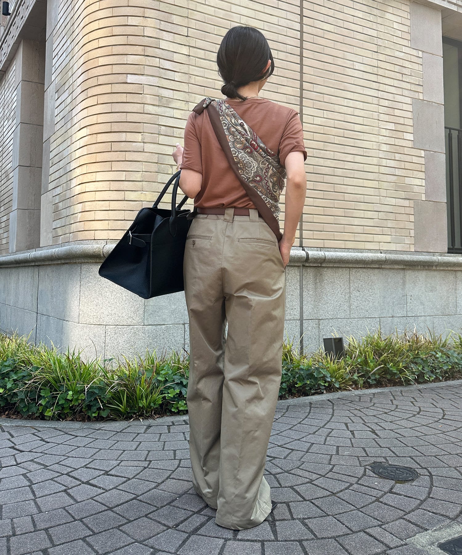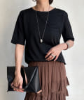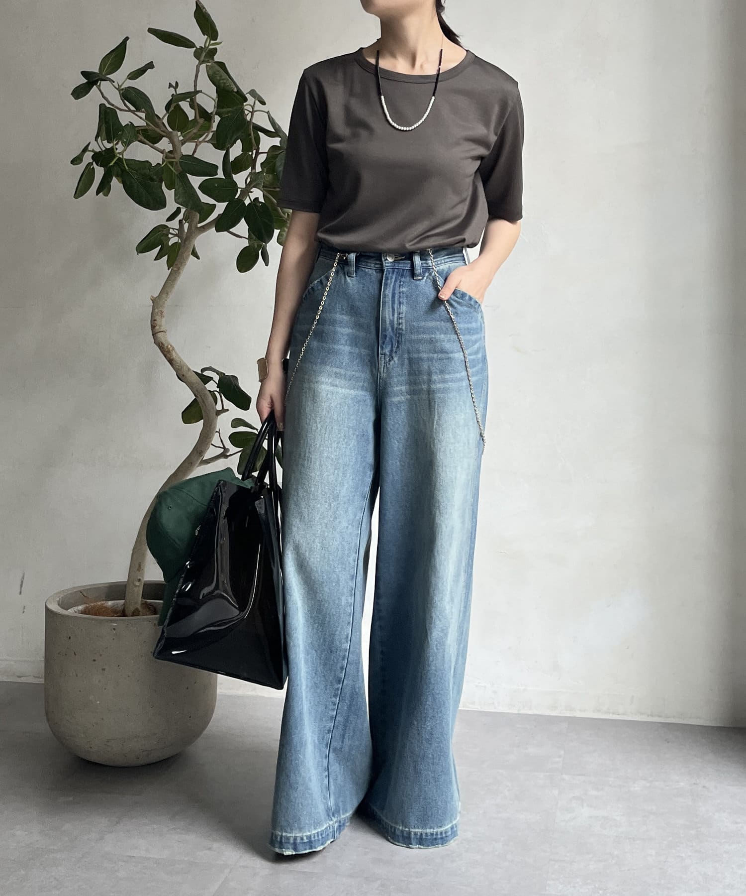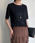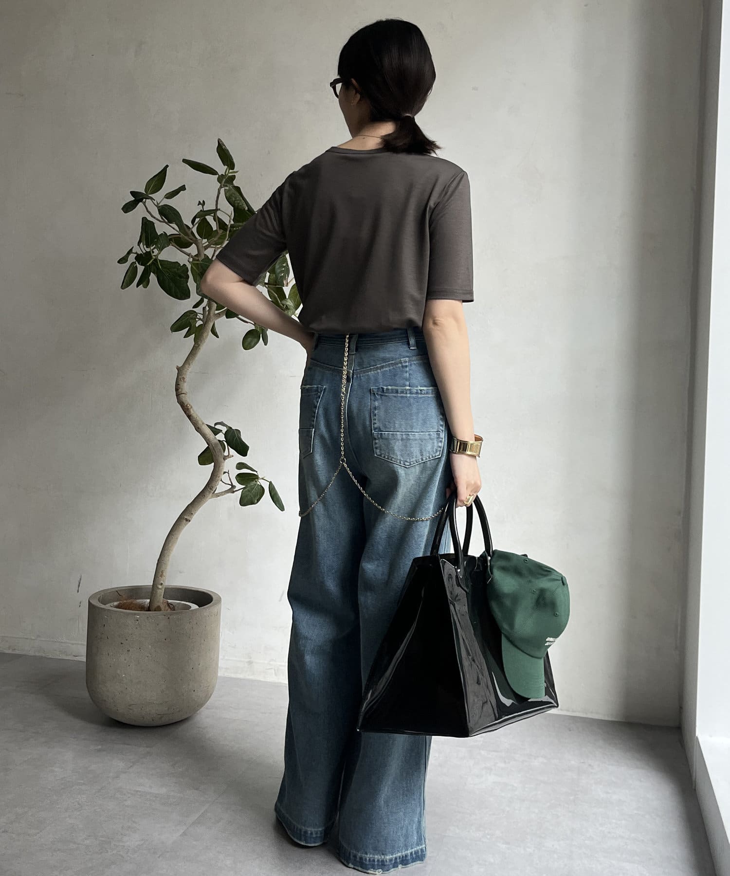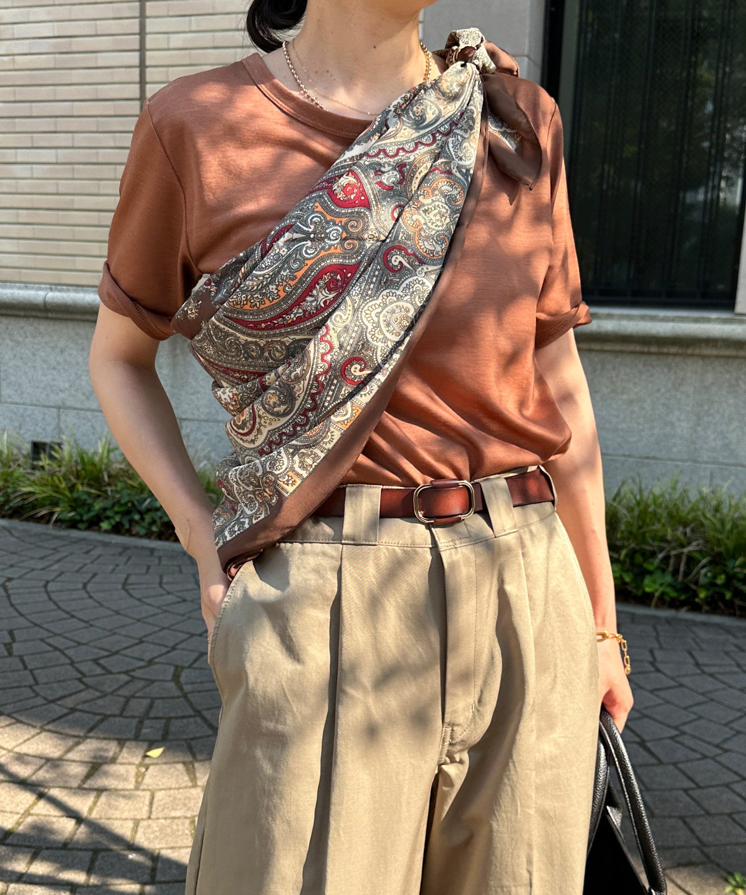 綿100%のTシャツとは違い、すこしつるっとした表面感でカジュアルになりすぎない新鮮な印象。