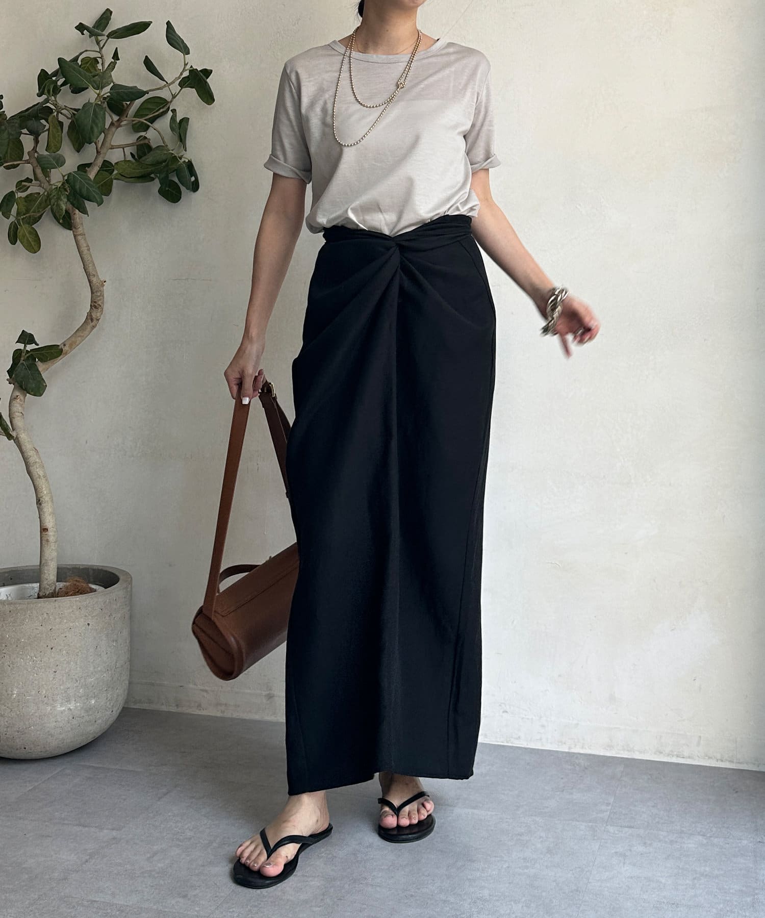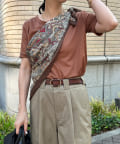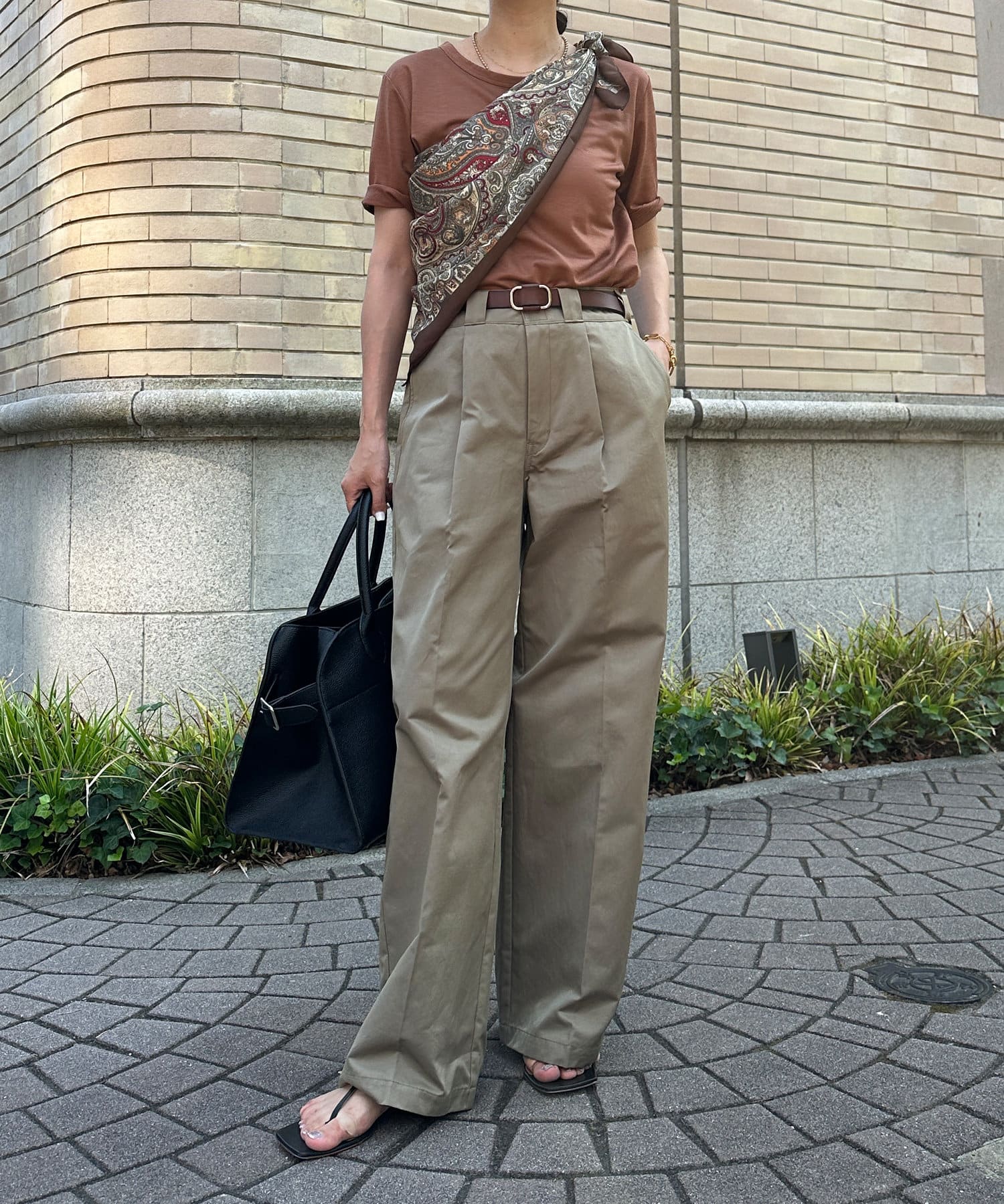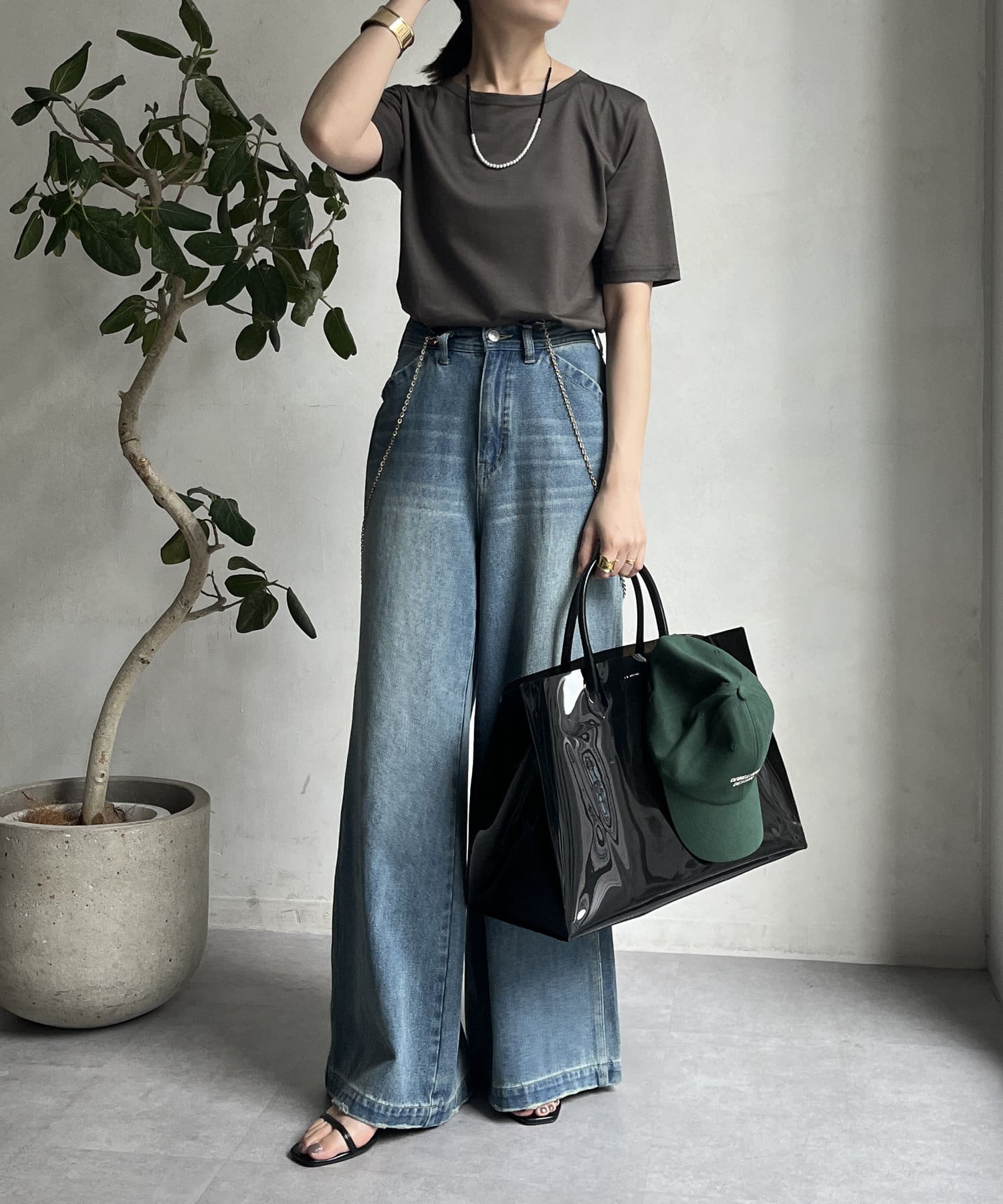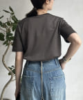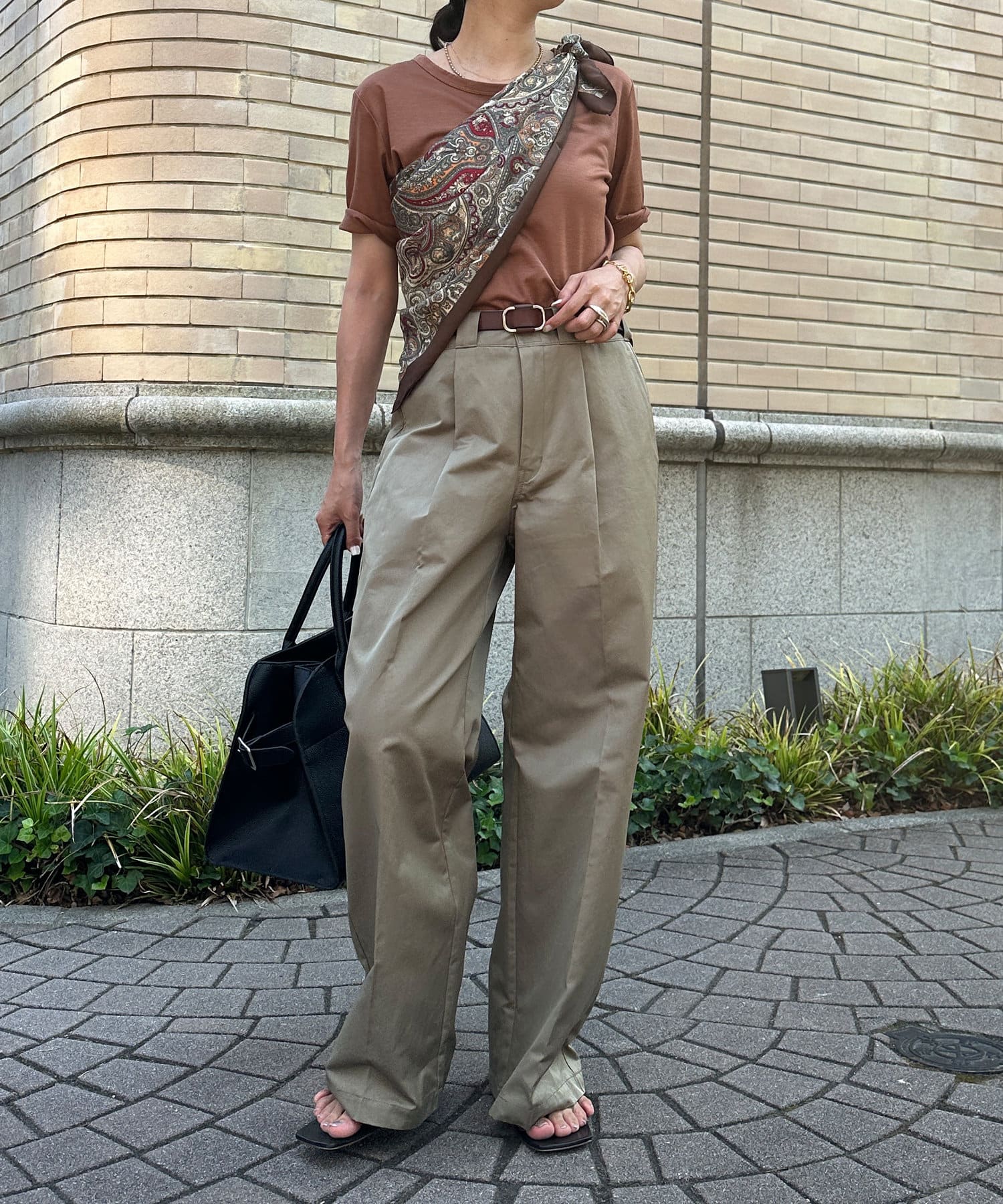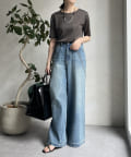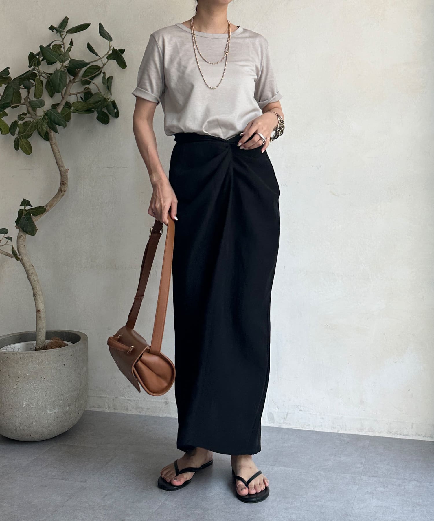 綿100%のTシャツとは違い、すこしつるっとした表面感でカジュアルになりすぎない新鮮な印象。