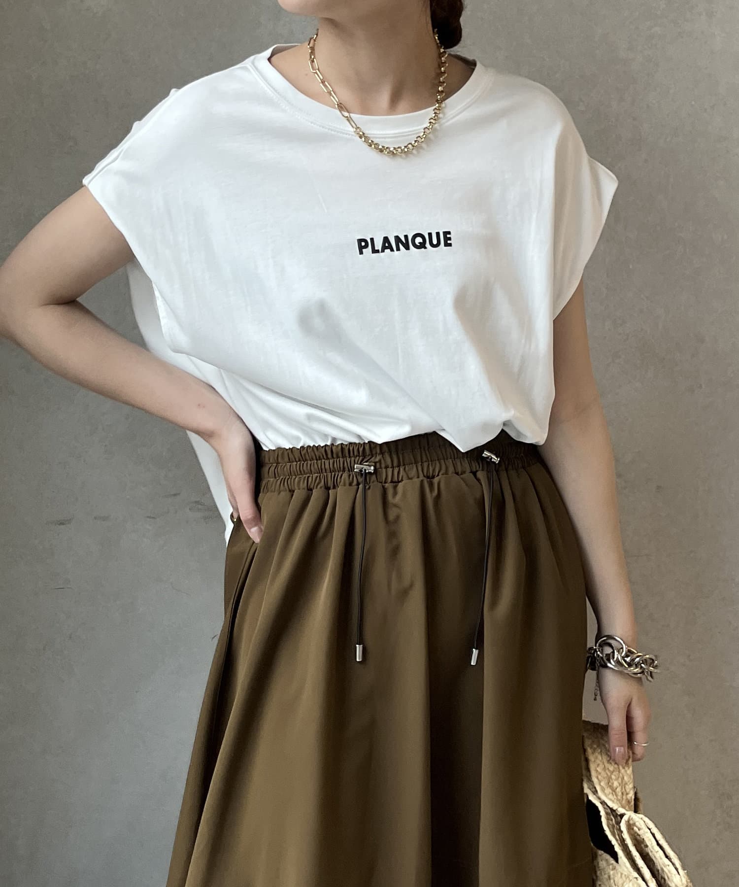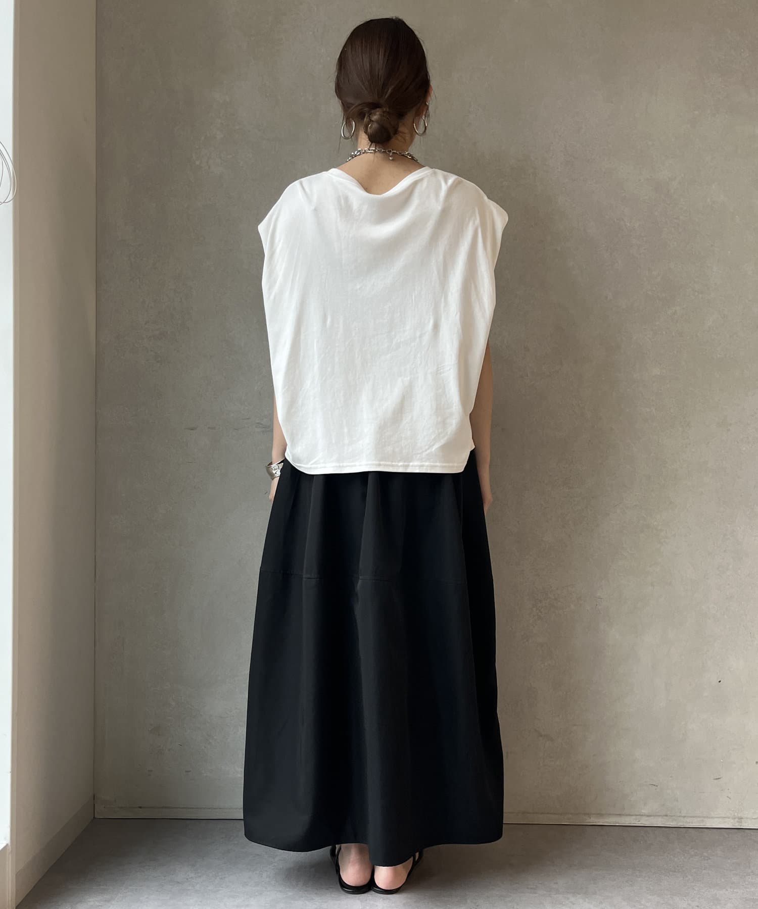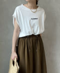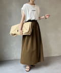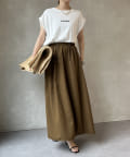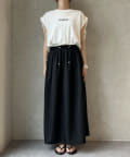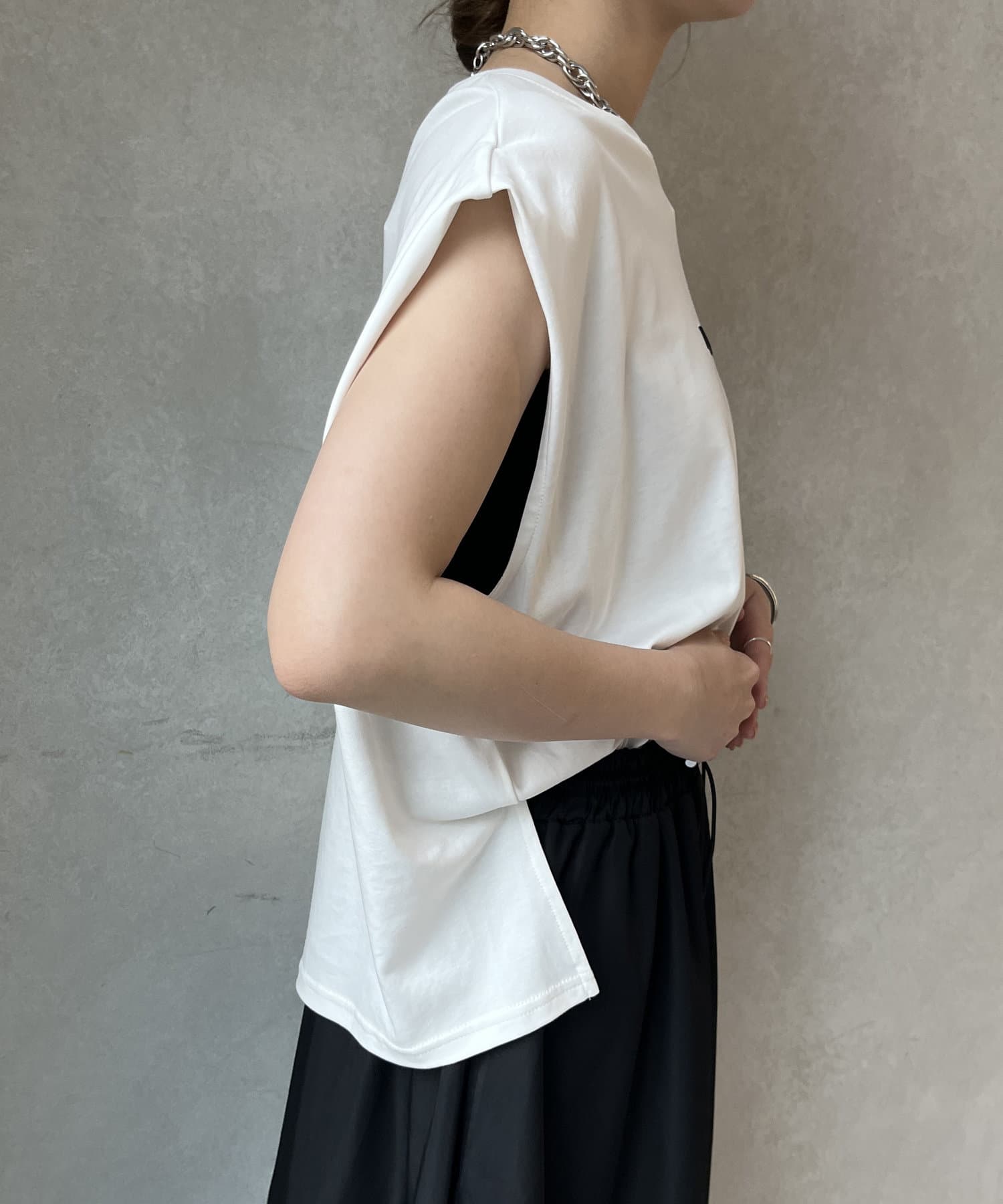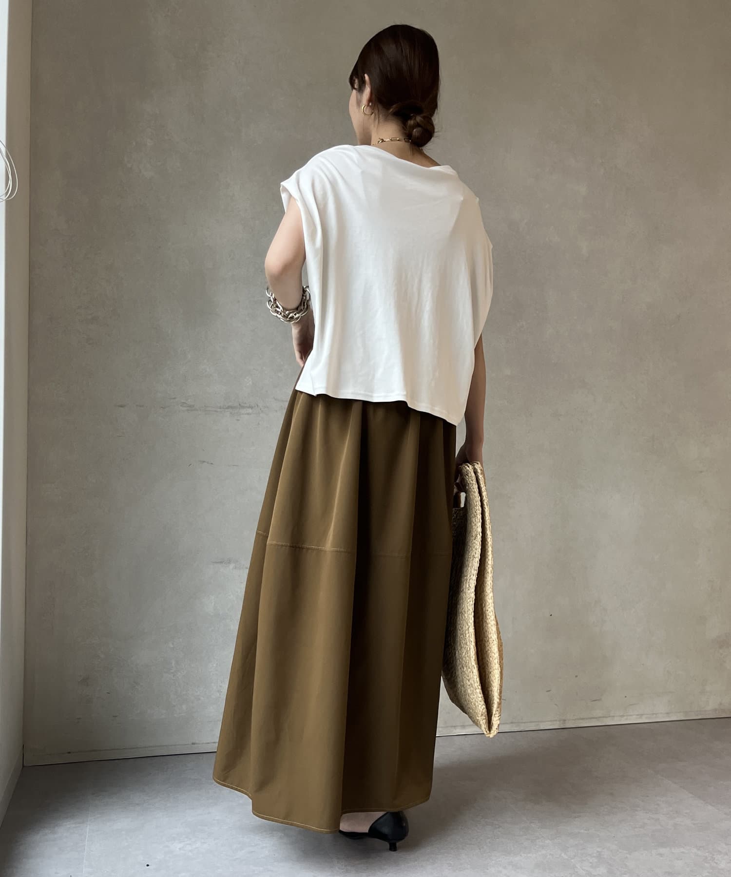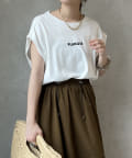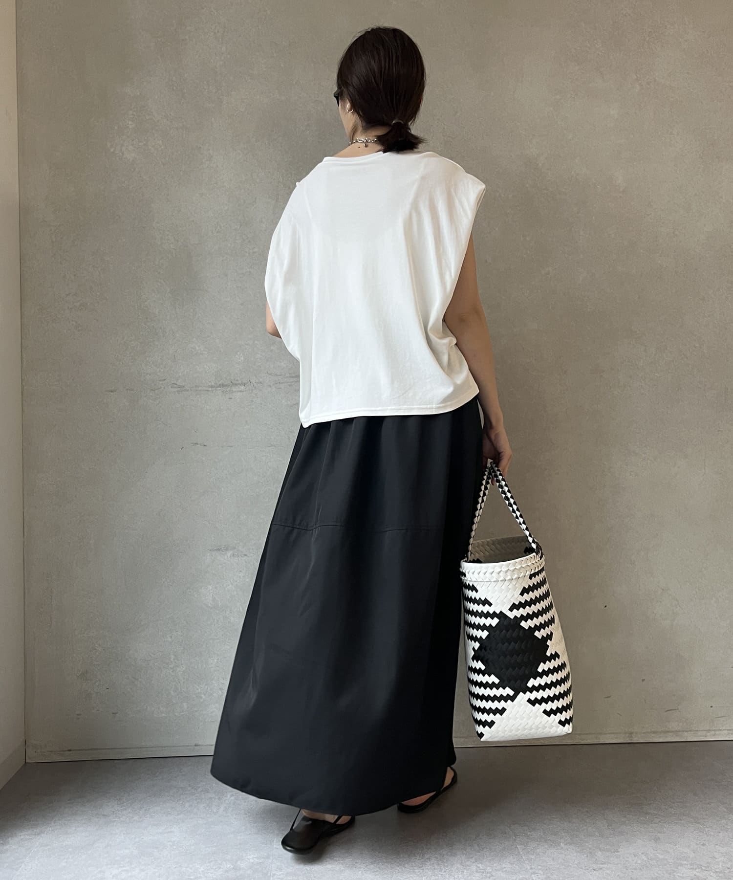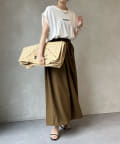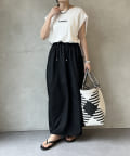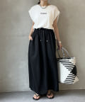 Tシャツの後ろの裾はINしてスッキリ、外に出して前だけIN風のスタイリングも楽しめますよ!