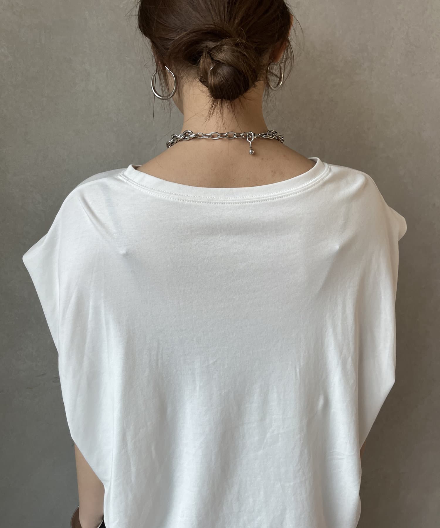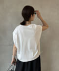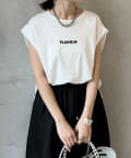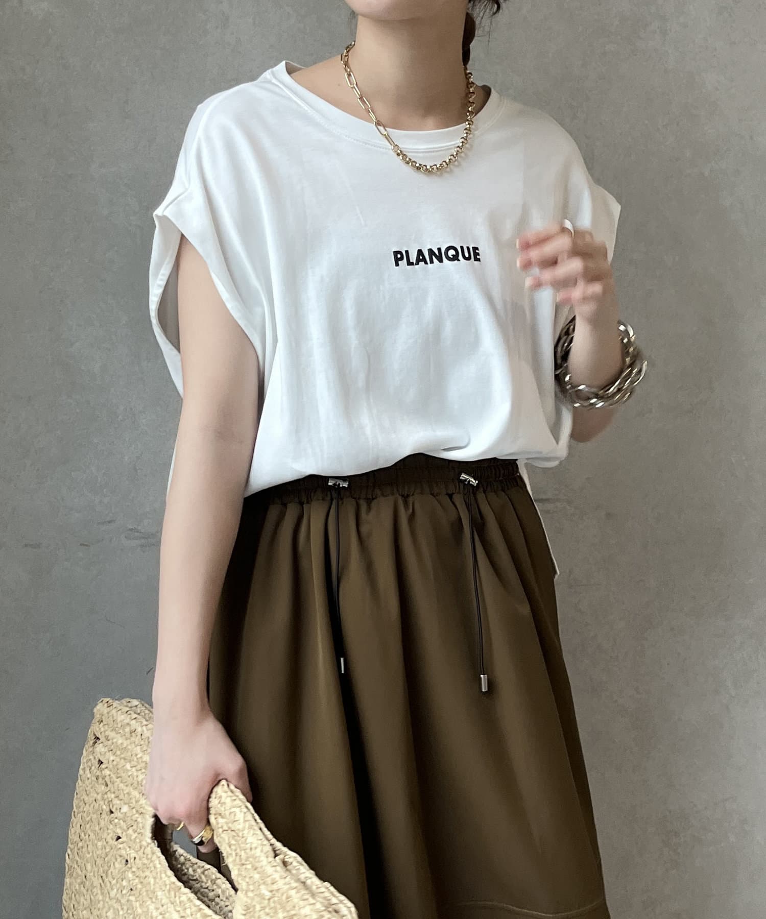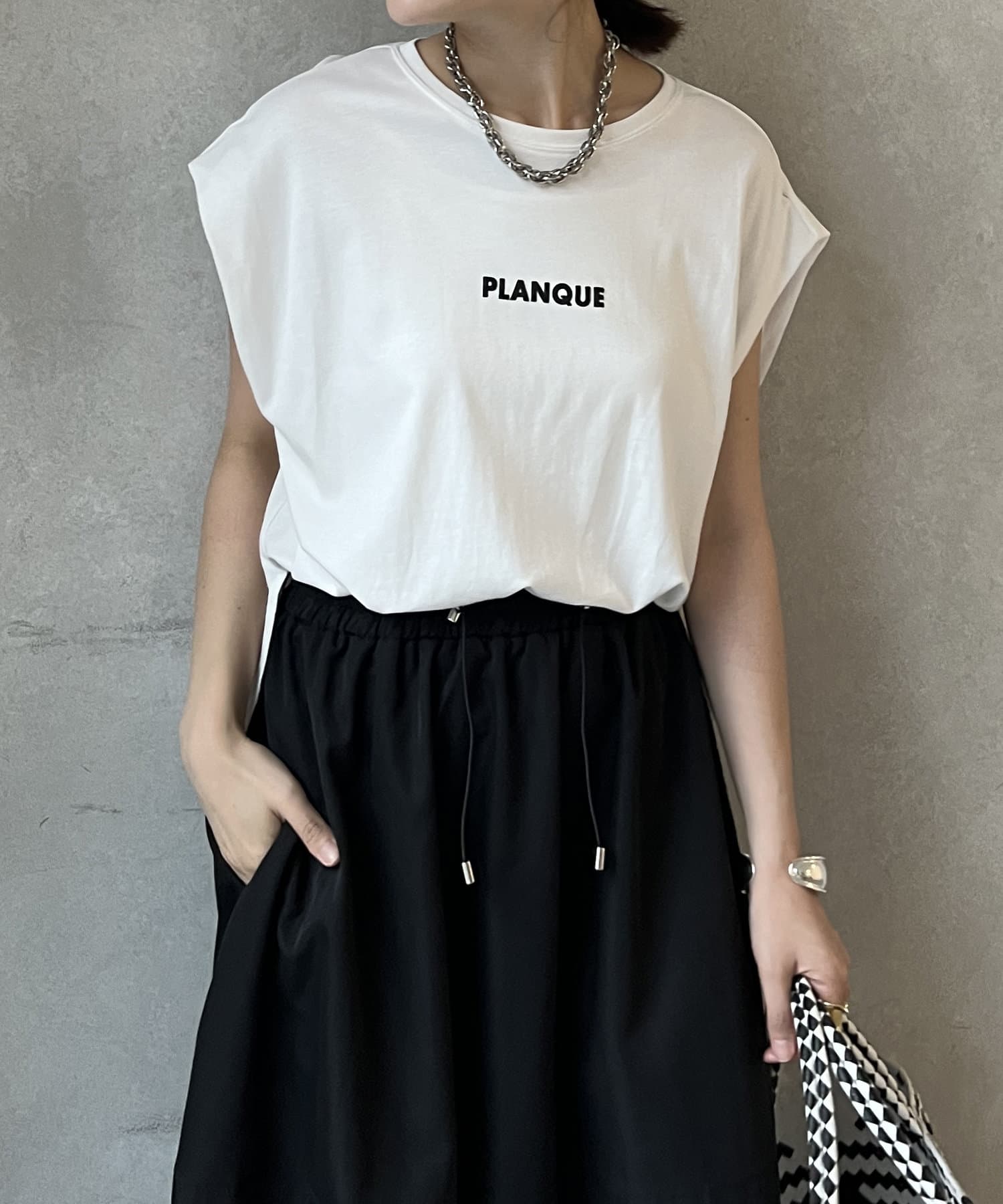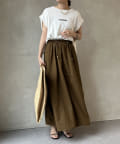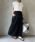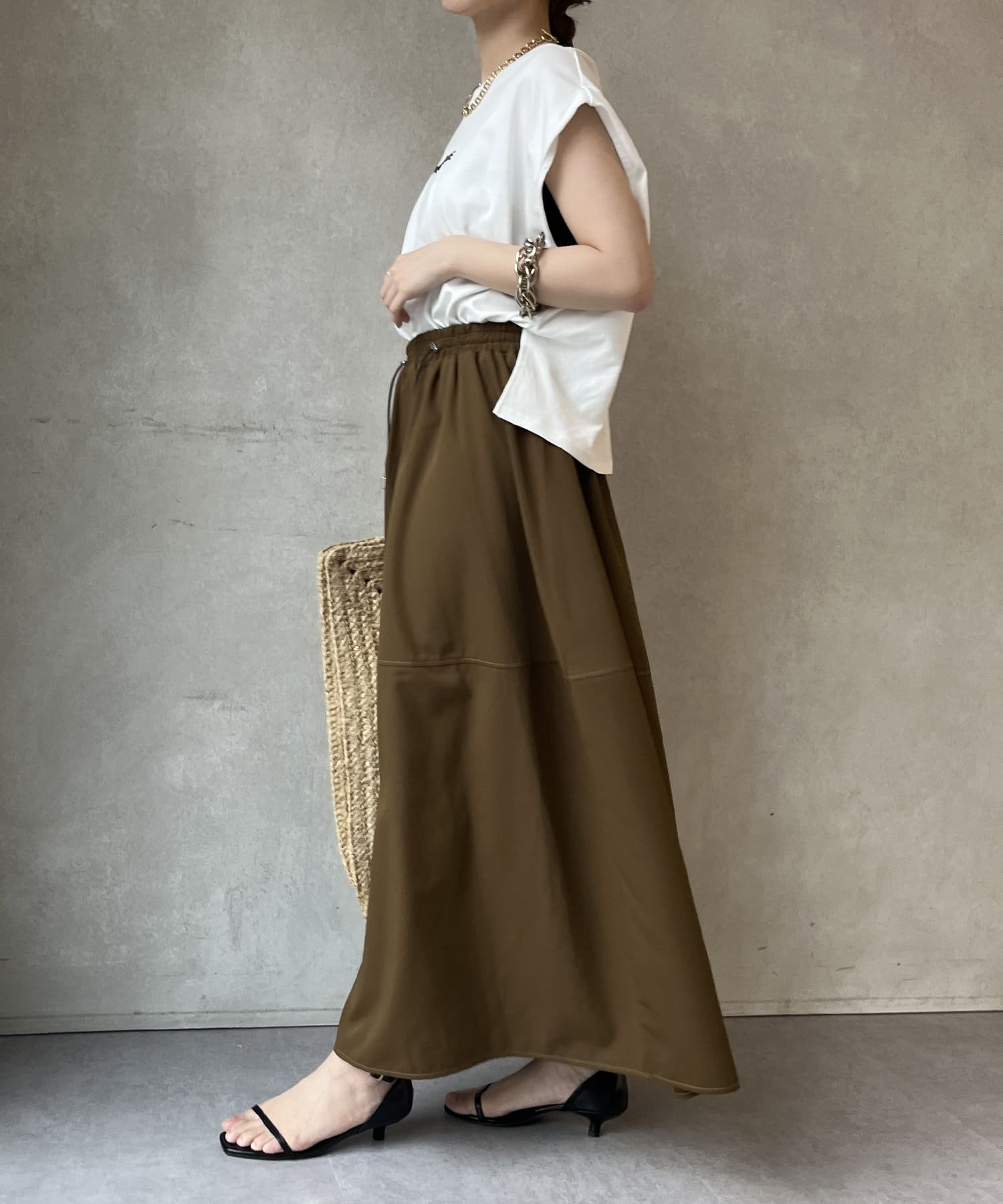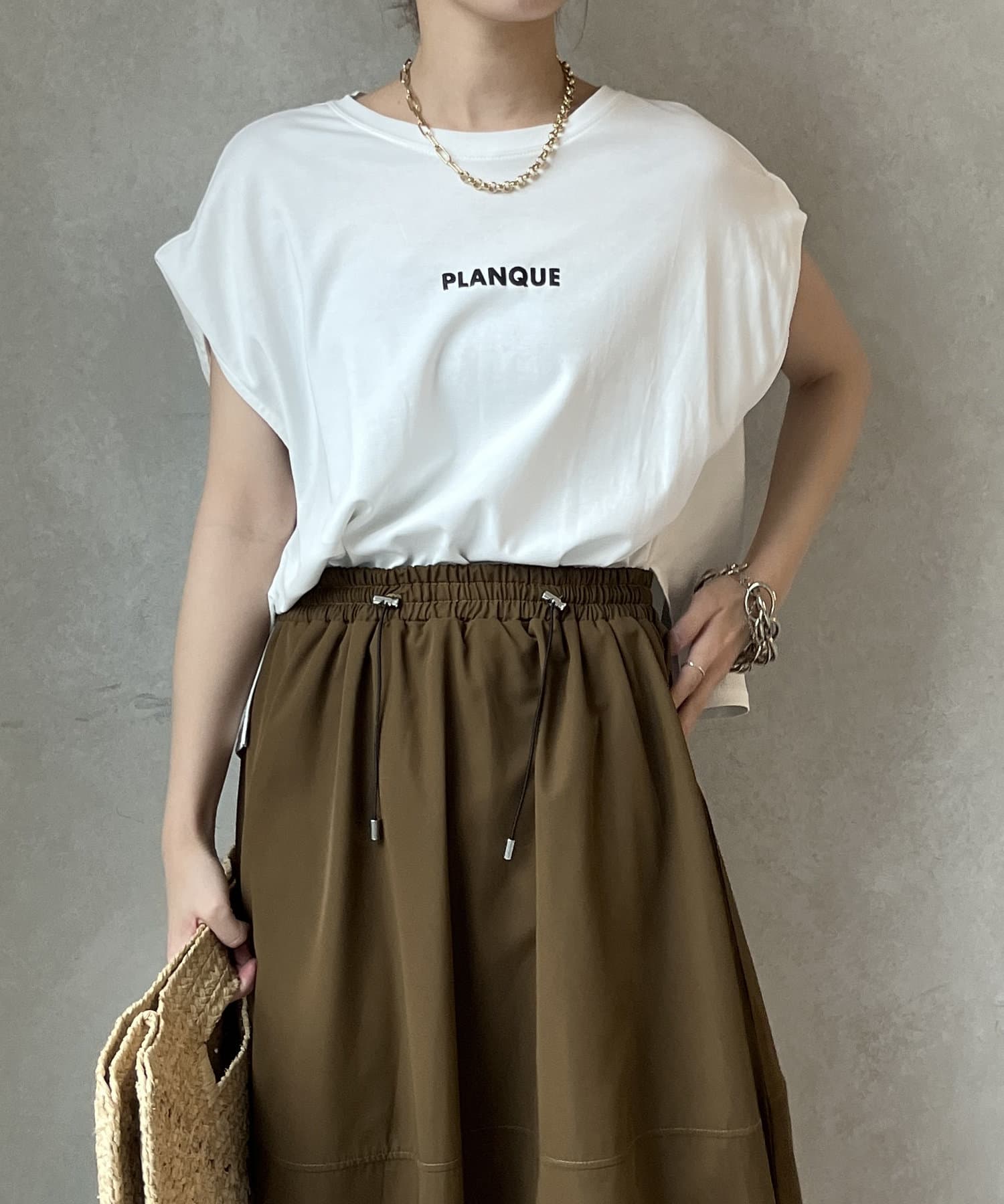 Tシャツの後ろの裾はINしてスッキリ、外に出して前だけIN風のスタイリングも楽しめますよ!