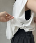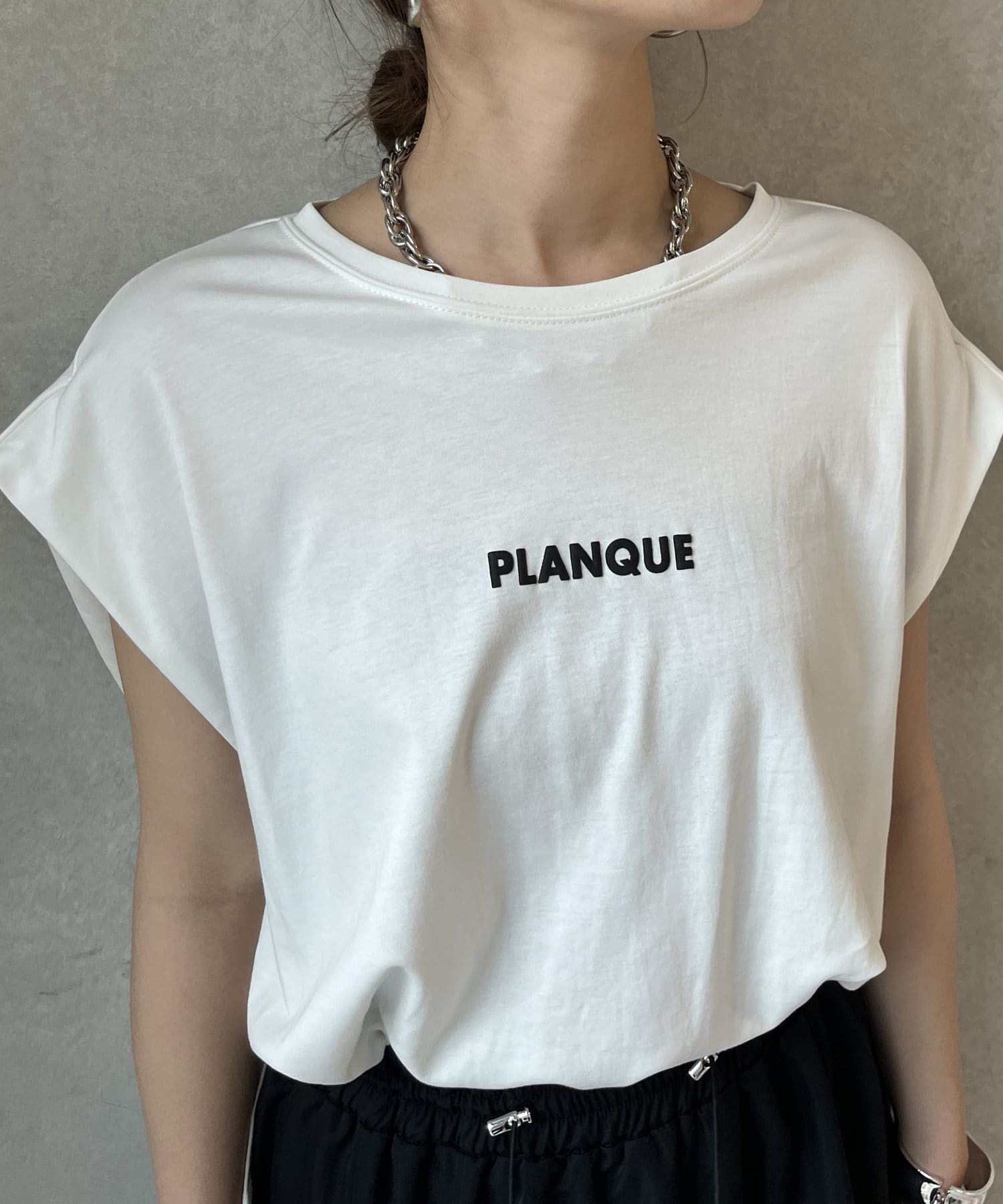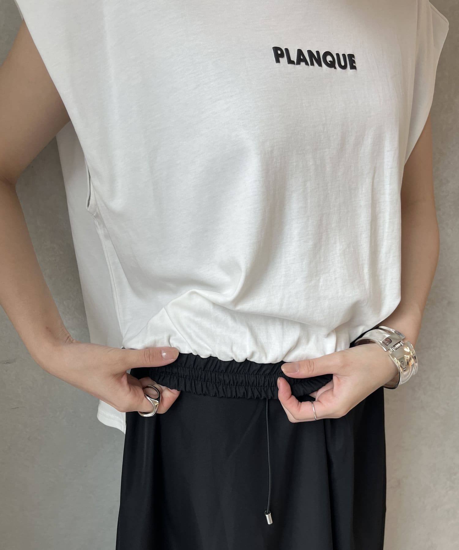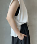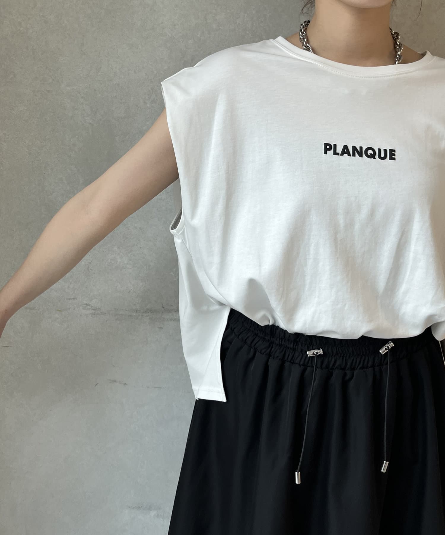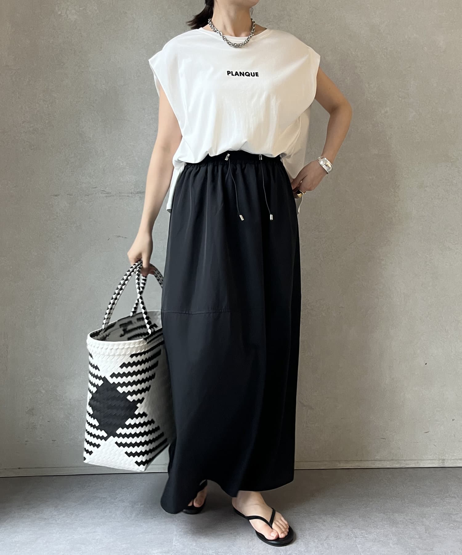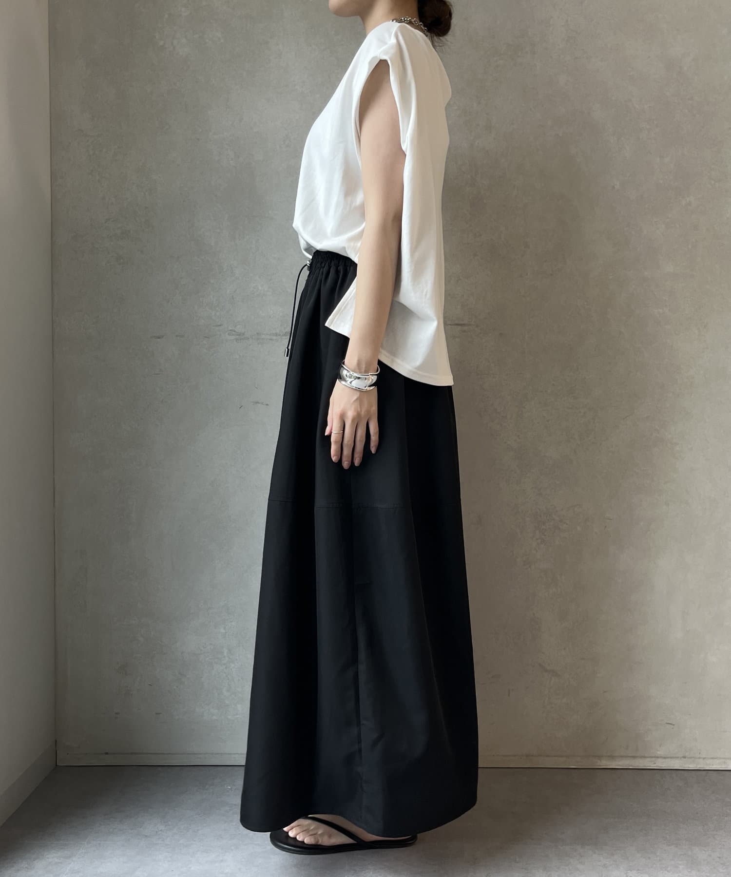Tシャツの後ろの裾はINしてスッキリ、外に出して前だけIN風のスタイリングも楽しめますよ!