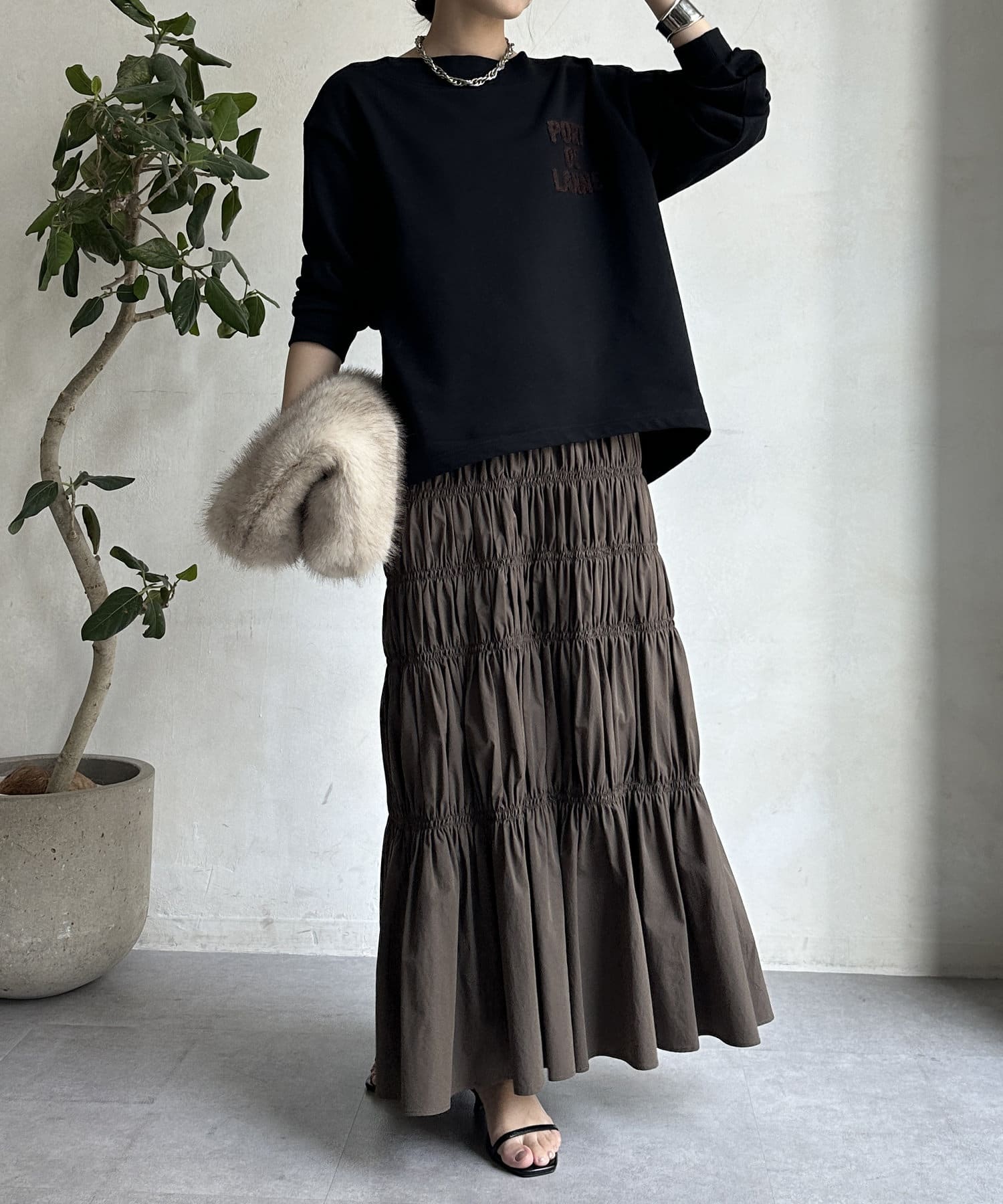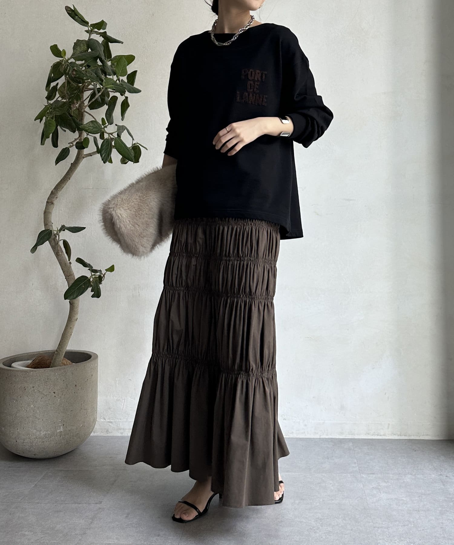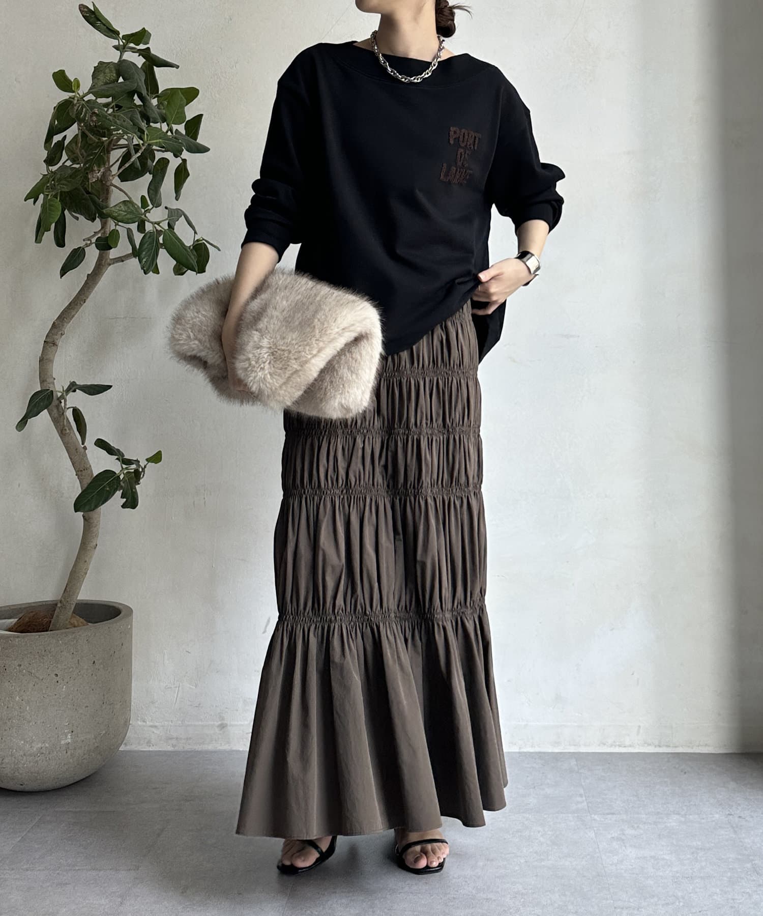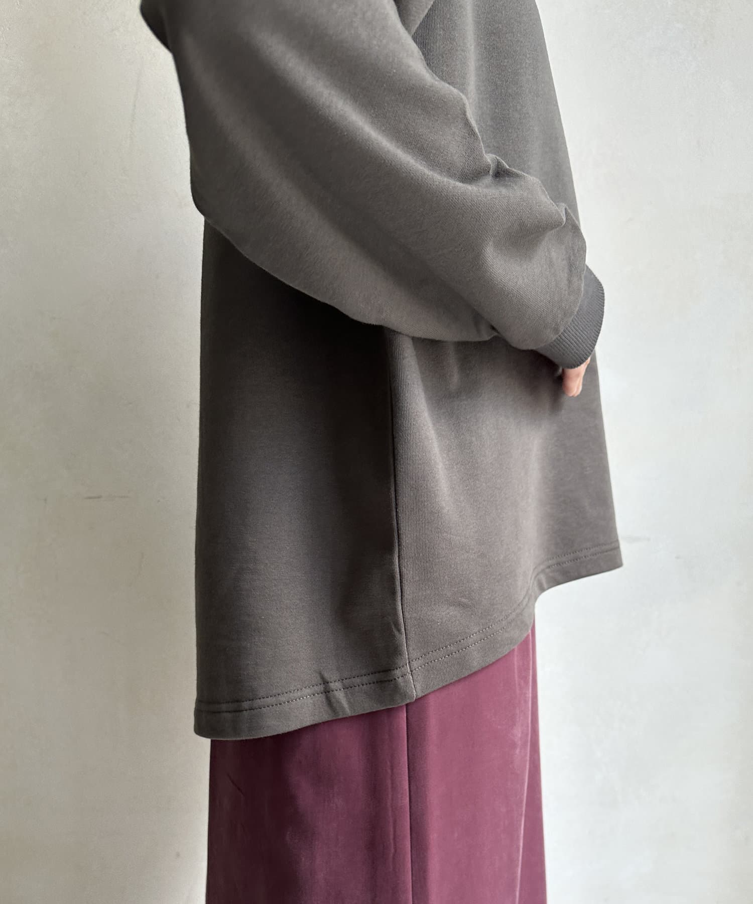 緩やかなネックが首元をすっきりと見せてくれて、女性らしいスタイリングに