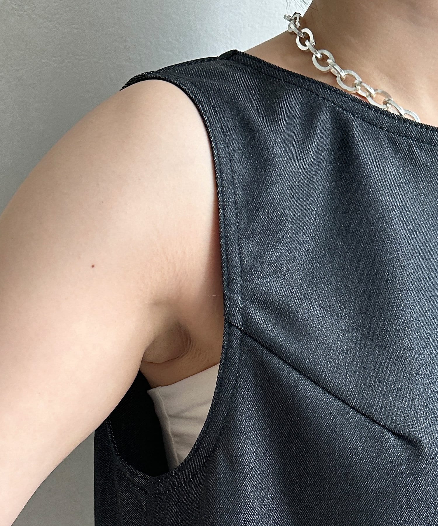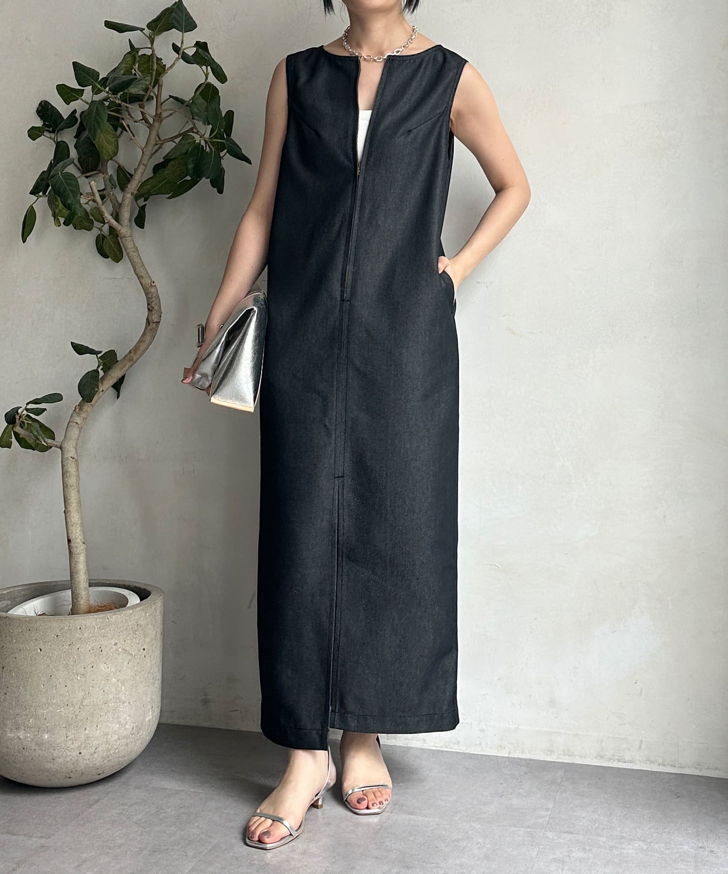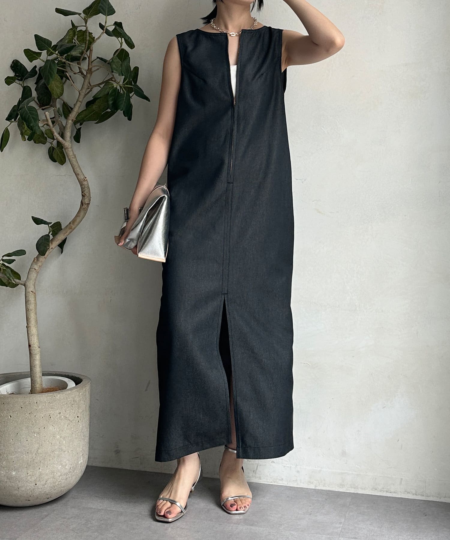 すっきりとしたシルエットながらも窮屈感のない着心地に仕上げ、身体のラインも拾いにくいタンクワンピース。