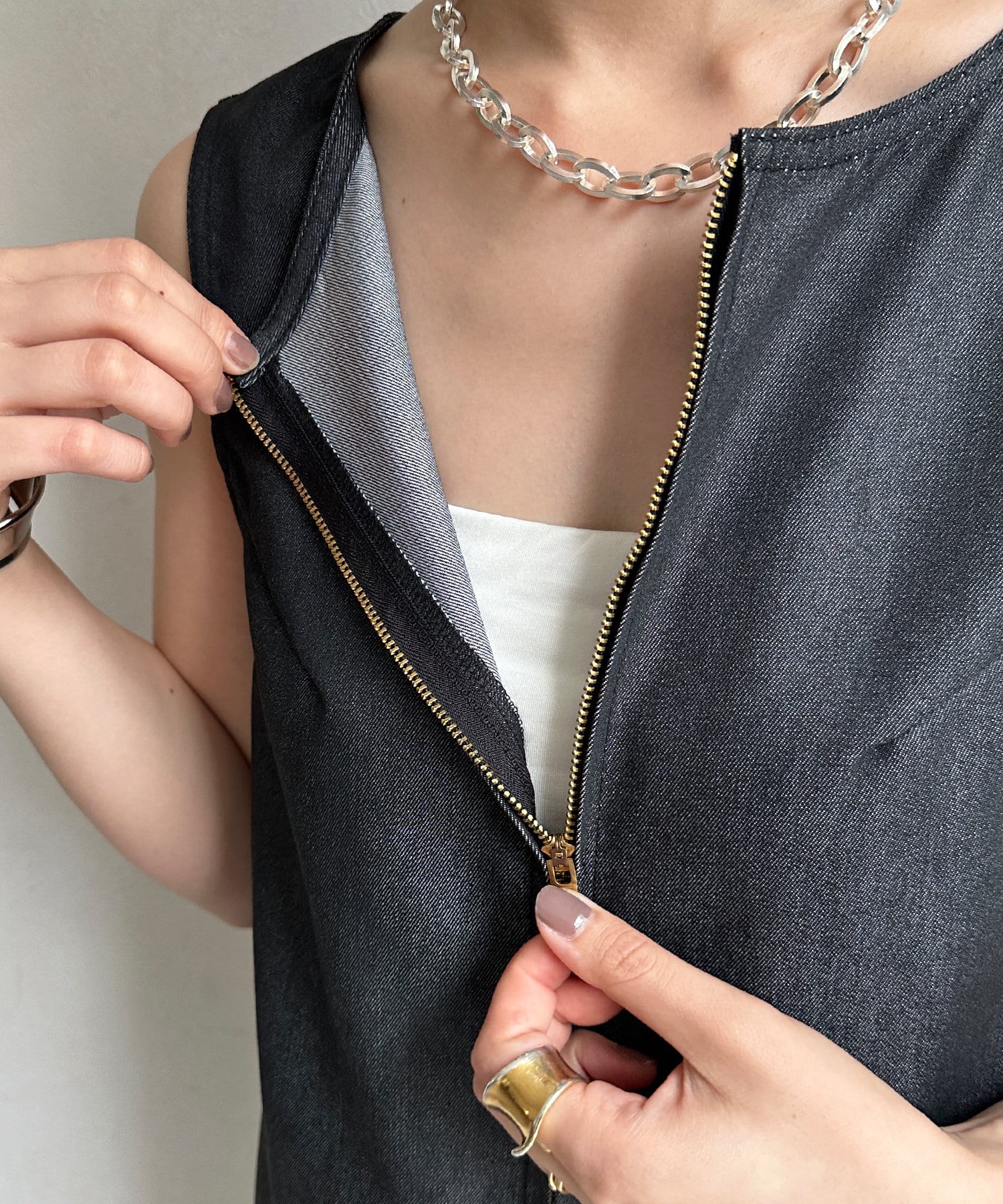 フロントはジップ仕様のためお好みの開け具合に調節いただけ、裾にはスリットをオン。足さばきも安心です。