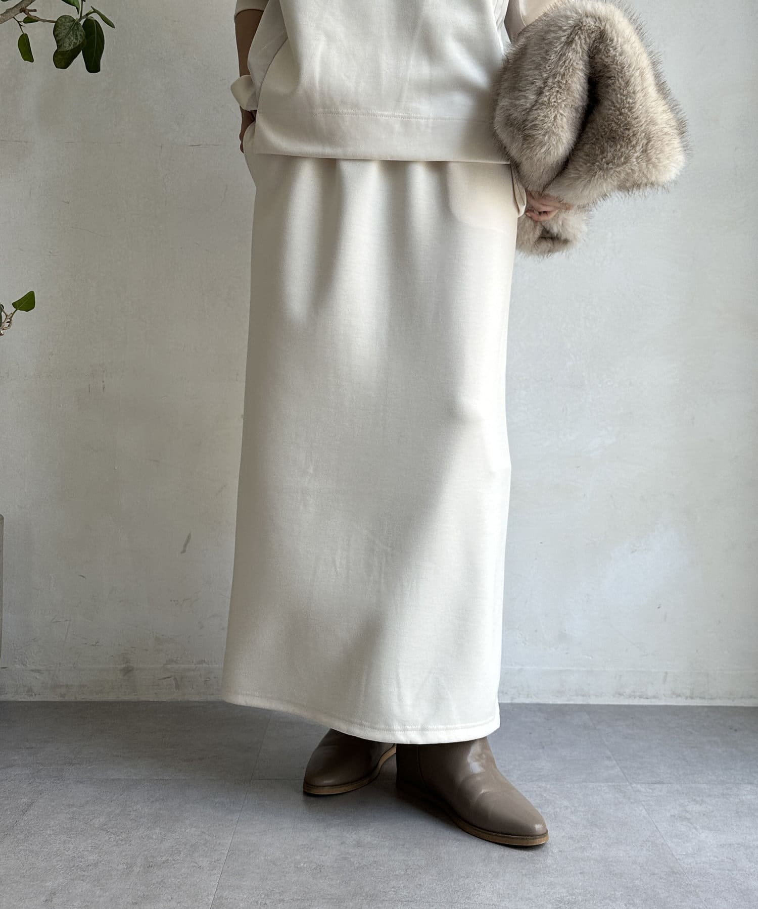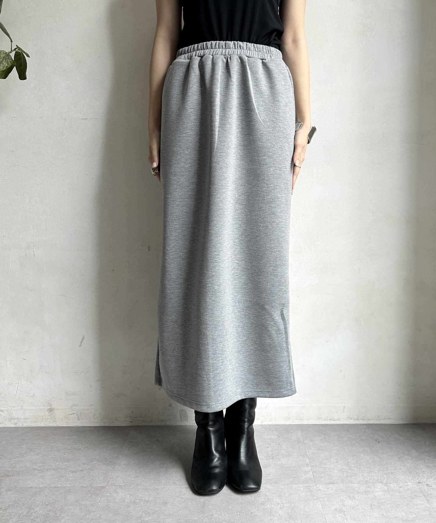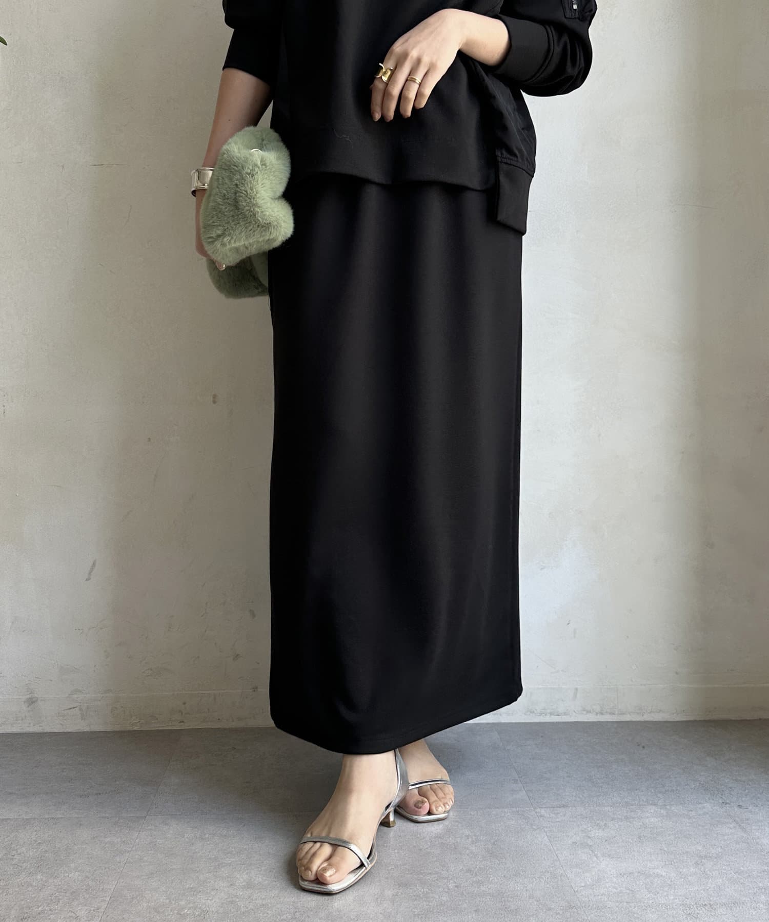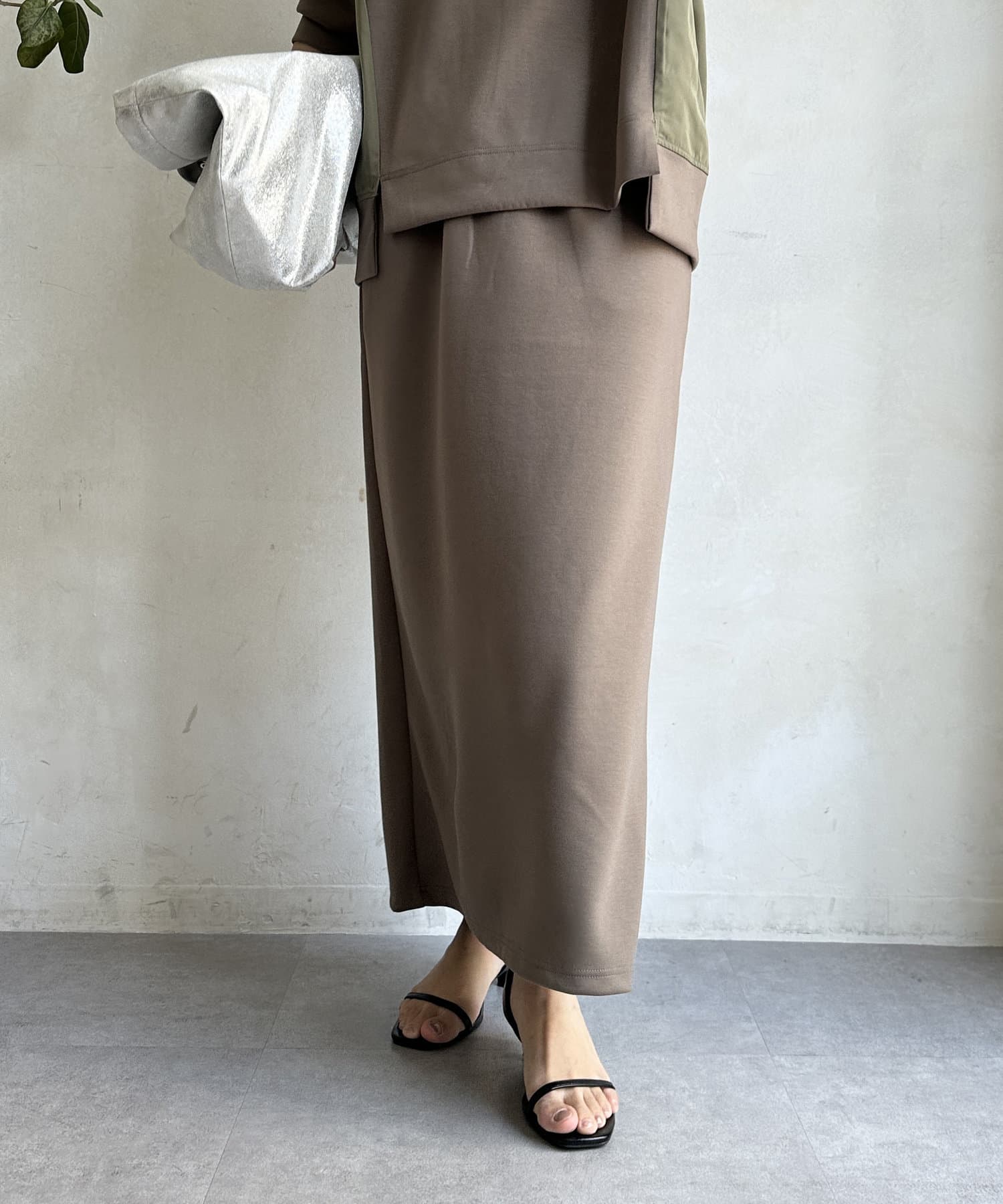 スカートは、程よいゆとりで体のラインを拾いにくく、すっきりみえるタイトシルエットになっております。