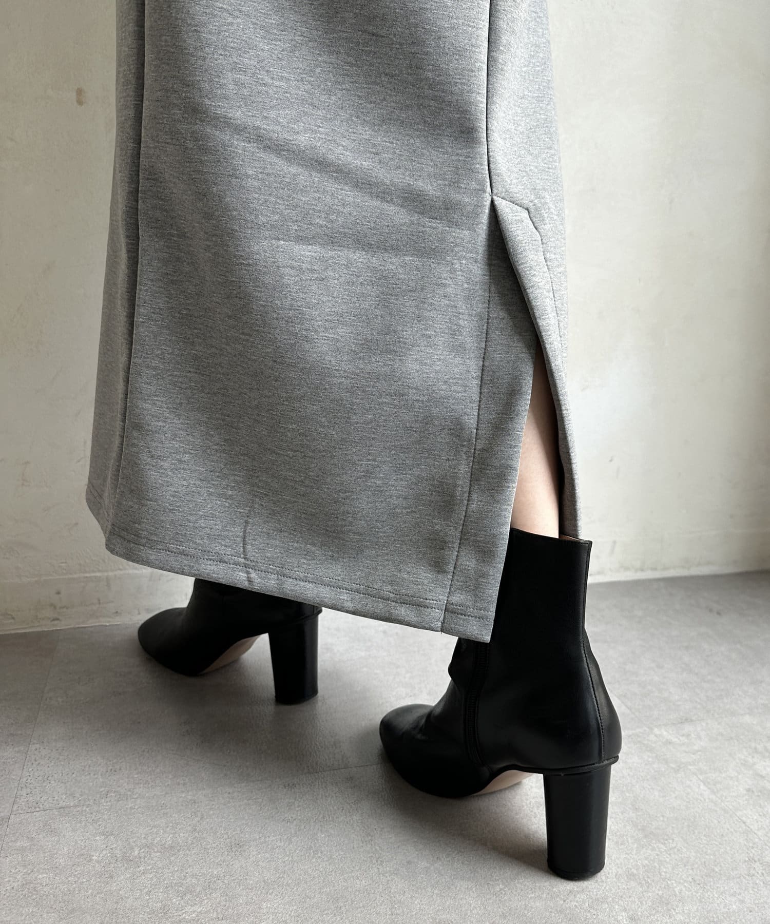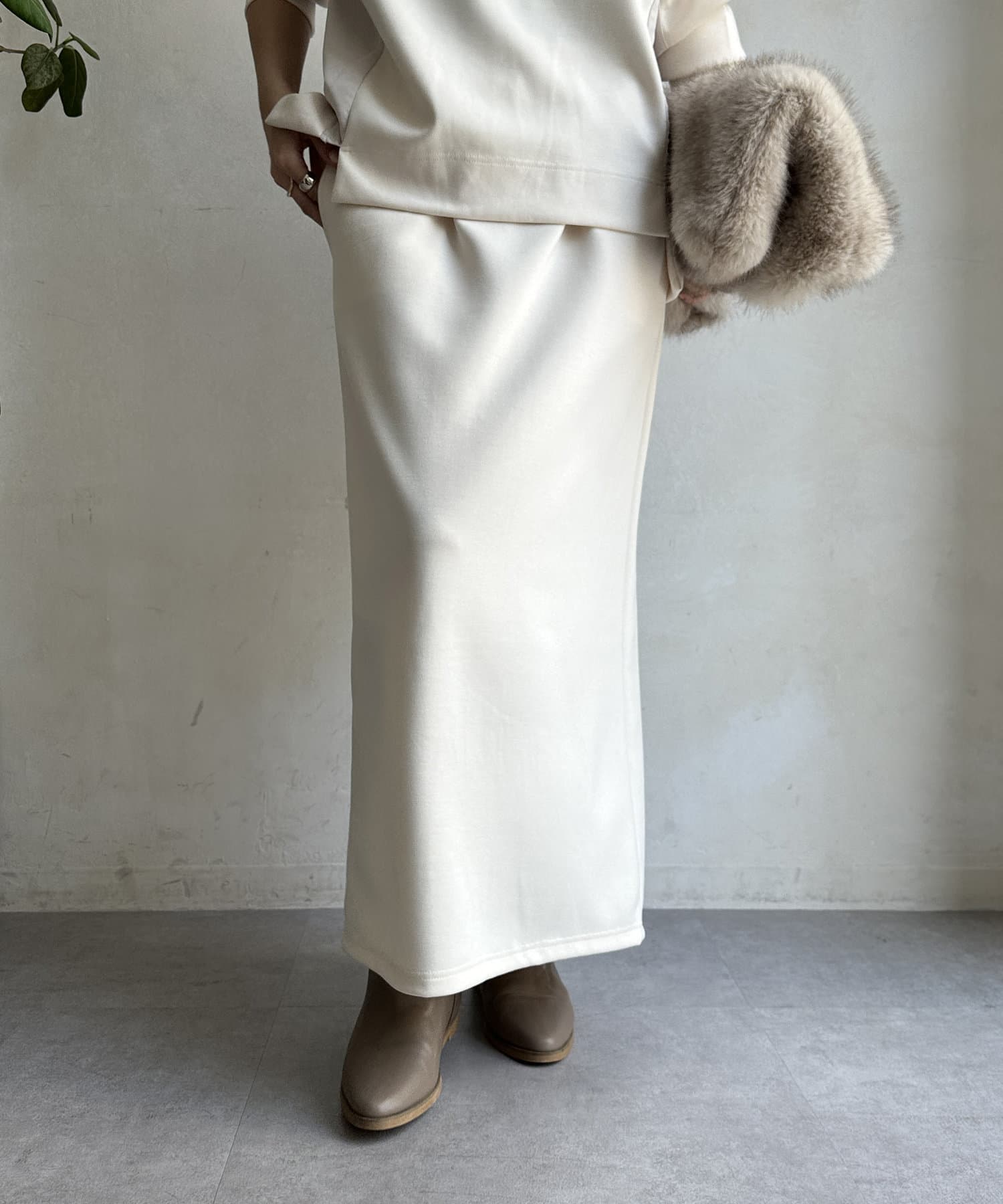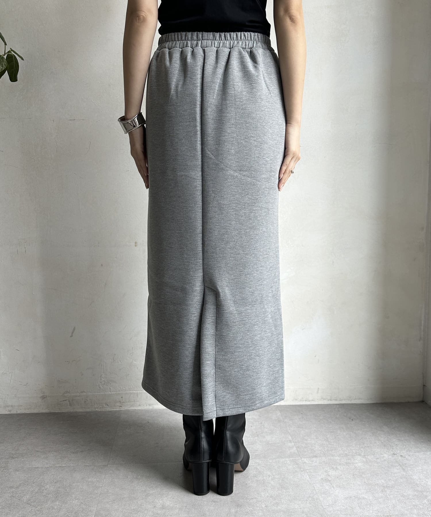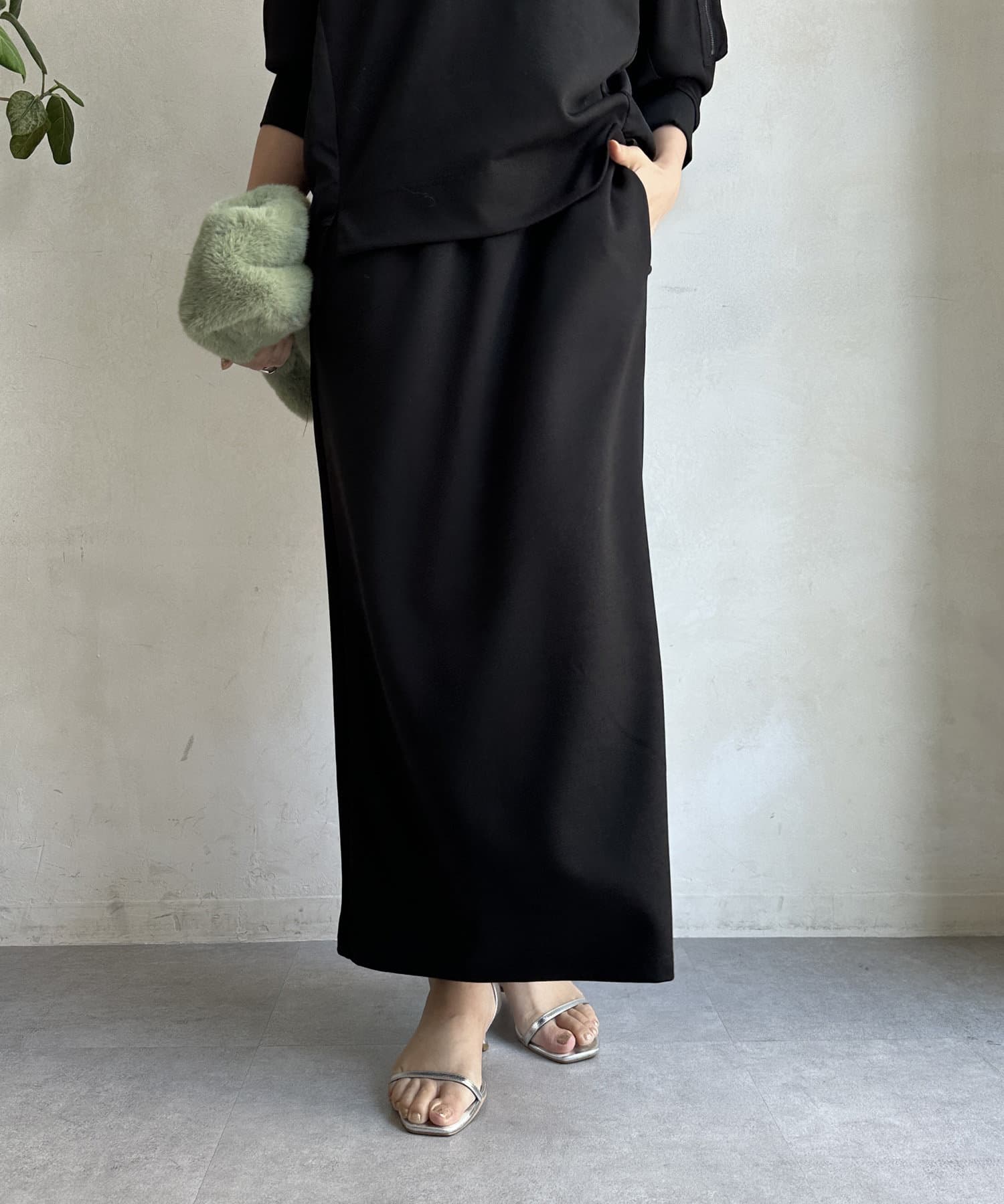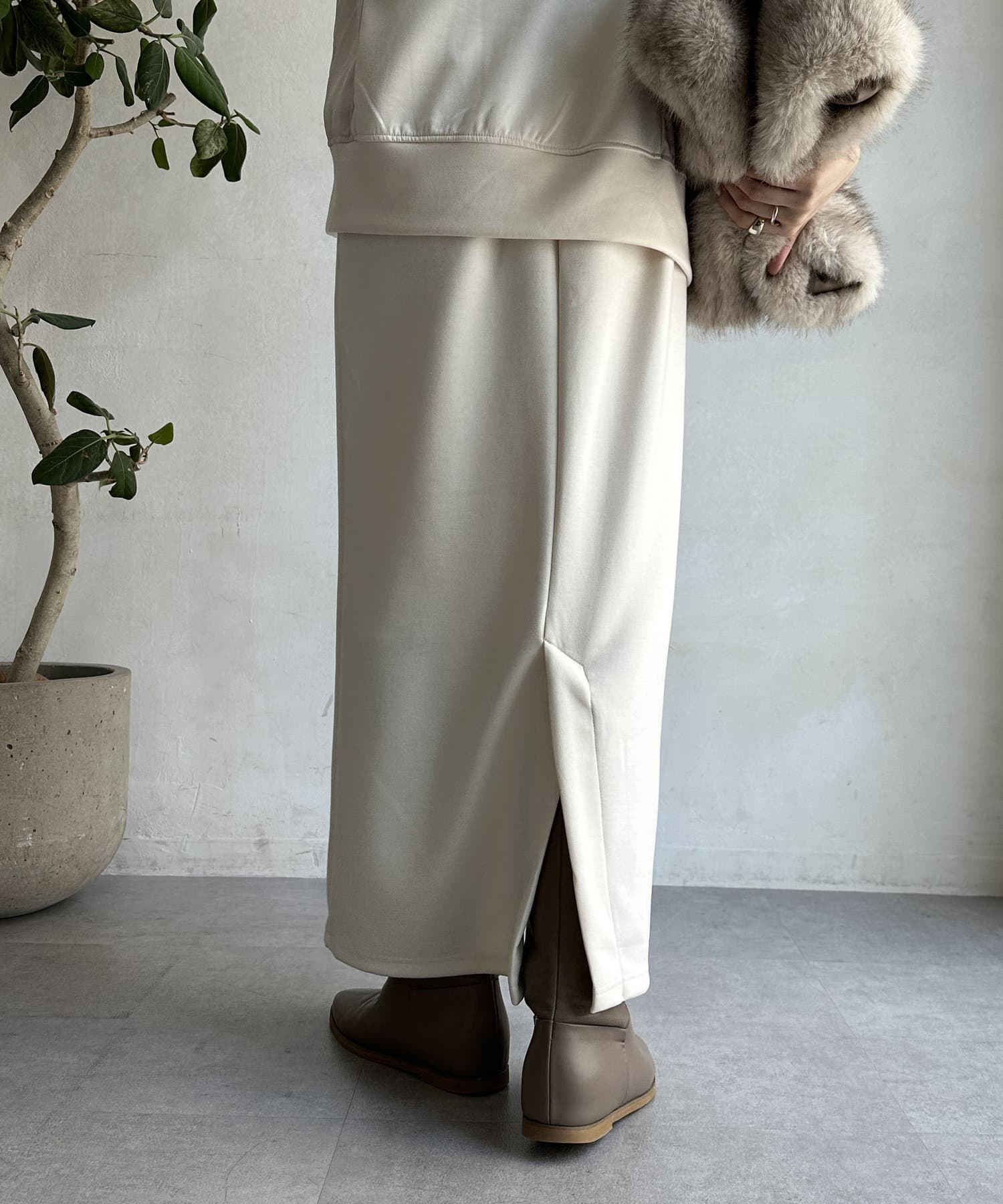 スカートは、程よいゆとりで体のラインを拾いにくく、すっきりみえるタイトシルエットになっております。