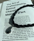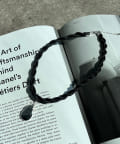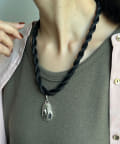 大き目のレザー紐とチャームがコーディネートのアクセントとして